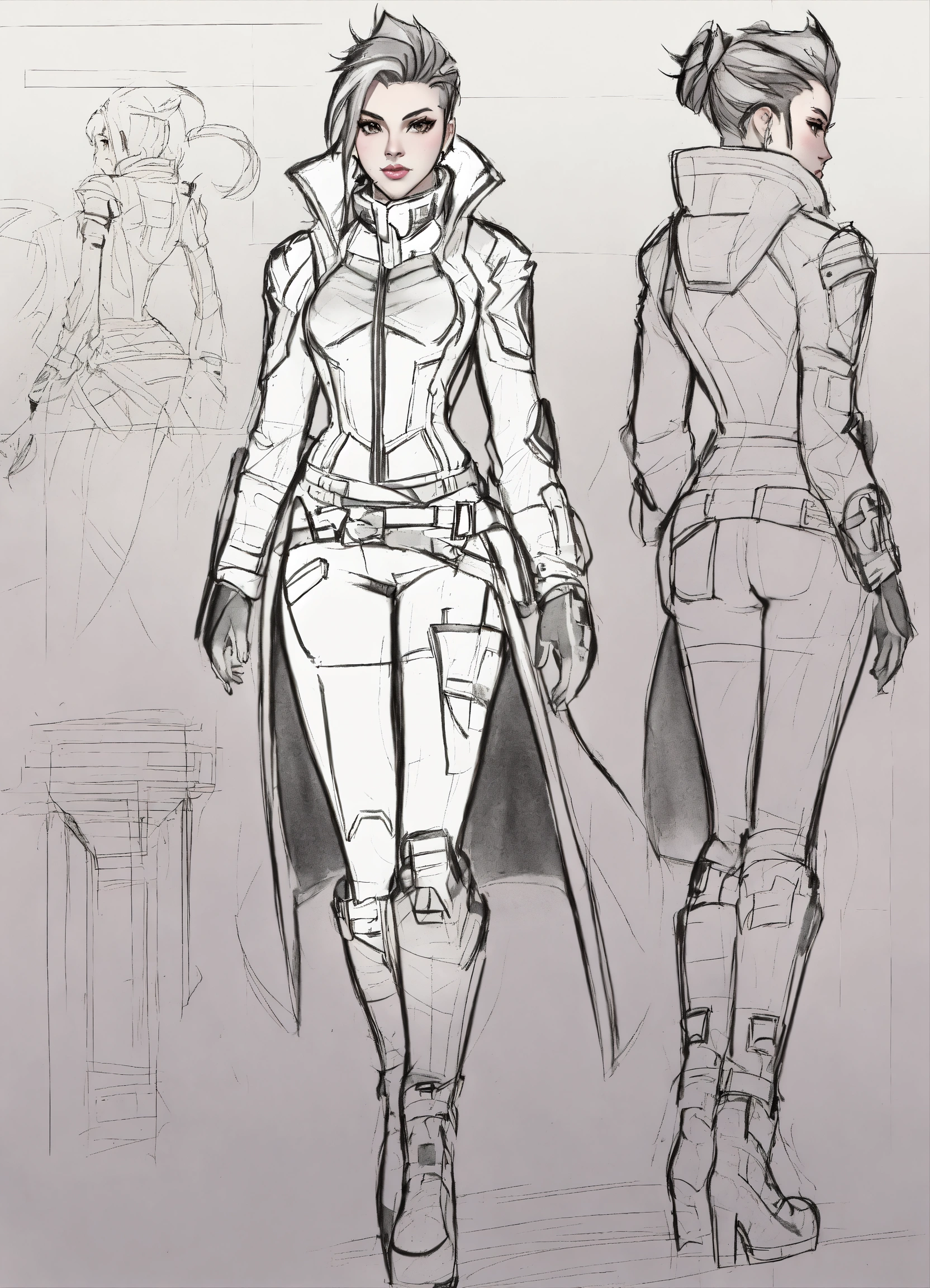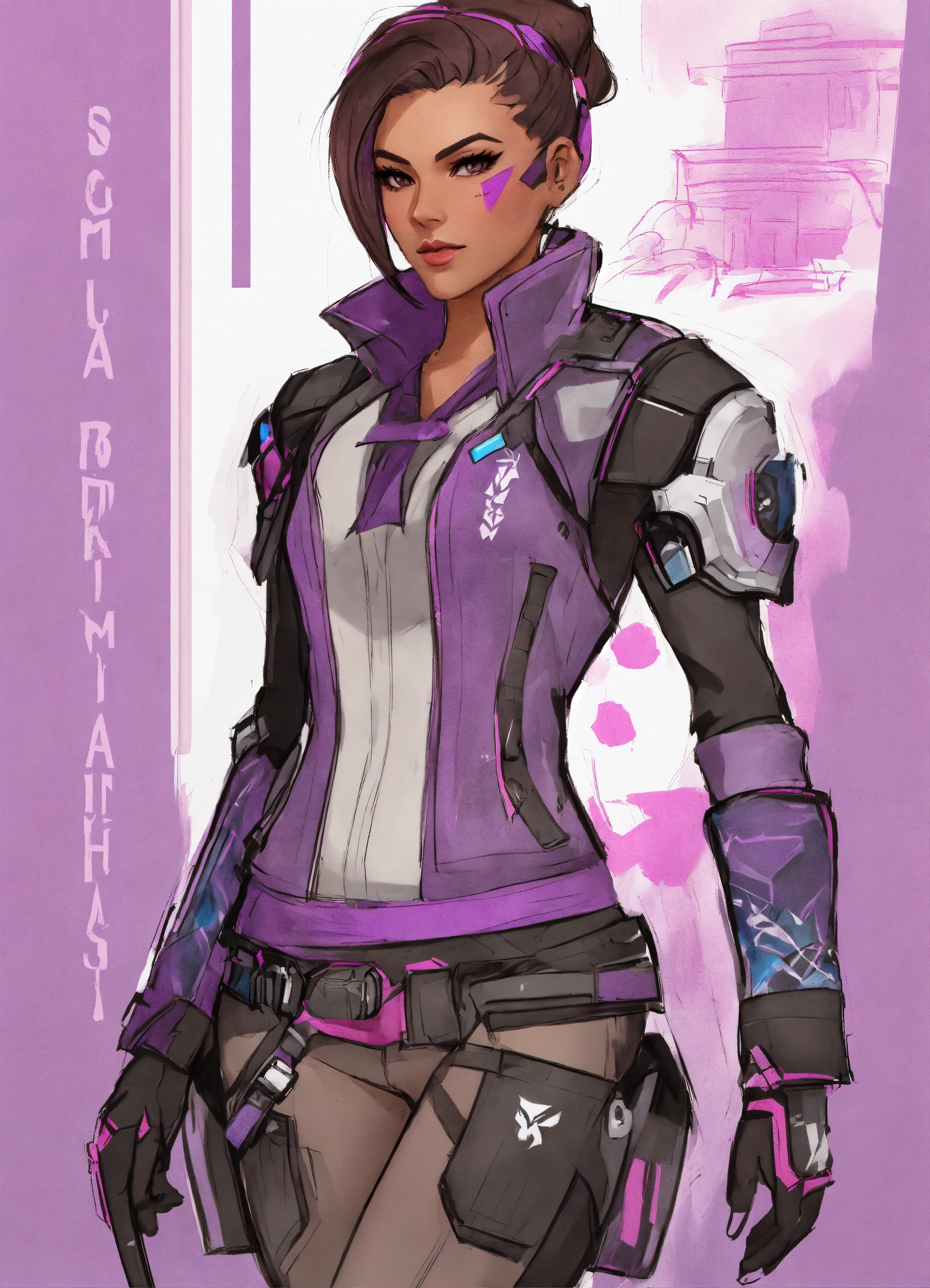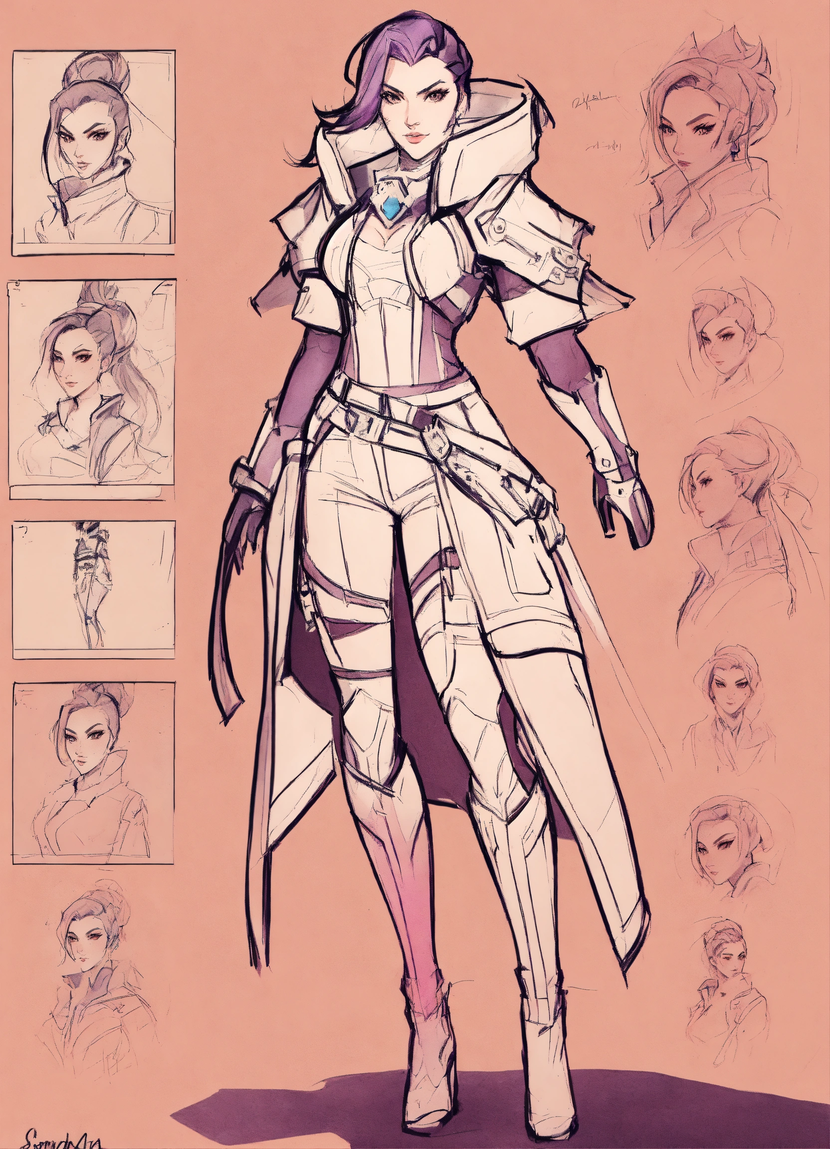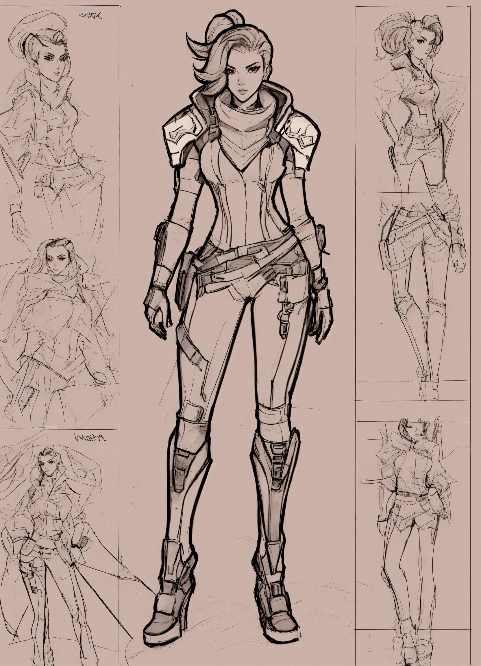 Set designer, sombra from overwatch, rough sketches, fashion illustration, pencil sketches rough, any color, 12 different designs on one page