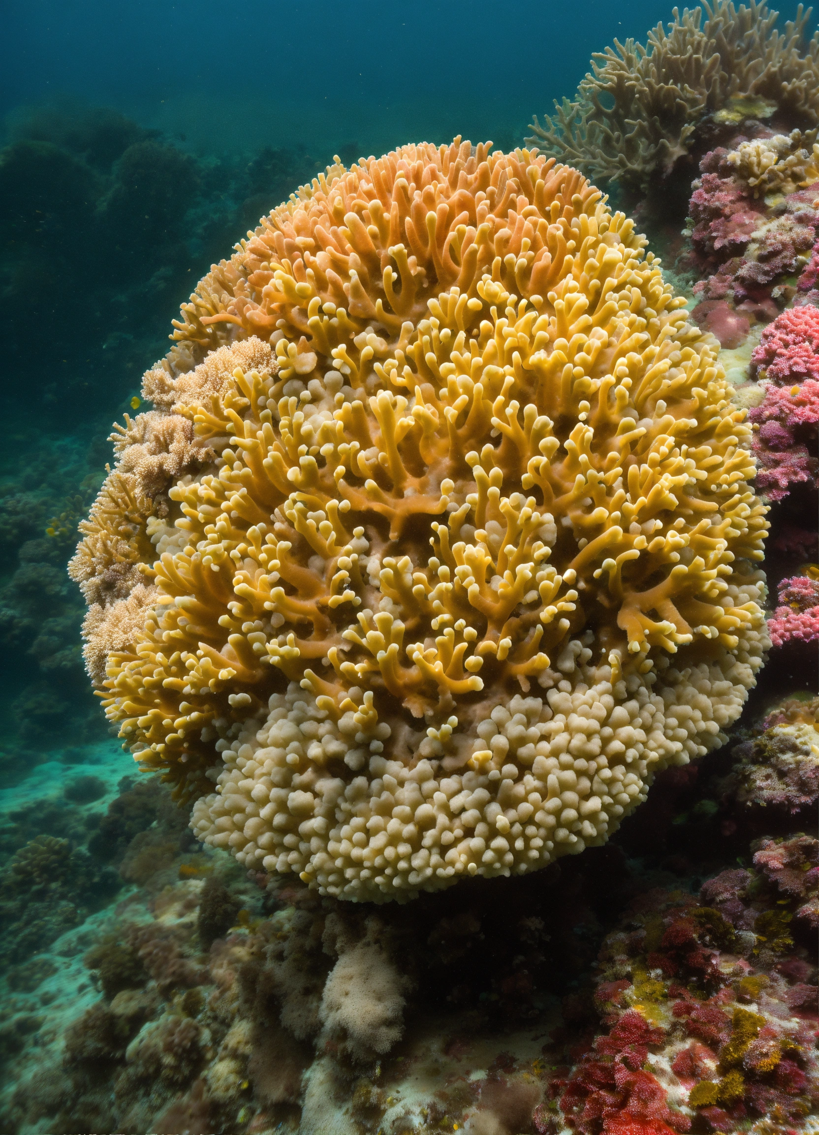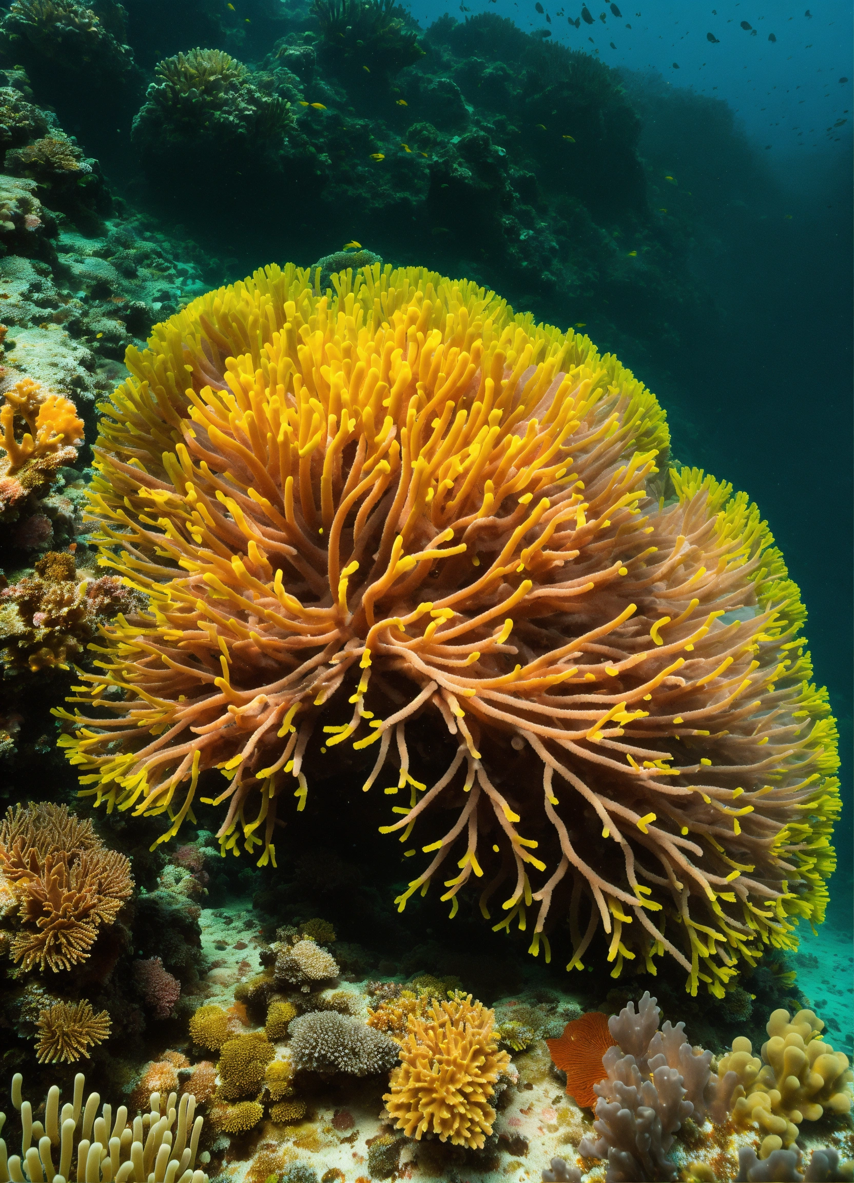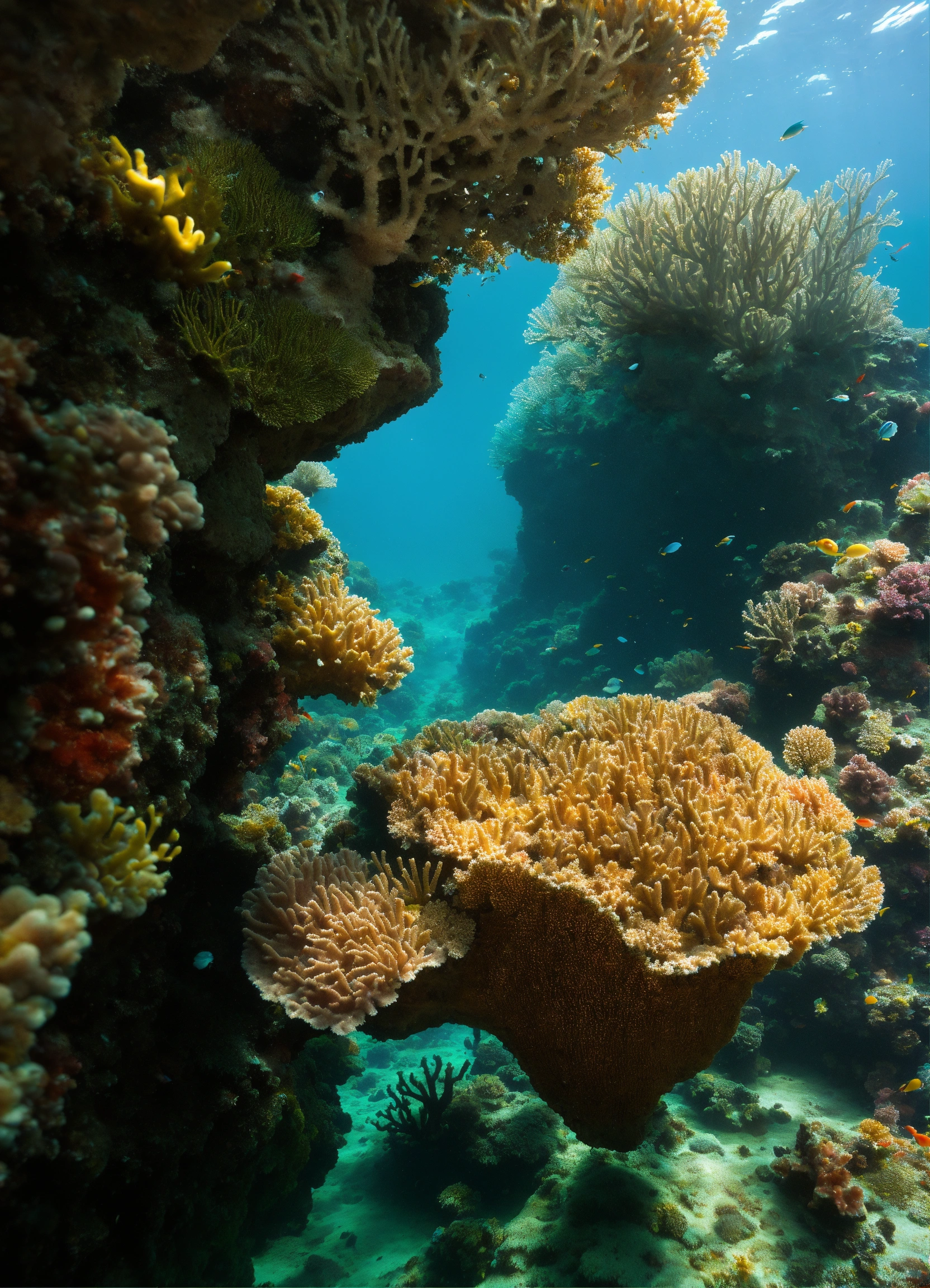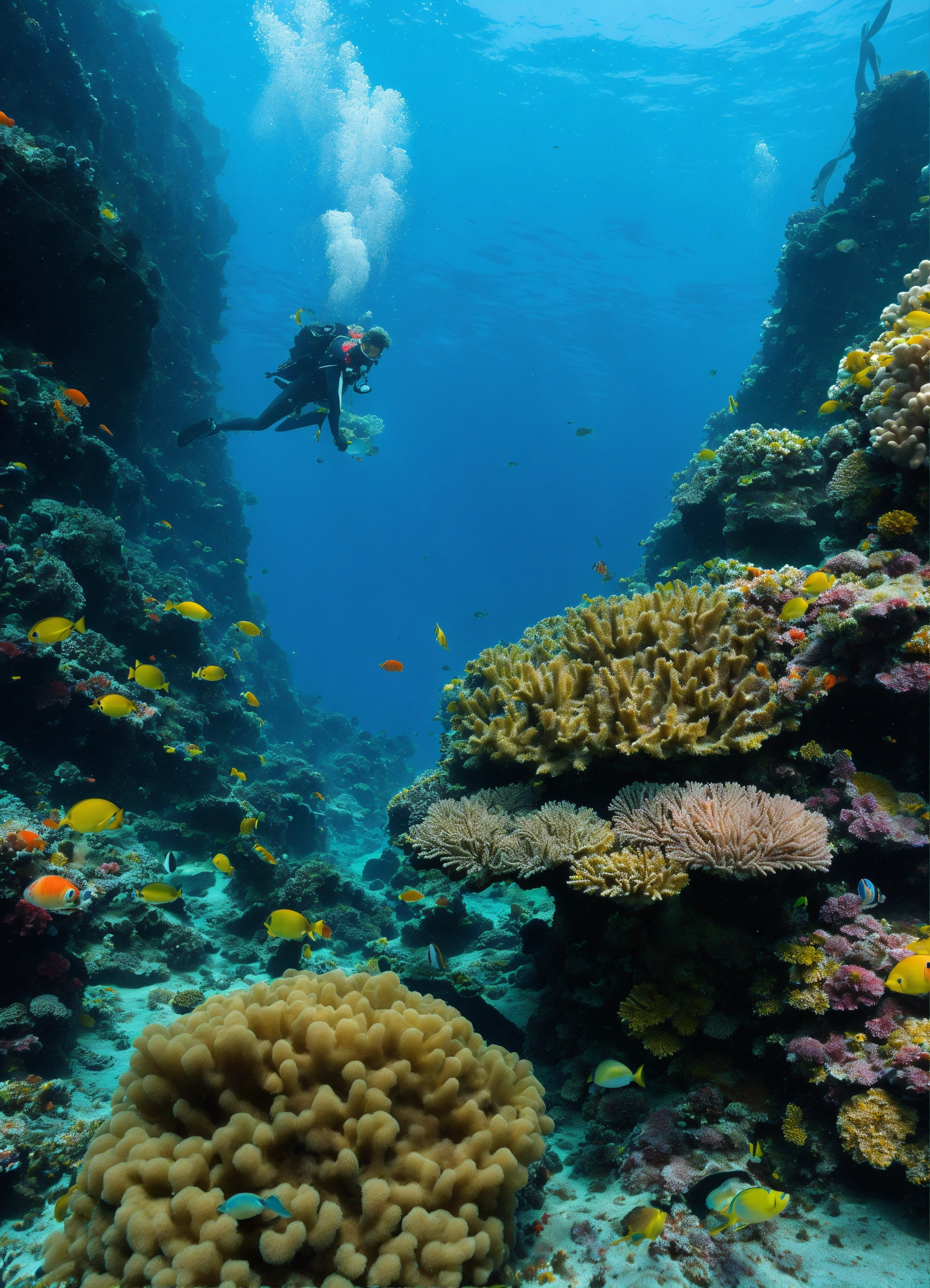 Fotografia subaquática de um recife de coral, com vida marinha diversificada e um mergulhador em escala.