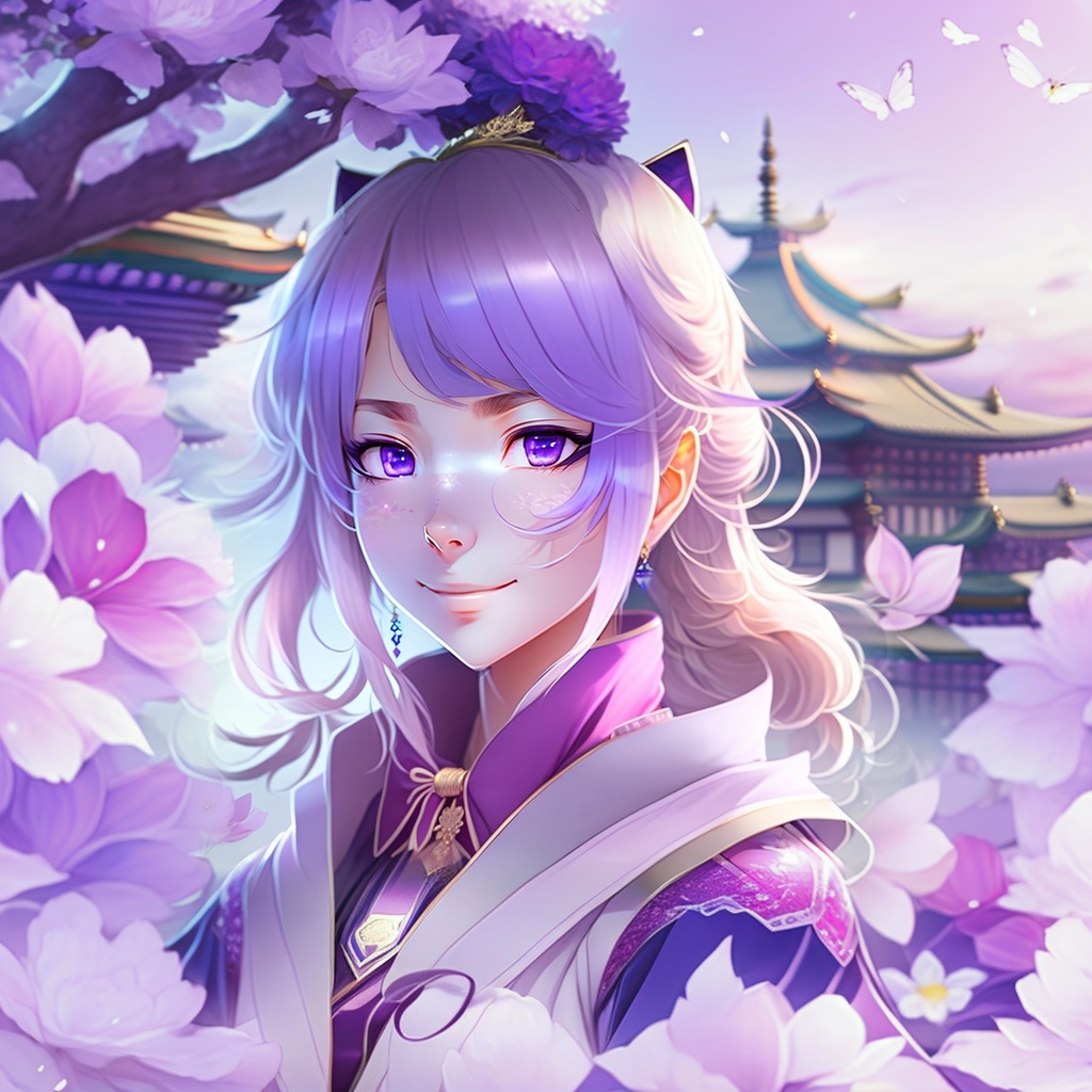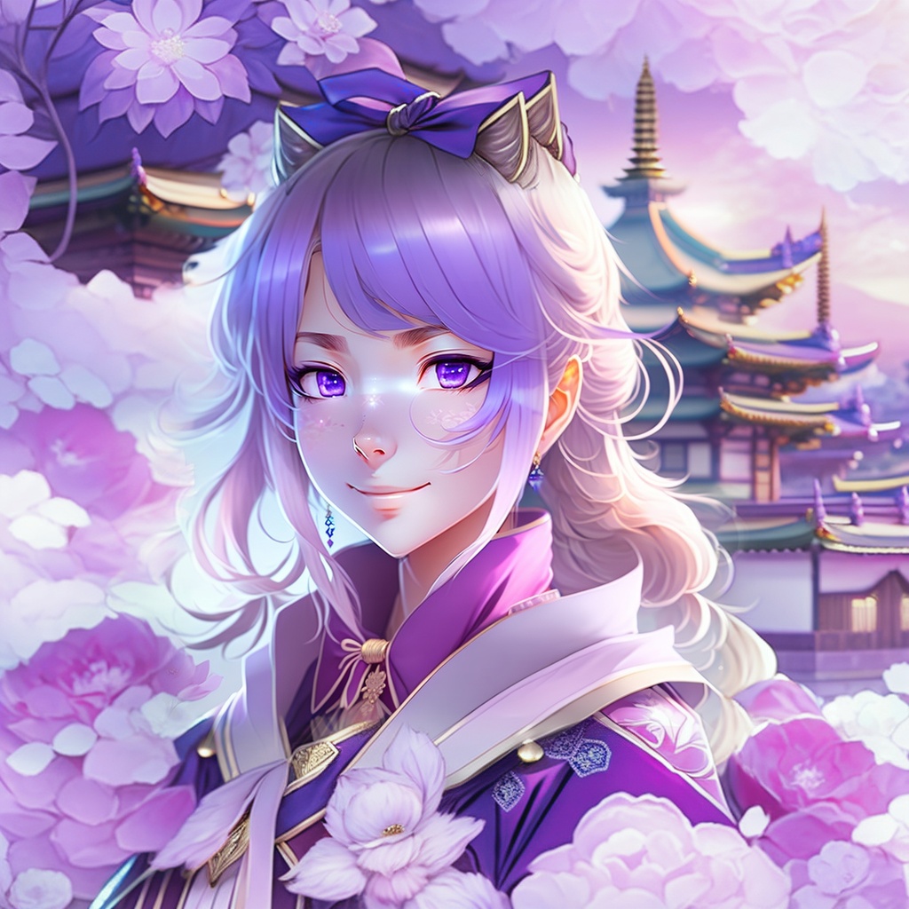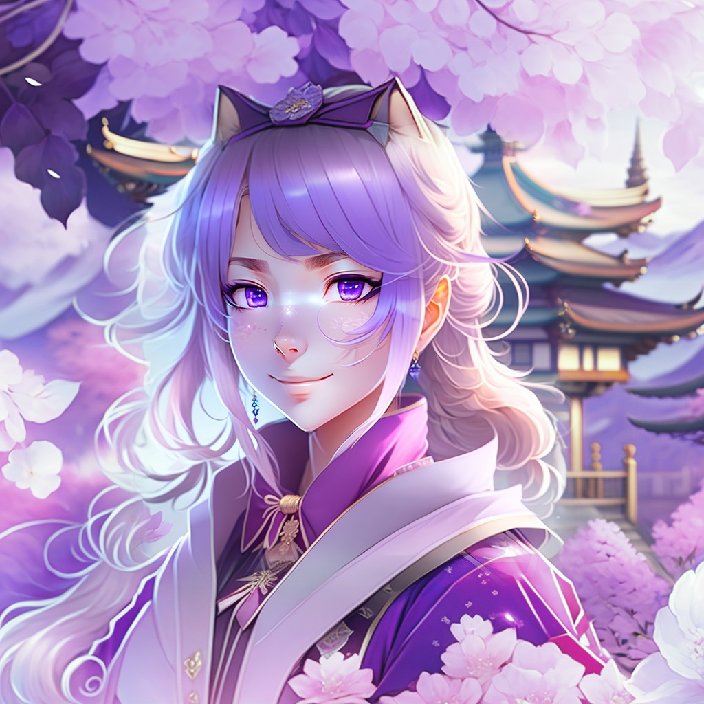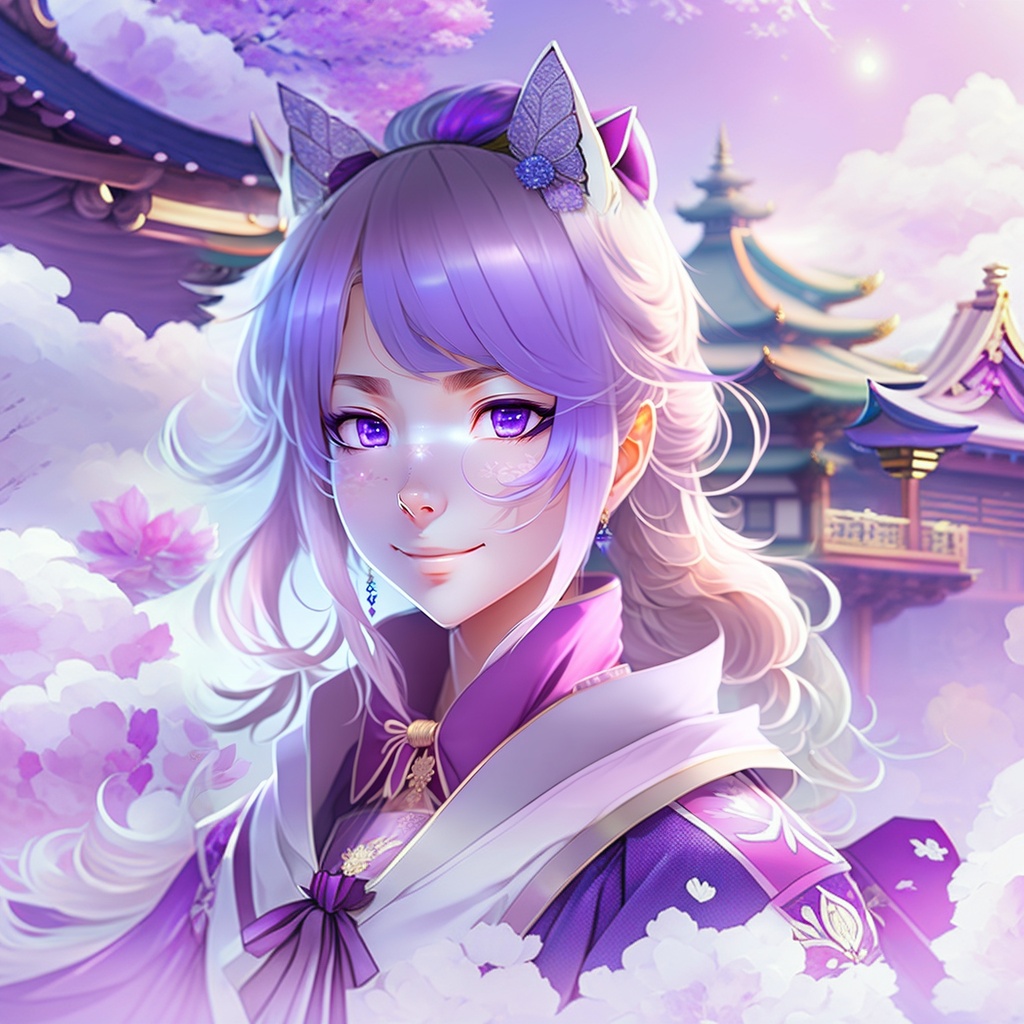 A happy beautiful white-haired anime wolf girl wearing purple kimono, wavy hair, anime, beautiful face, portrait, soft lighting, blur, flare, detailed accessories, graceful pose, detailed face, detailed kimono, detailed japanese building background, hyperdetailed, masterpiece, 4k, 8k, trending on pixiv