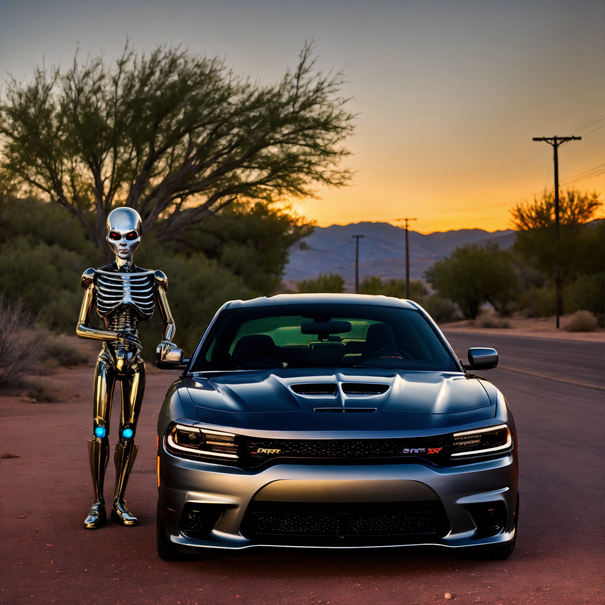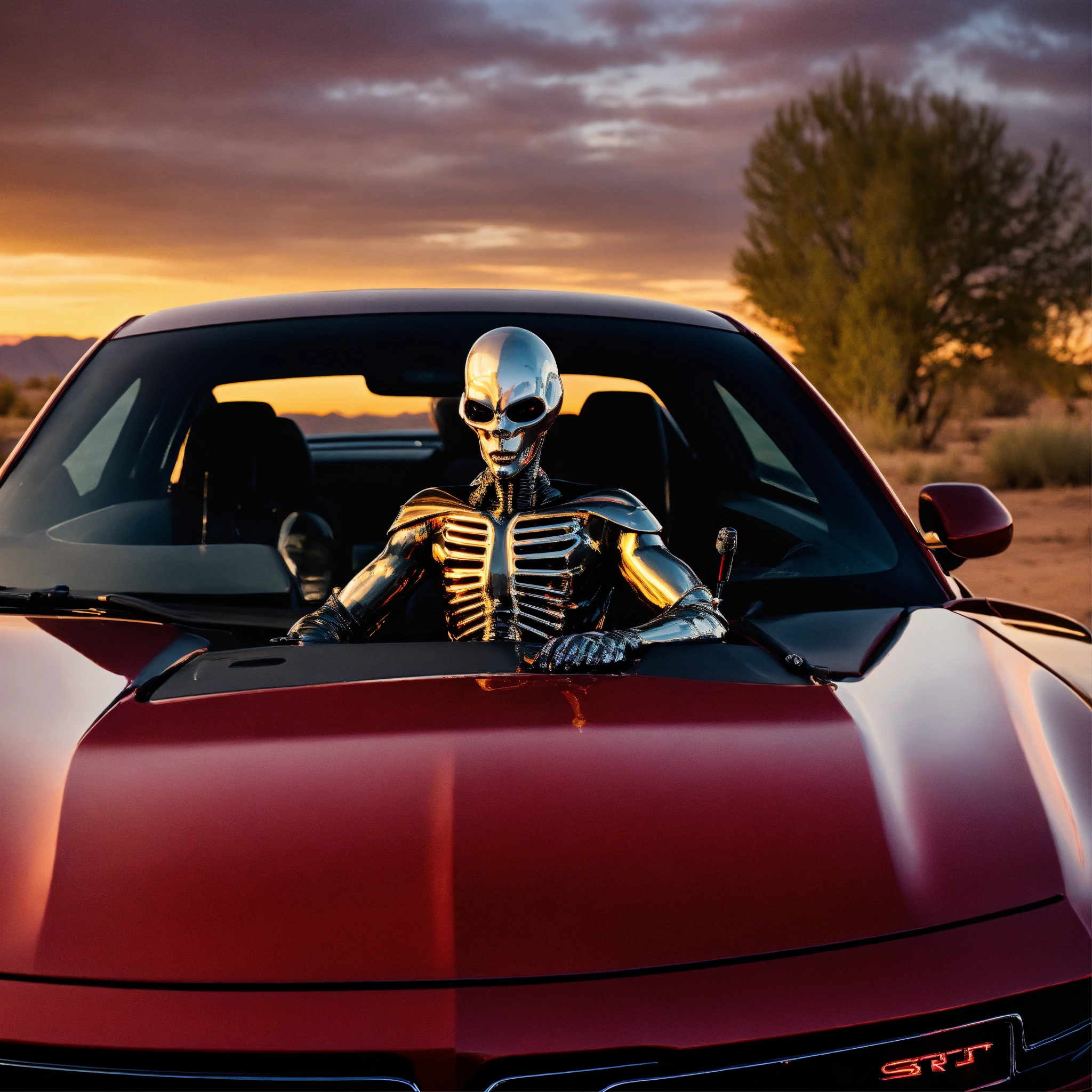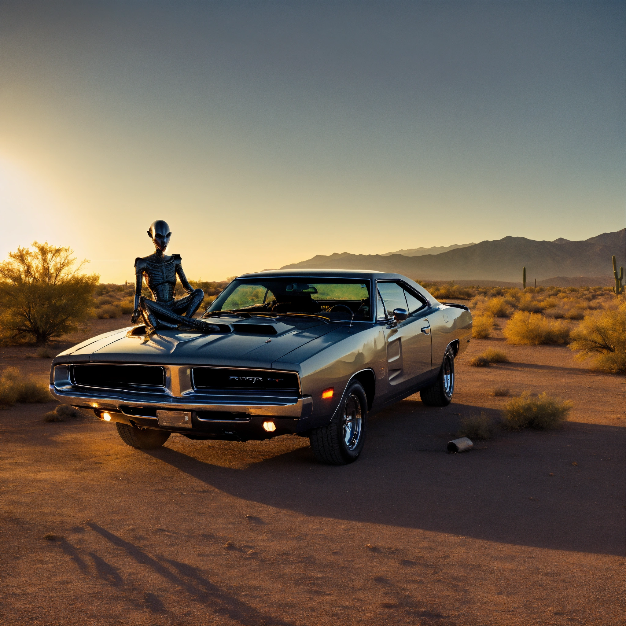 Very creepy realistic grey alien sitting in dodge charger srt, smoking a blunt, arizona, unsettling, wide angle, golden hour