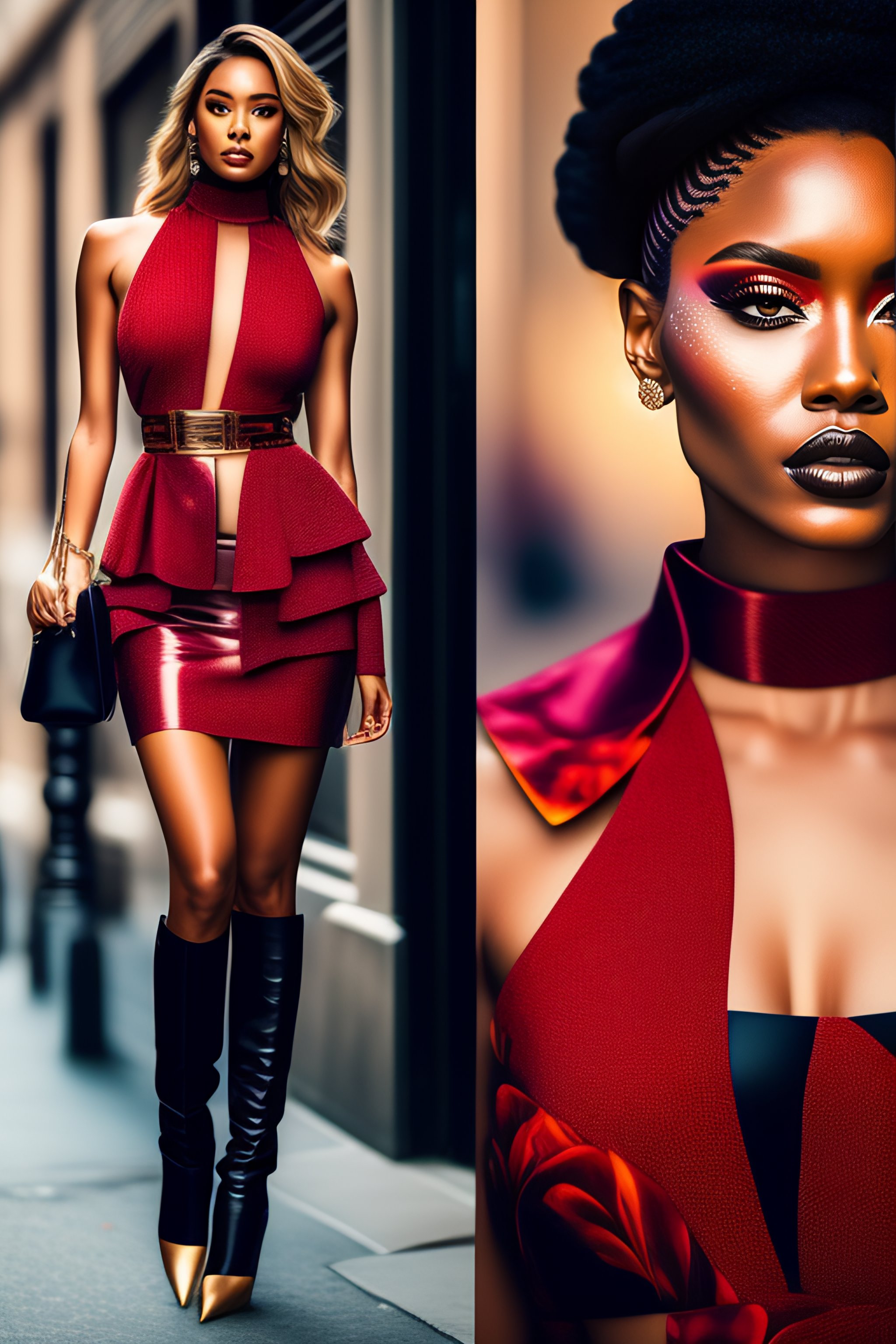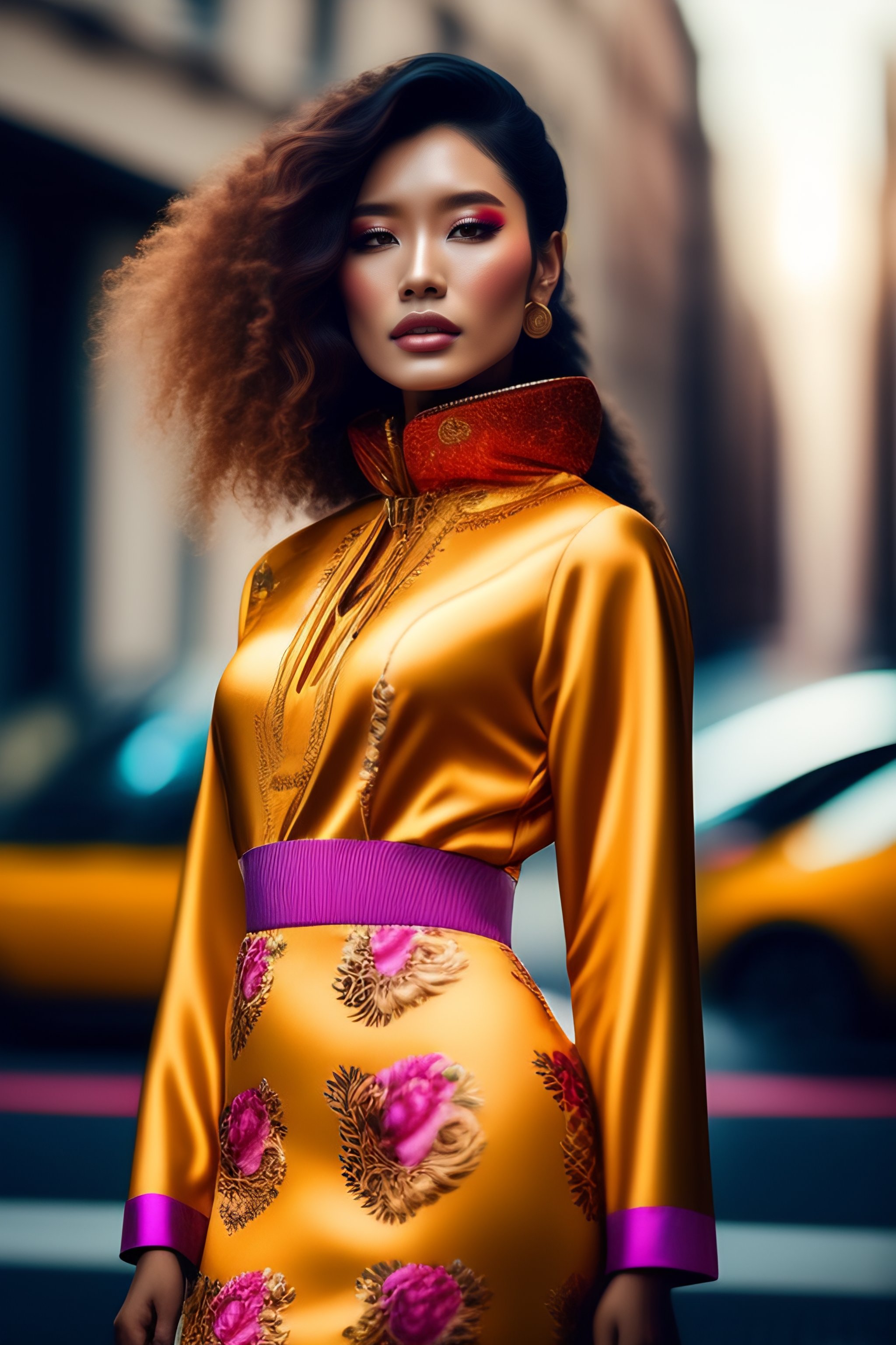 Fashionable editorial woman artistic concptual model poses stylish different elegant poses modern street wear printed fabric cool photograph