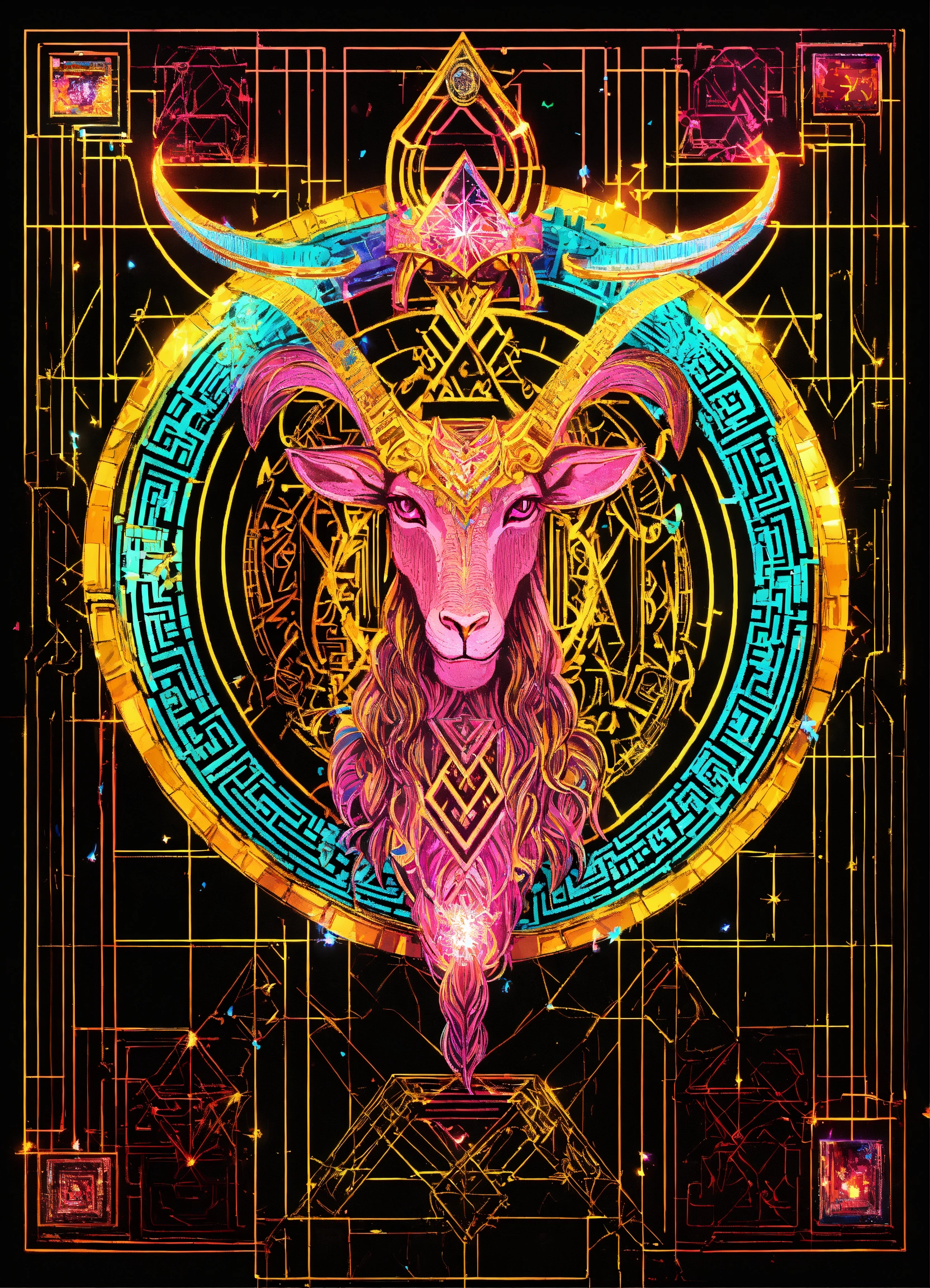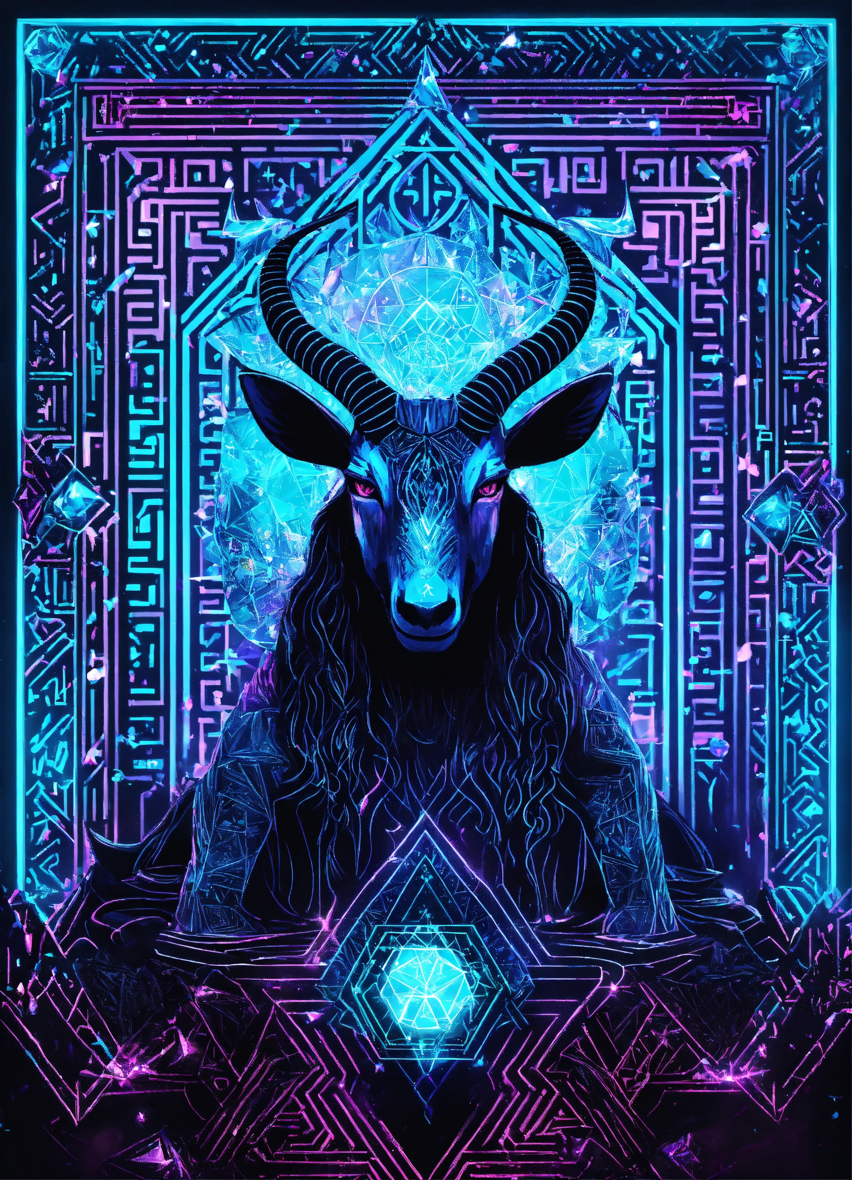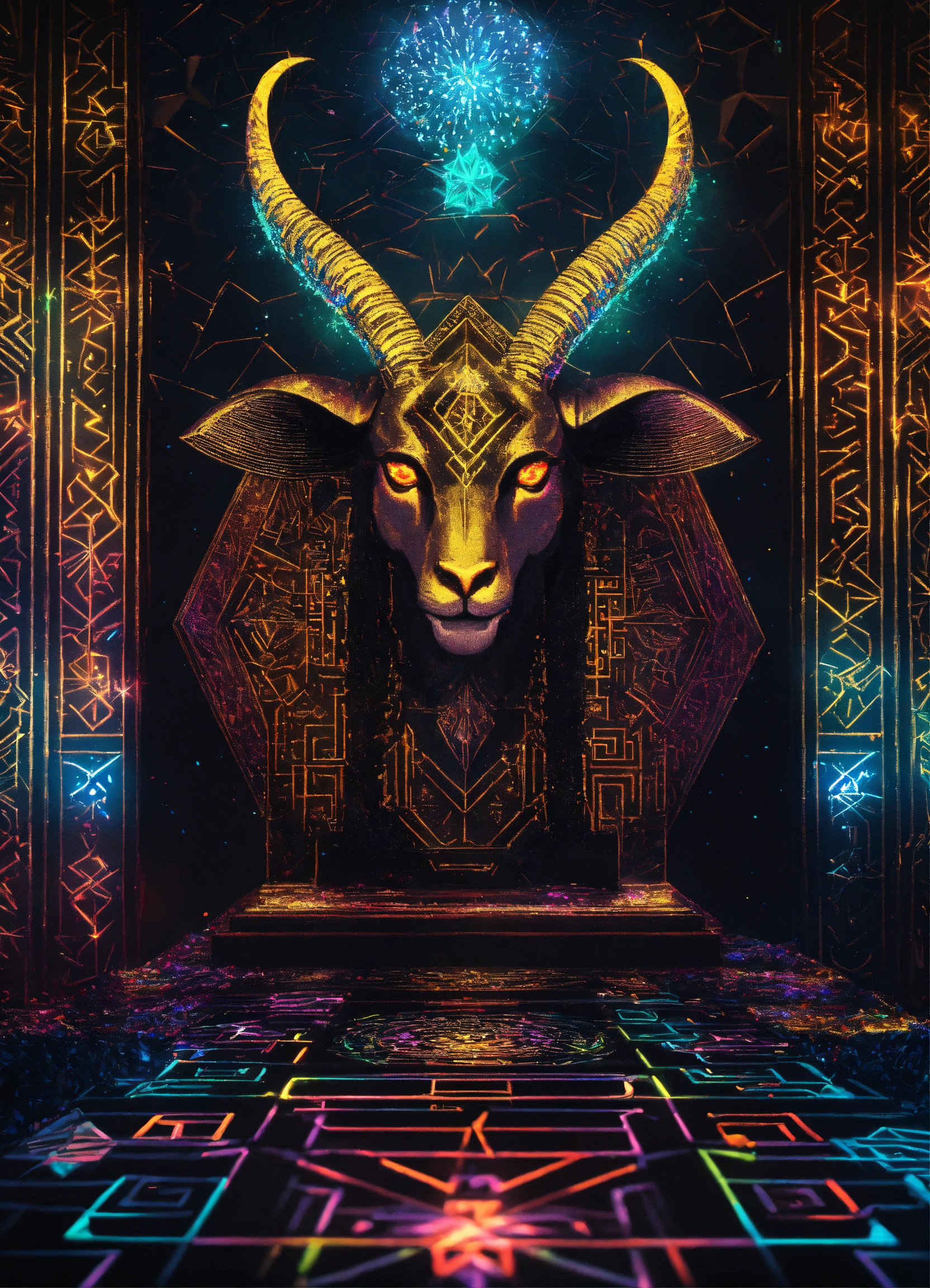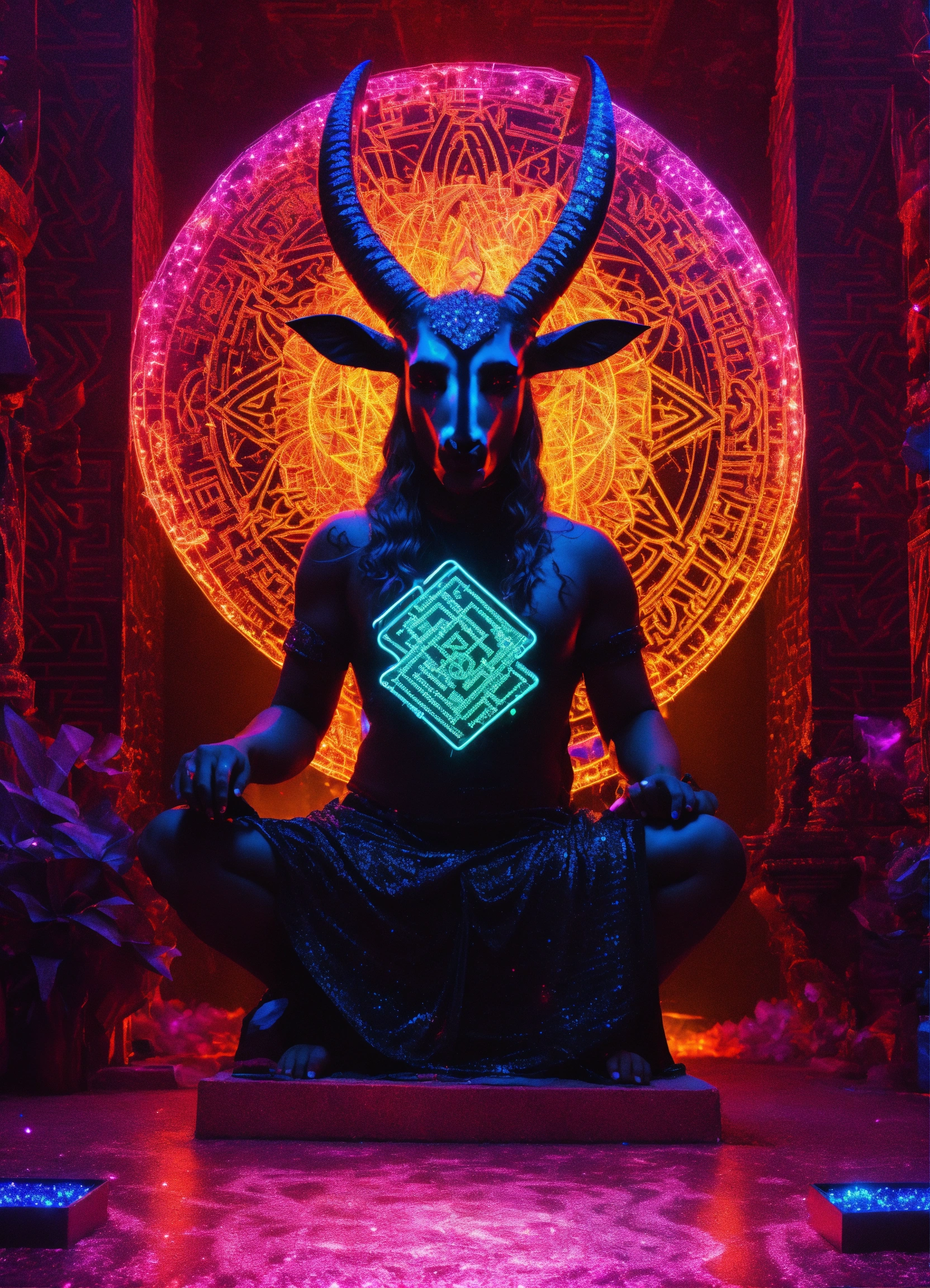 Baphomet made of diamonds black neon light dmt light crystal sacred geometry confetti glitter sparkle fireworks, qr code digital crystal microchip skin walls in maze temple