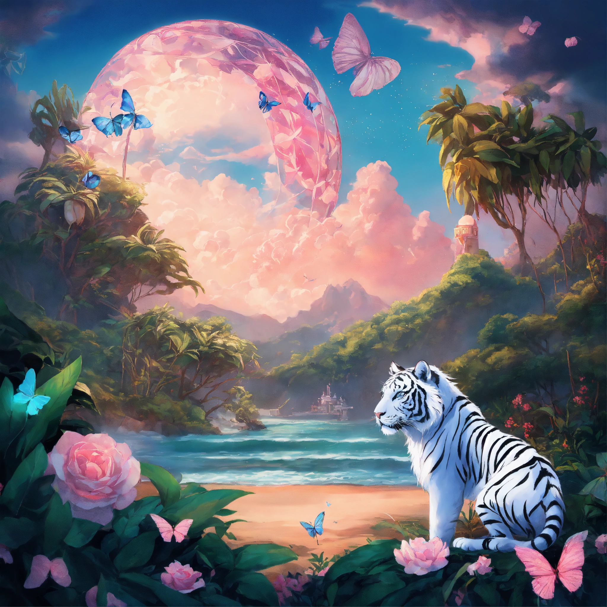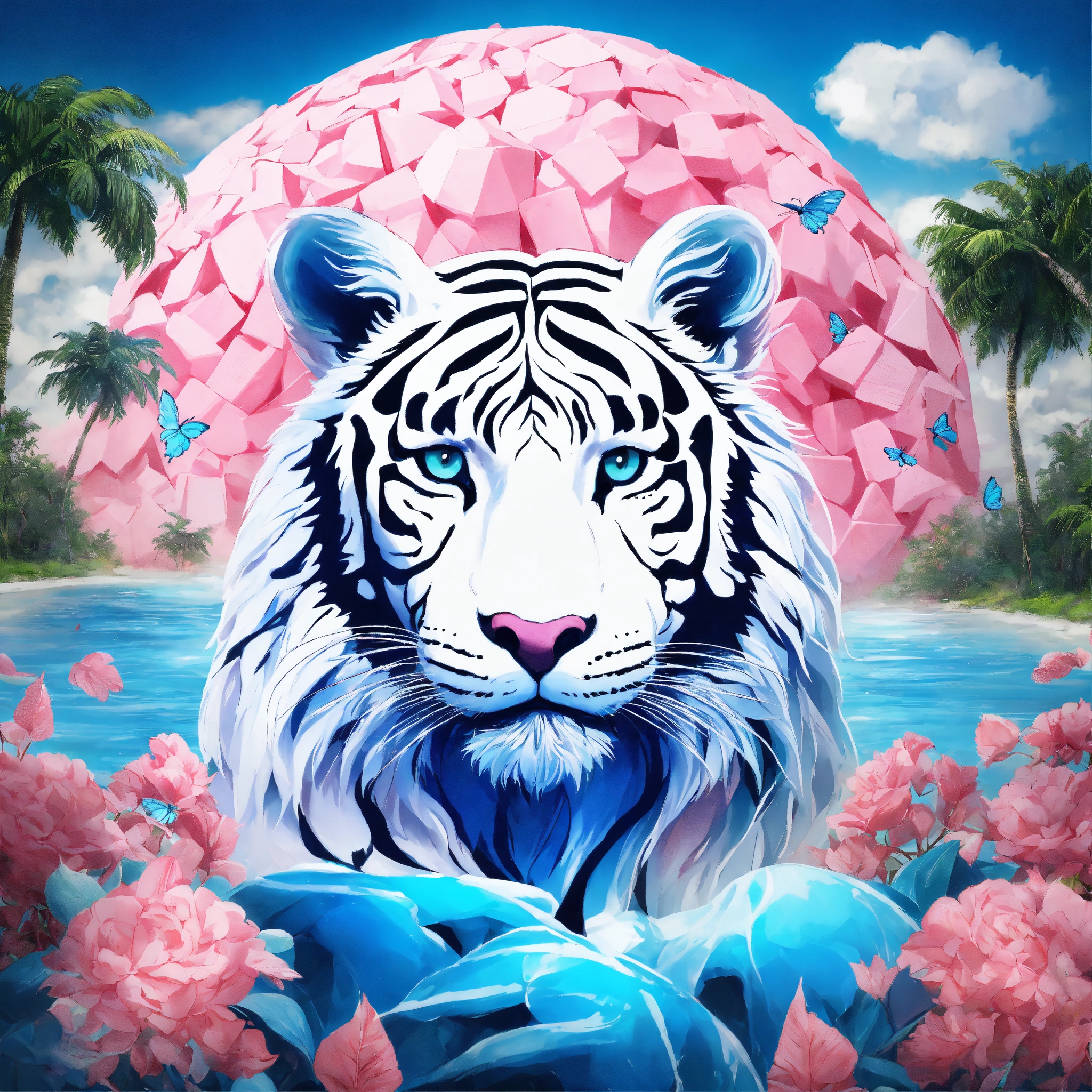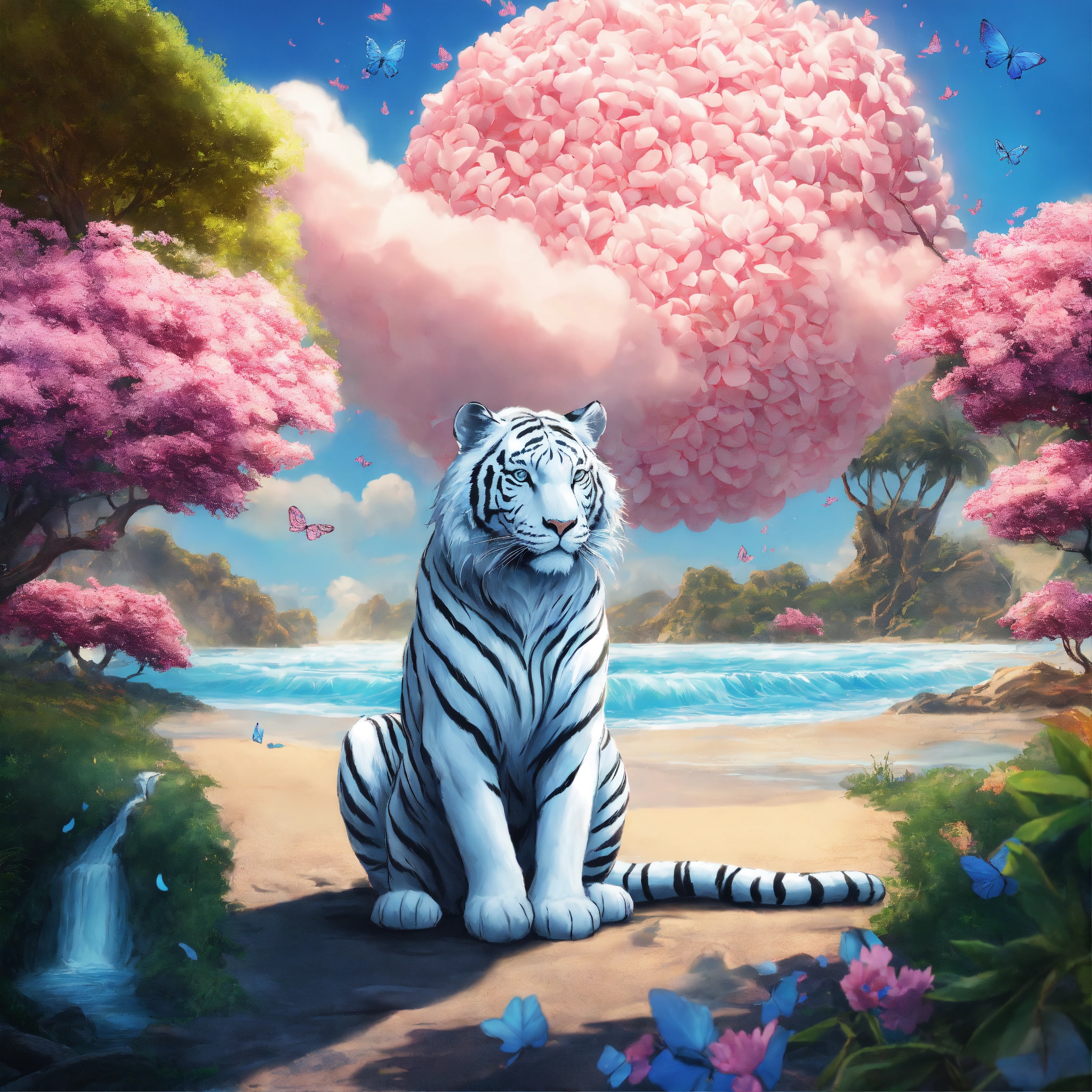 Image. illustrate a white tiger with blue yes surrounded by pink butterflies on a coconut milk ocean beach, surrounded by giant marshmallow clouds. long exposure photography style, cartoon style, x-ray style, in the style of tim burton, lion king, the chronicles of narnia, beauty and the beast, and peter pan. with native american and sacred geometric patterns on the body. enchanting aura. the chronicles of narnia, wizard of oz, and alice in wonderland background and fruit trees with white leaves.