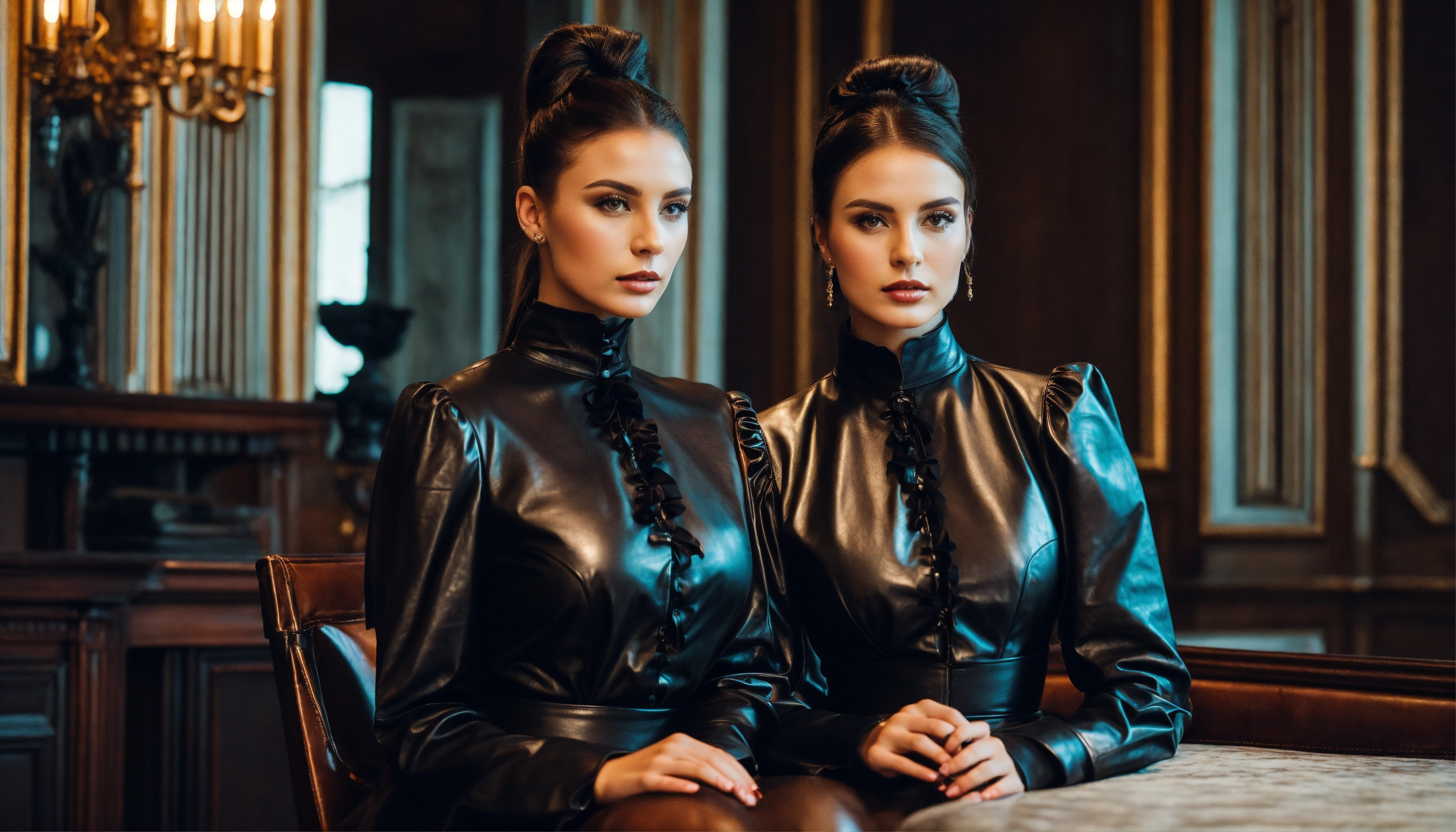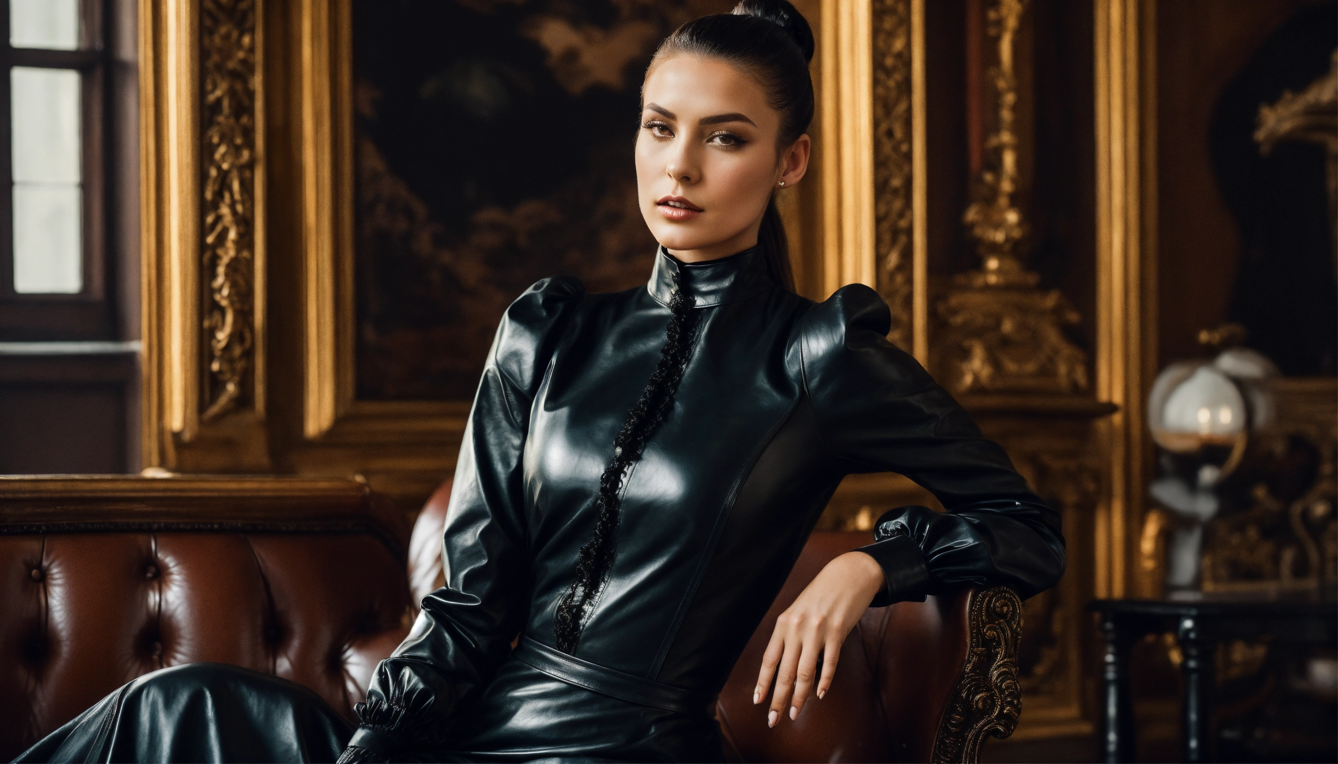 Stunning european mistress woman fashion model sitting, brunette straight high ponytail, strict victorian governess black leather shirt dress with long puff sleeves, mansion room