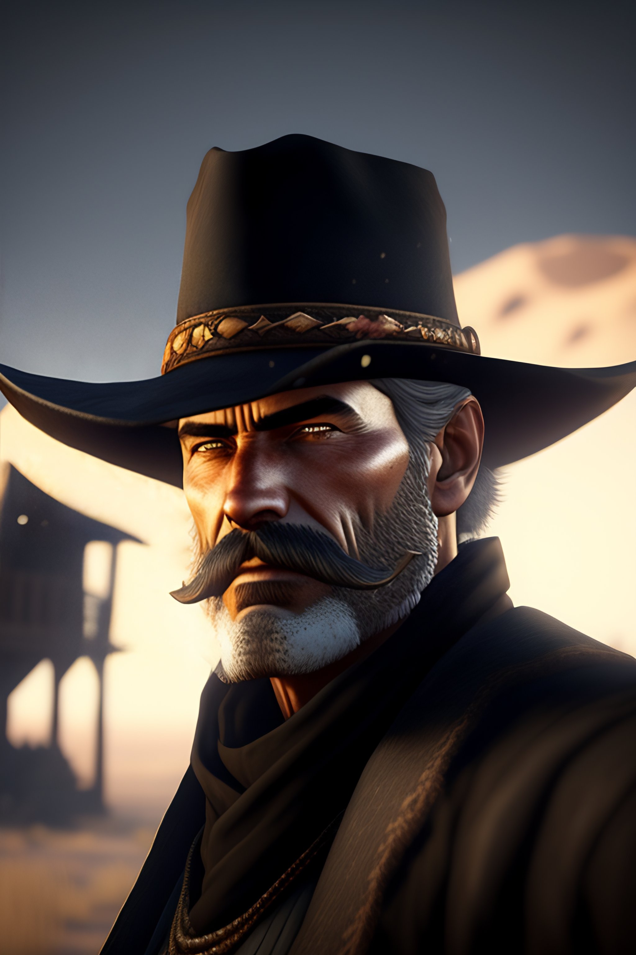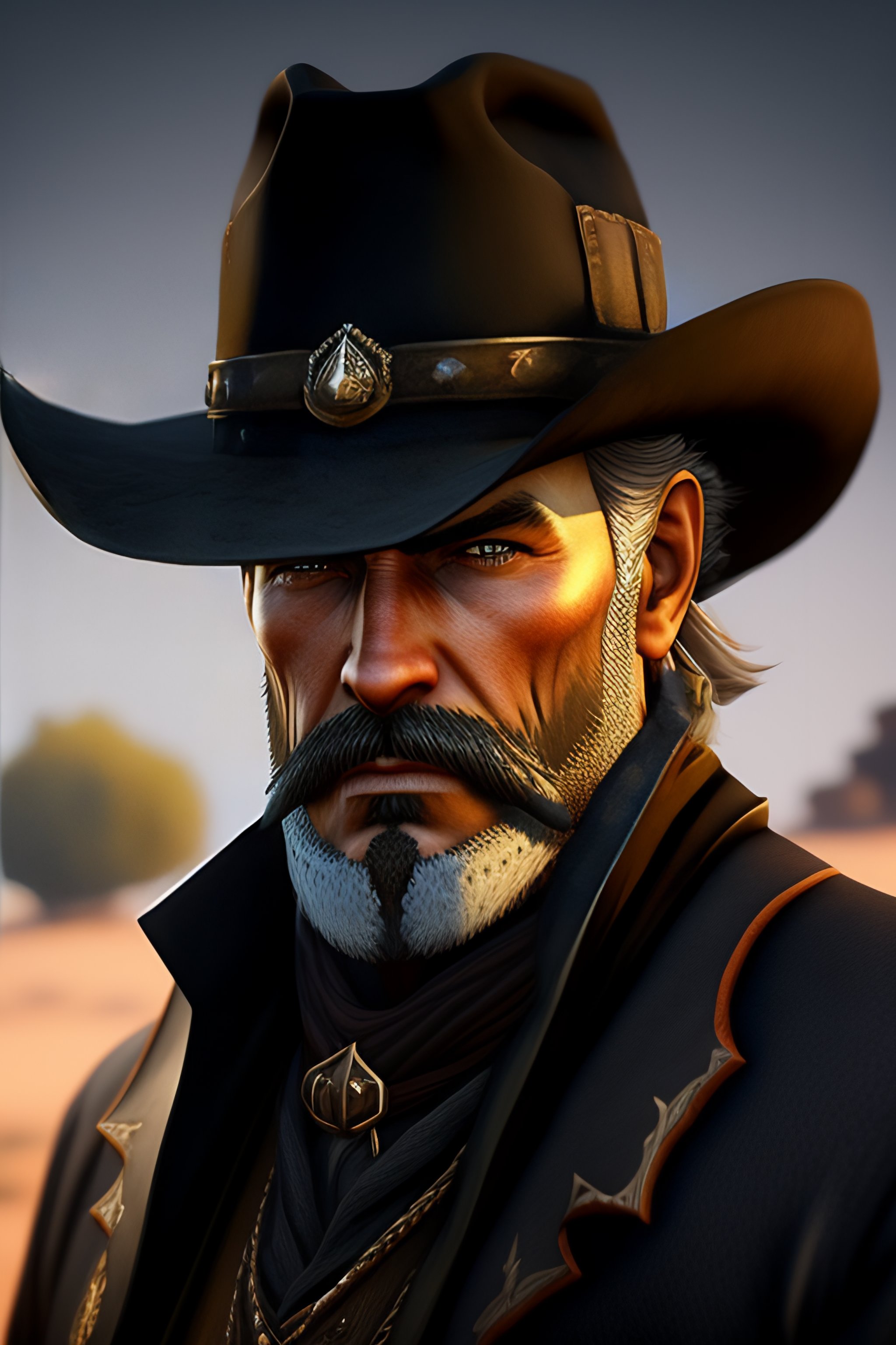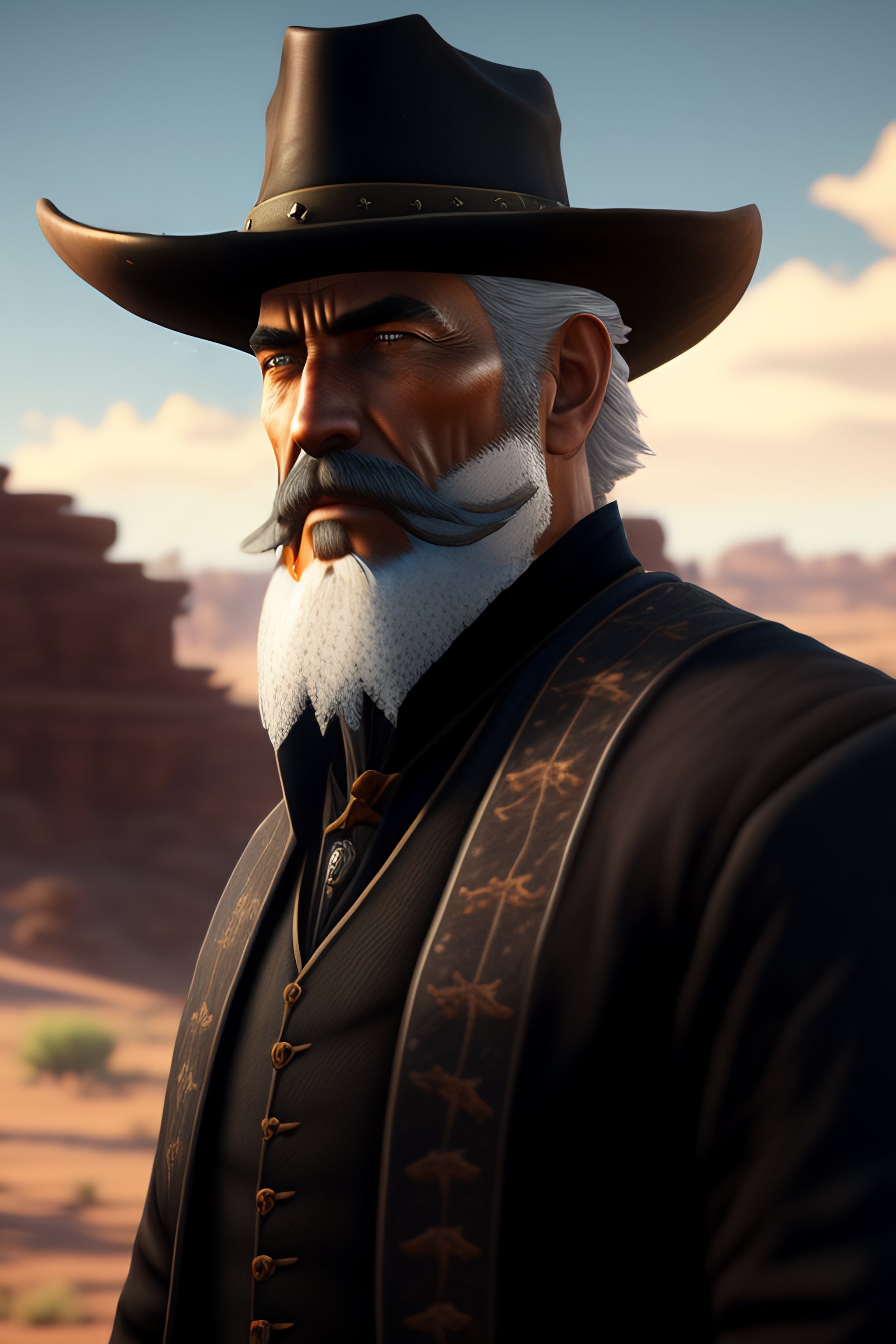 Wild west portrait of a gunslinger old man in black duster with a goatee anime high quality, detailed, dark colors, intricate, realistic cartoon, in style of red dead redemption 8k