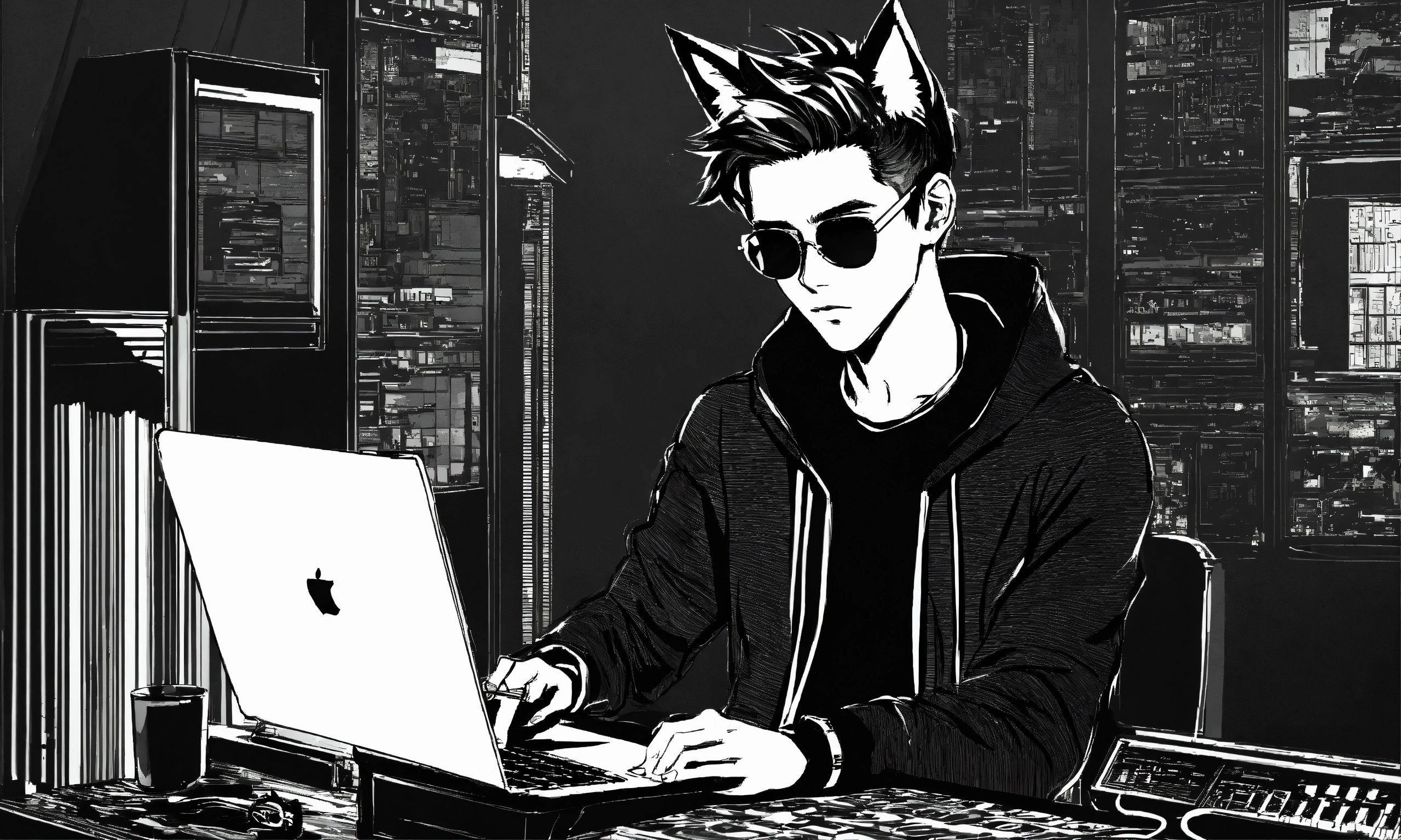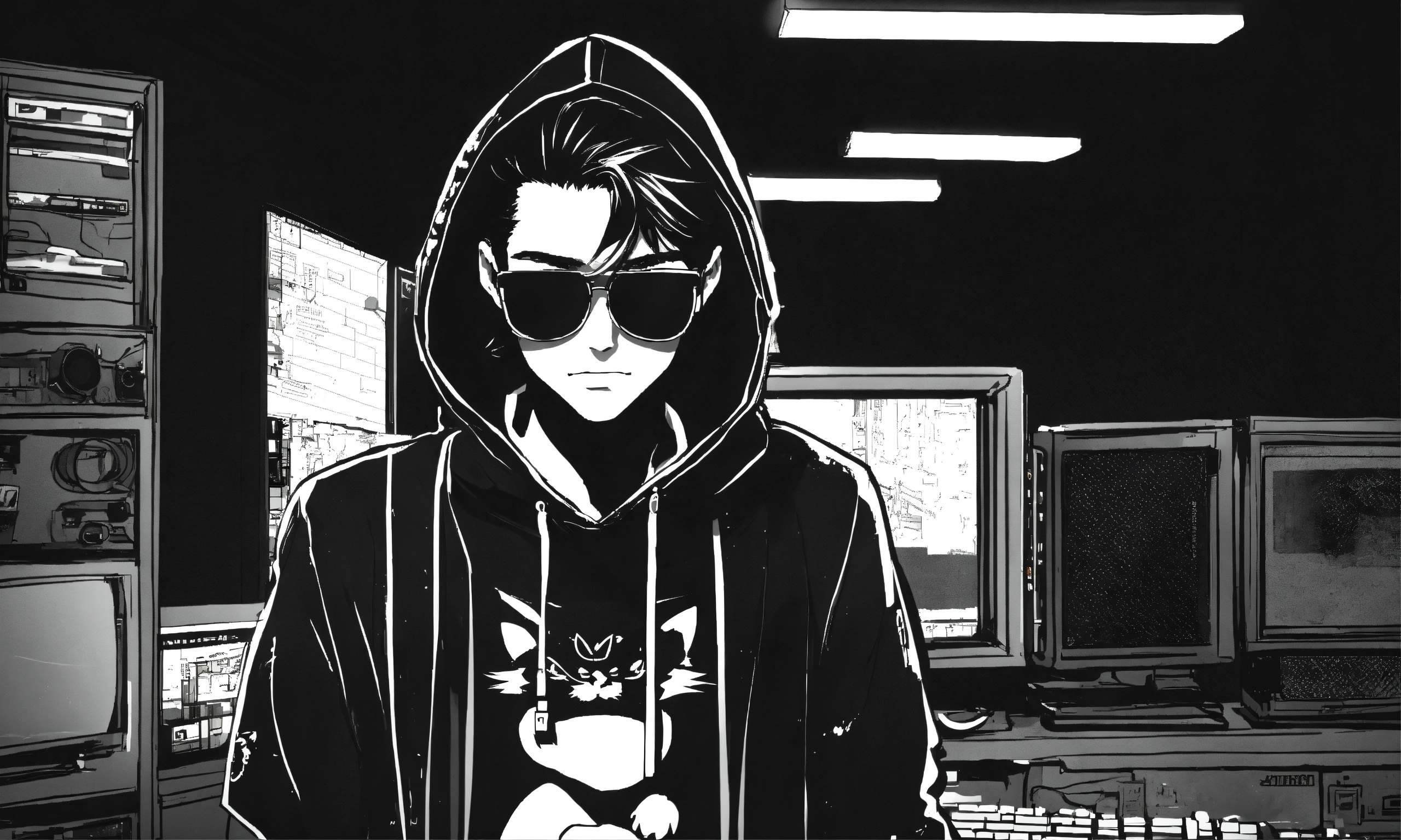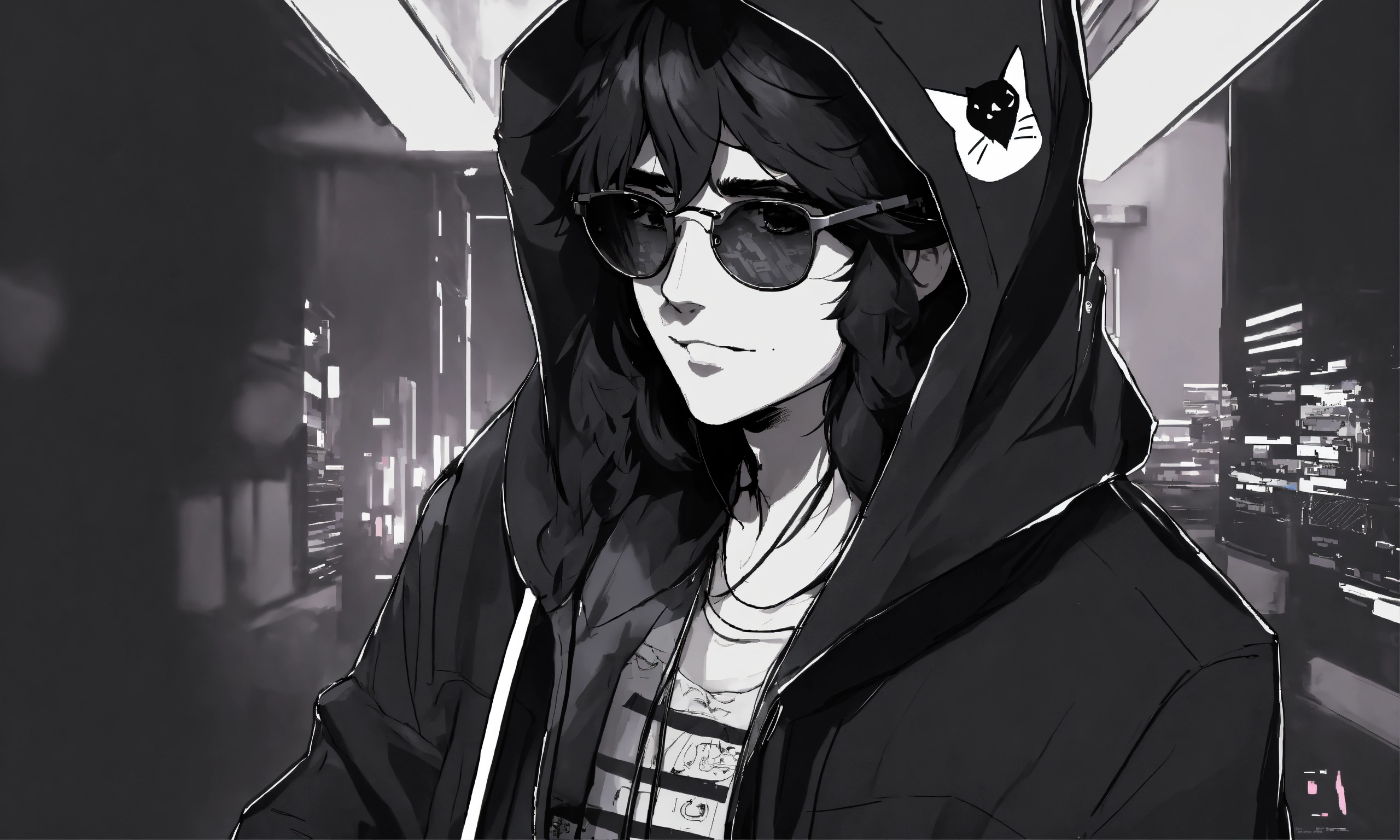 Twitch vtuber model, european guy in black hoodie, long dark hair, black and white cat ears, black sunglasses, line art, face dark room, retro anime, manga, black and white, pixels 8 bit, pen drawing, sticker, glitch, pattern, cartoon