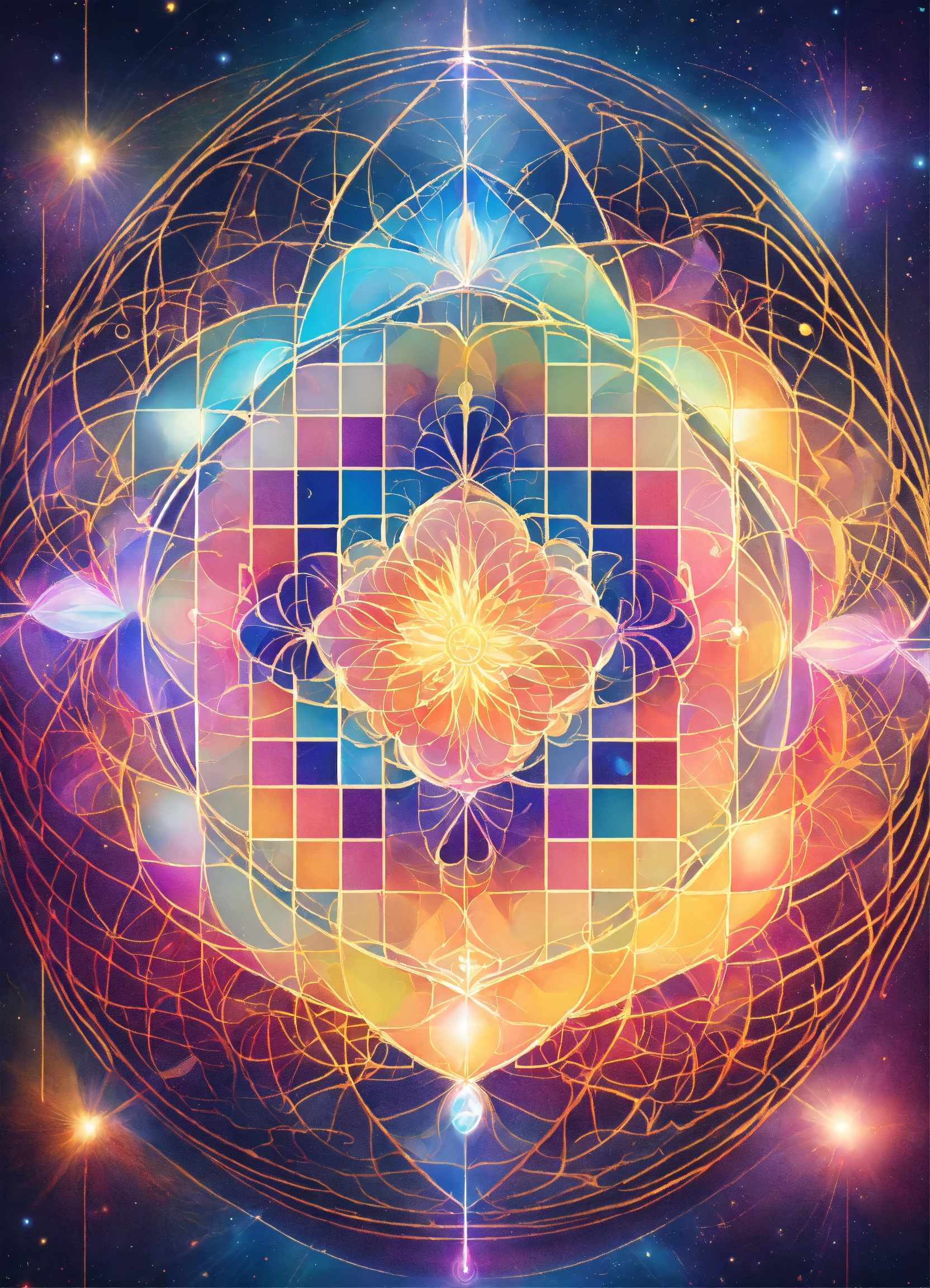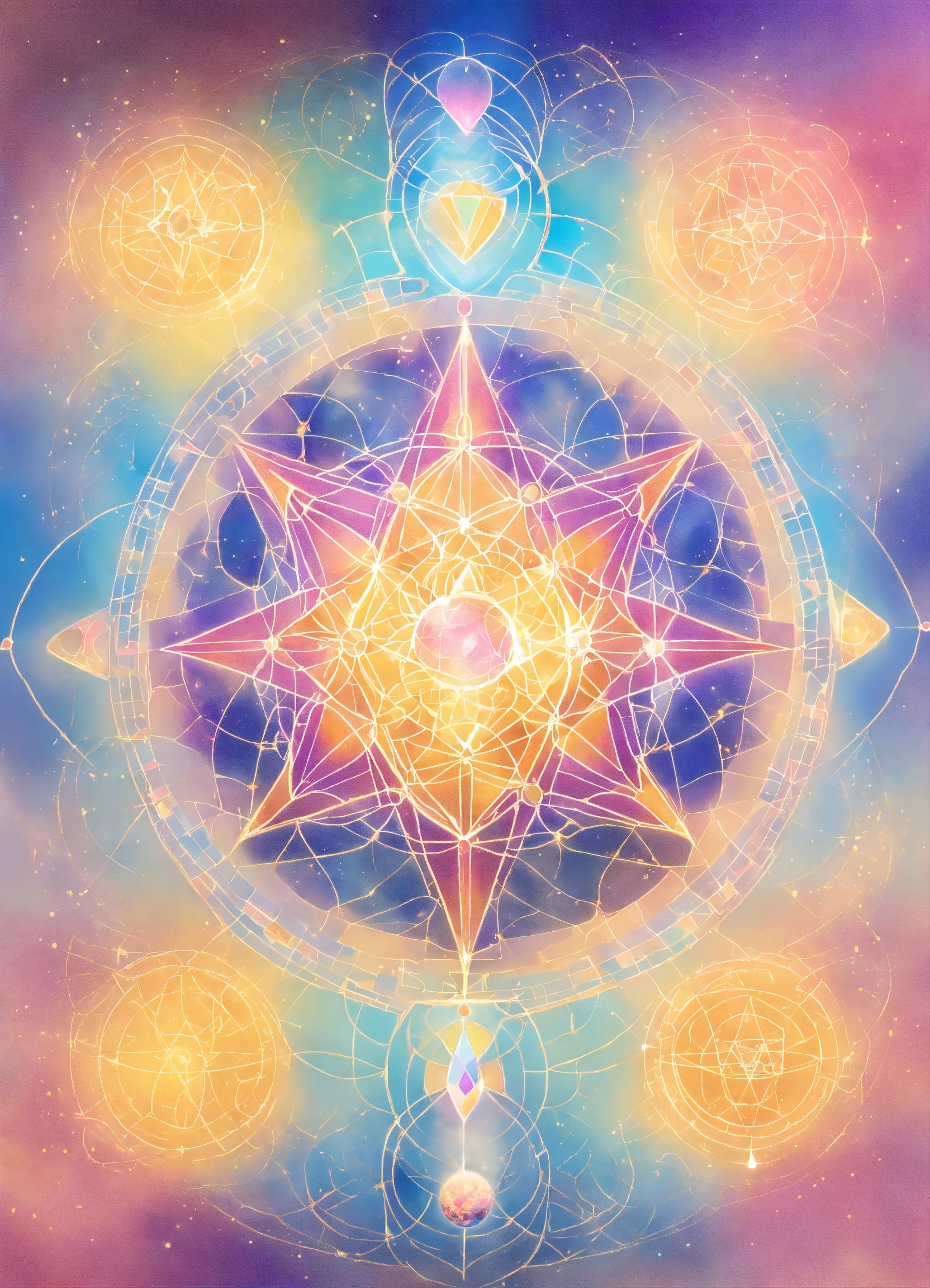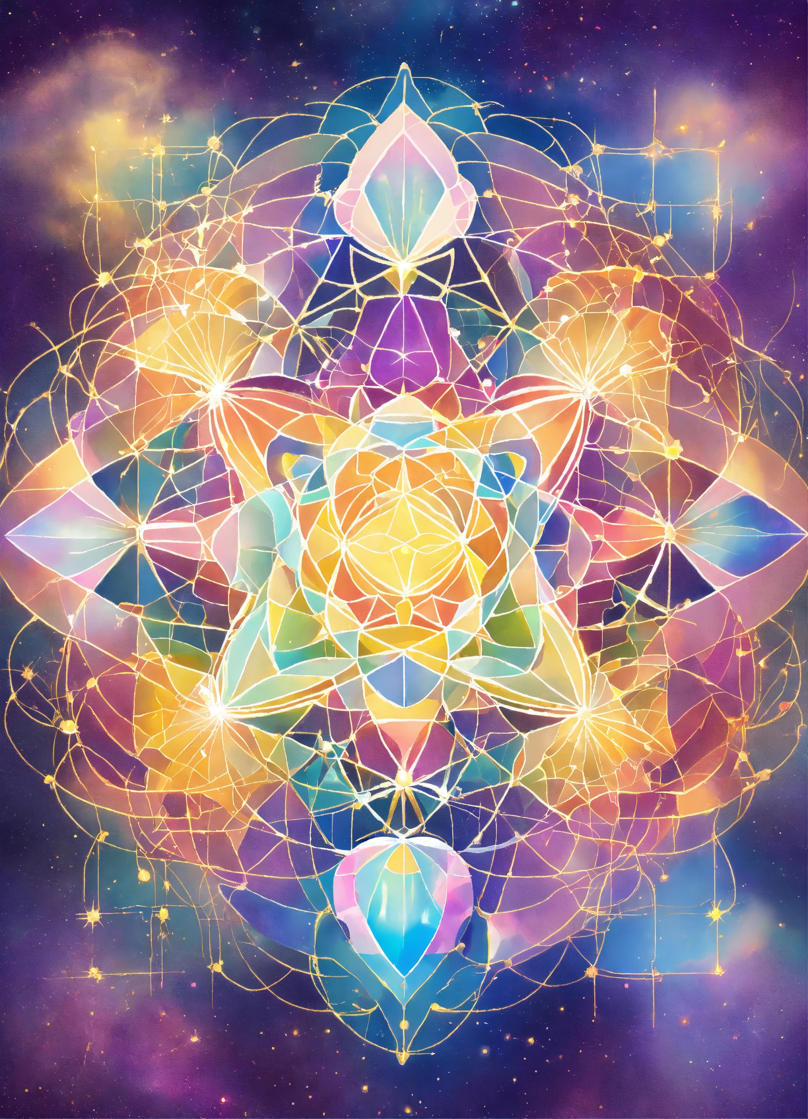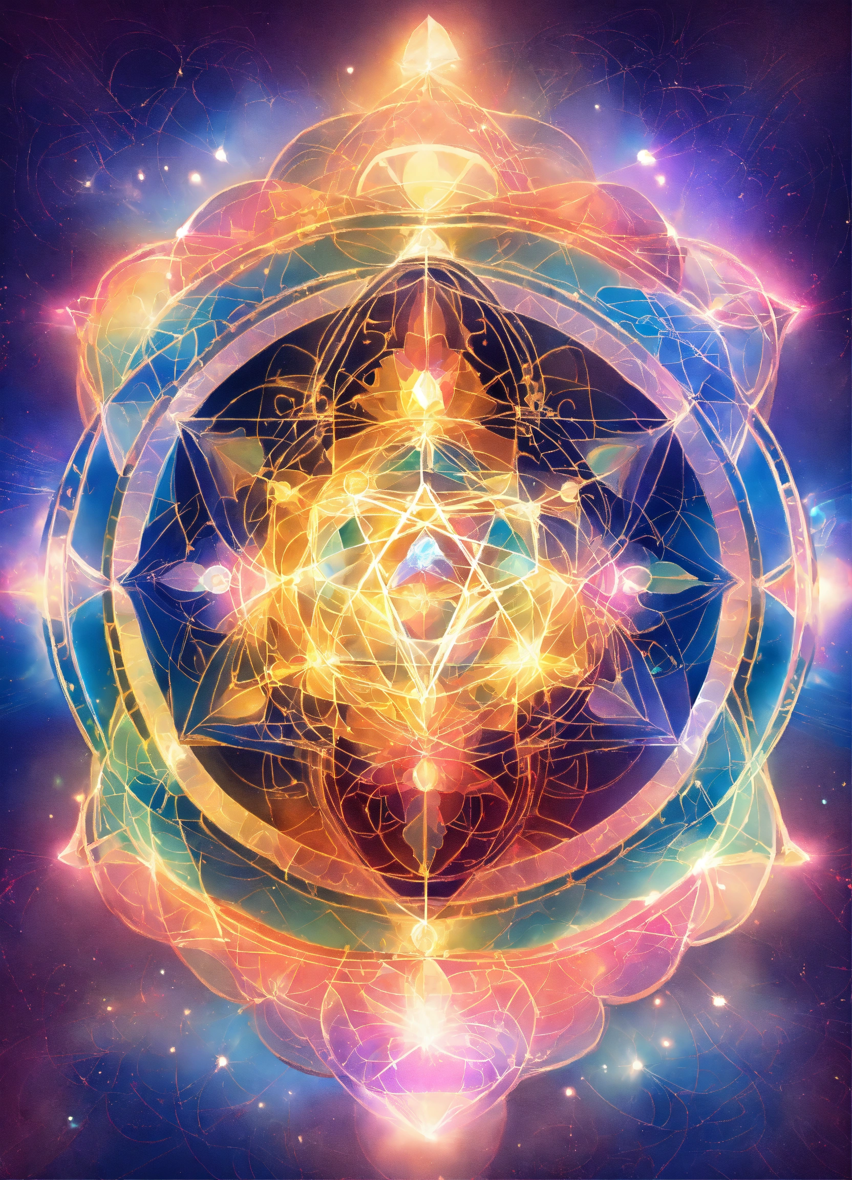 Expression symbole, vibrating, connected to other universe, pastel colors, shinning light, sacred geometry