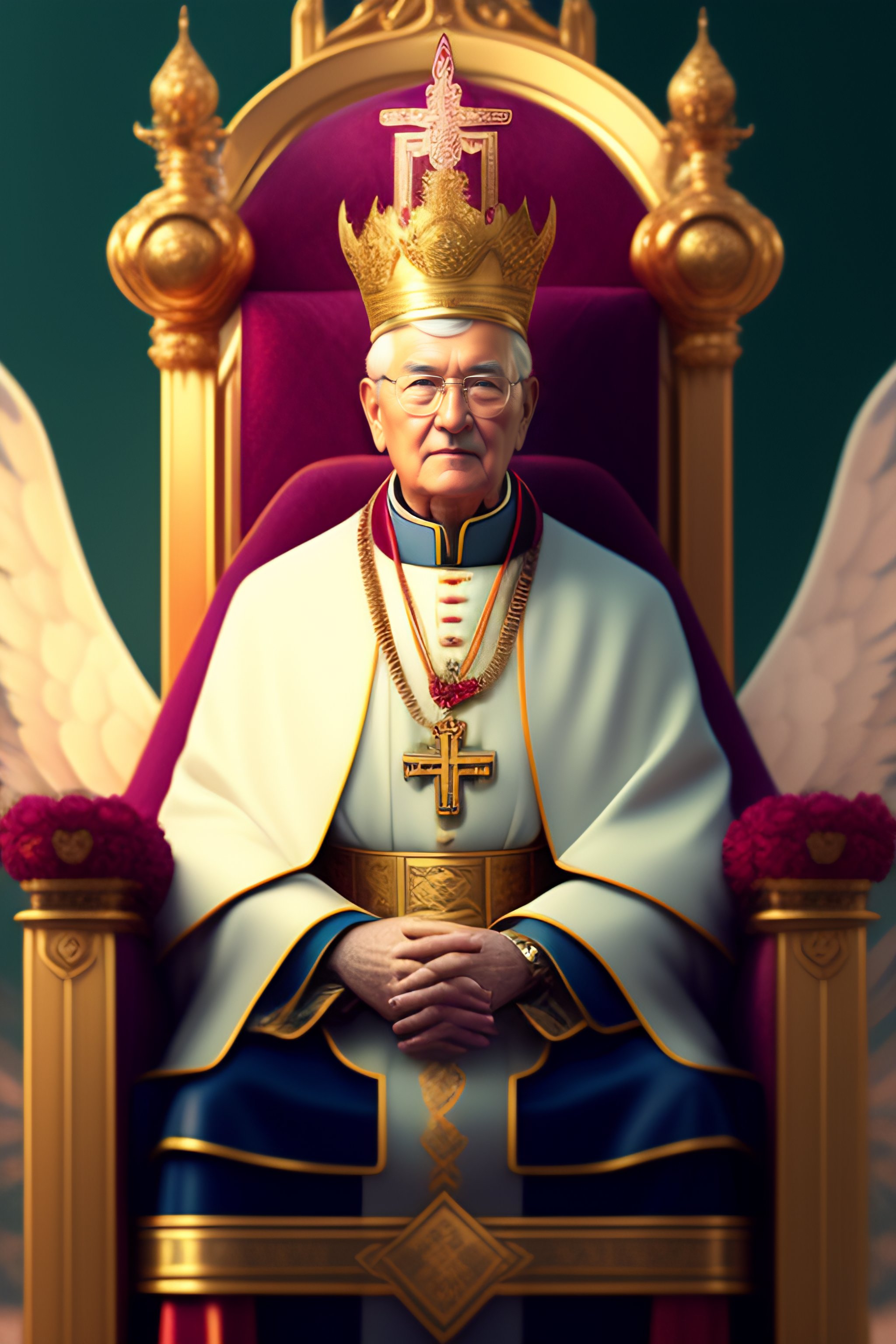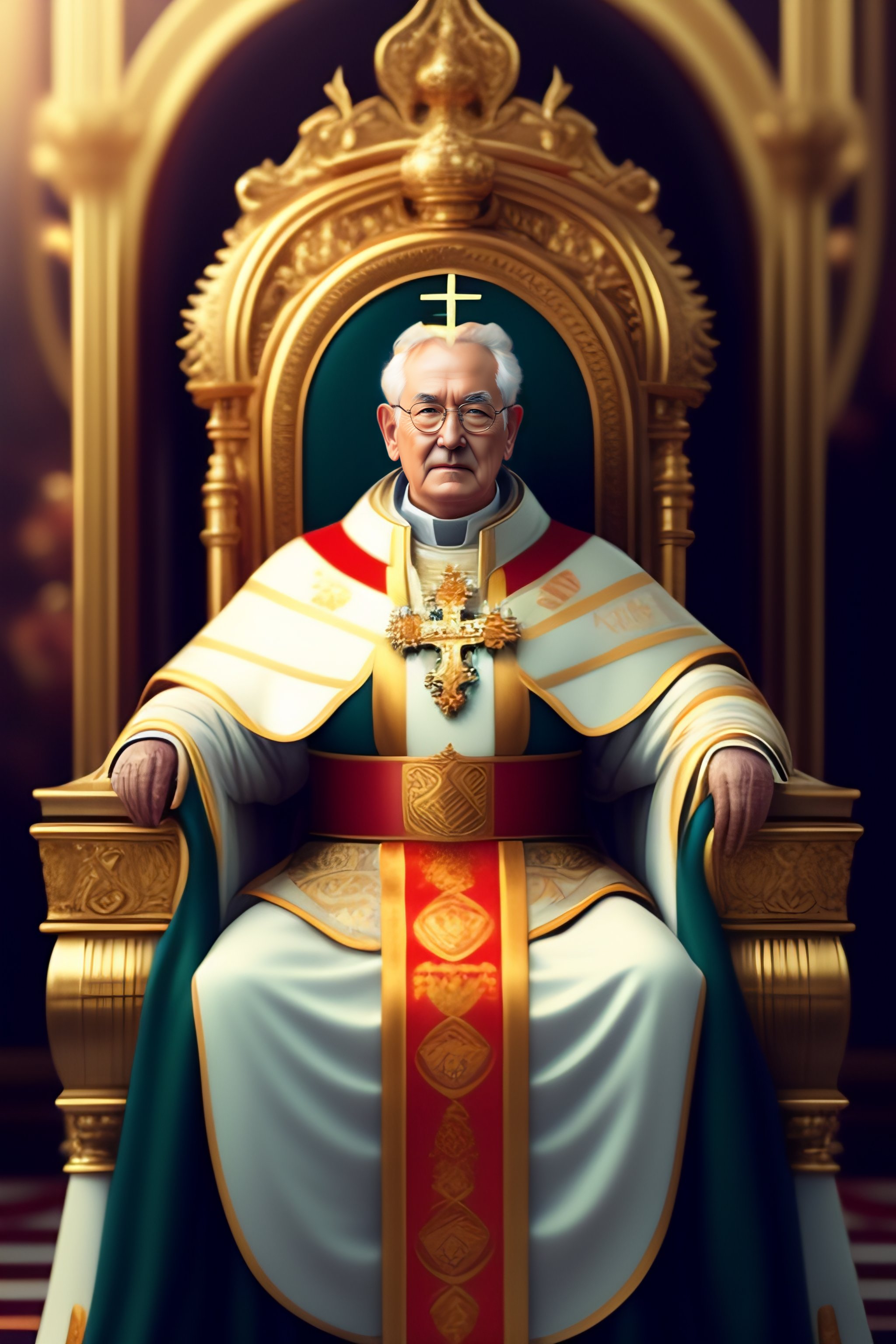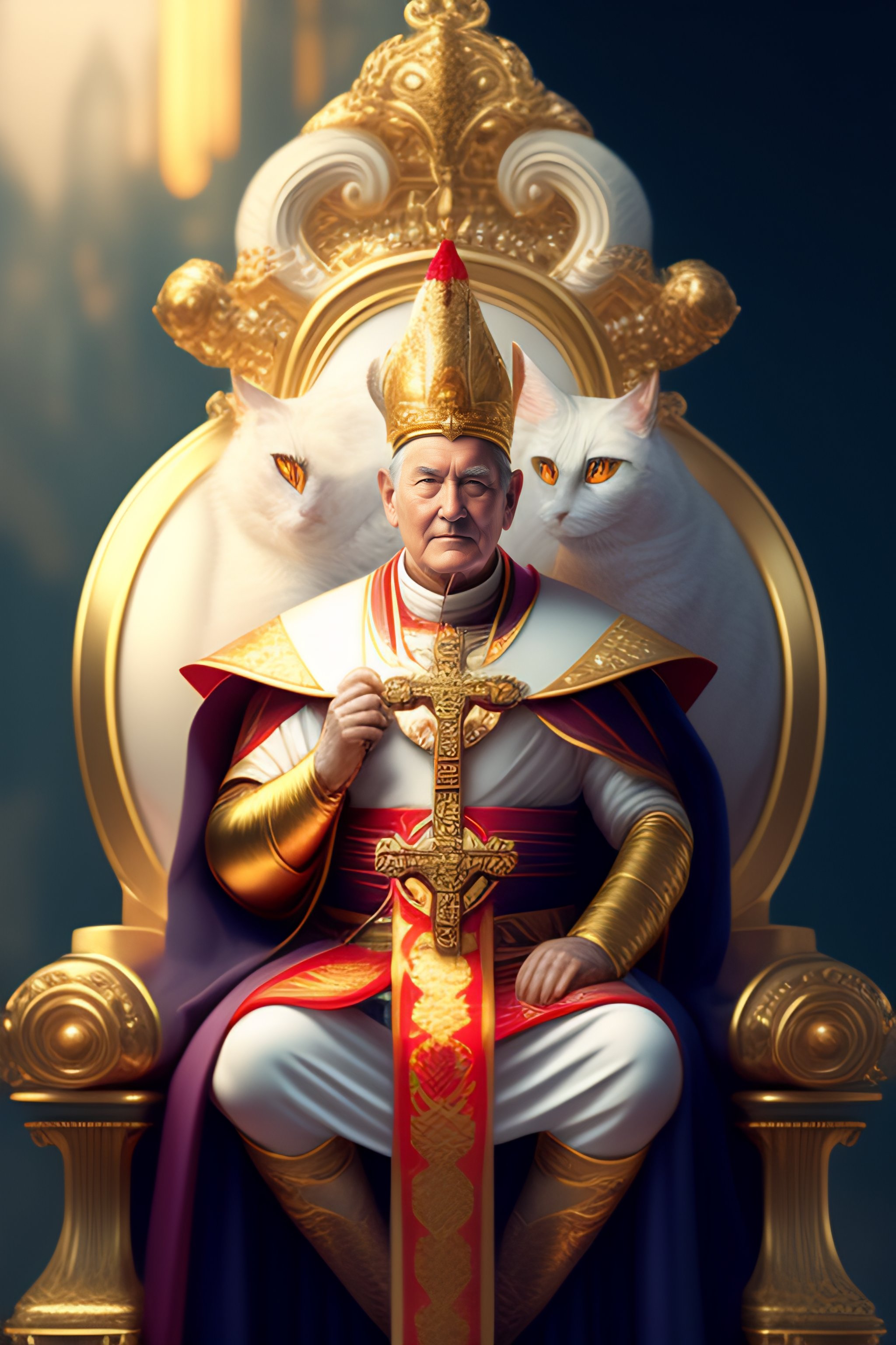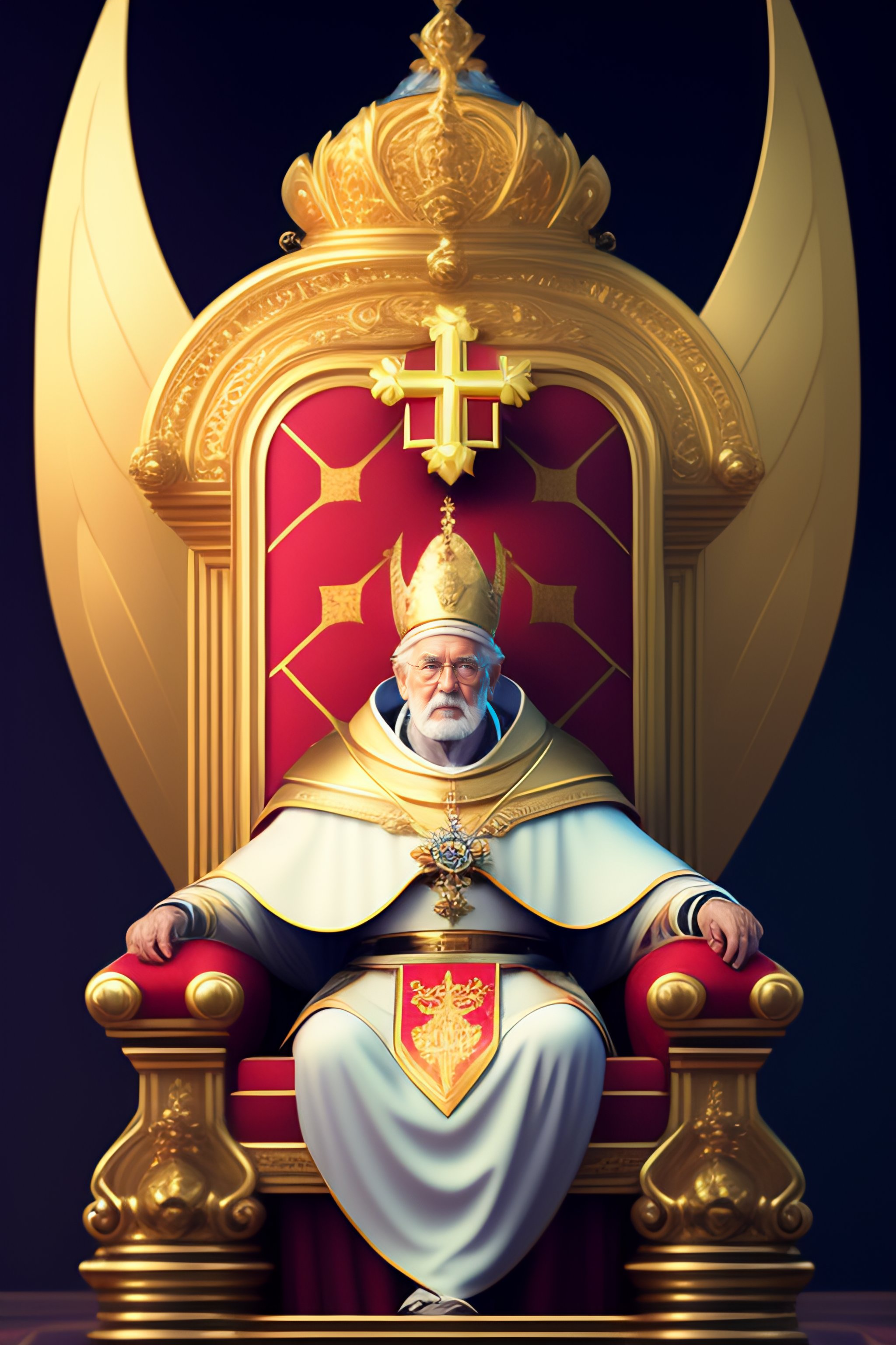 Old priest pope wearing papal tiara sitting in a throne between 2 columns. in one hand he's holding a triple cross. art inspired by sachin teng and sam yang!! and artgerm!! and alphonse mucha, lois van baarle and ross tran!!. in the style of digital art, symmetry, hyper detailed. octane render. trending on artstation