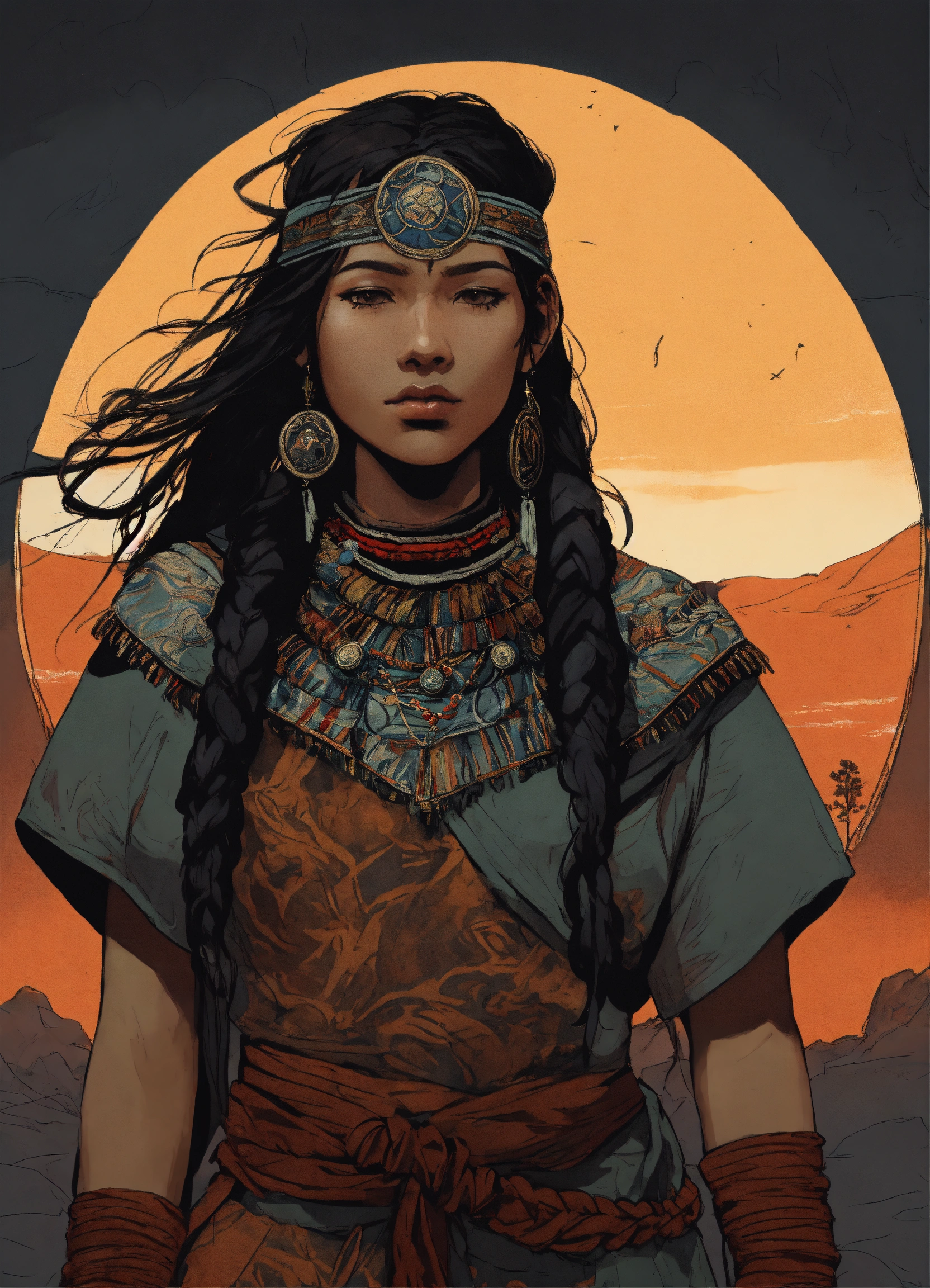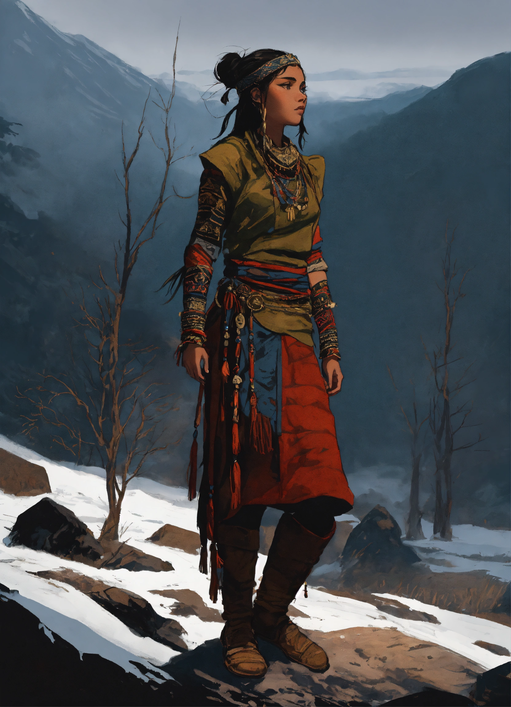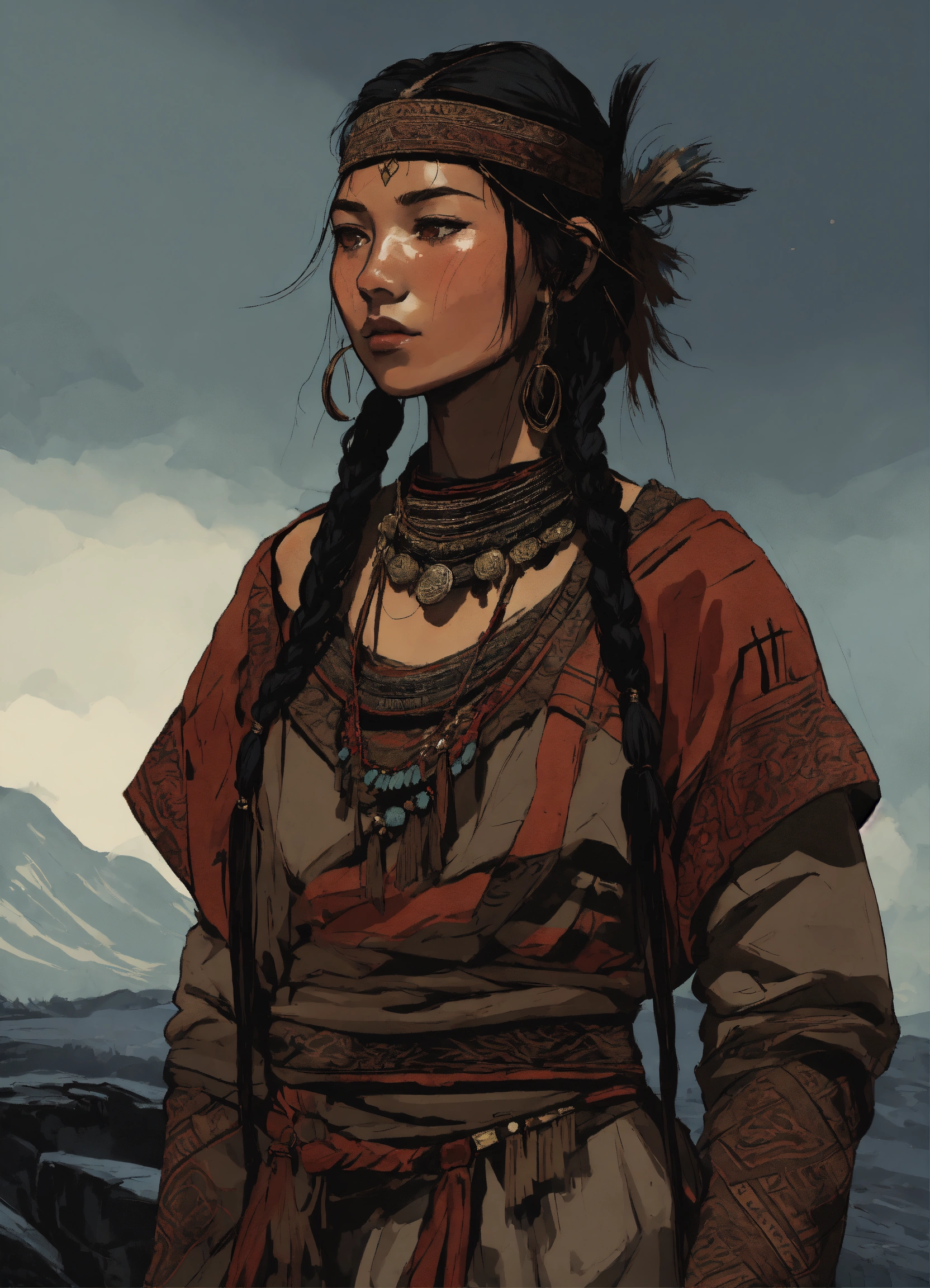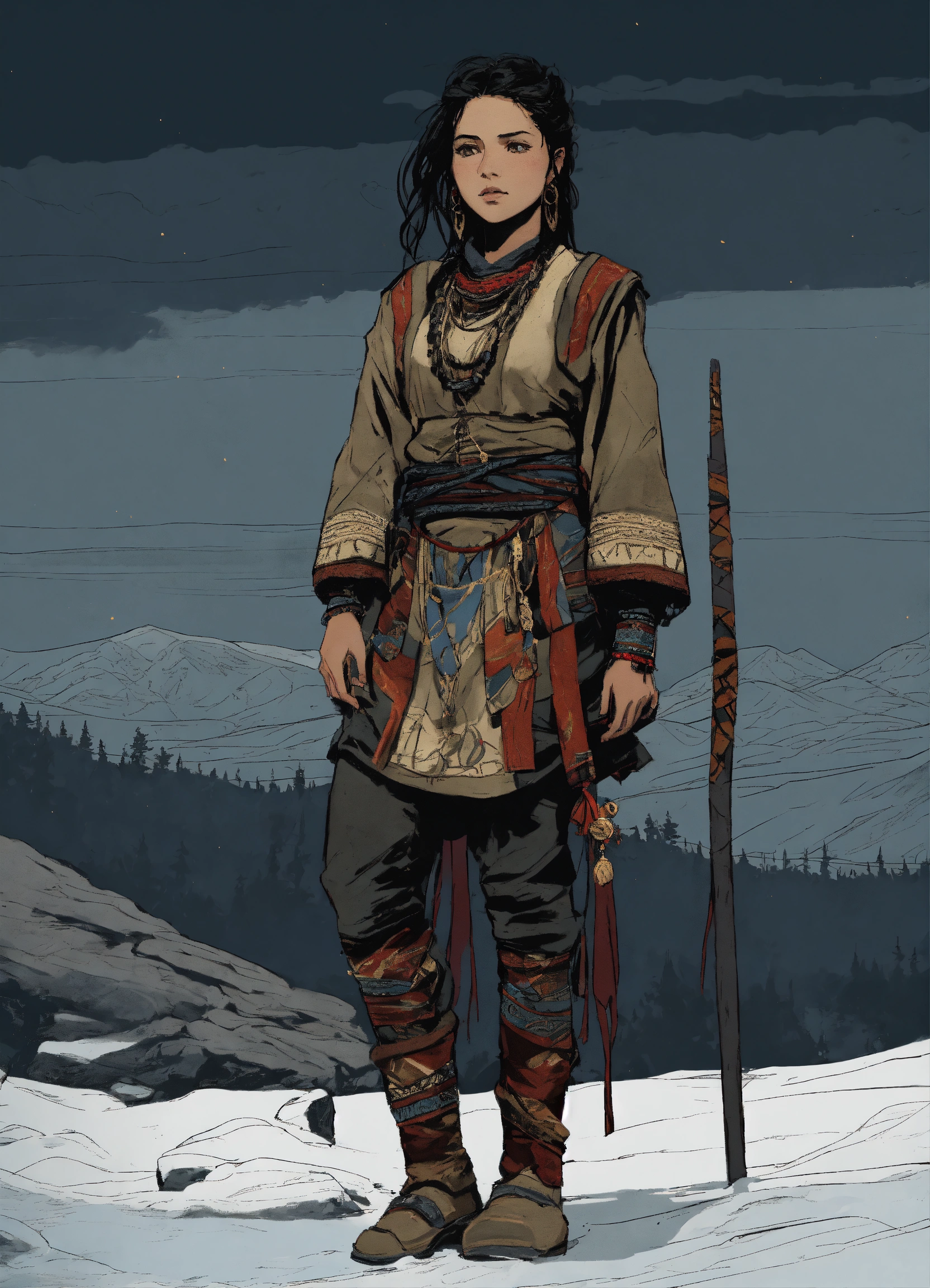 Illustration of a young sámi woman in the style of bernie wrightson. 18 years old, olive skin, black hair, mongolian phenotype, tribal sámi clothing, tribal adornments, full body. gloomy and depressing atmosphere. dark hues color palette, composition balance, drawing, outlined silhouettes, shadows, highlights, intricate details, dark fantasy, narrative-rich illustration, visual compellingness in the style of bernie wrightson. inspired by senua's hellblade and horizon zero dawn.