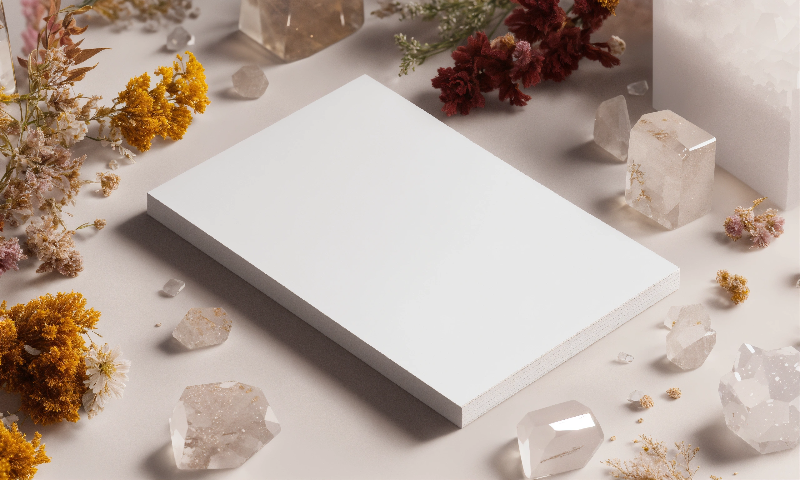 Stationery mockup, white square card, large circle sticker, detailed white quartz crystals, dried flowers in the background, 3d, white, light shadows, light shadows, bright background