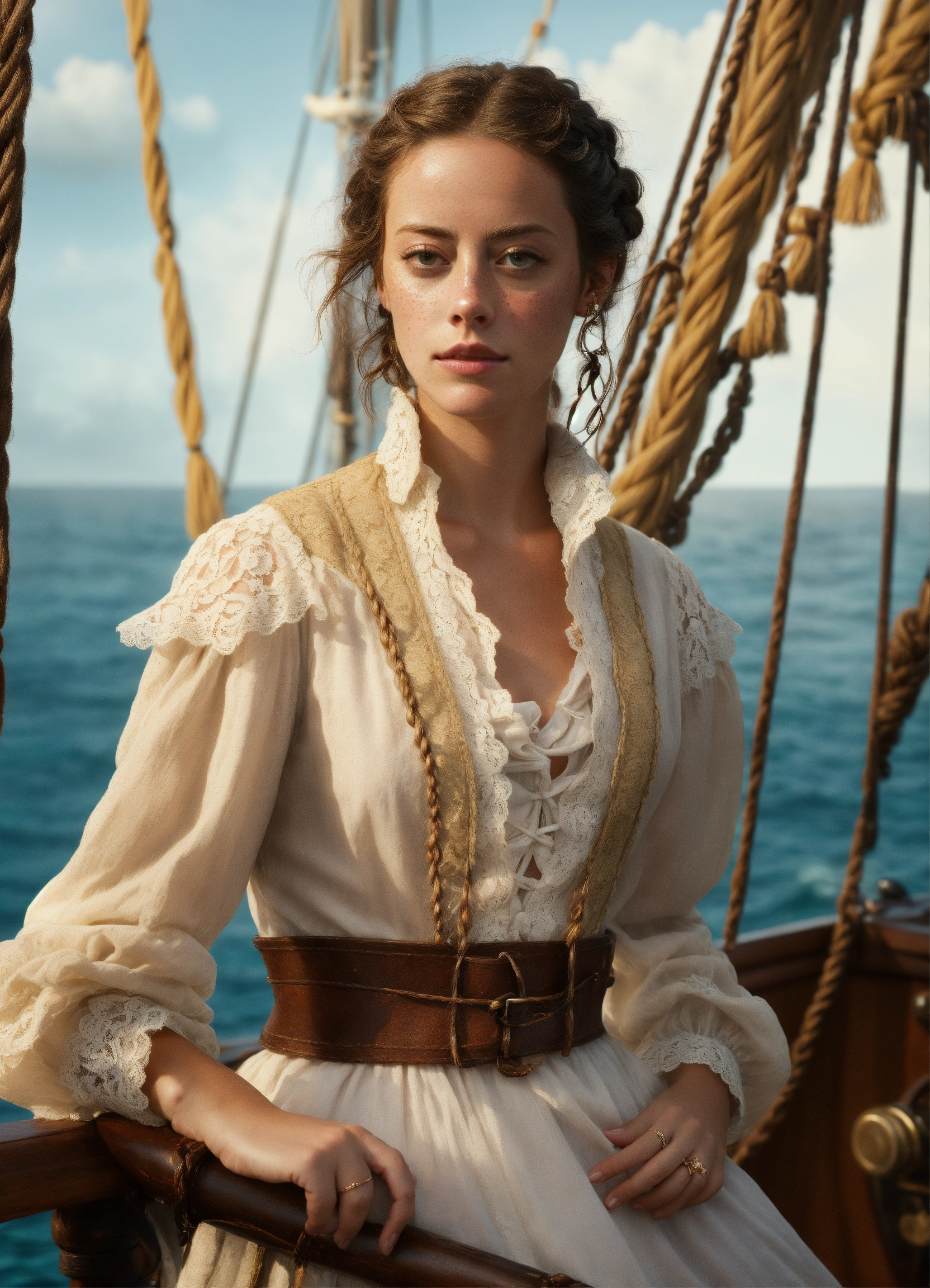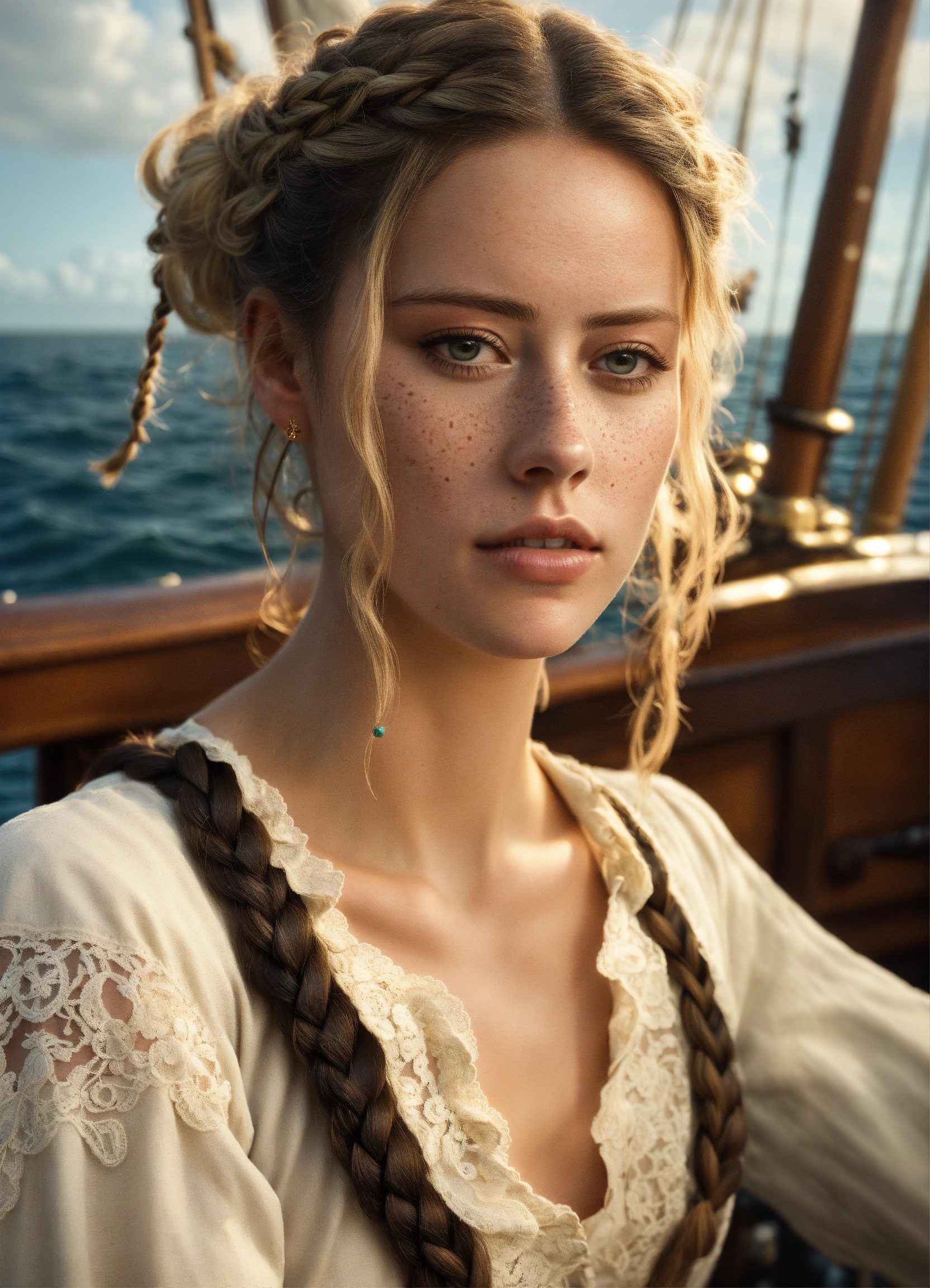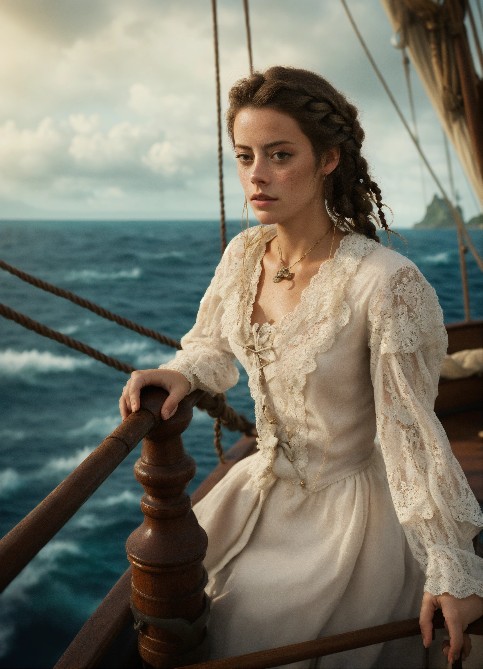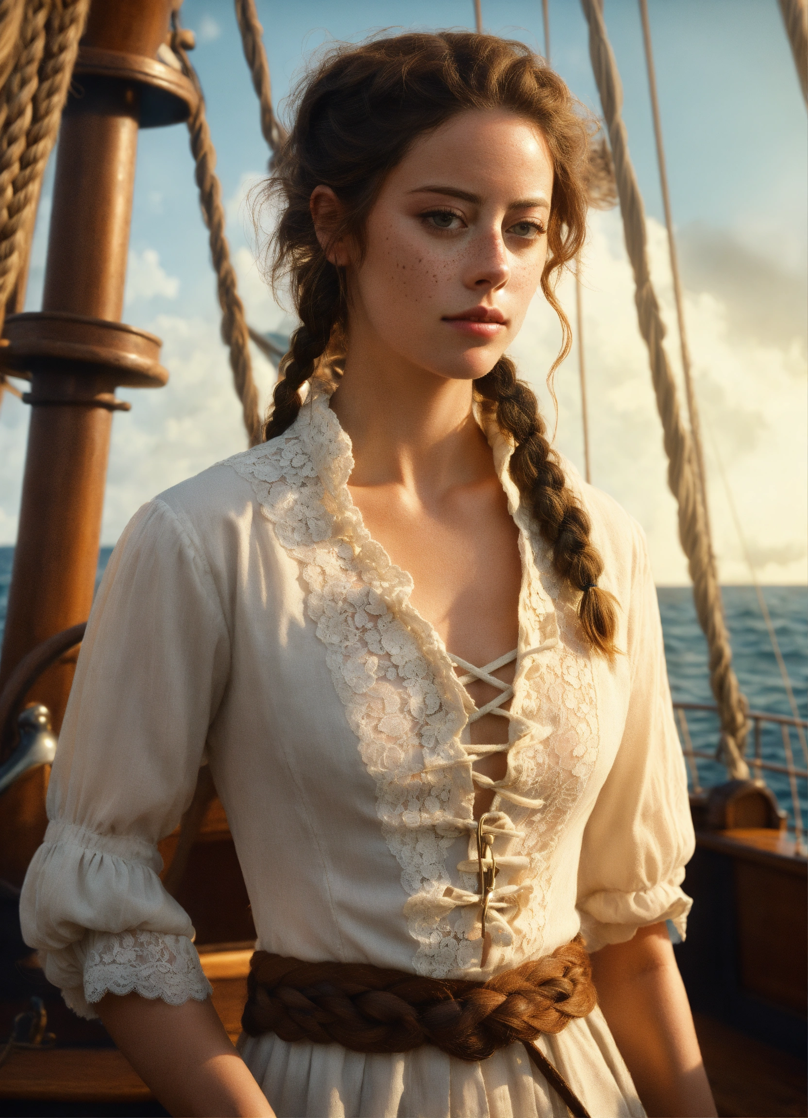 Kaya scodelario in a white antique lace shirt and pirate coat on the deck of a sail ship, short straight blonde hair with braid, brown eyes, freckles, half moon scar on cheek, closed lips, the sea and an overgrown island in the background, fantasy, digital painting, studio lighting, unreal engine, octane render