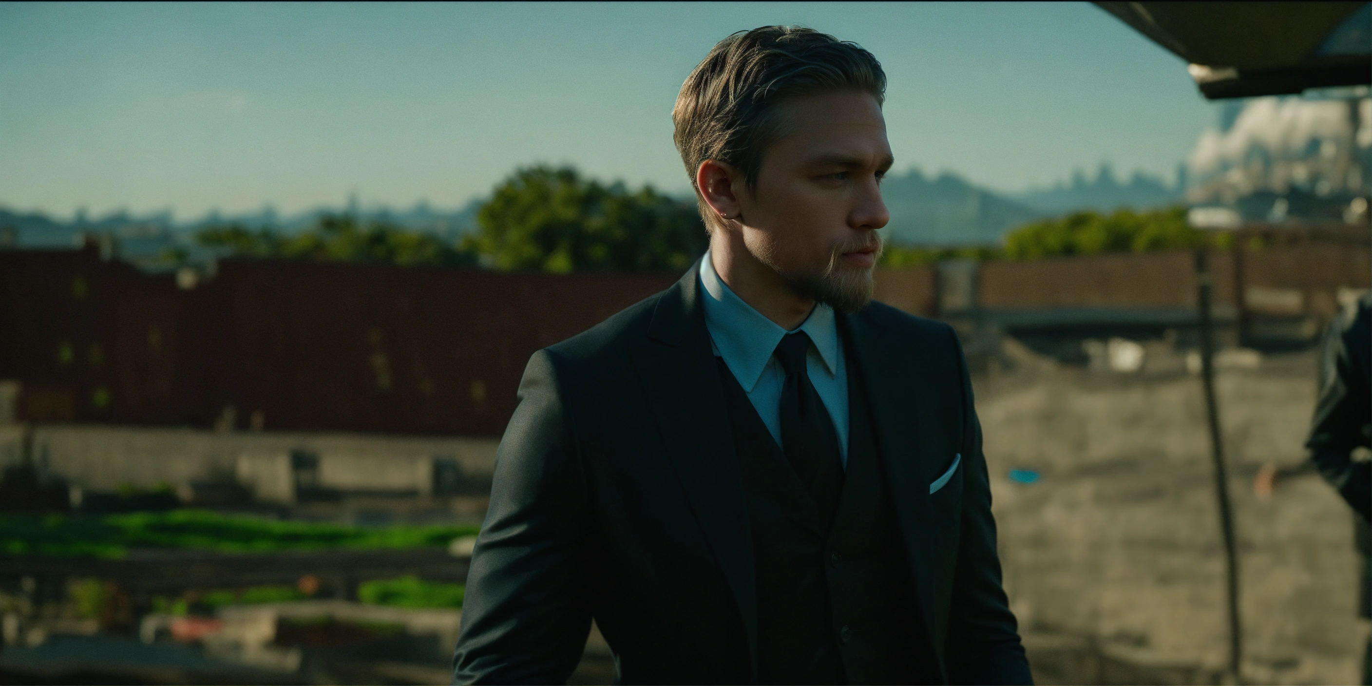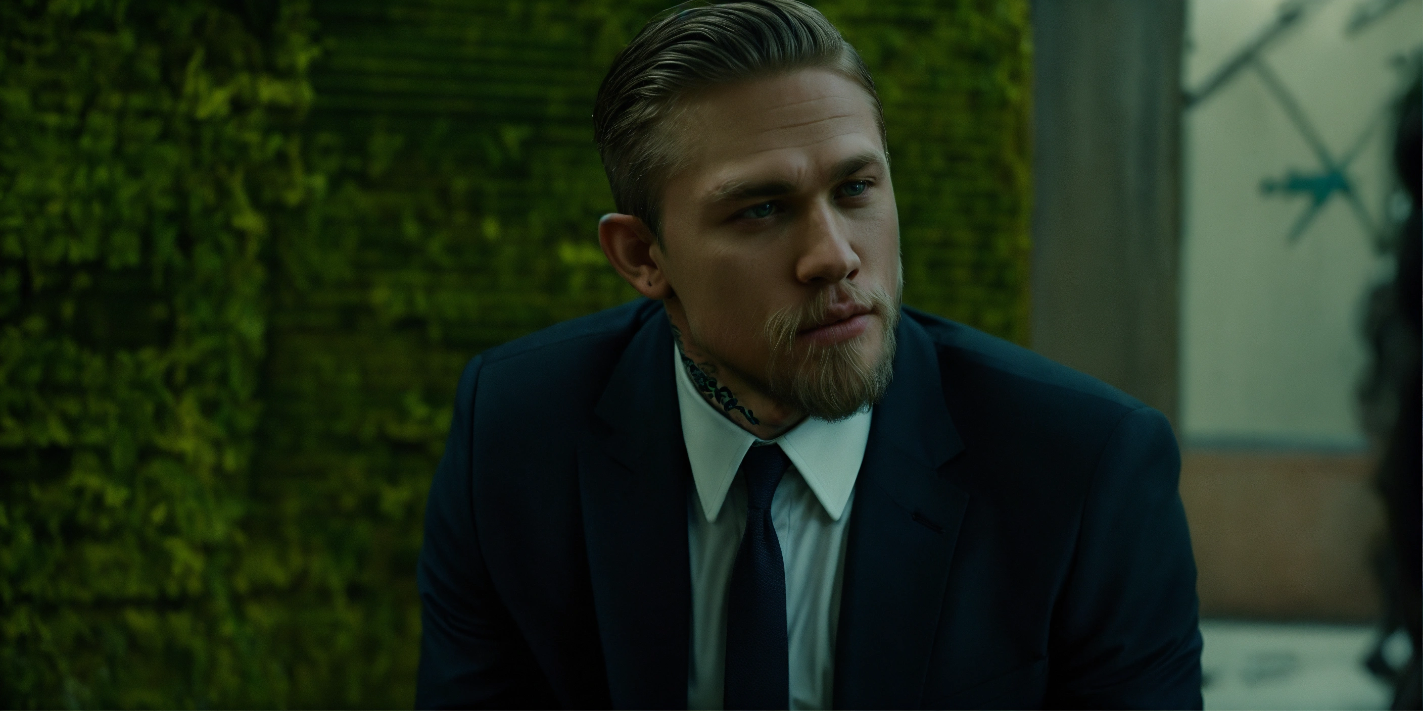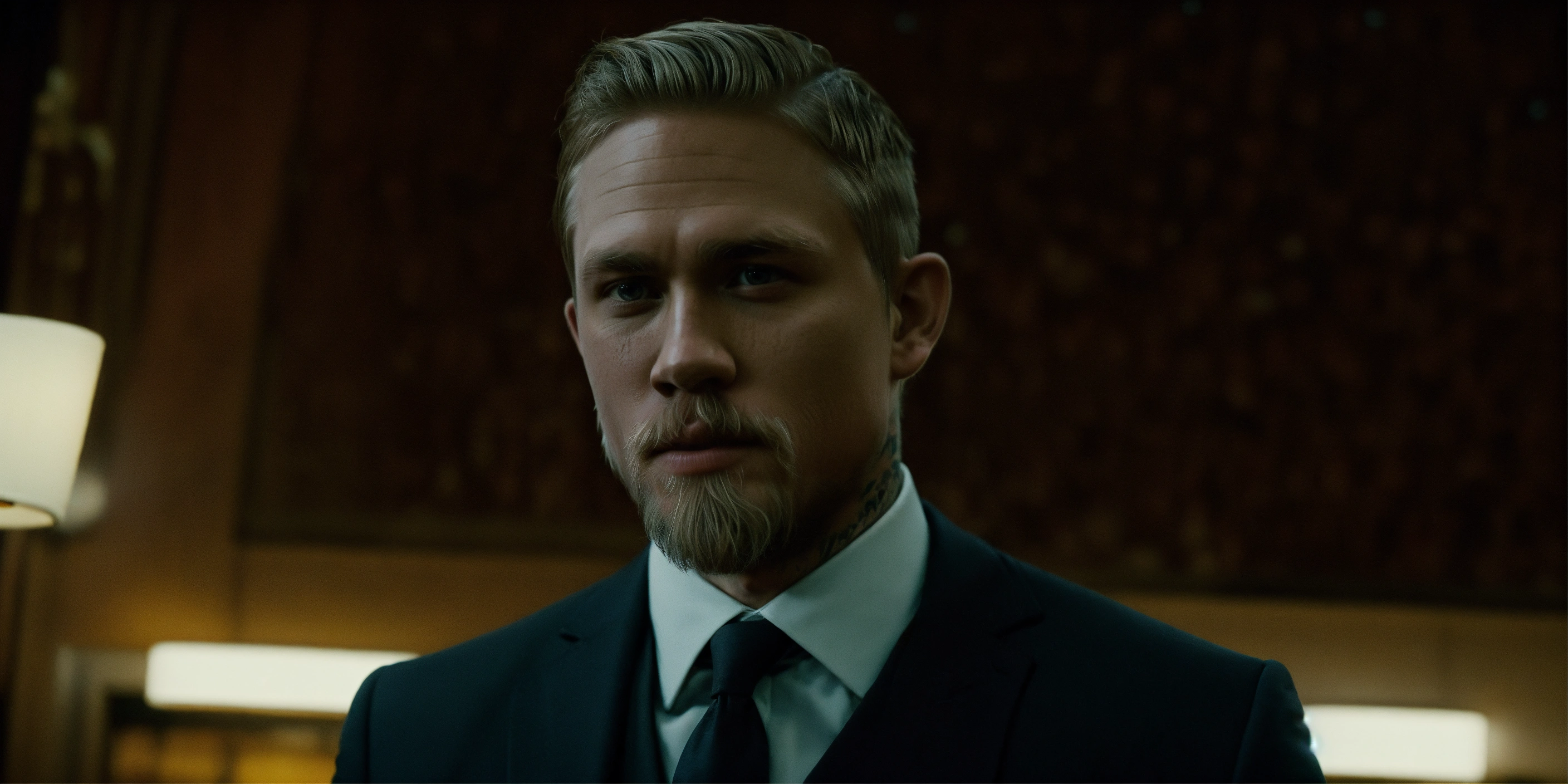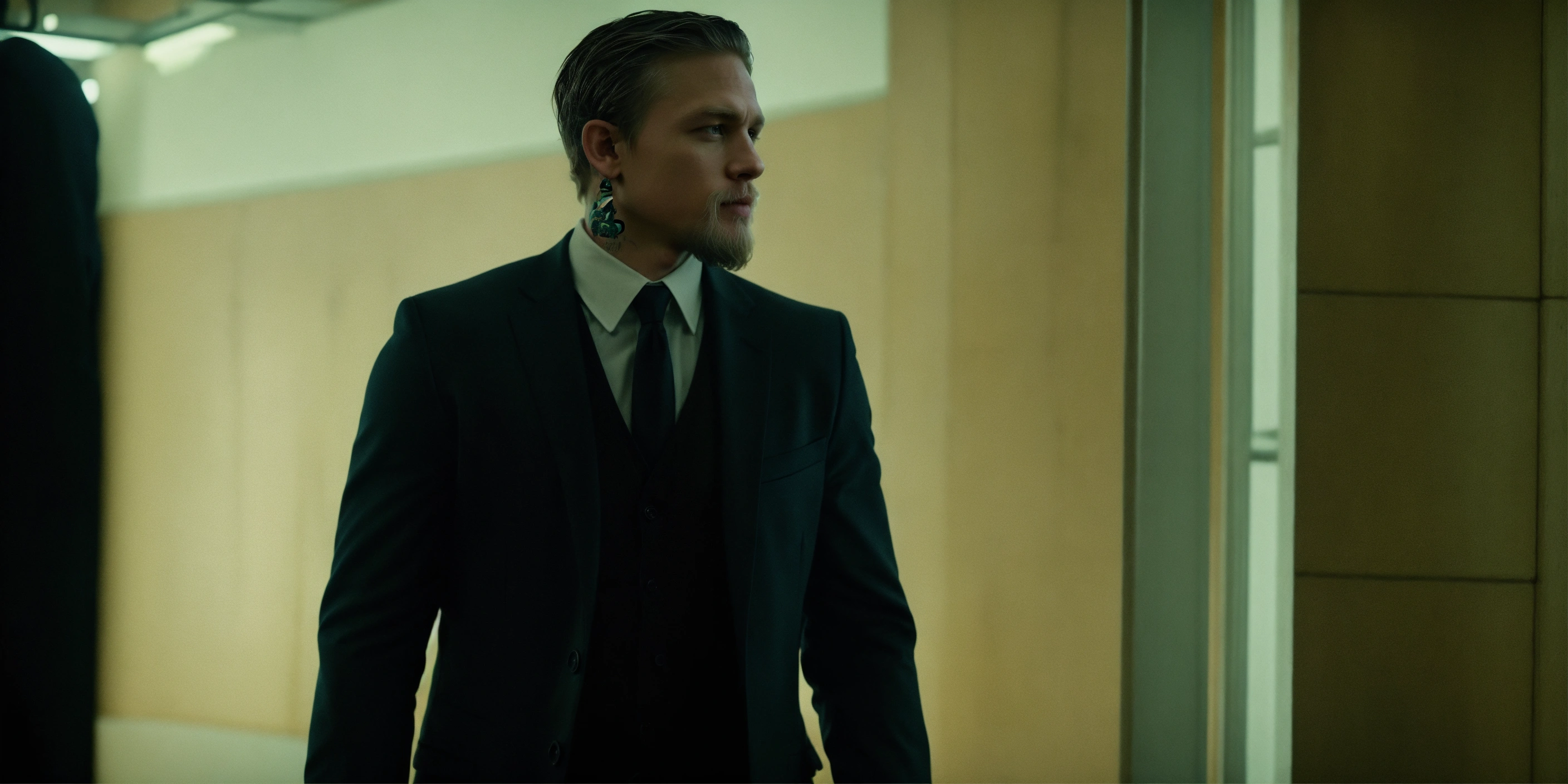Tall handsome man, charlie hunnam, black suit, short white hair, fbi agent, very realistic, altered carbon 33 years old