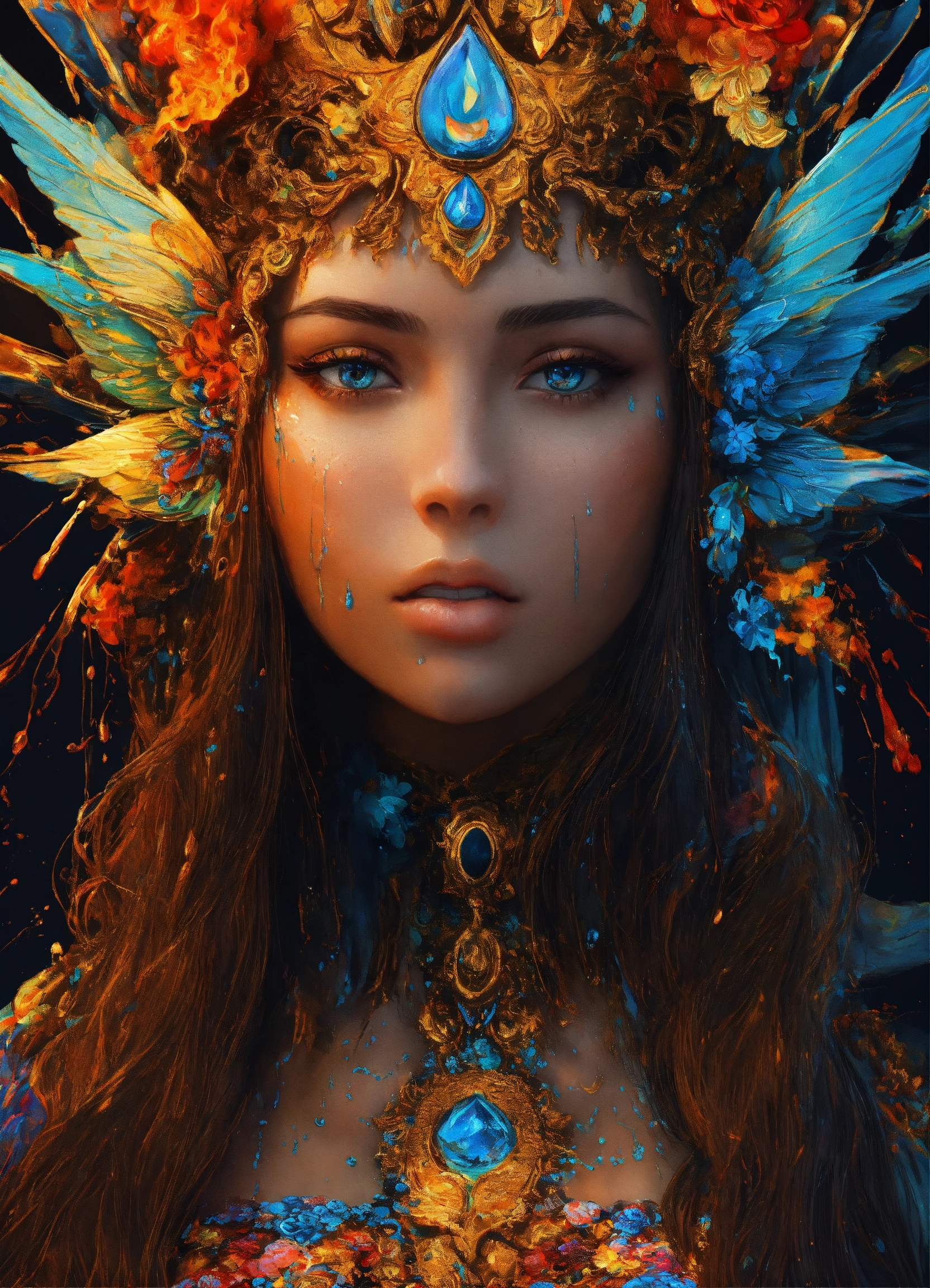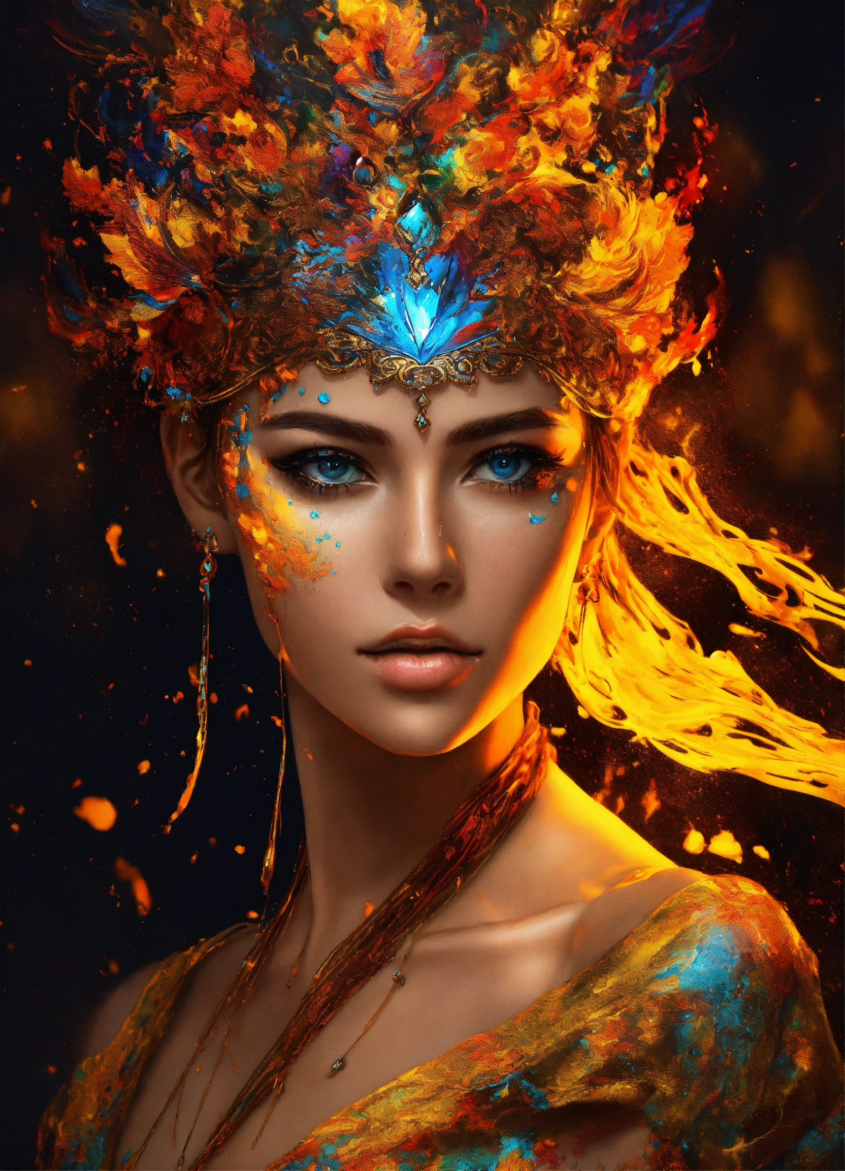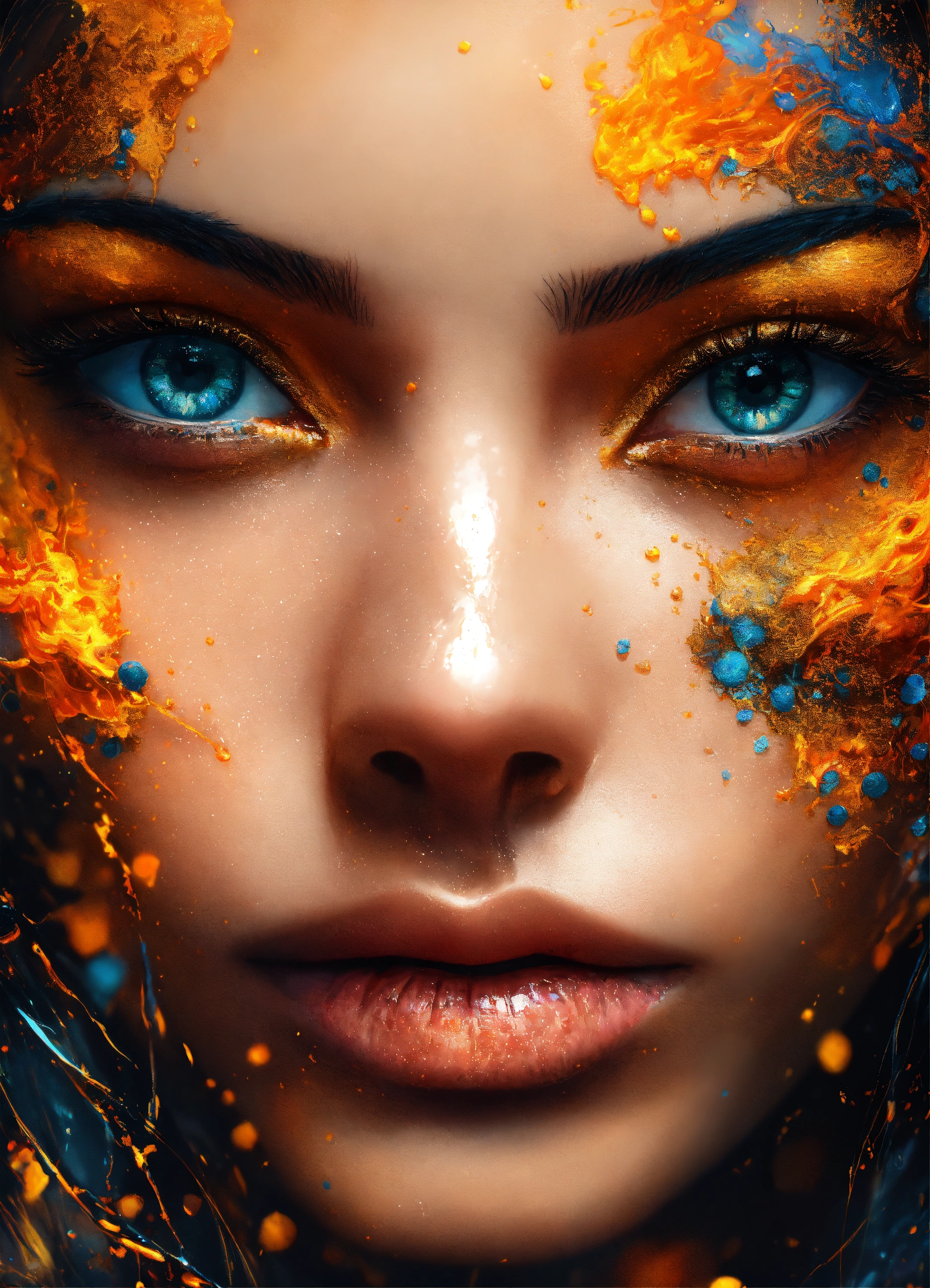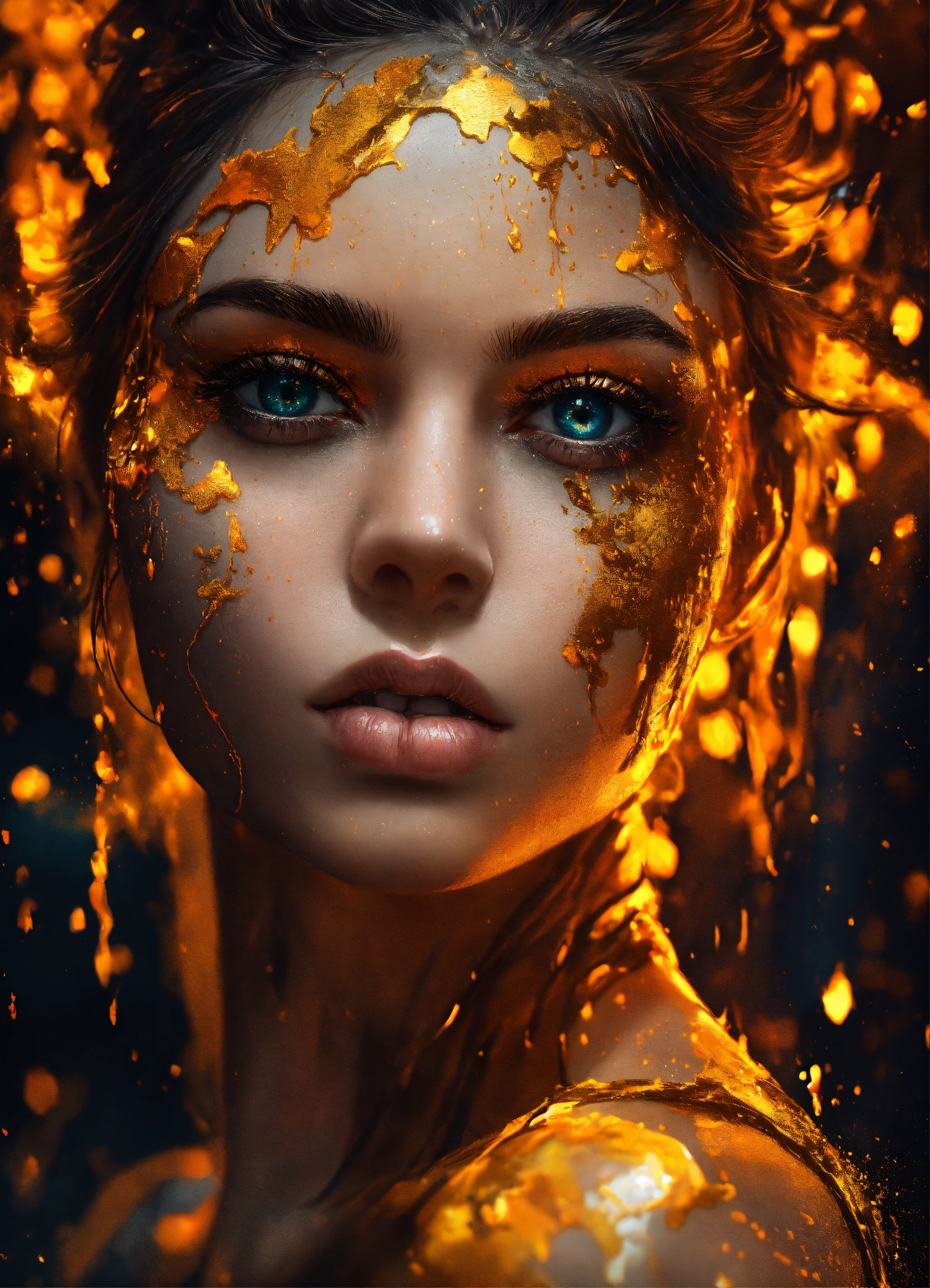 A beautiful woman, hyperdetailed eyes, tee-shirt design, line art, black background, ultra detailed artistic, detailed gorgeous face, natural skin, water splash, colour splash art, fire and ice, splatter, black ink, liquid melting, dreamy, glowing, glamour, glimmer, shadows, oil on canvas, brush strokes, smooth, ultra high definition, 8k, unreal engine 5, ultra sharp focus, intricate artwork masterpiece, ominous, golden ratio, highly detailed, vibrant, production cinematic character render, ultra high quality model
