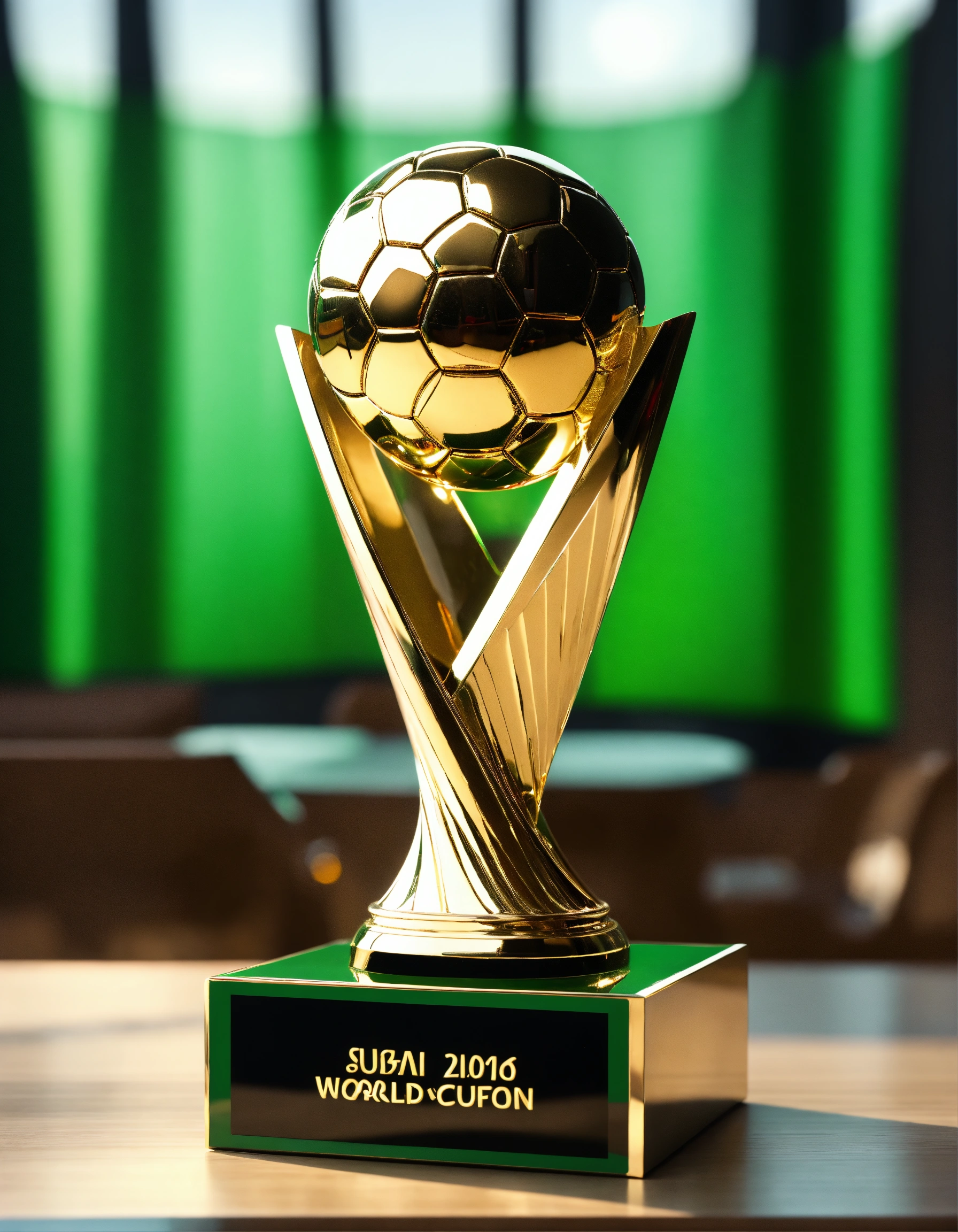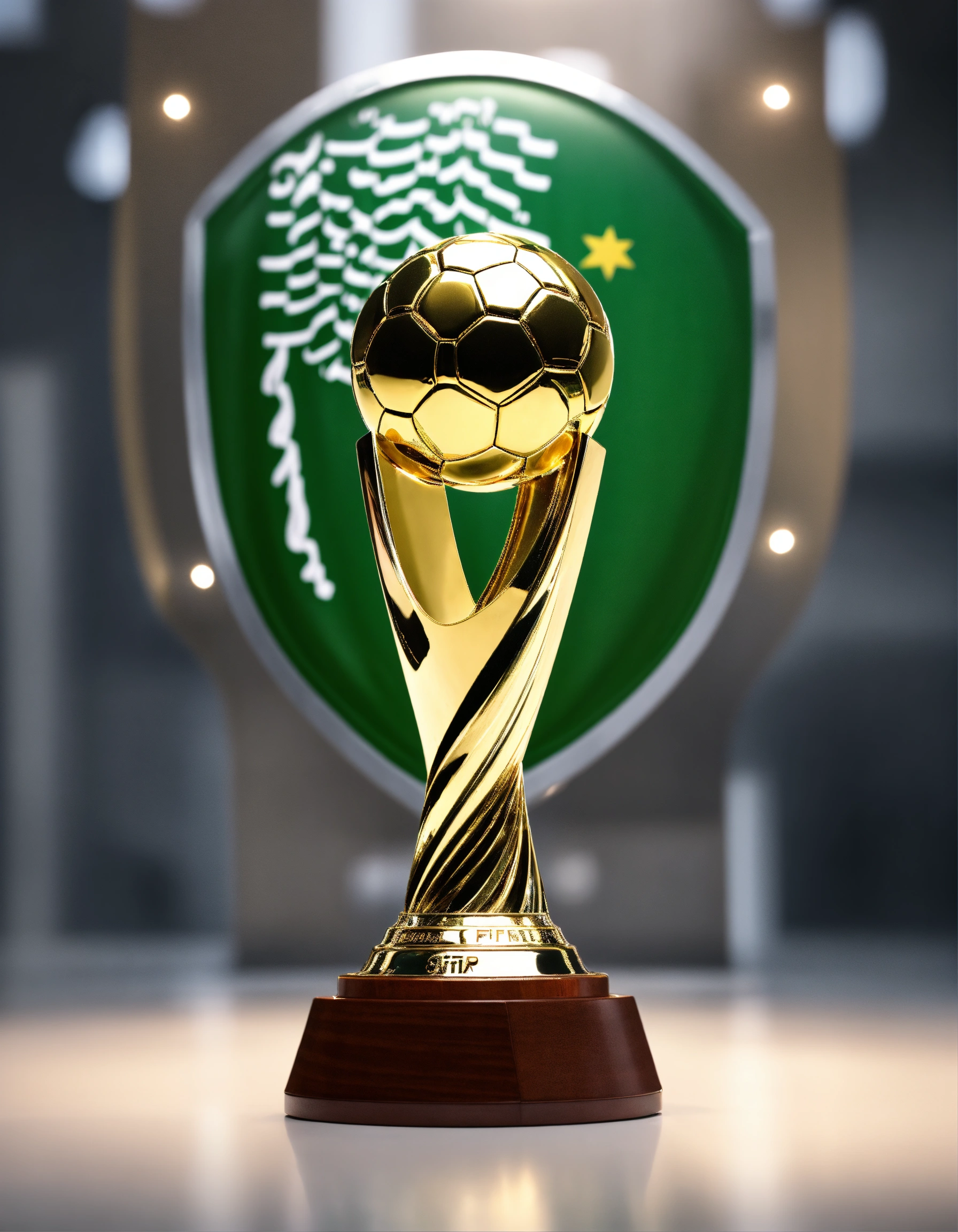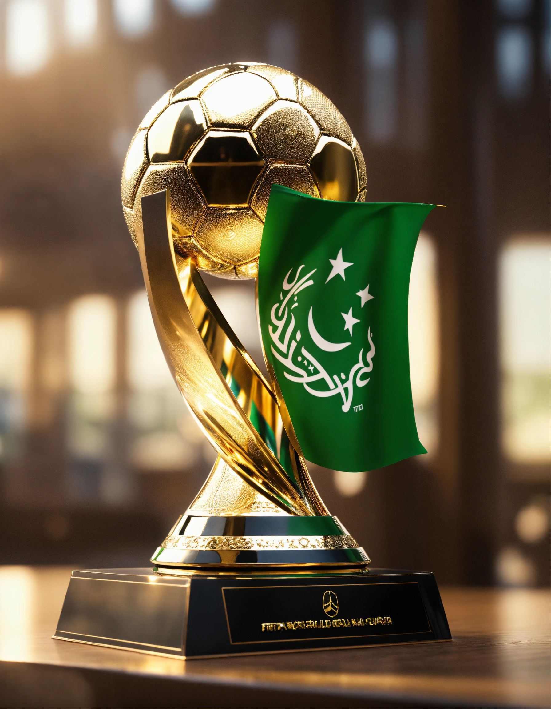 Fifa world cup trophy, saudi flag around the trophy, natural light, soft reflection, photo-realistic, 8k, high-definition