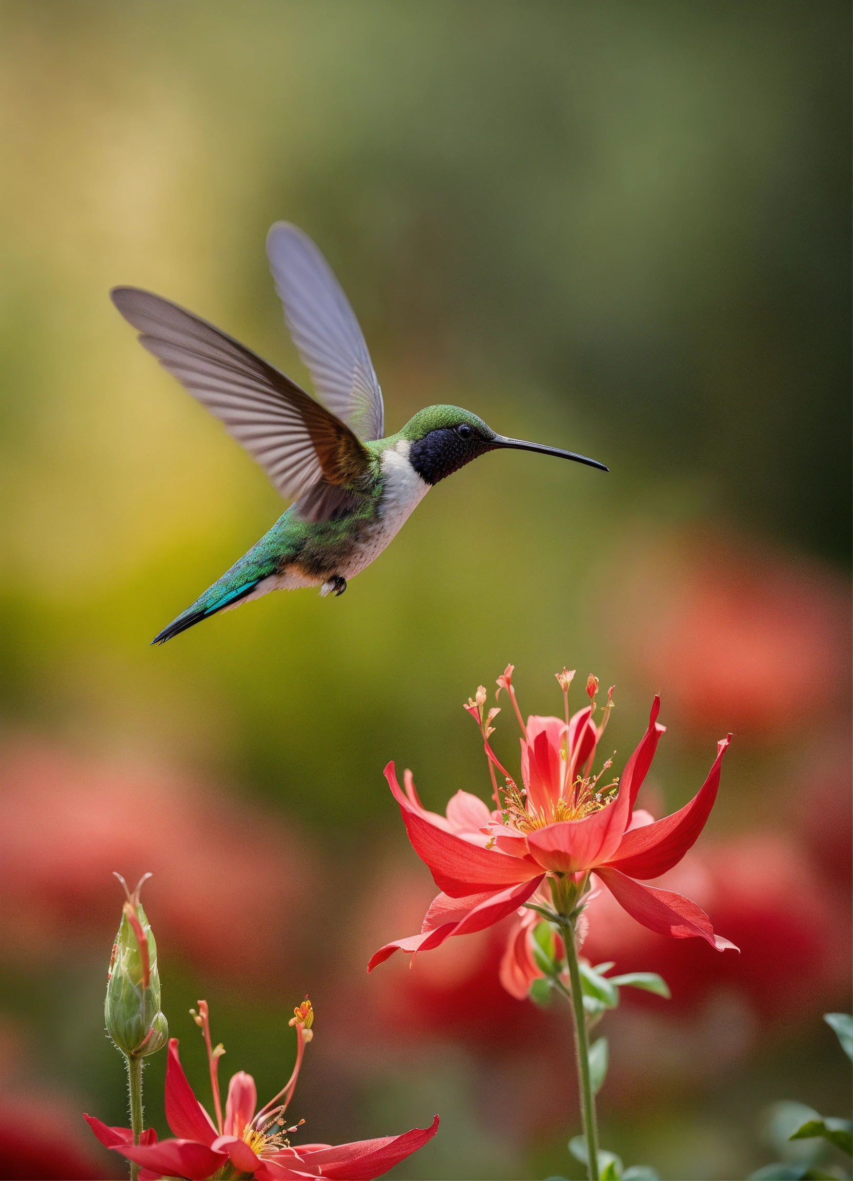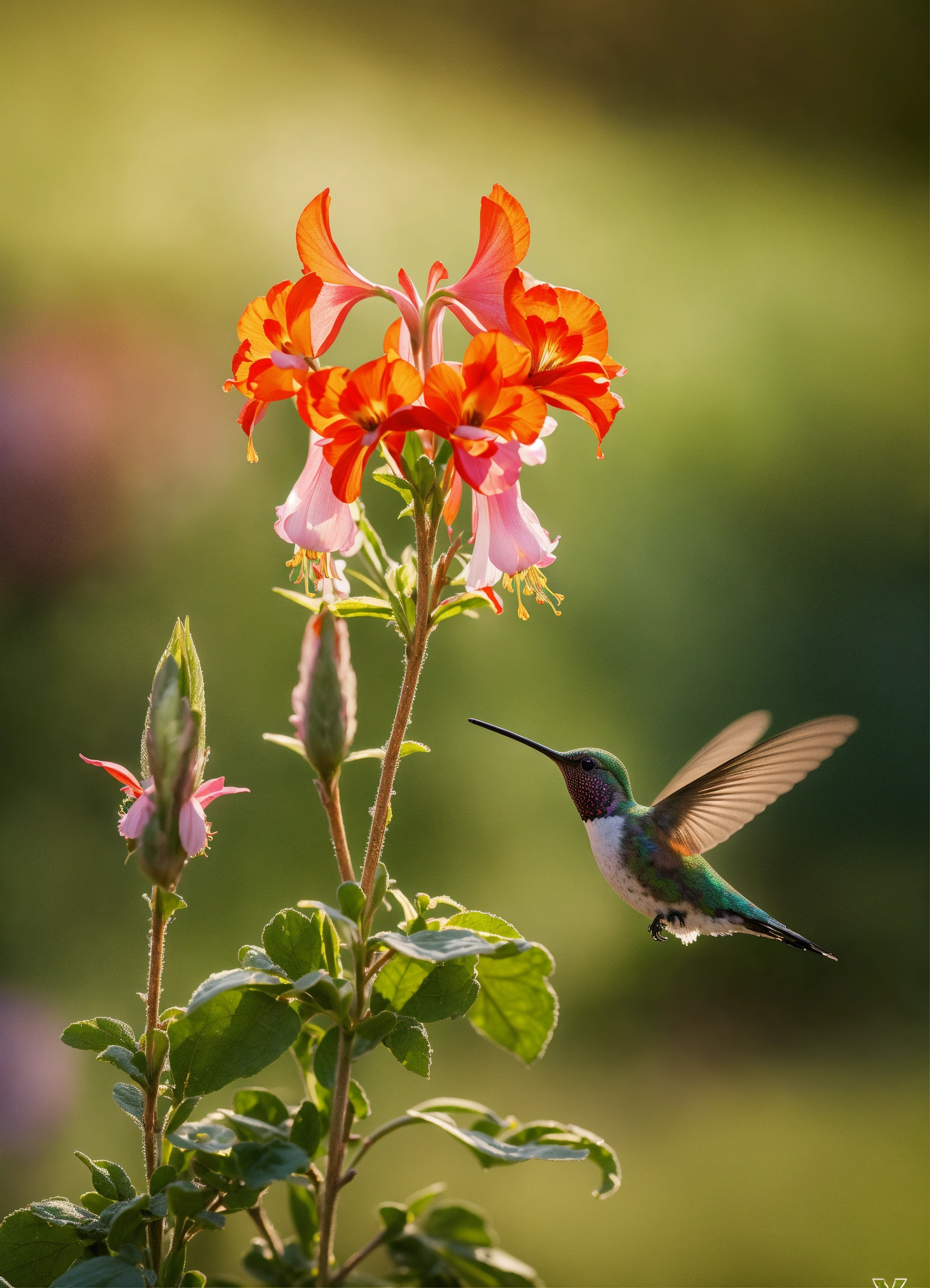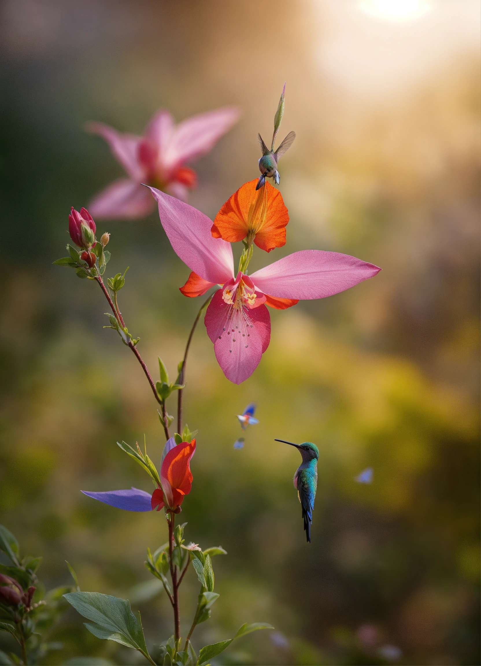 Columbine with hummingbirds, elegant, luxury, clean, smooth, elegant, beautiful, highly detailed, sharp focus, studio photography, xf iq 4, 1 5 0 mp, 5 0 mm, iso 2 0 0, 1 / 1 6 0 s, realistic, natural light, octane render, adobe lightroom, rule of thirds, symmetrical balance, depth layering, polarizing filter, sense of depth, ai enhanced