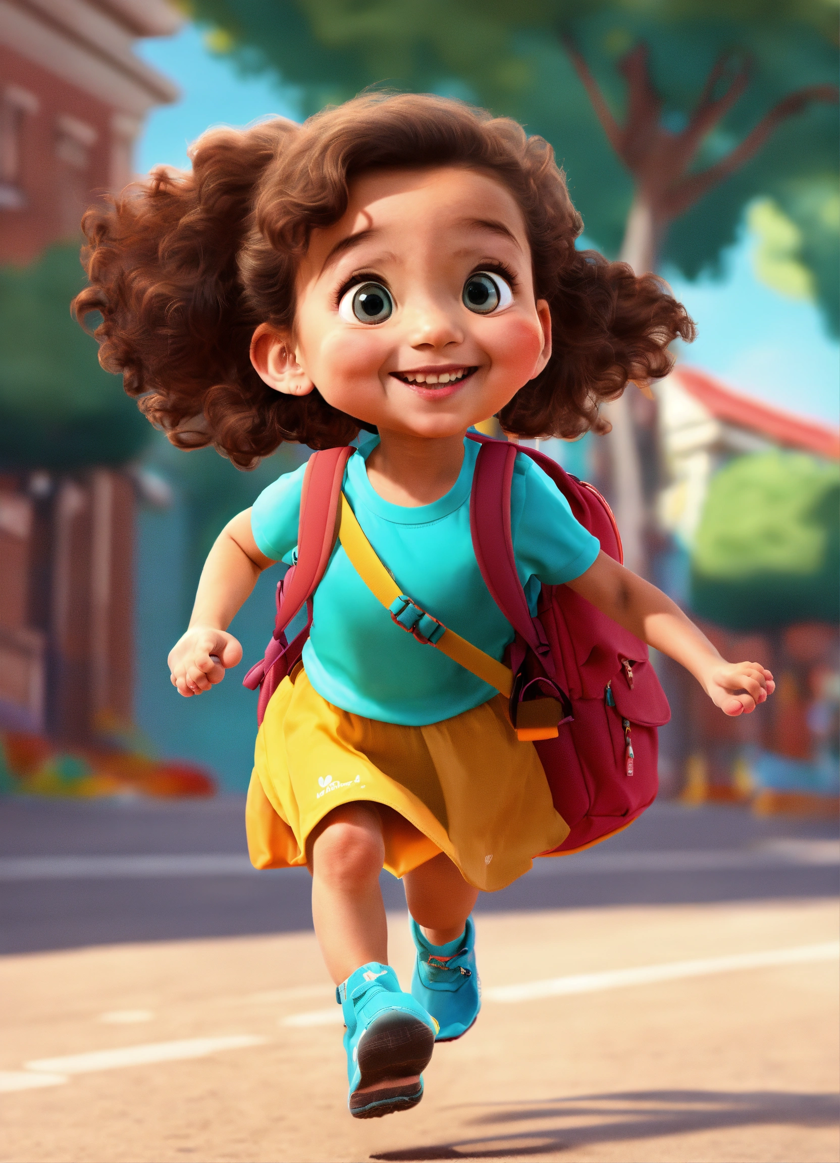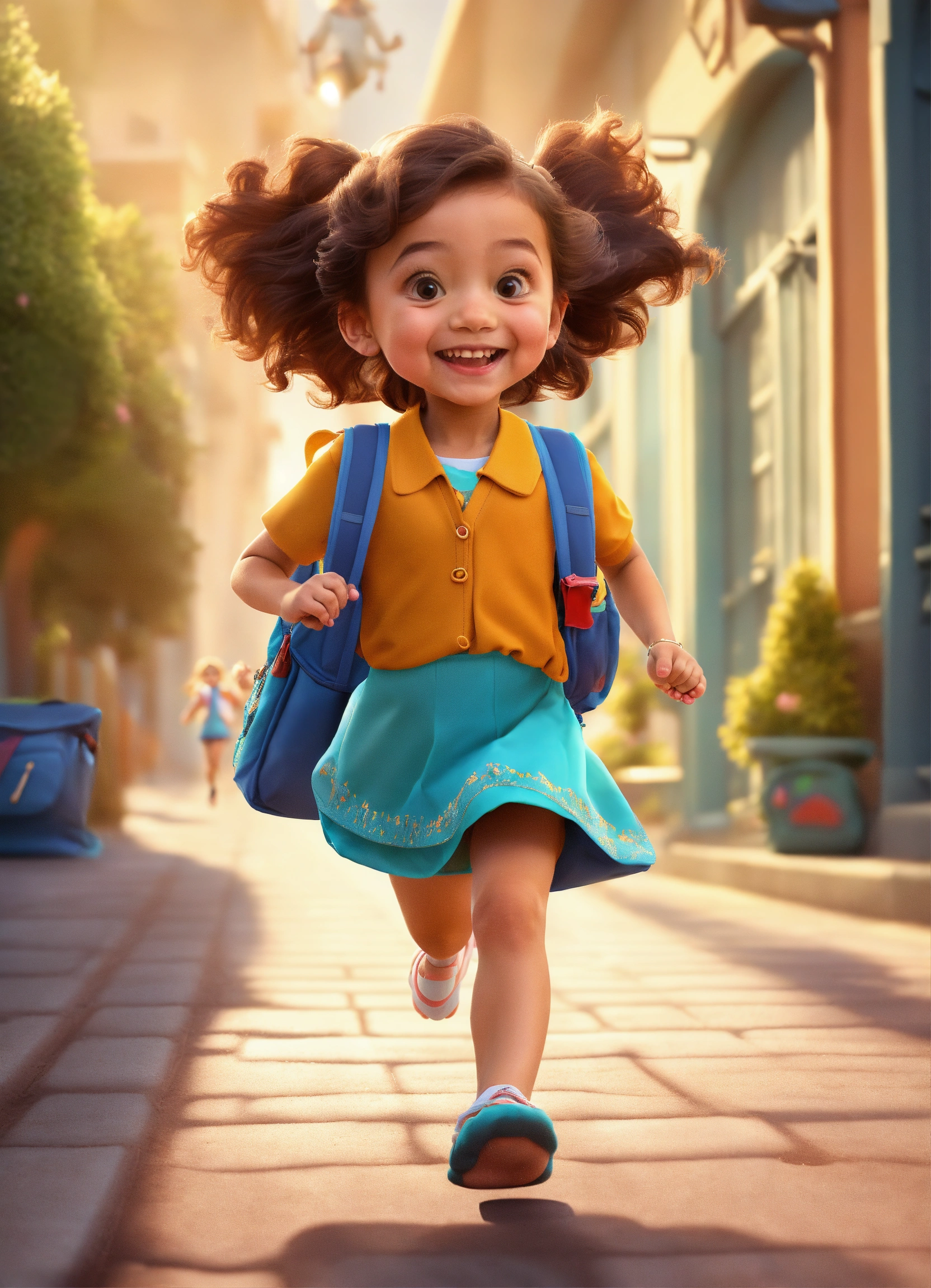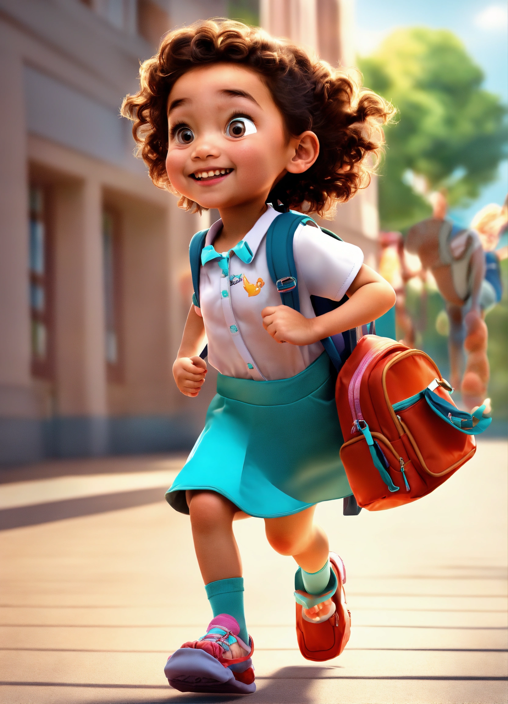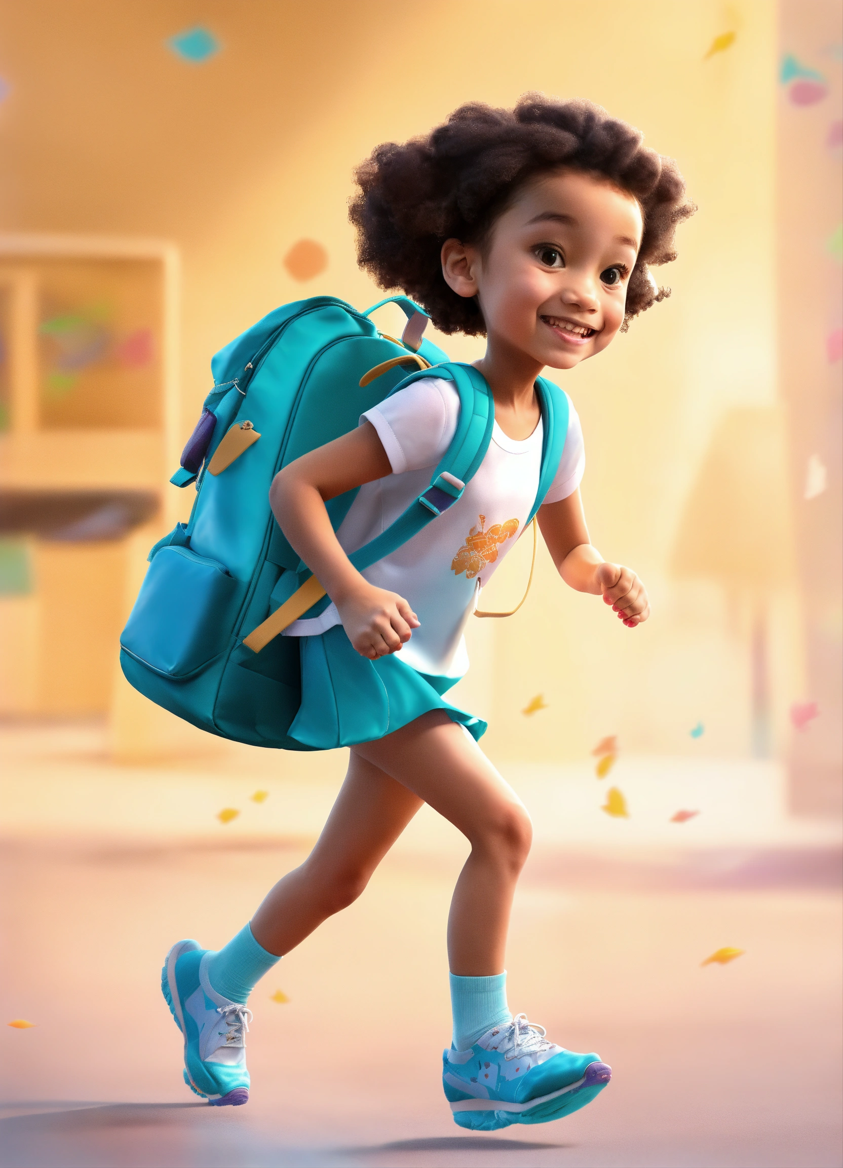 5 years old. happy and cute girl with light skin, with a skirt . drawn from the front, (((runs enthusiastically, feet not touching the ground, with school bag))).by disney concept artists, elegant, sharp focus. 3d style. happy. white background. full body. photographed from behind. turquoise. childish and fun style