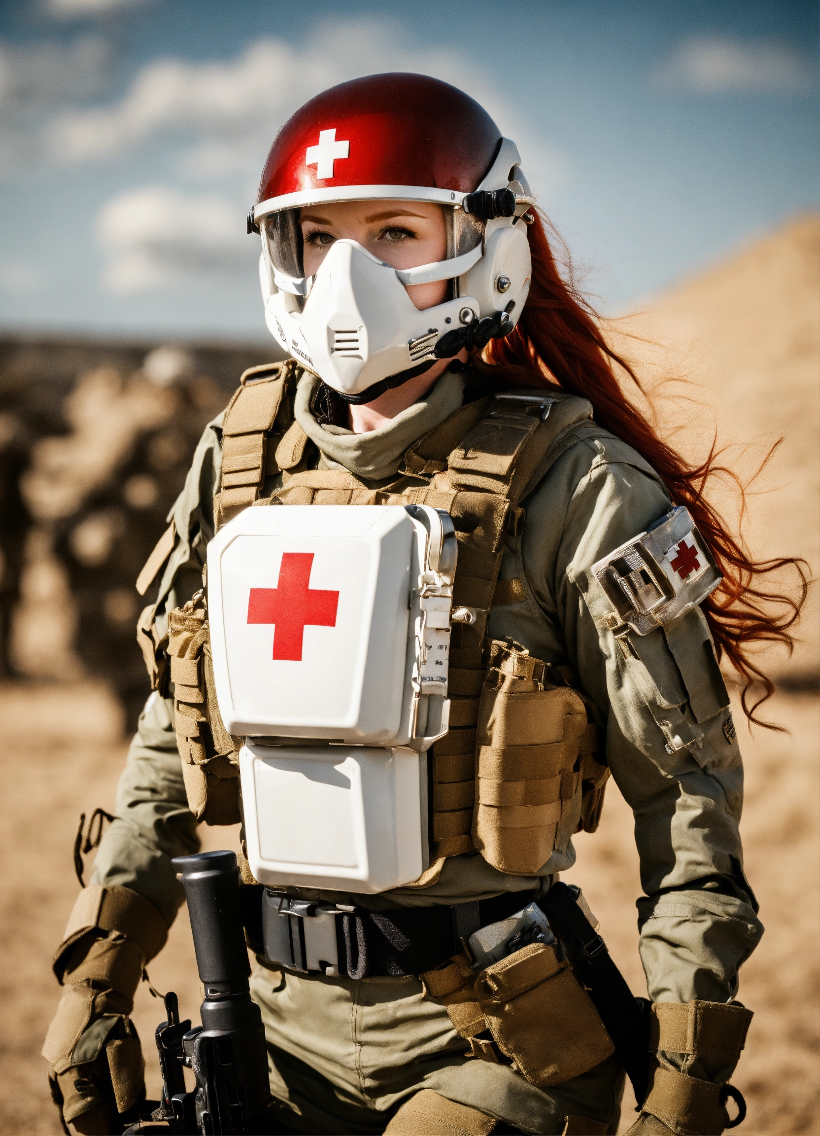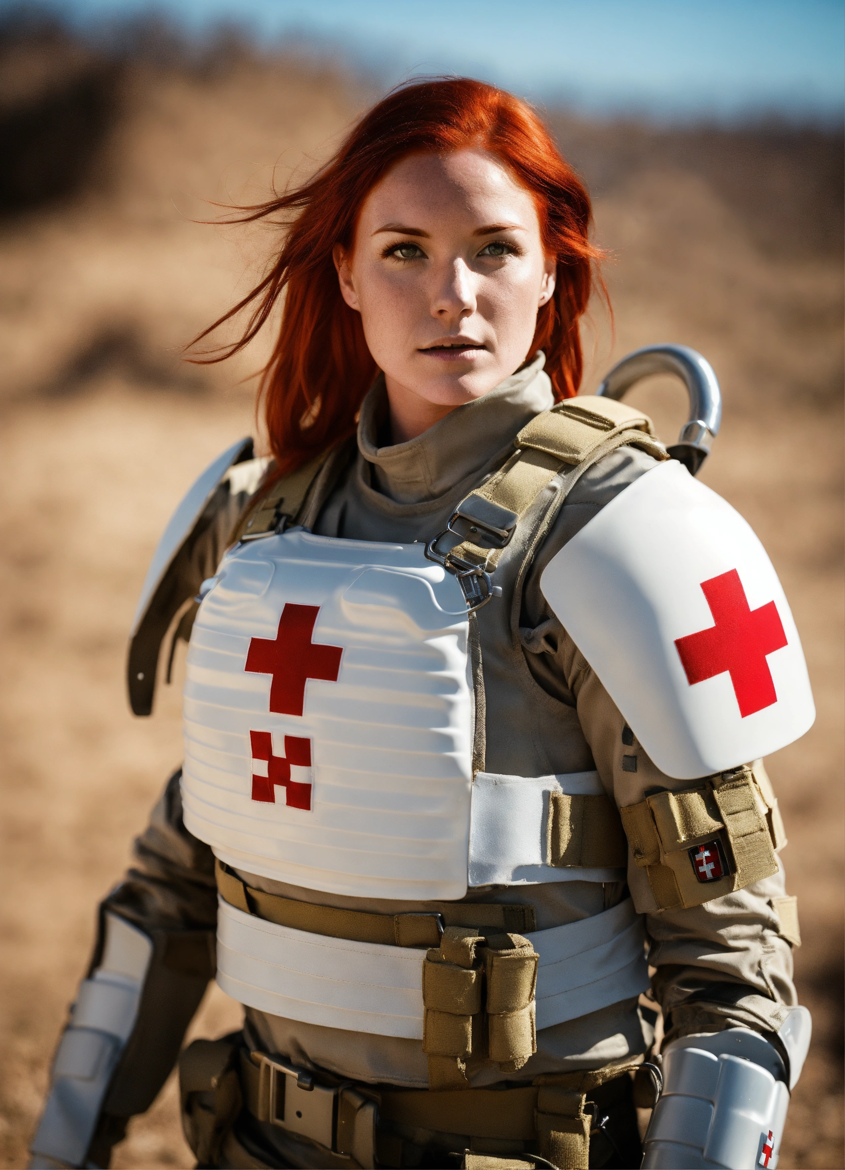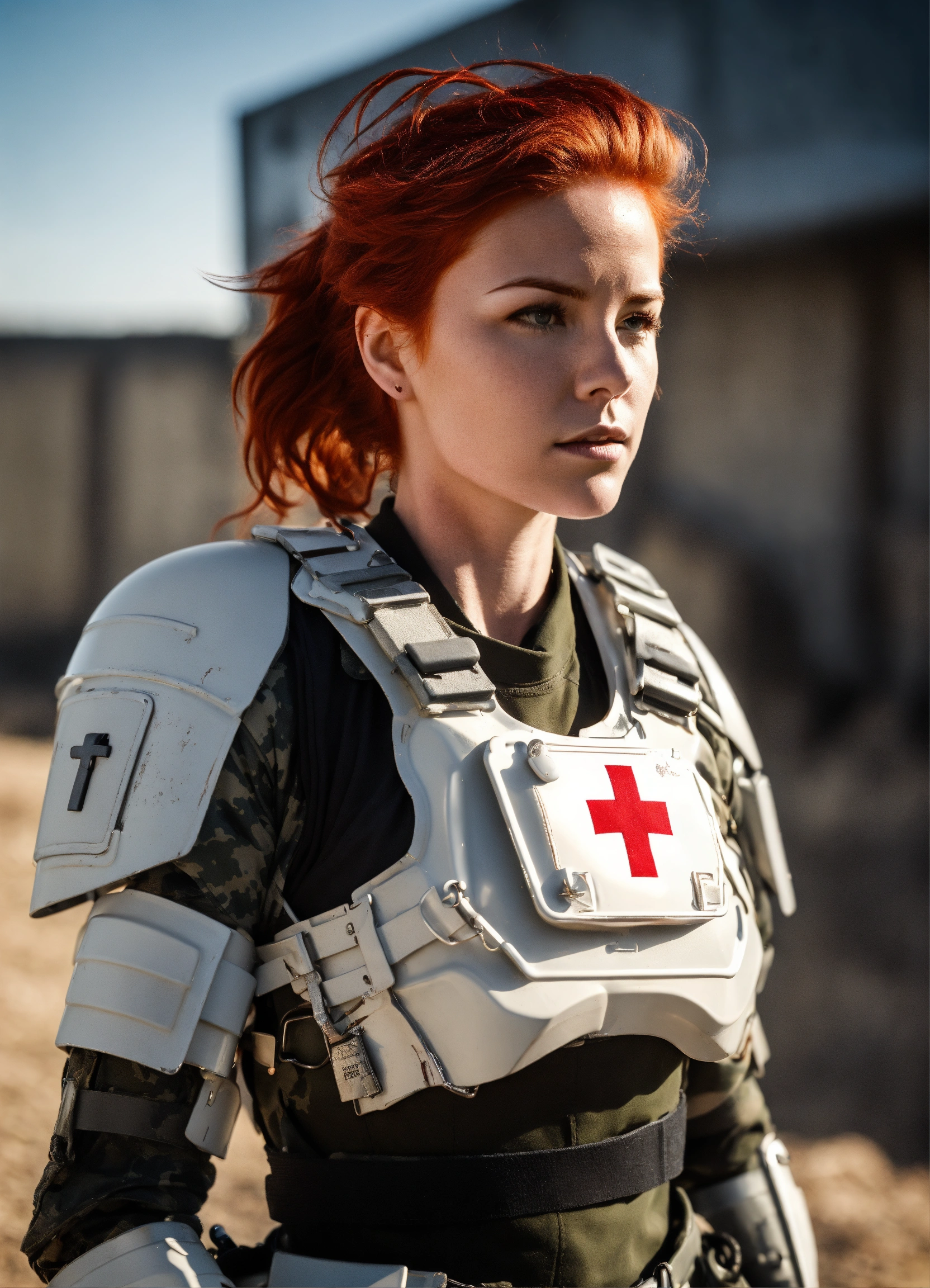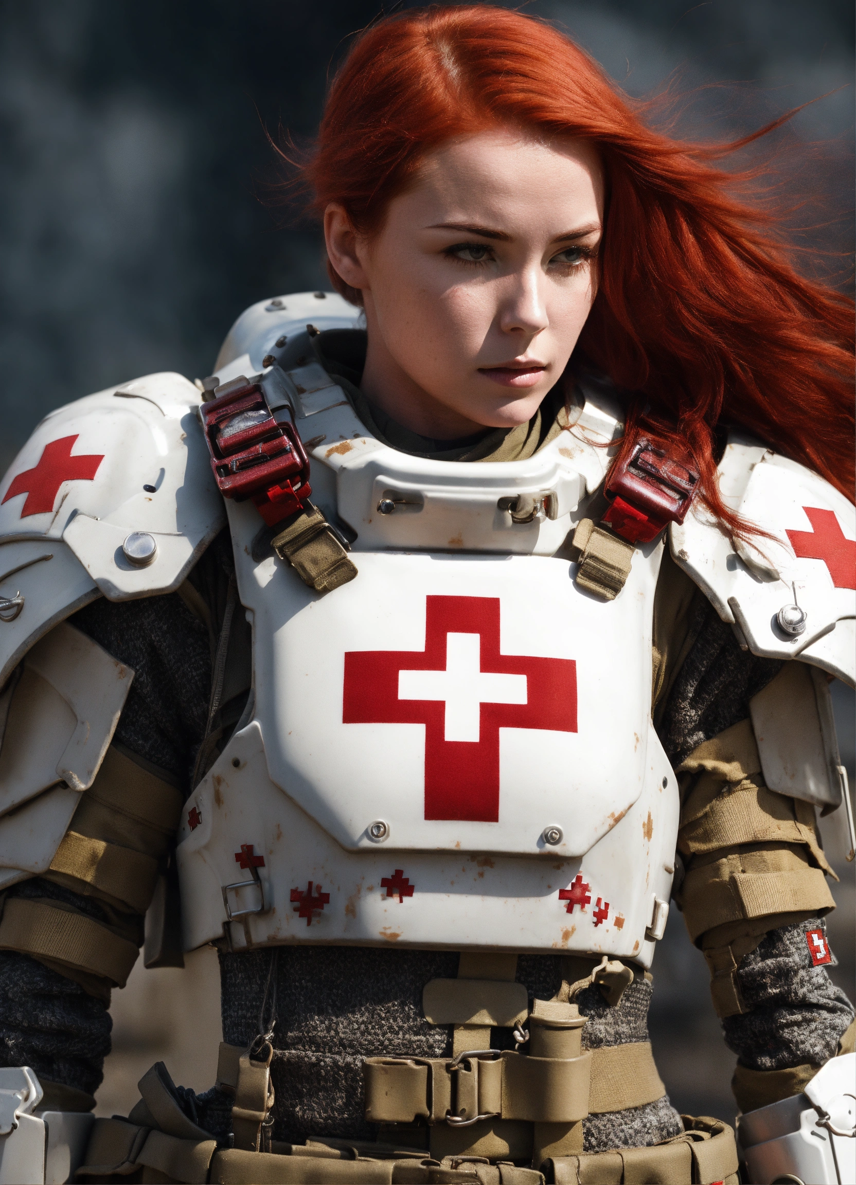 Female red hair athletic combat medic wearing white metal armor with red medical cross on chest in combat