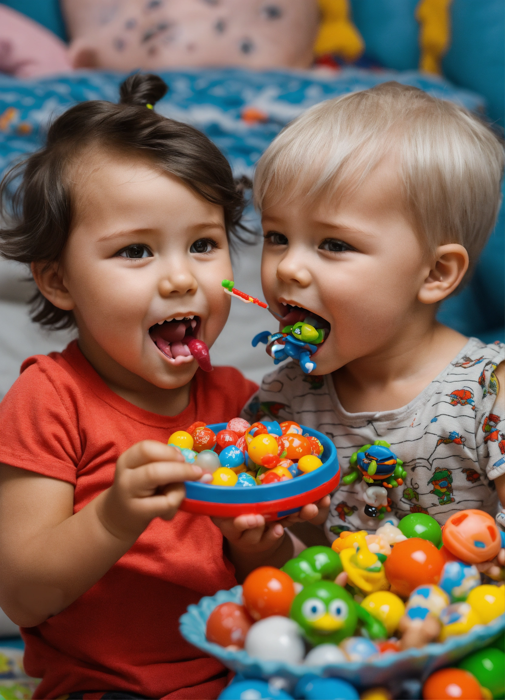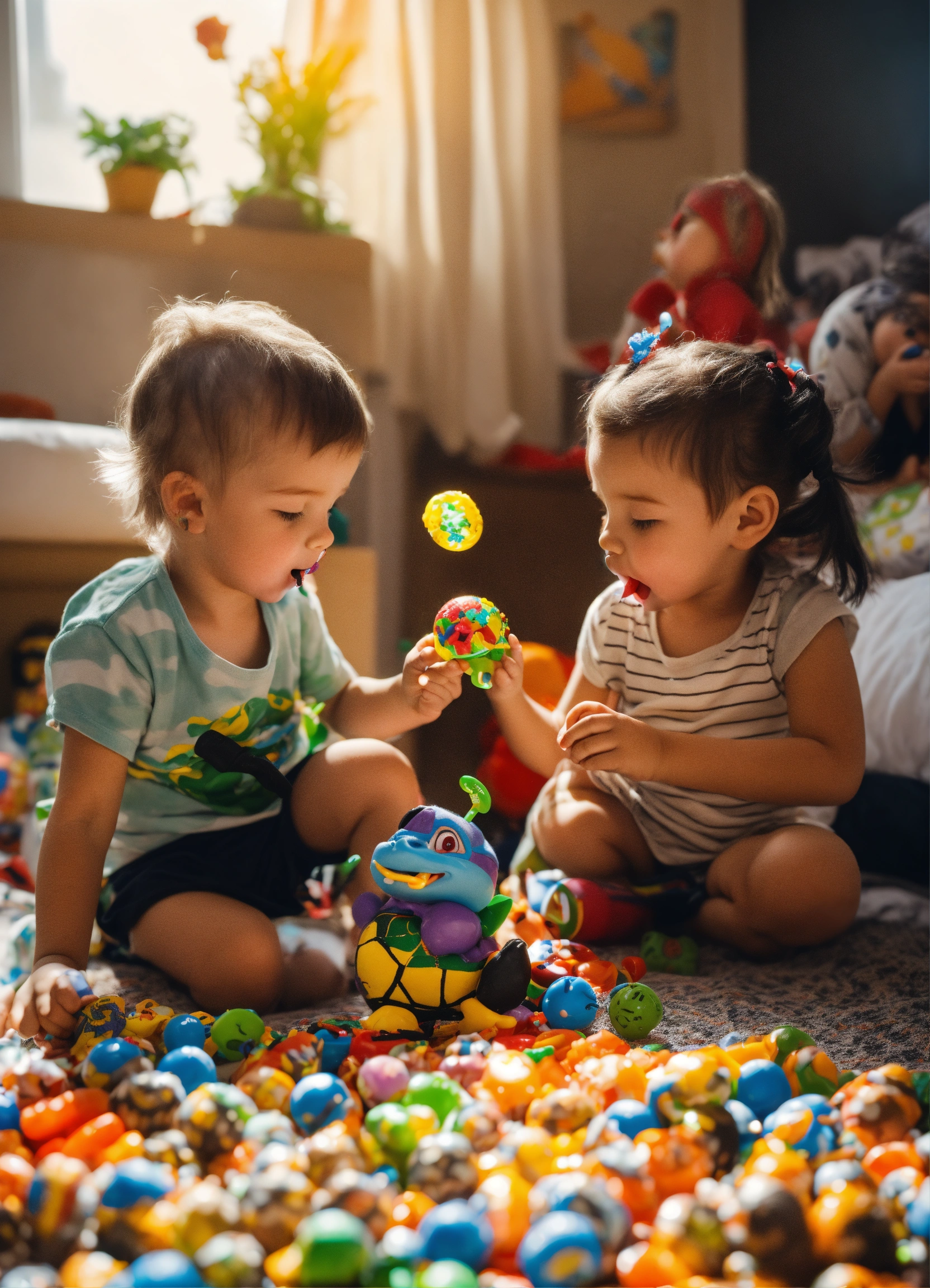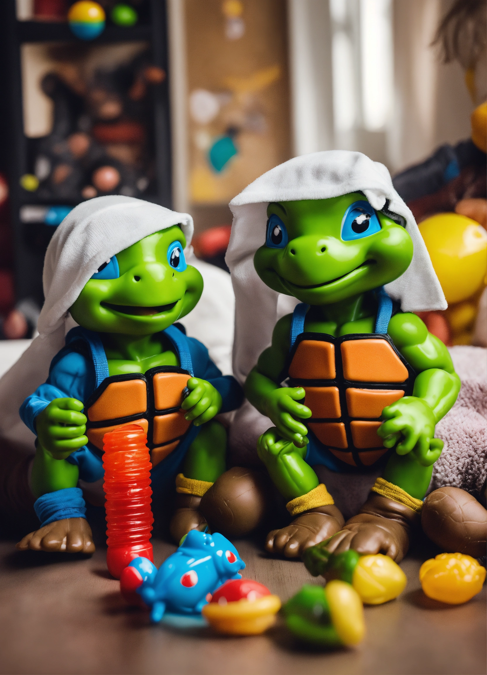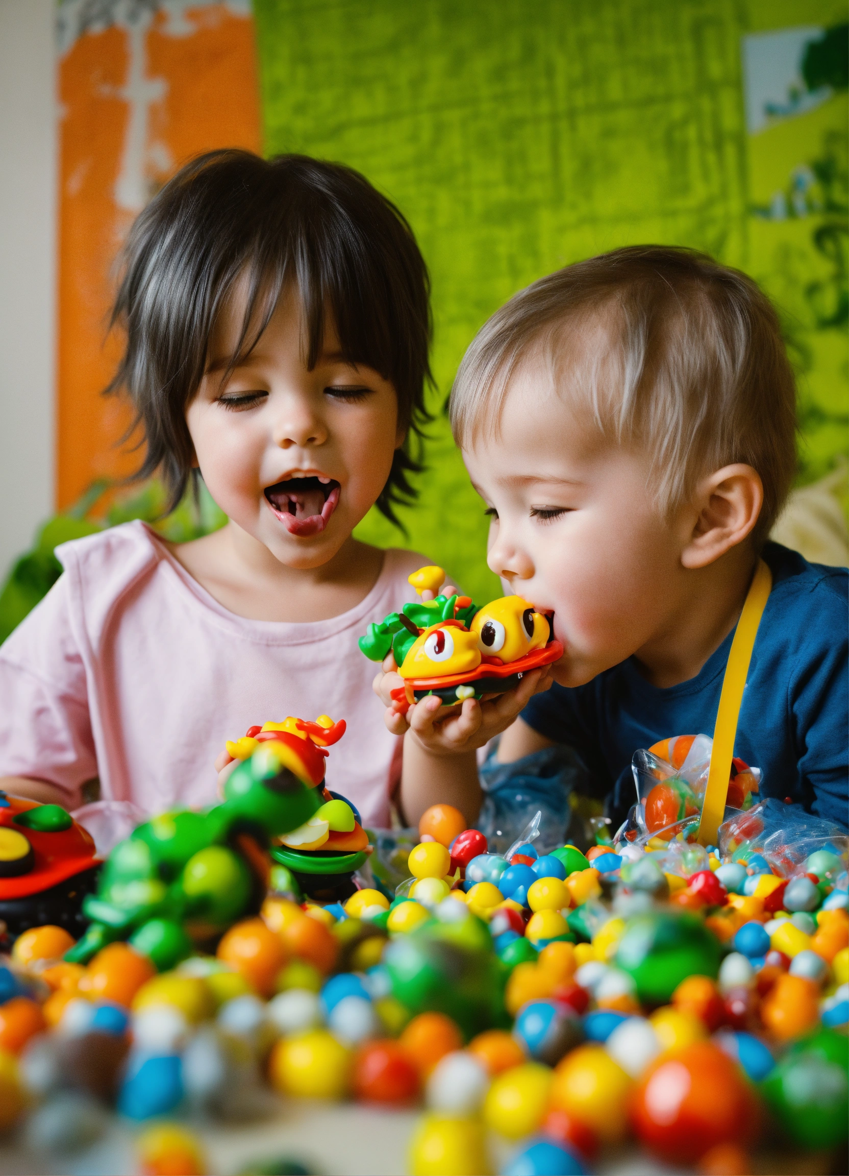 Two kids girl and a boy from ukraine, black and white hair play figures toys from cartoon ninja turtles, eat chupa chups in mouth in kidsroom