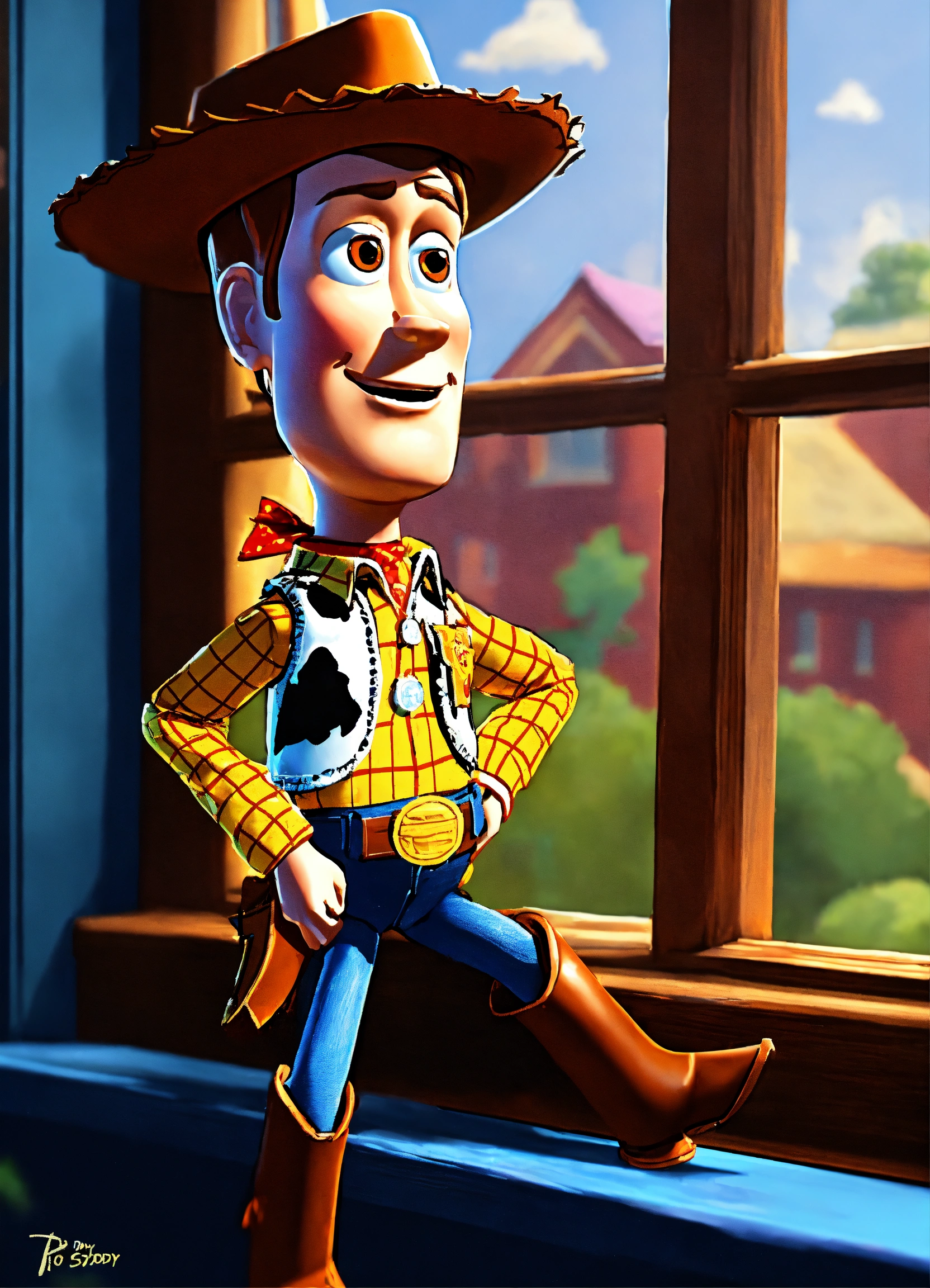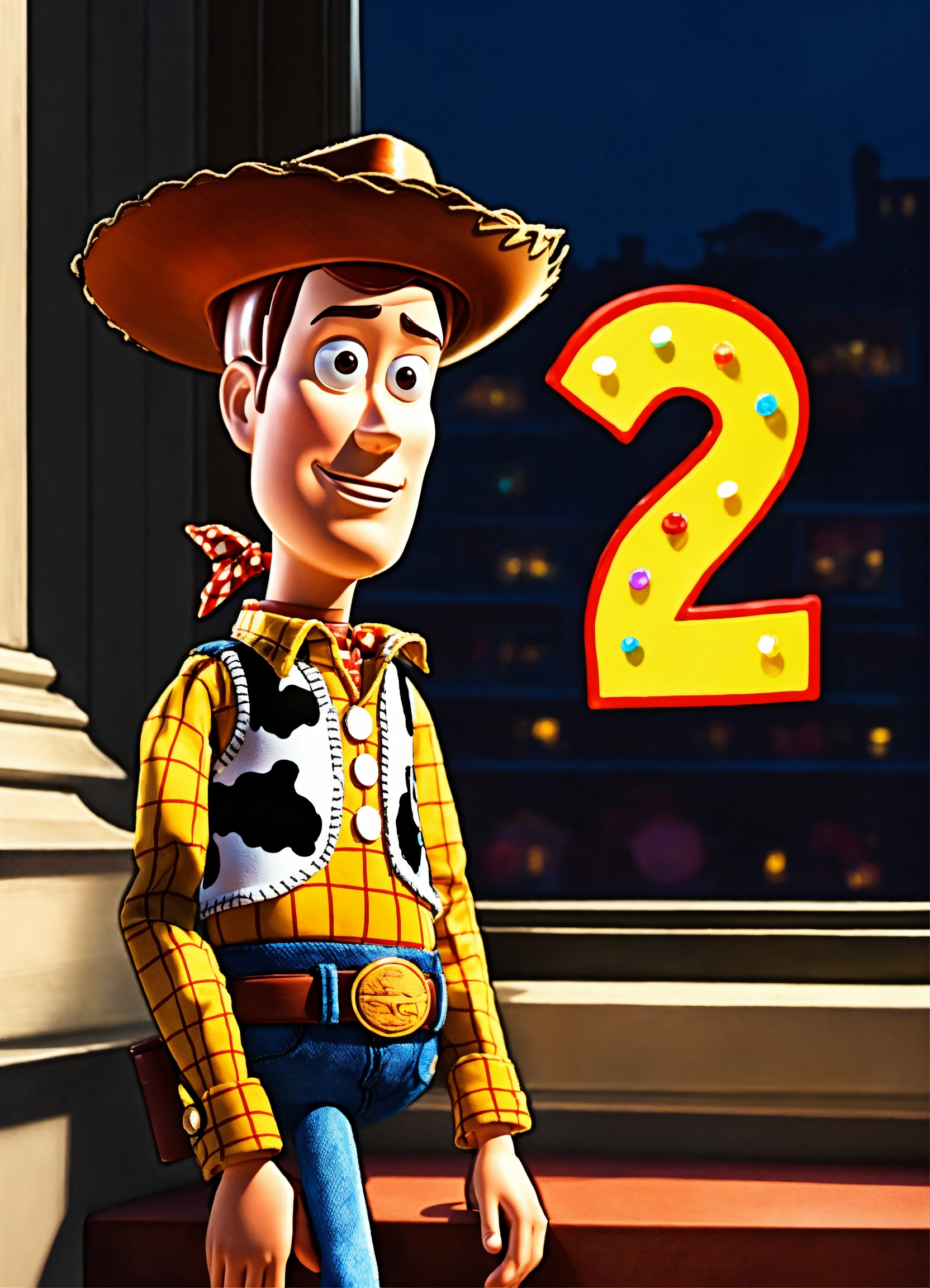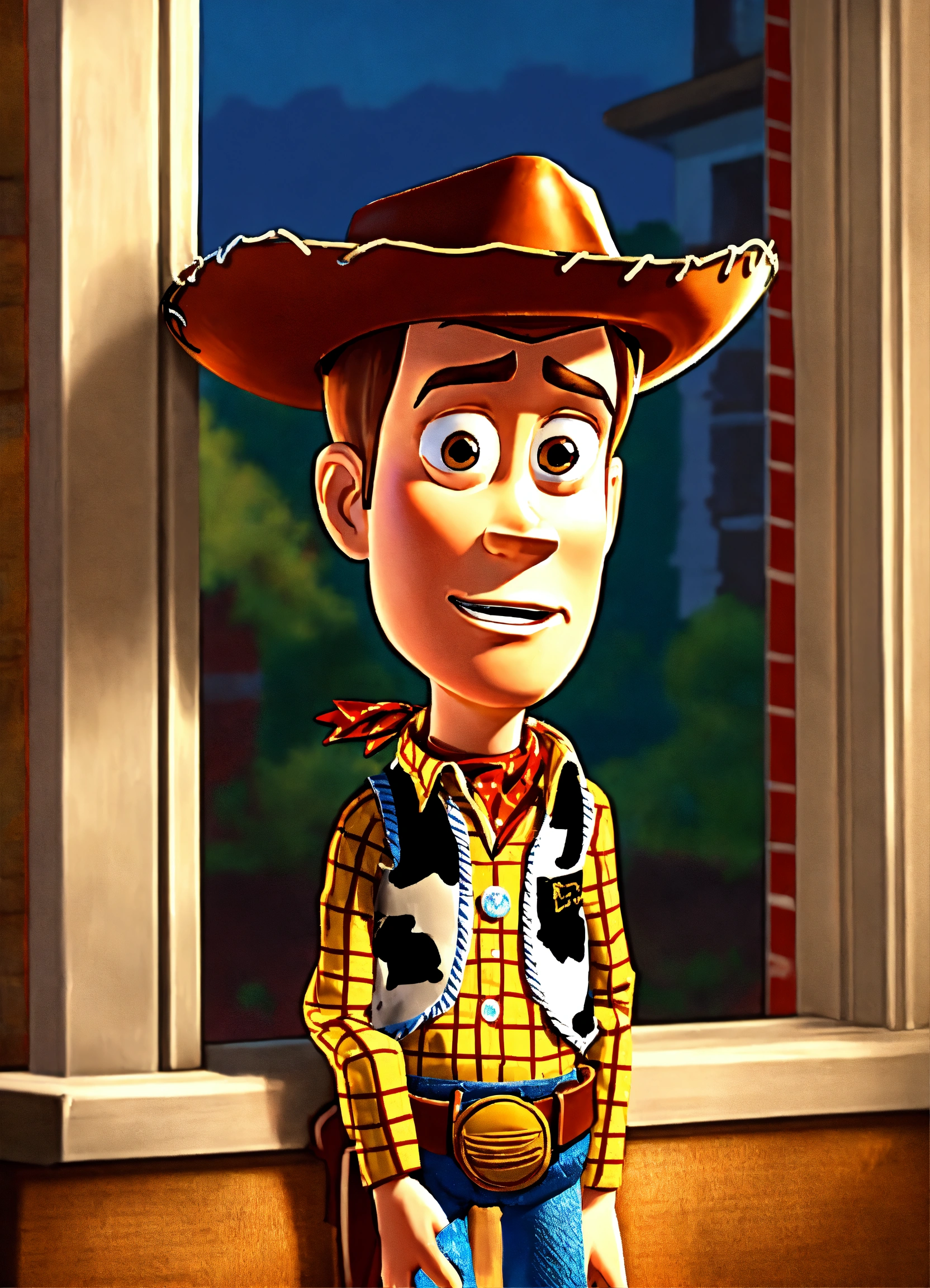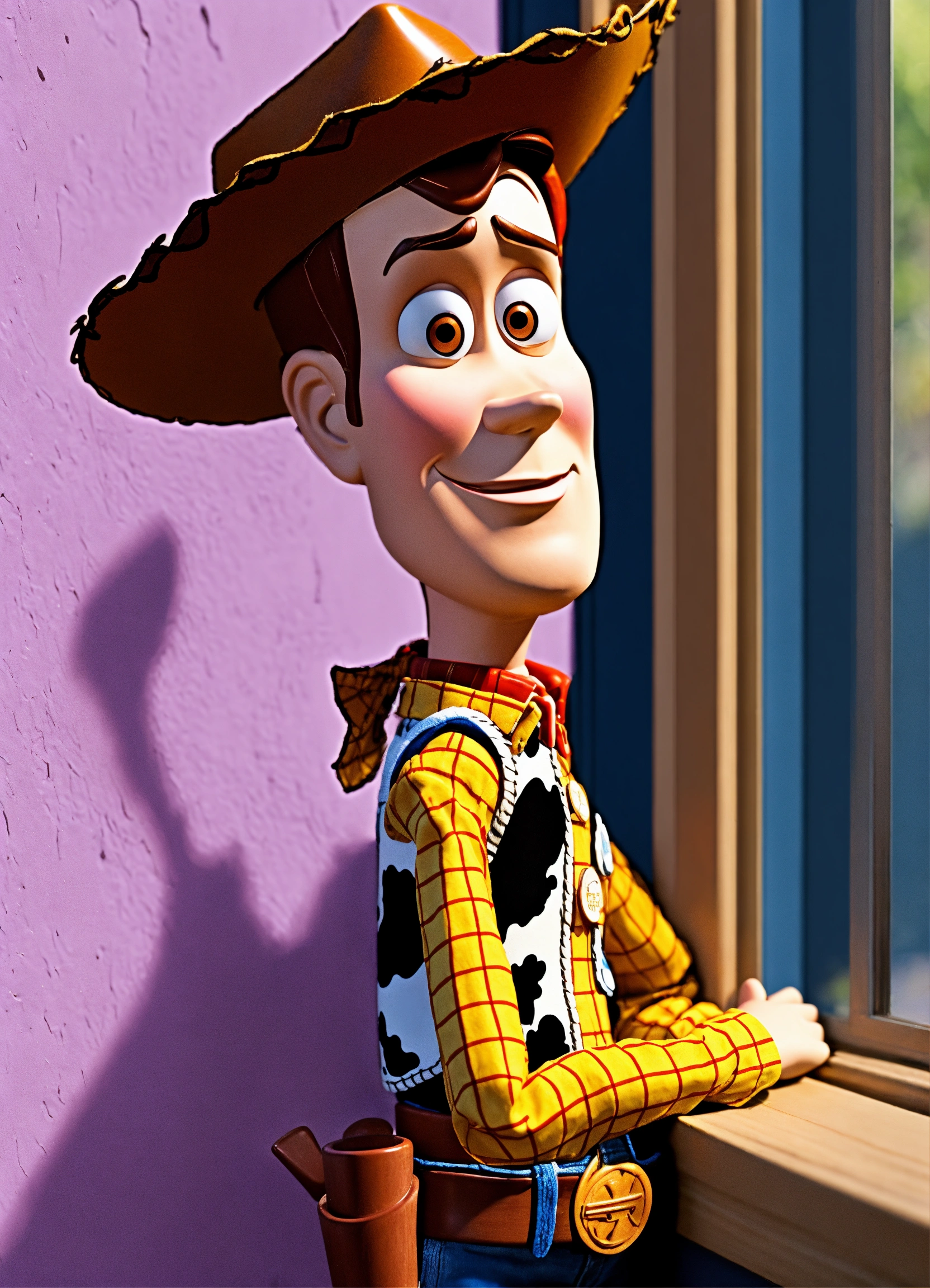 Do woody from toy story setting on a window ledge with a sad look
