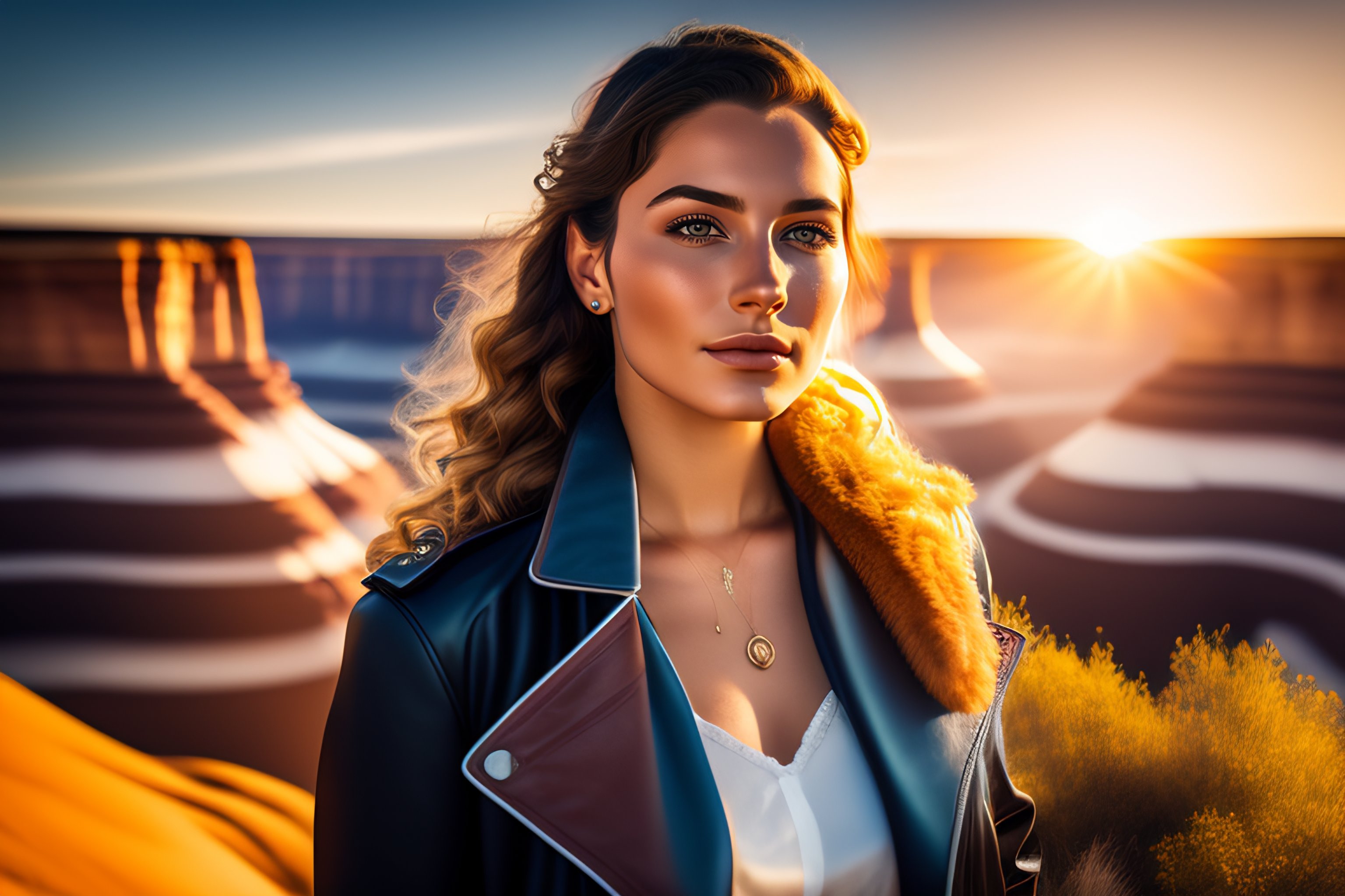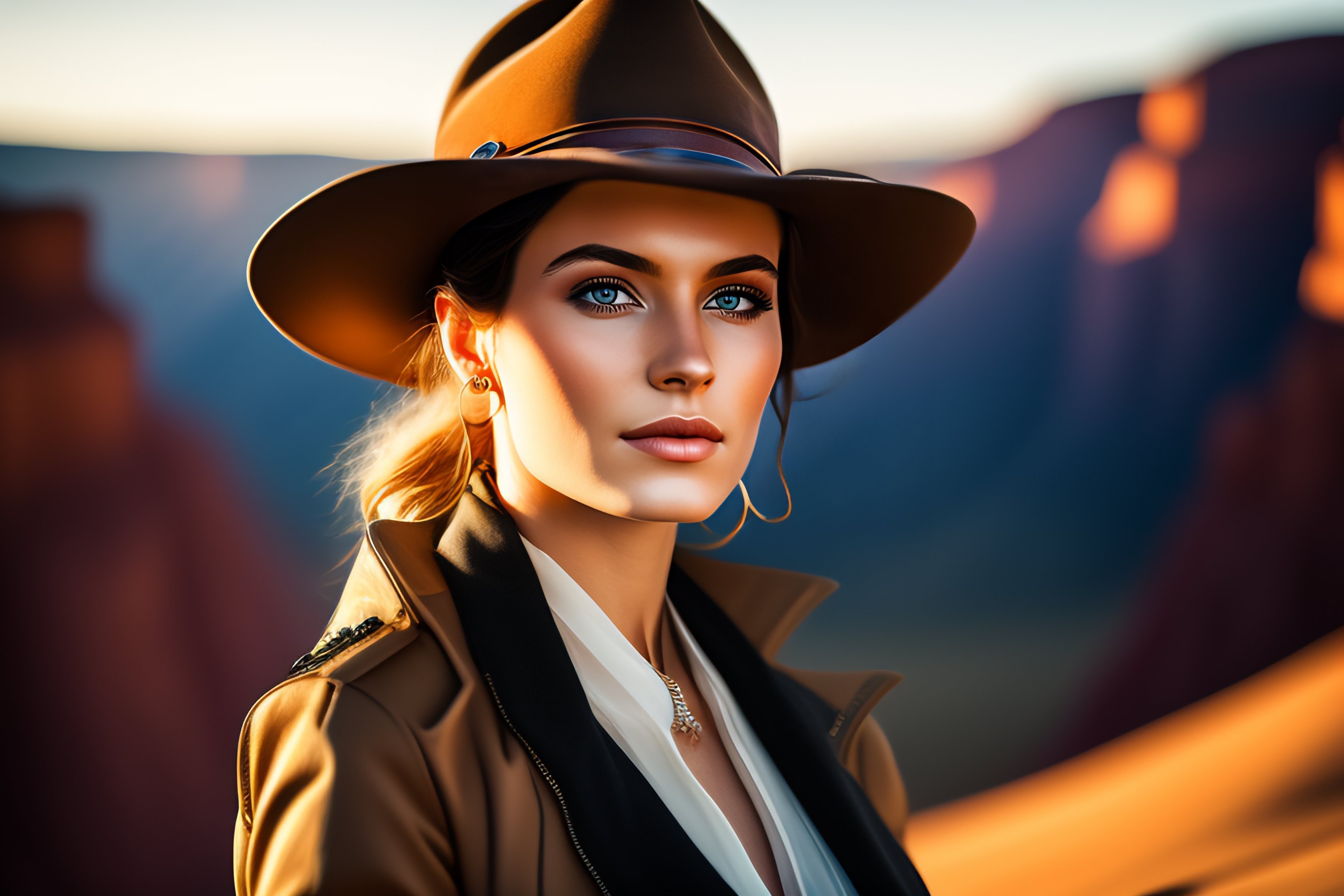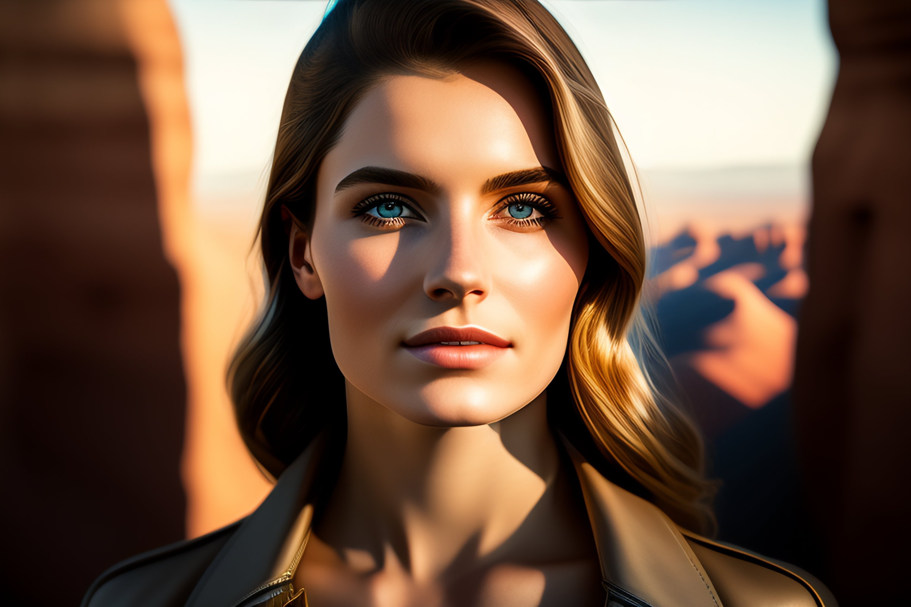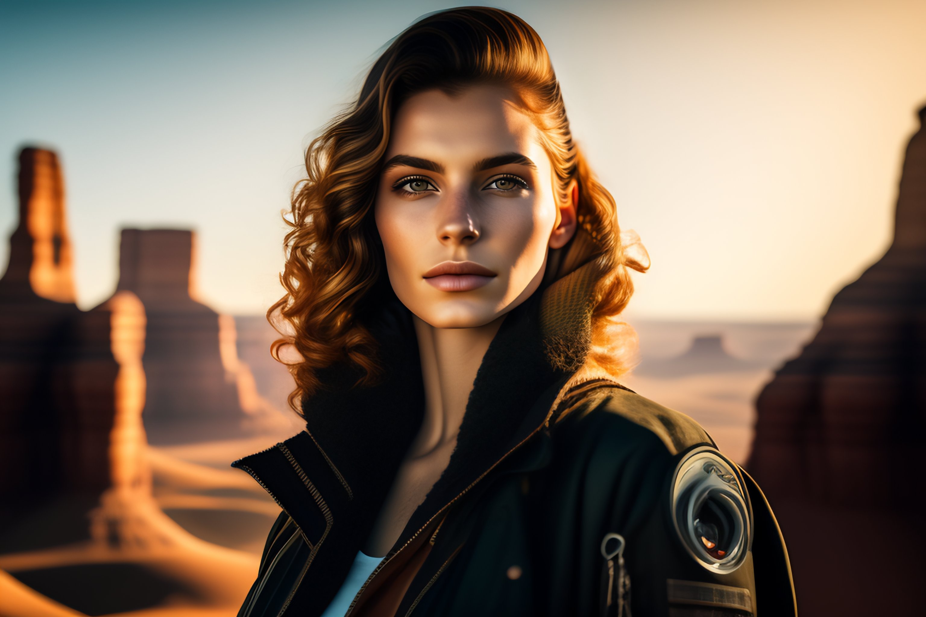 Woman 20 years old portrait, realistic photo, fine, sharpness, open plan, canyons in backgound, dieselpunk style, in the morning sun