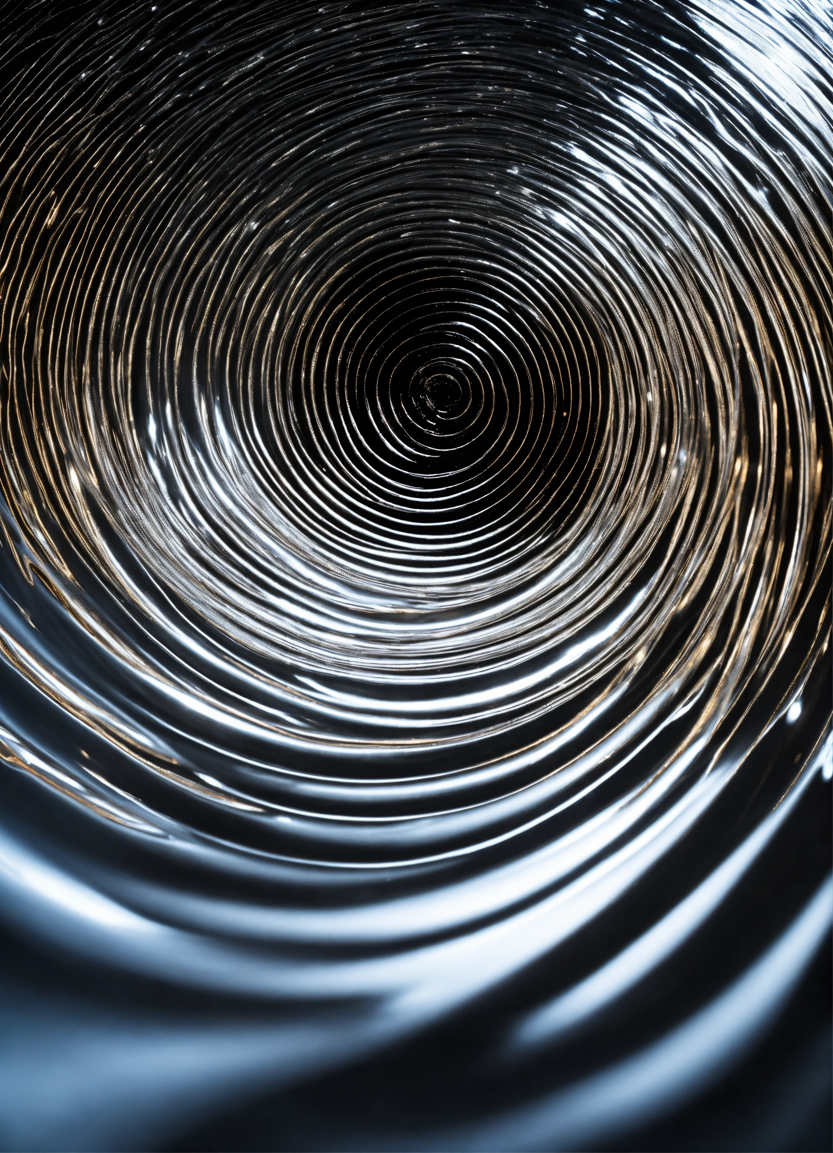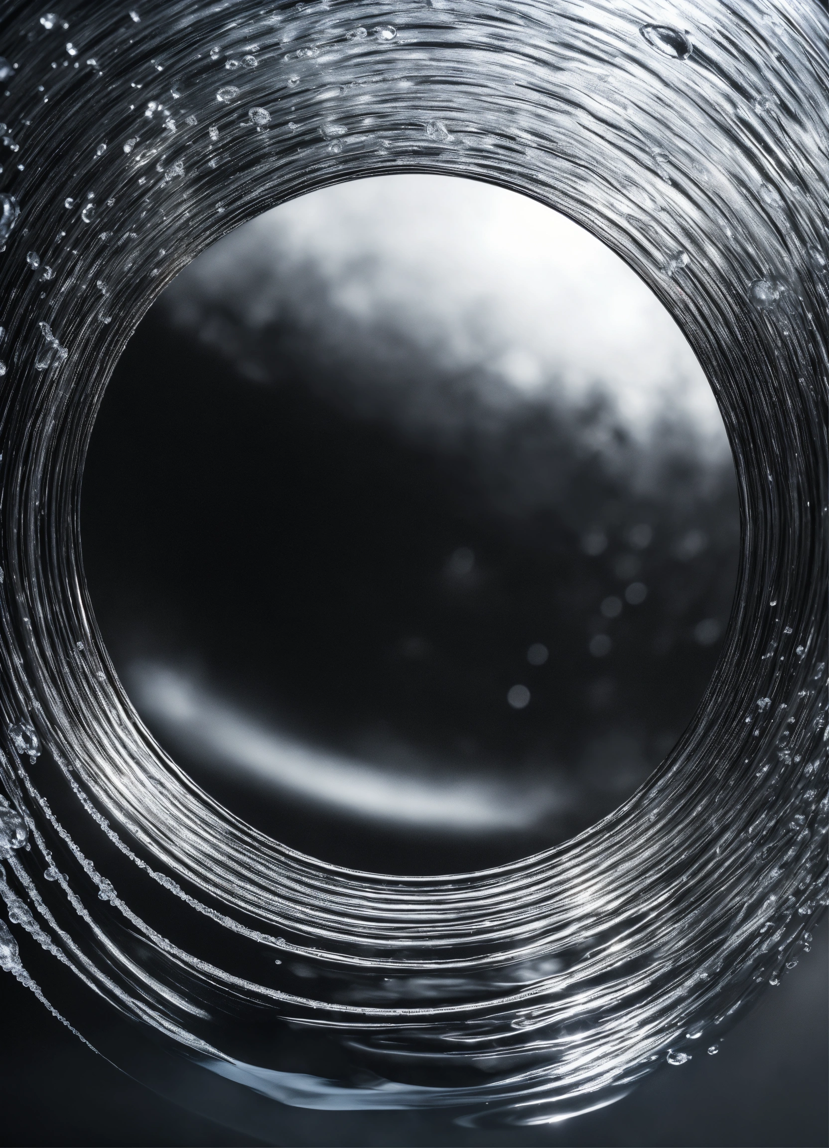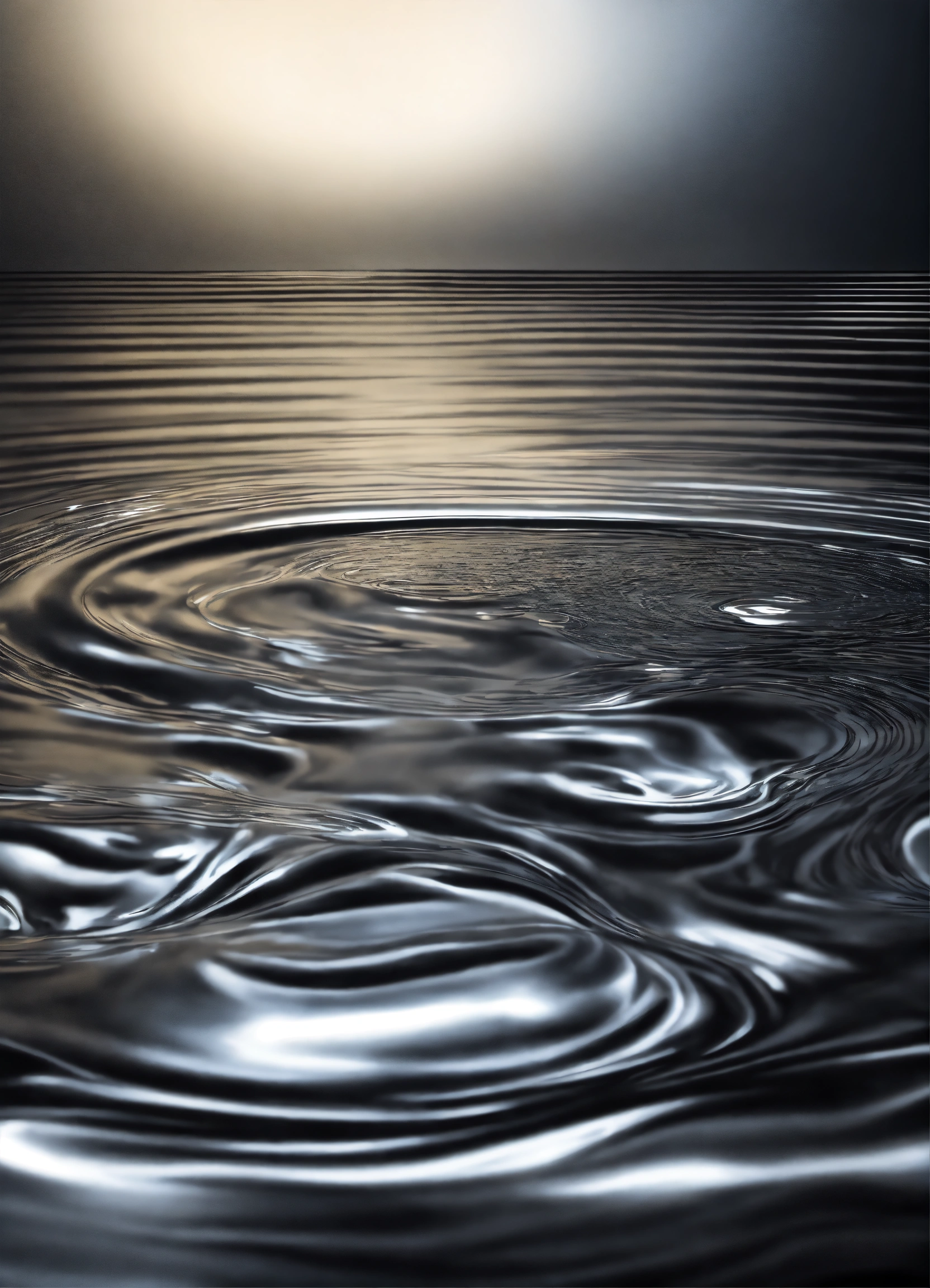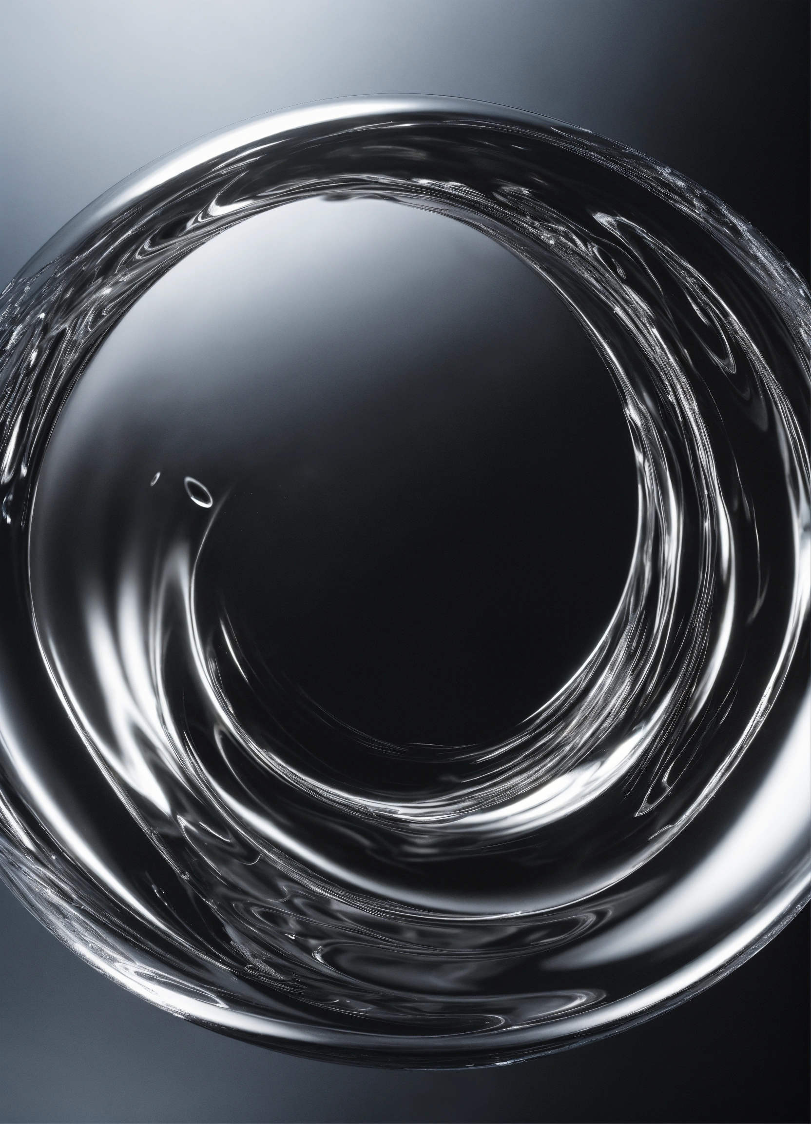 Hyper realistic opaque silver abstract circular metallic frozen water in air with light reflecting on water with black background minimalist