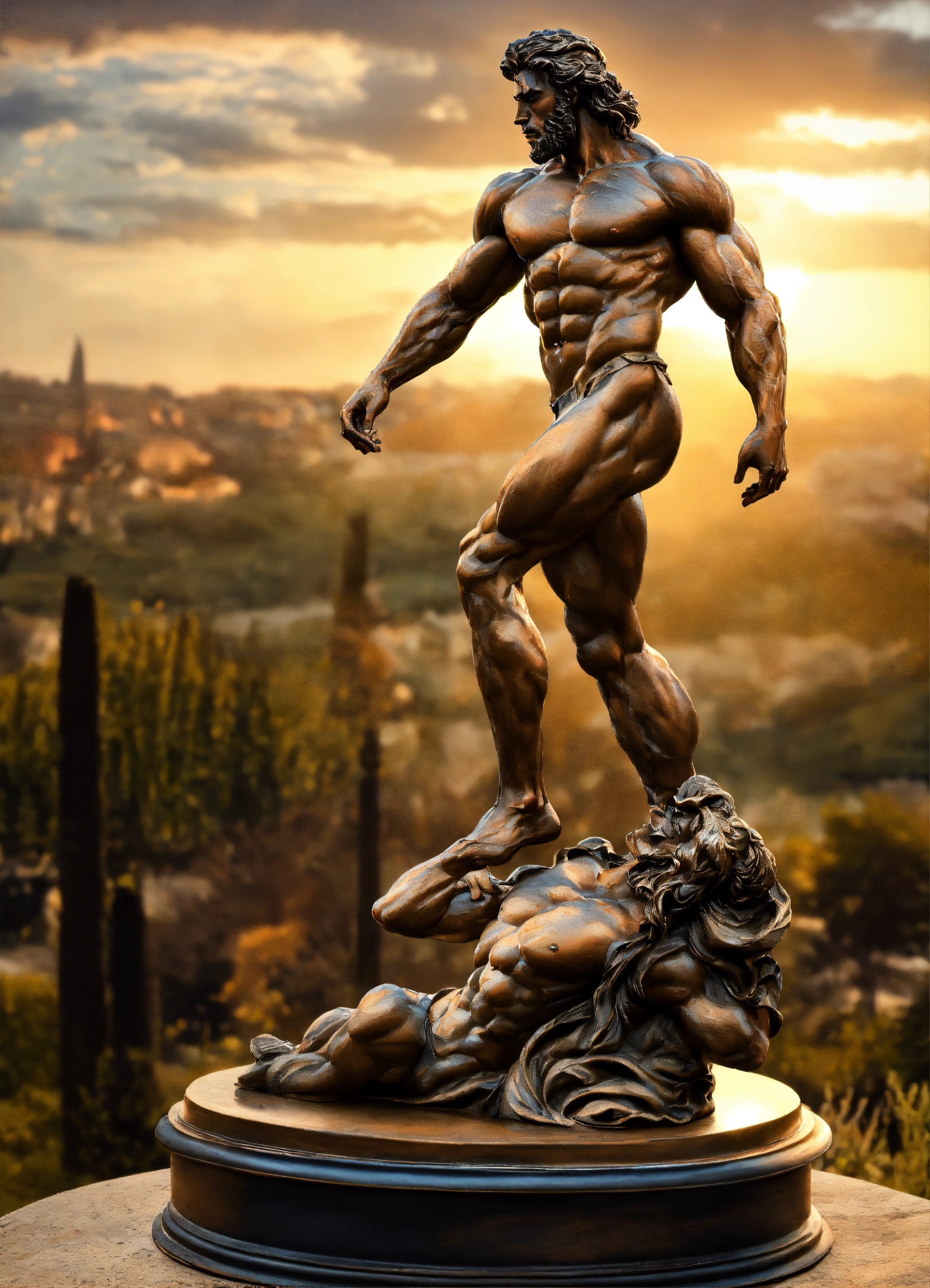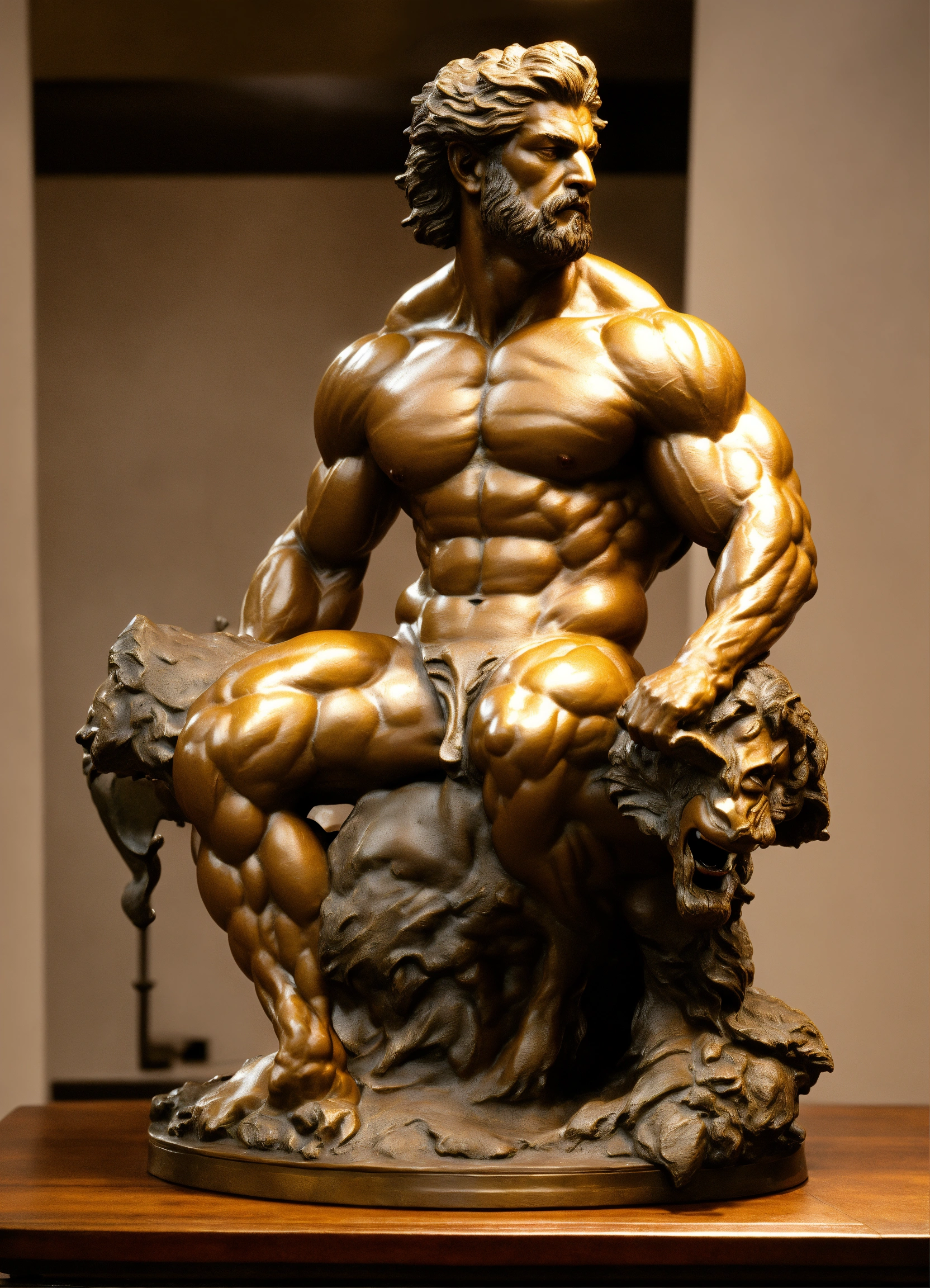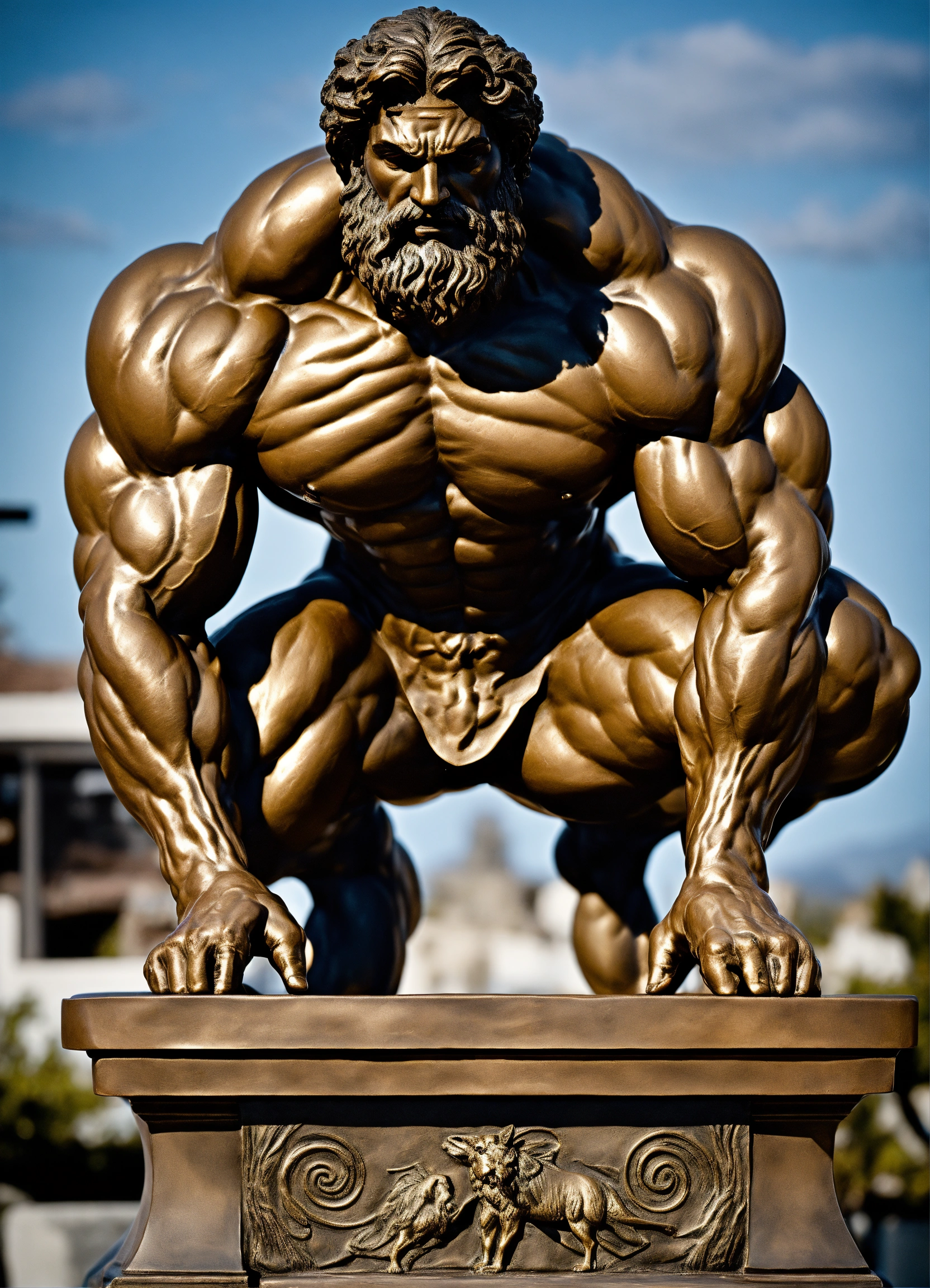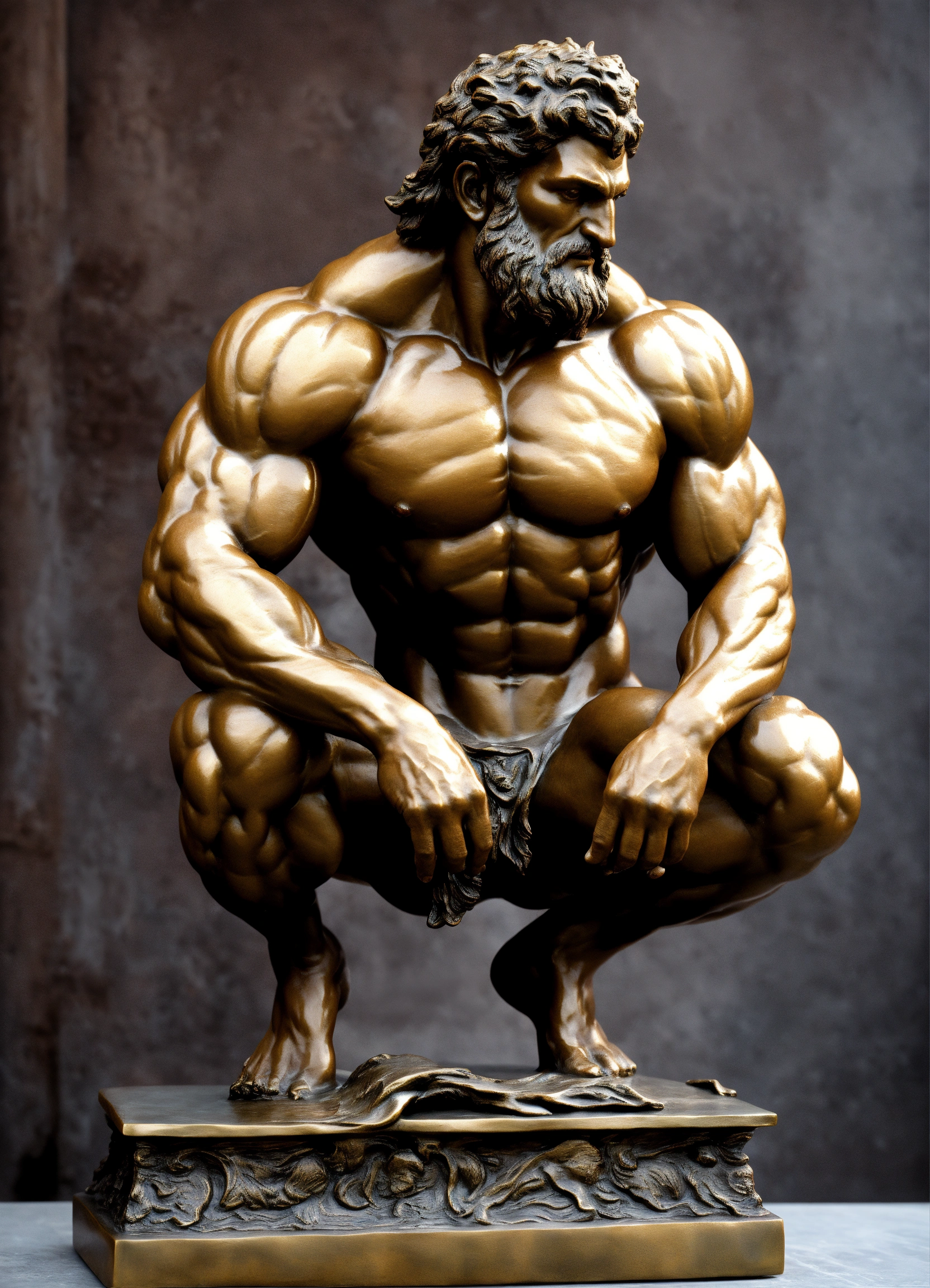 A sculpture of a muscular creature from greek mythology in aged bronze on top of a base, ultra-mega-realistic in ultra-definition 32k photorealism.