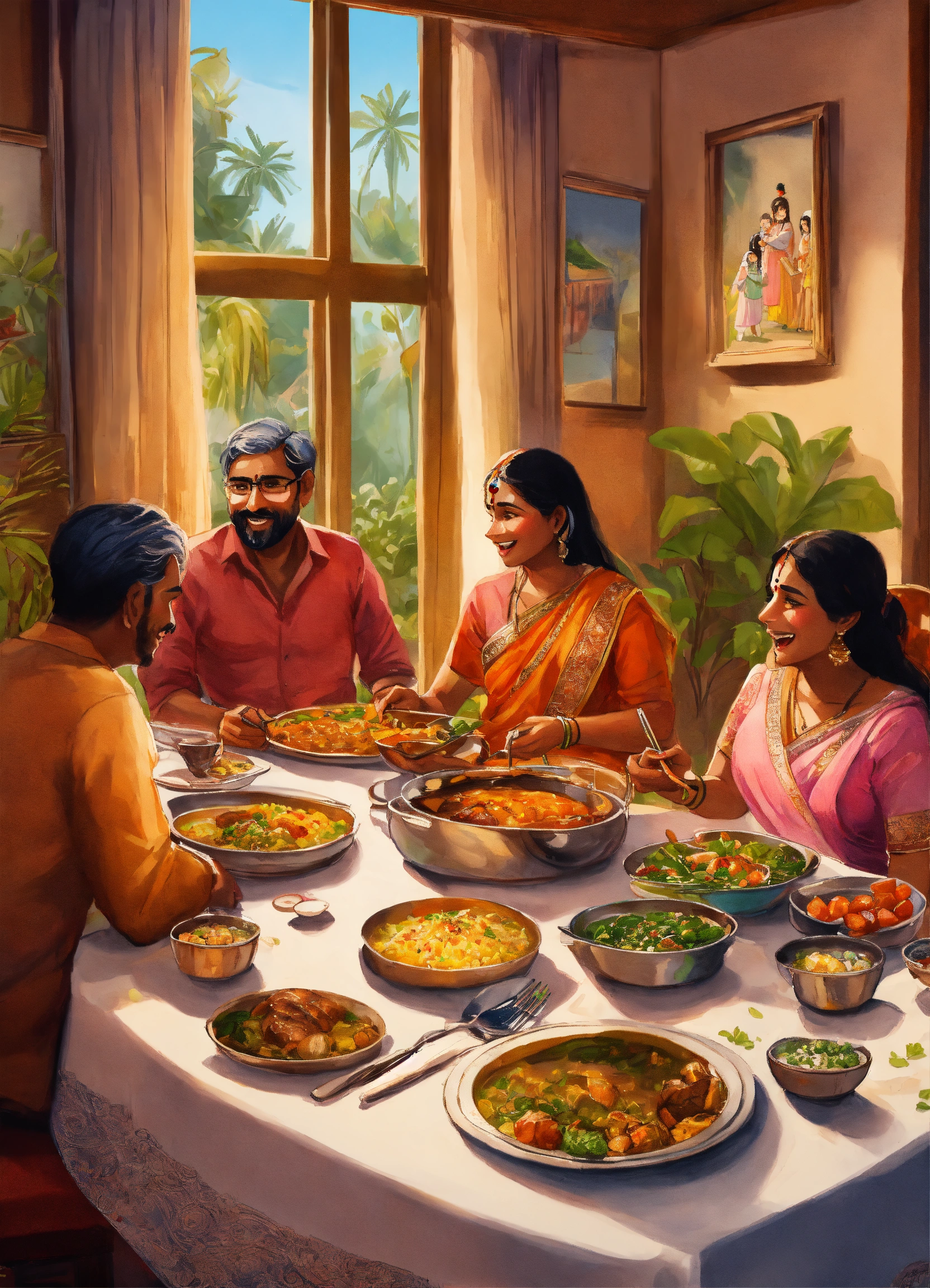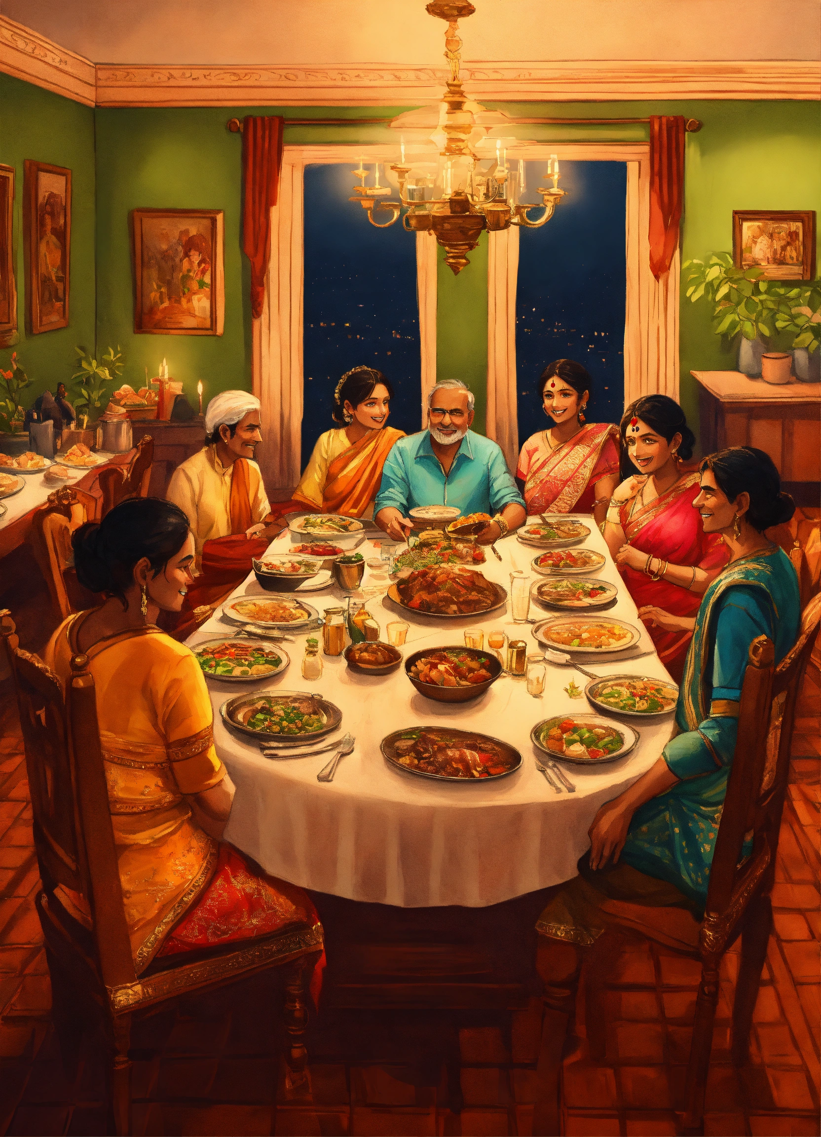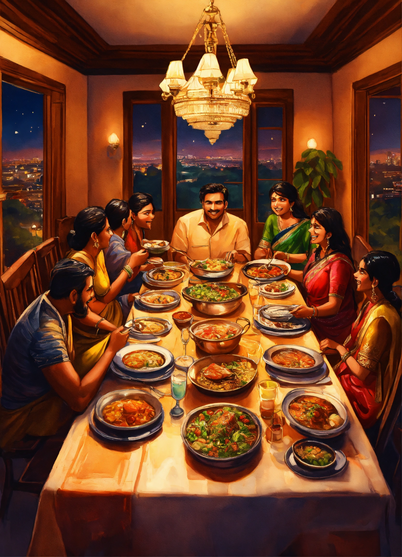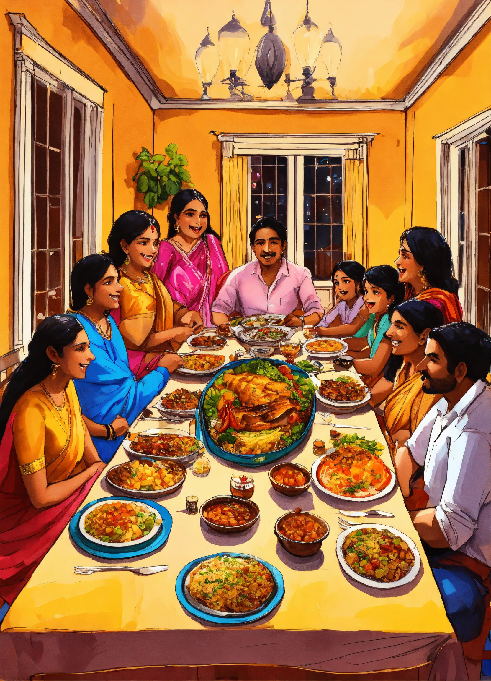 A hand drawn painting of an indian family sitting in their large luxurious dinner table having dinner, talking, laughing and having fun, a lot of food on the dinning table, 8k, sharp, highly detailed, vibrant, vivid
