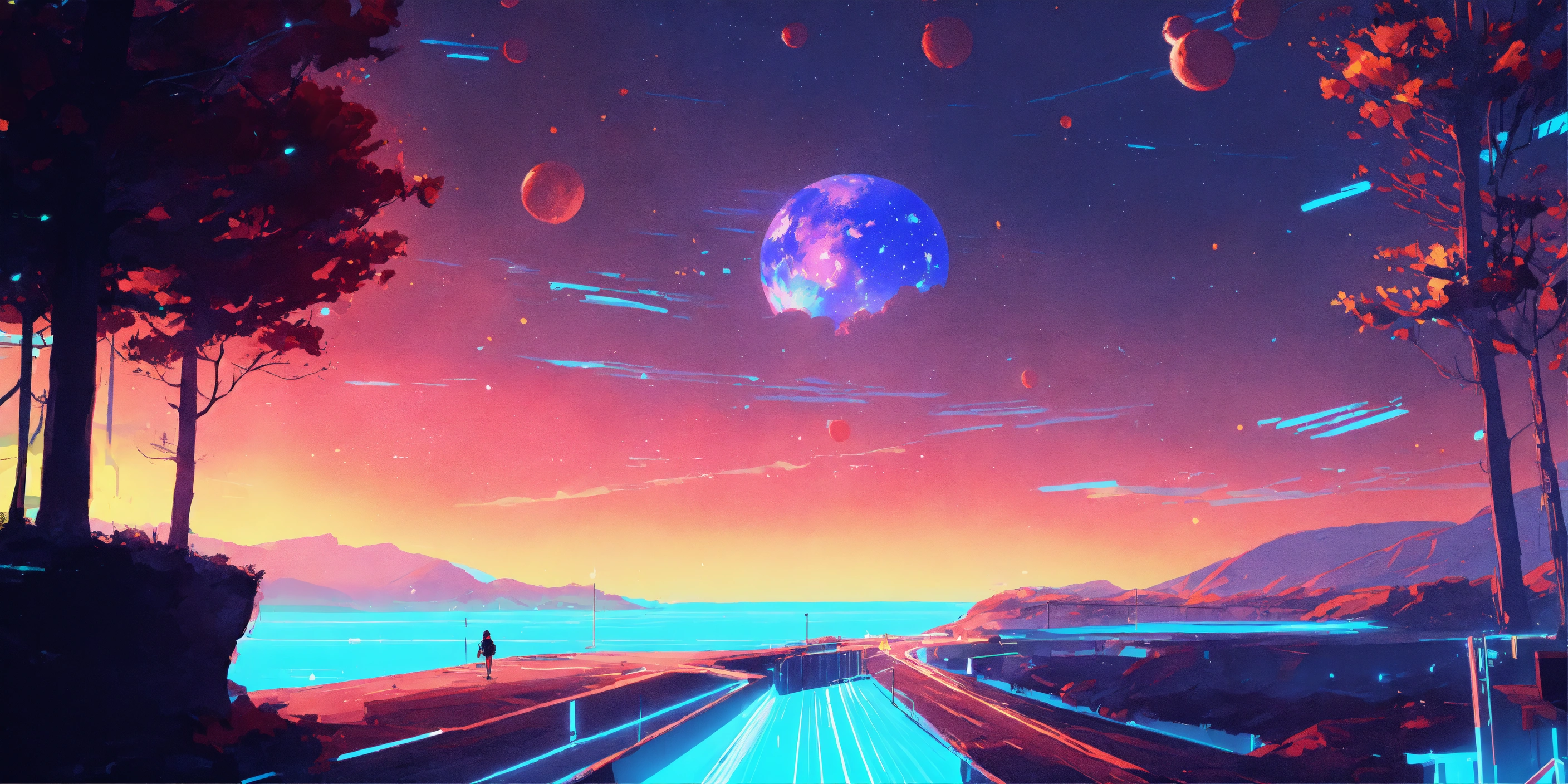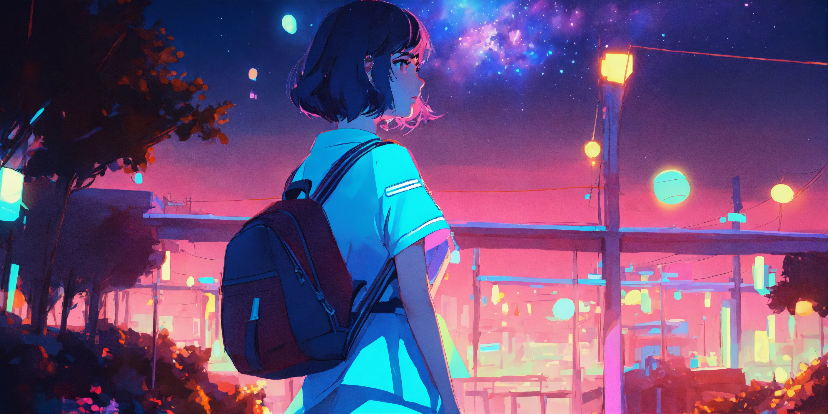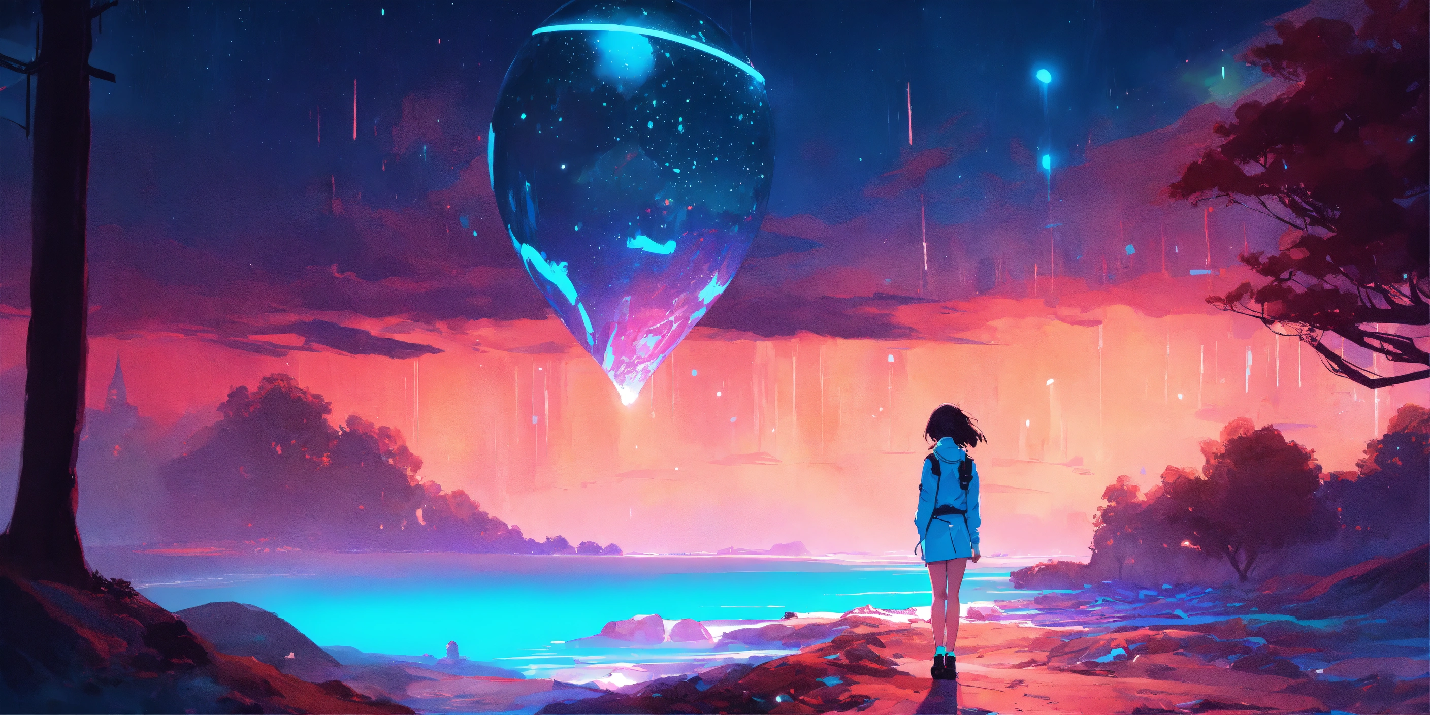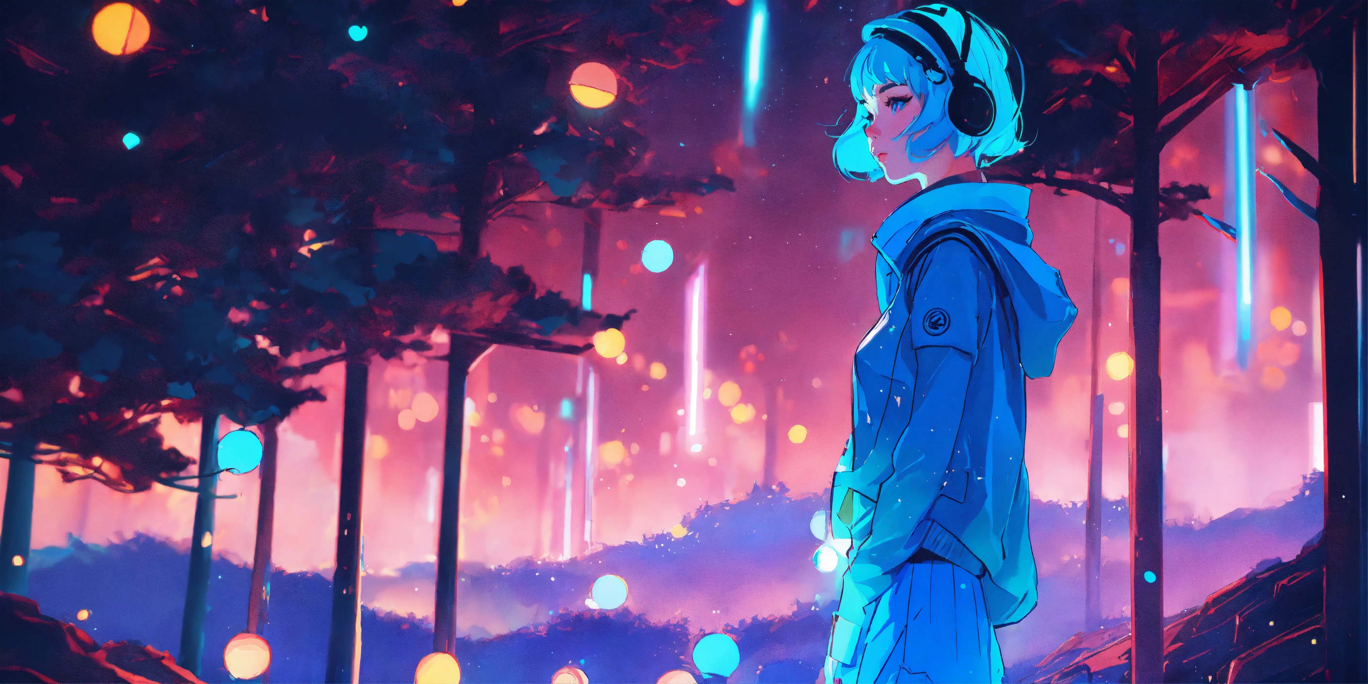 Paper craft style, forrest, milky way, fairy tale, sci-fi, colors, neon lights, digital painting, pixiv, by ilya kuvshinov, neon lights, 3d, perspective, two colors, blue turquoise