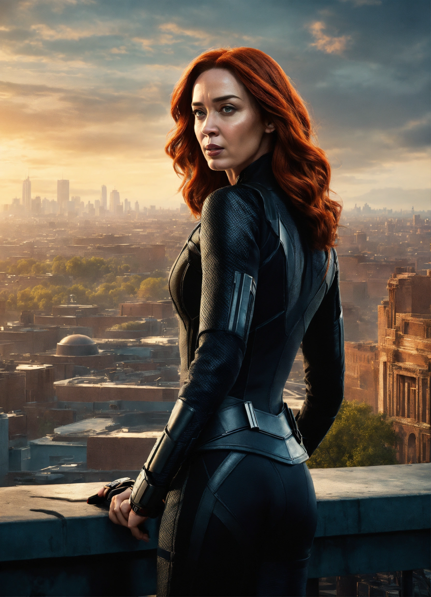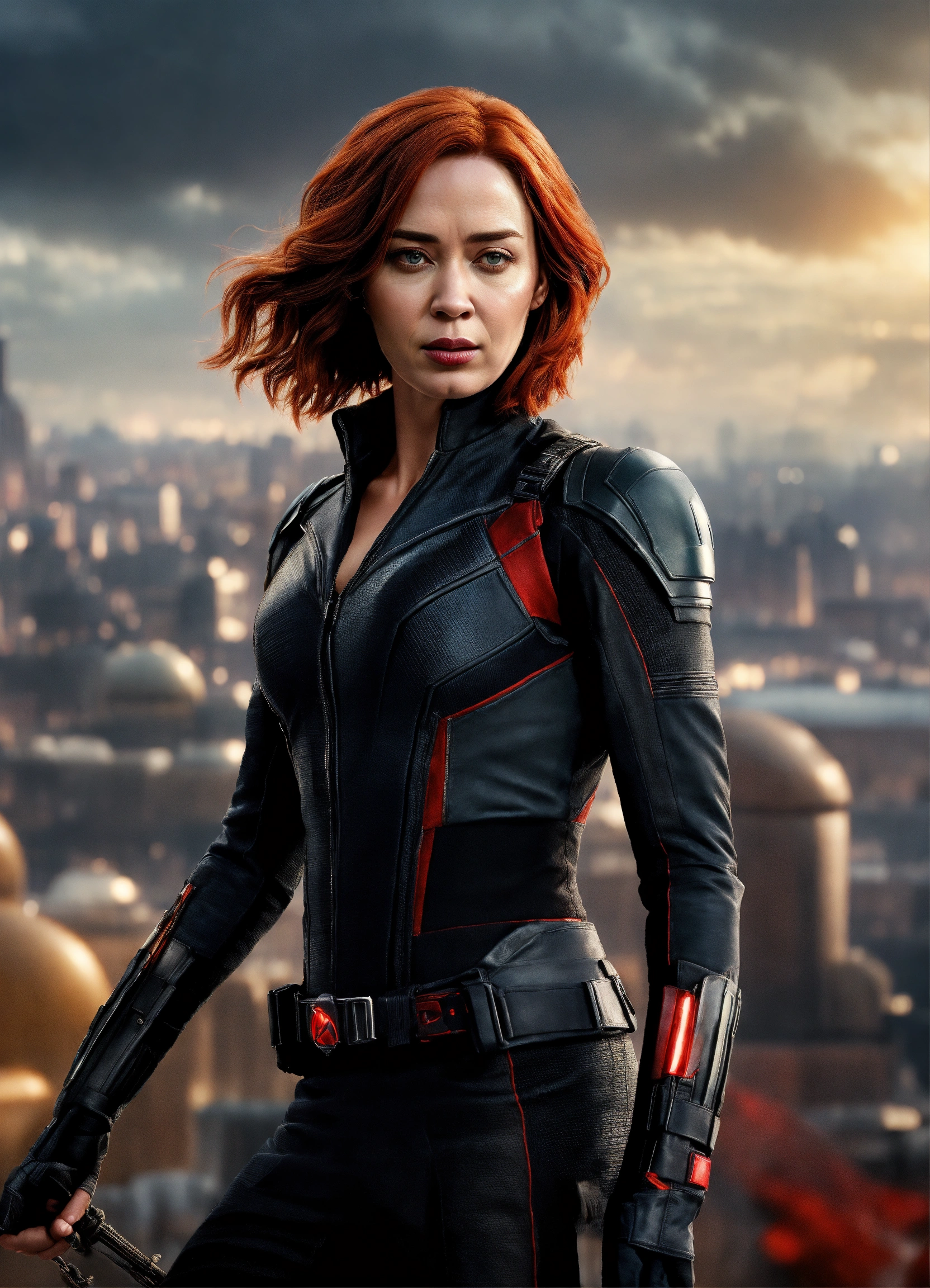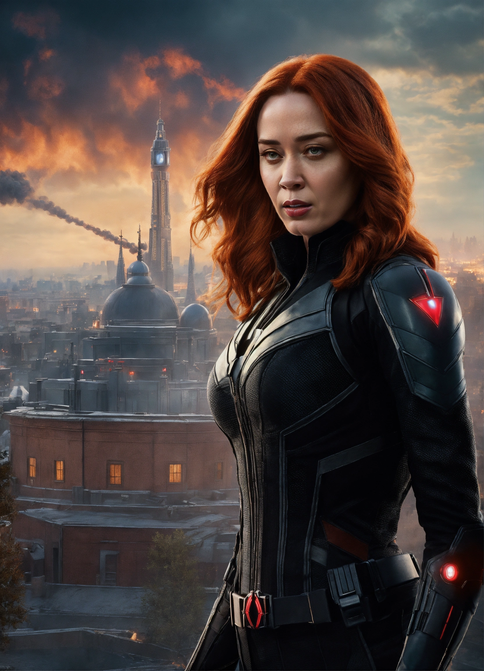 Emily blunt is natasha romanoff, redhead, dressed like black widow of marvel studios, moskow in background, 8k resolution, photorealism, higly detailed, epic shot