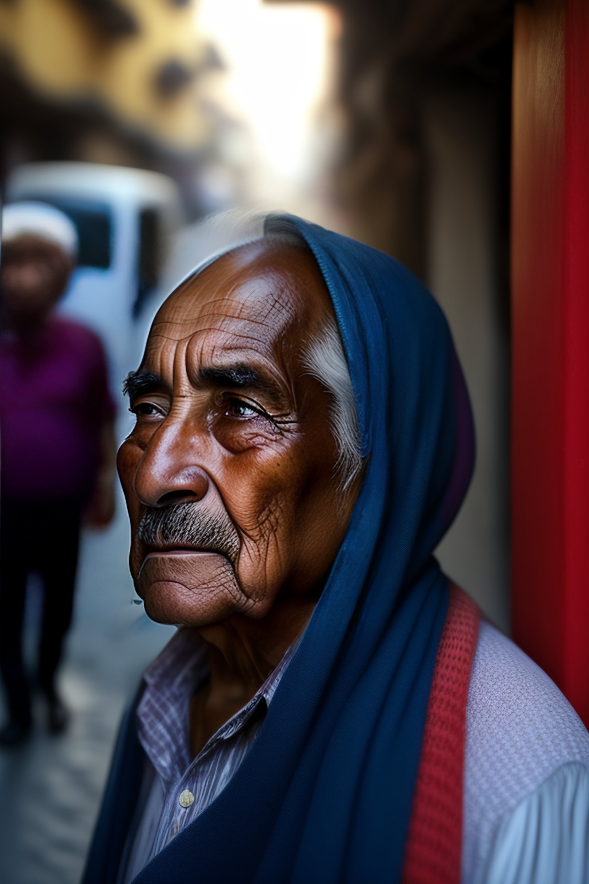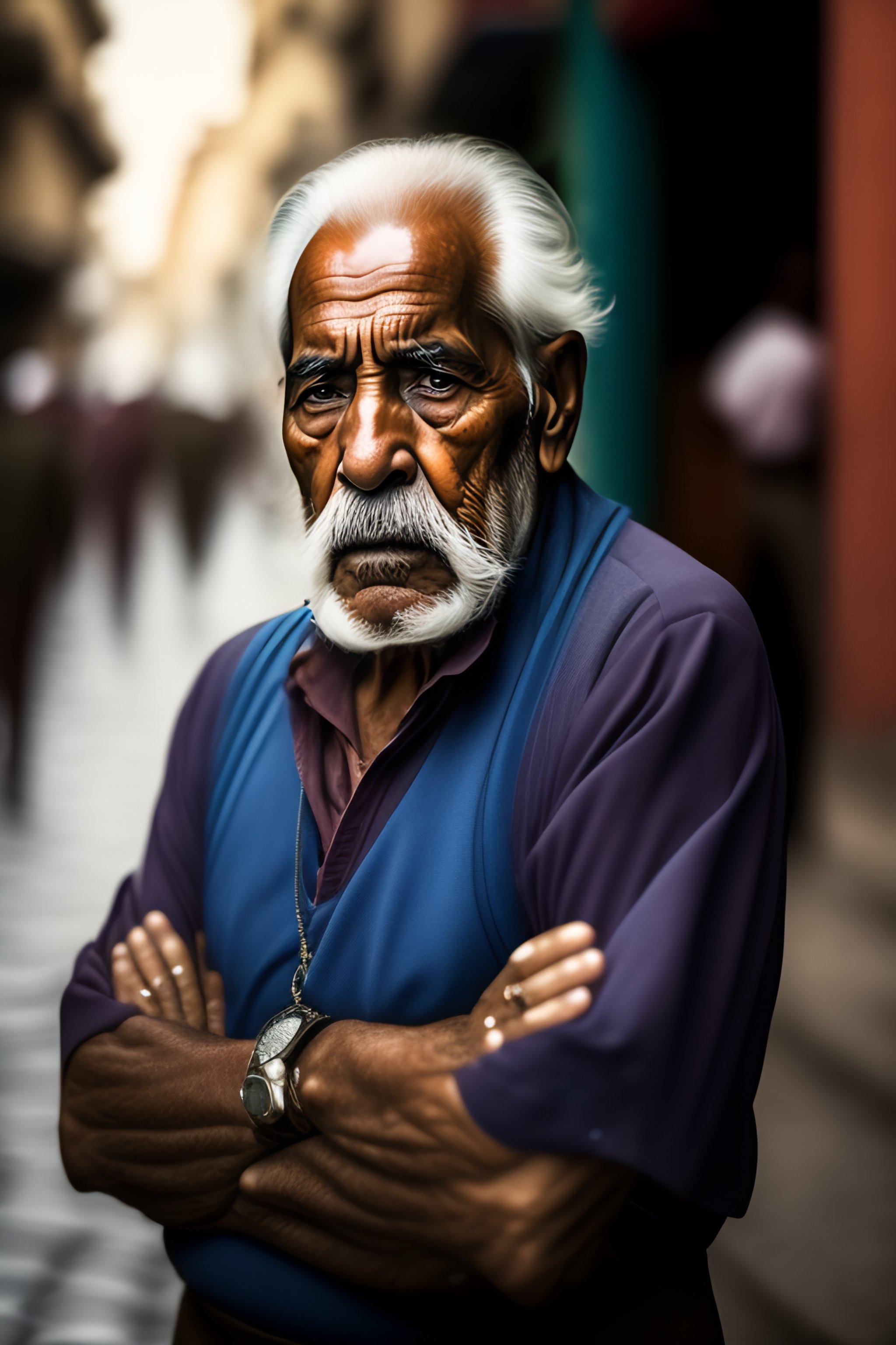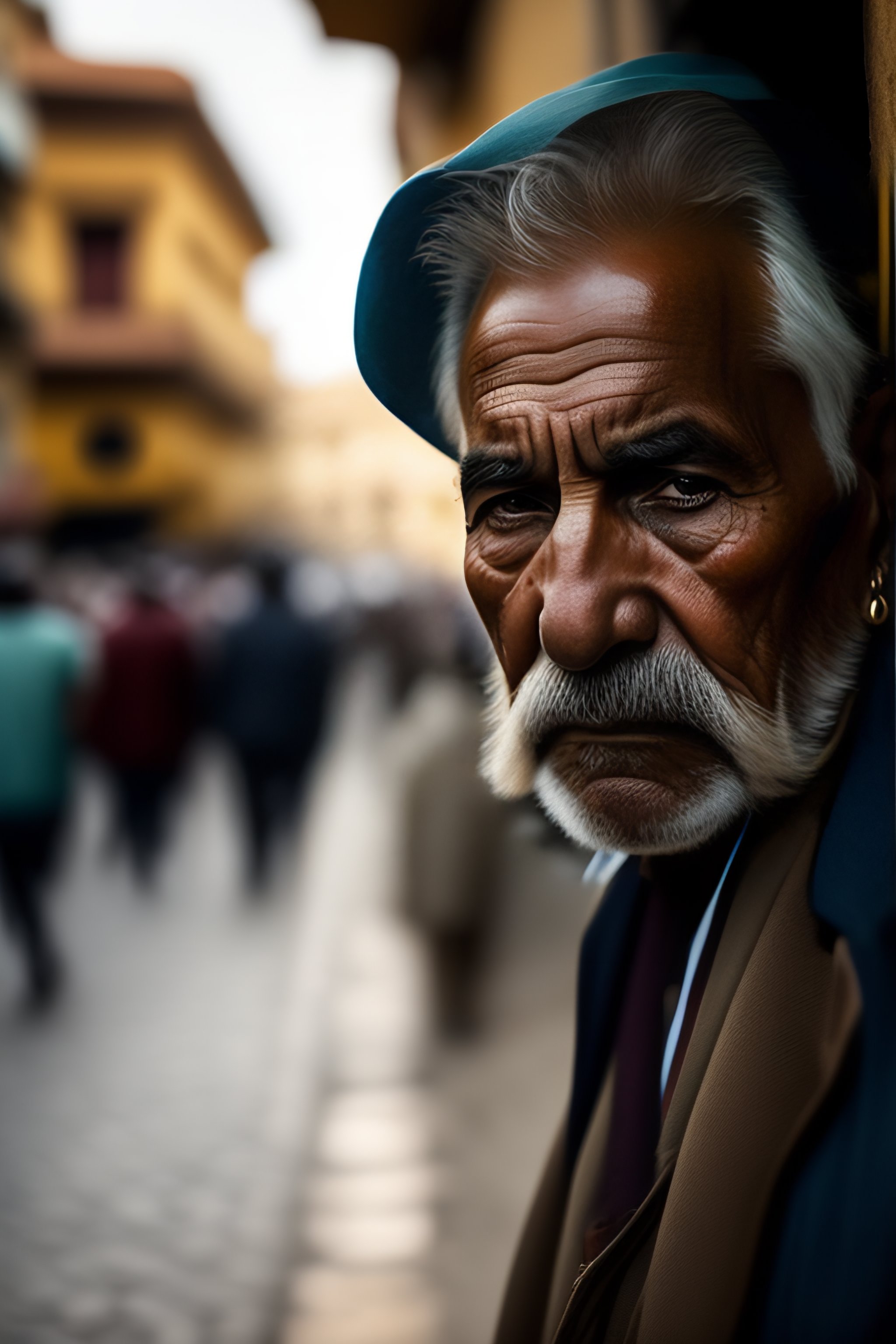 Viejo feo, pobre, poco pelo canoso, sin dientes, ojos grandes, muy sucio, flaco, en una calle con muchos indigentes al rededor