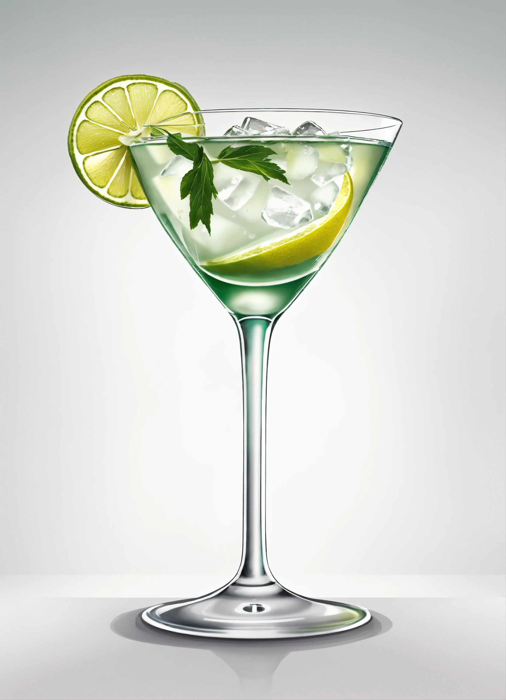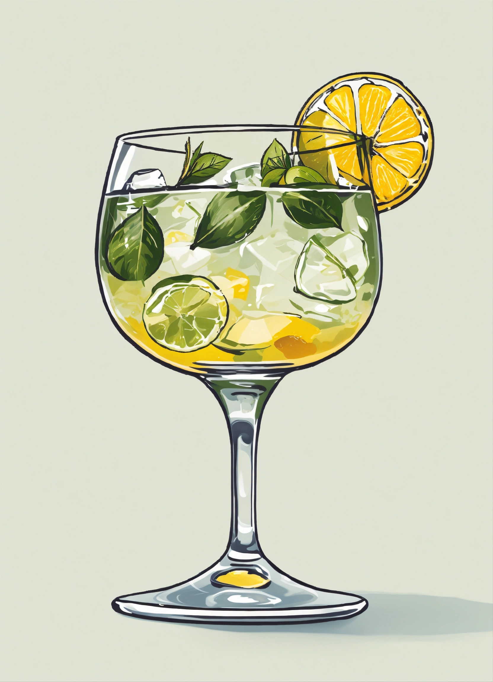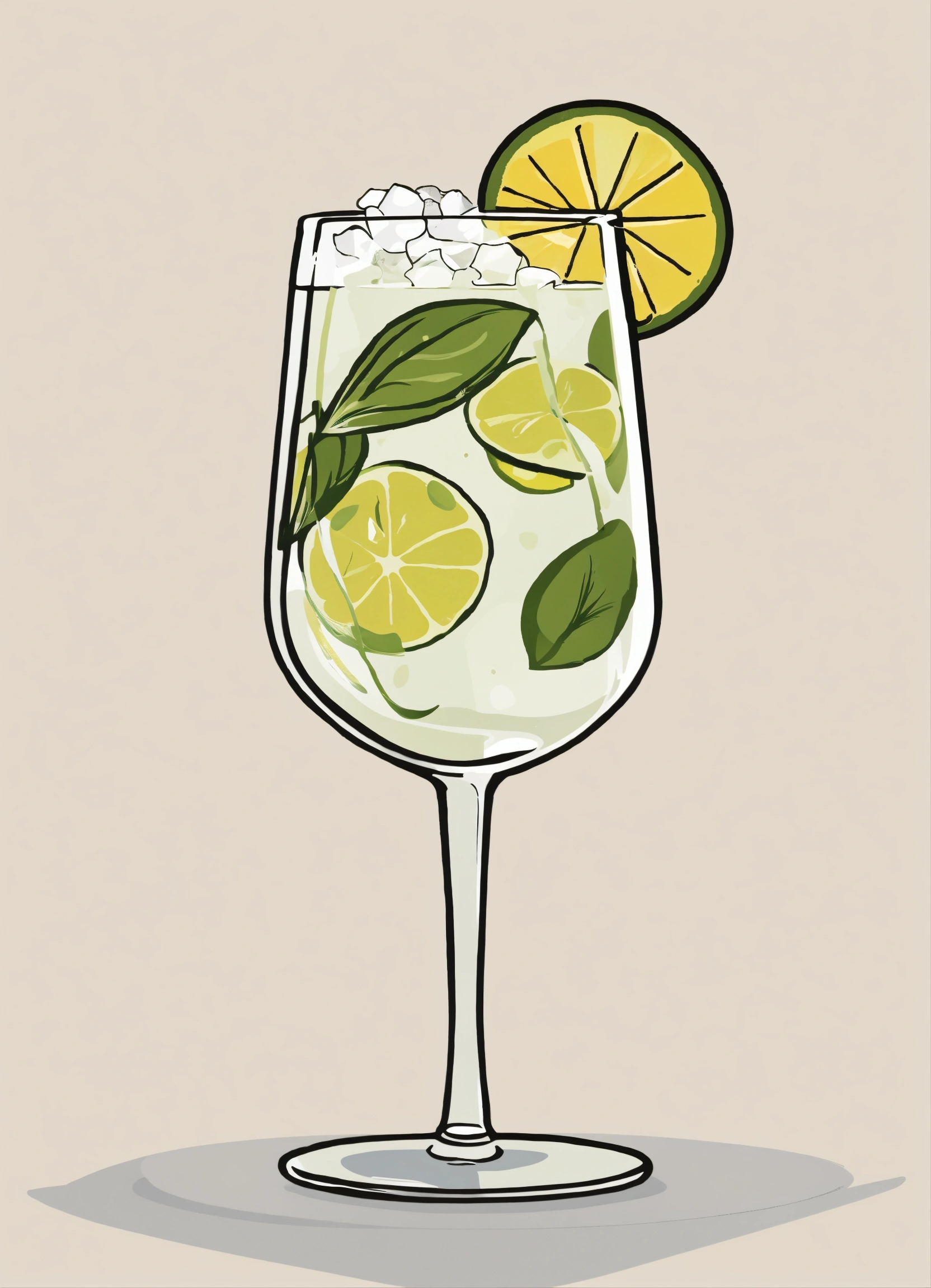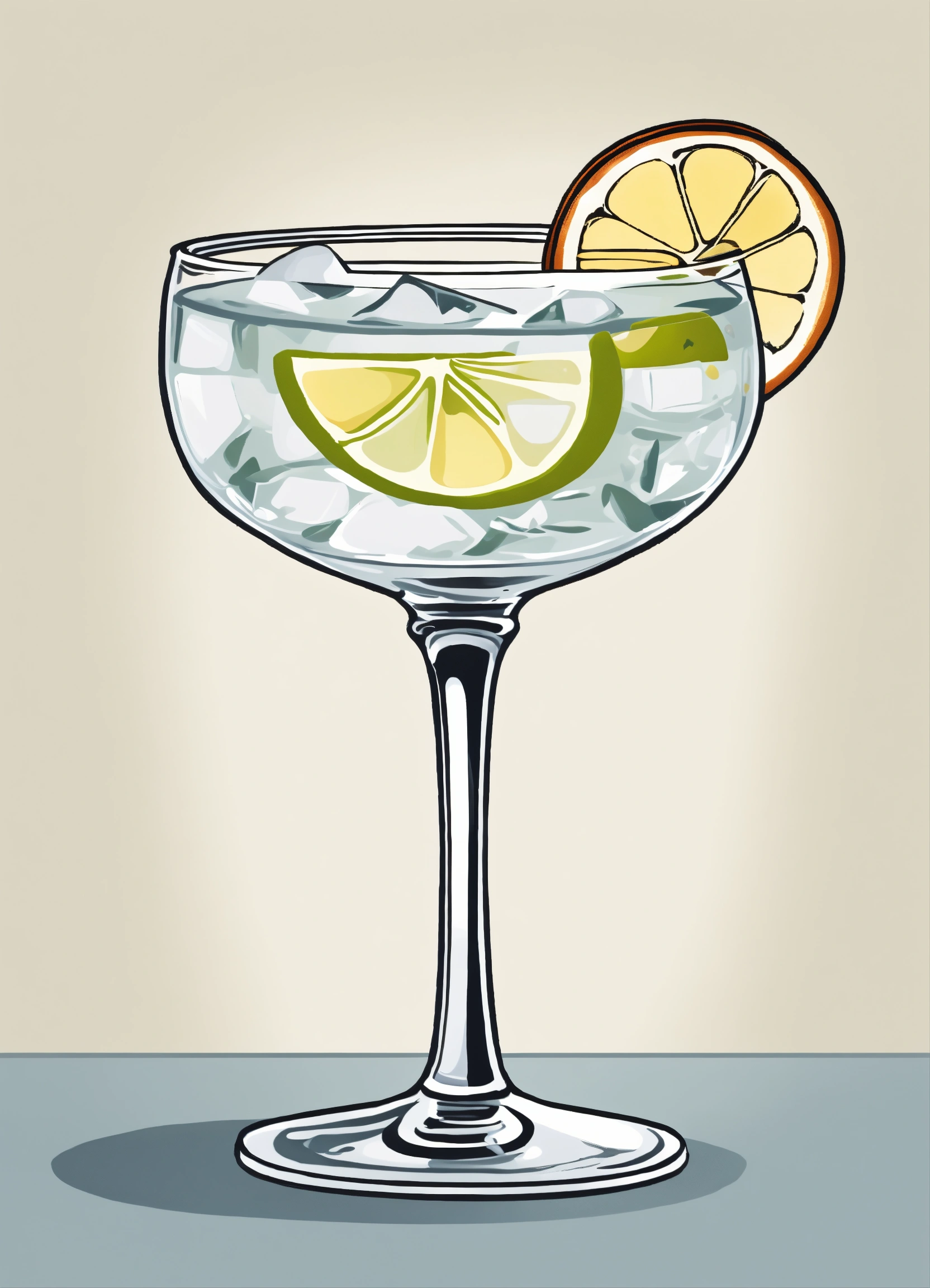 "an elegant, cartoon, vector, sophisticated, and minimalist representation of a gin and tonic cocktail against a clean white background."