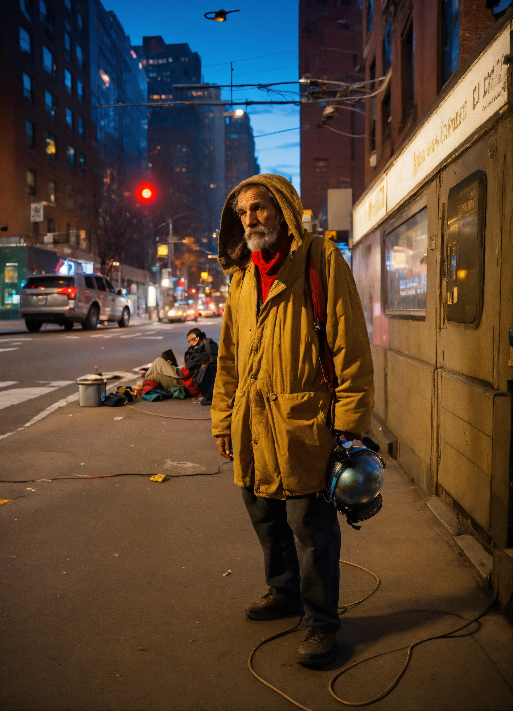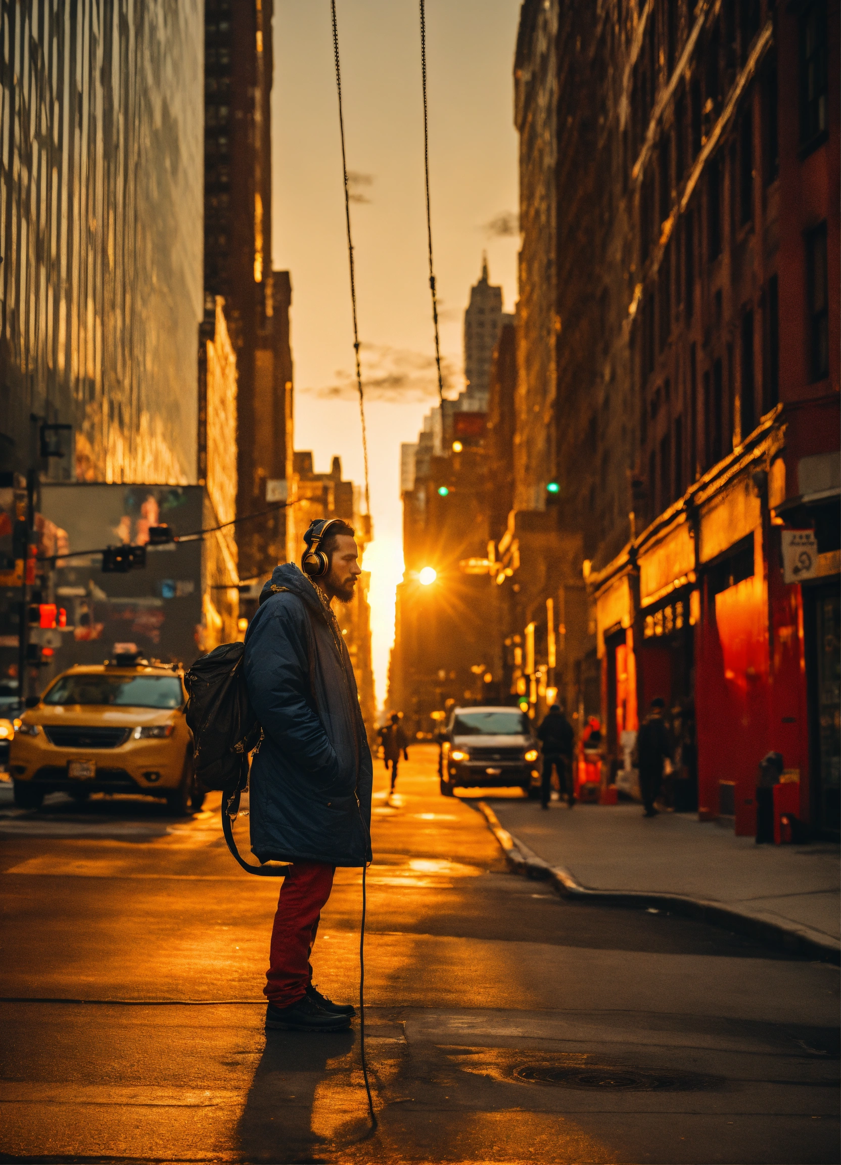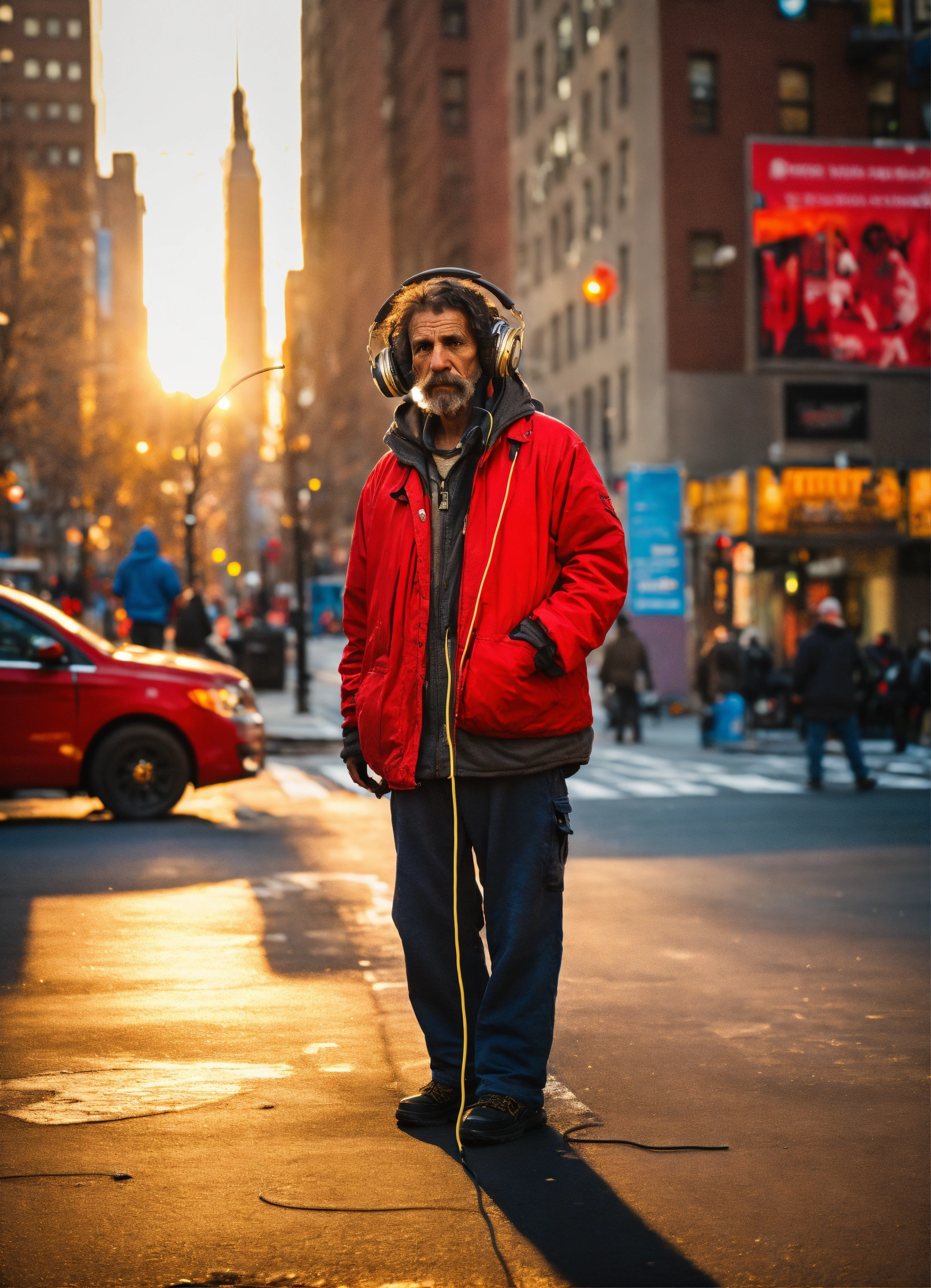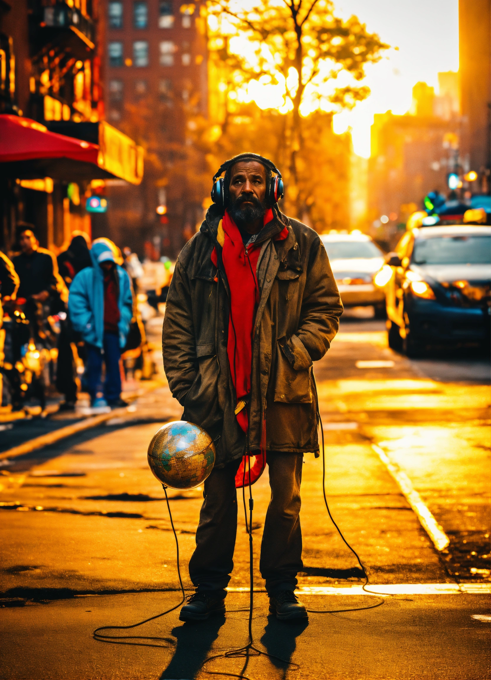Very creepy homeless standing in the street, wiht headphones and a globe red, new york city, unsettling, wide angle, golden hour