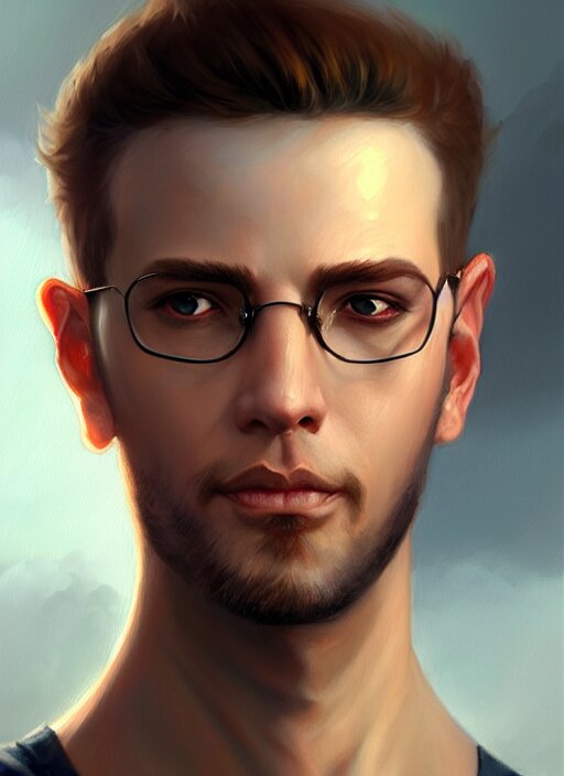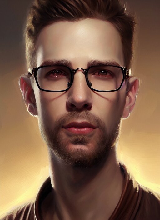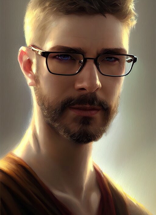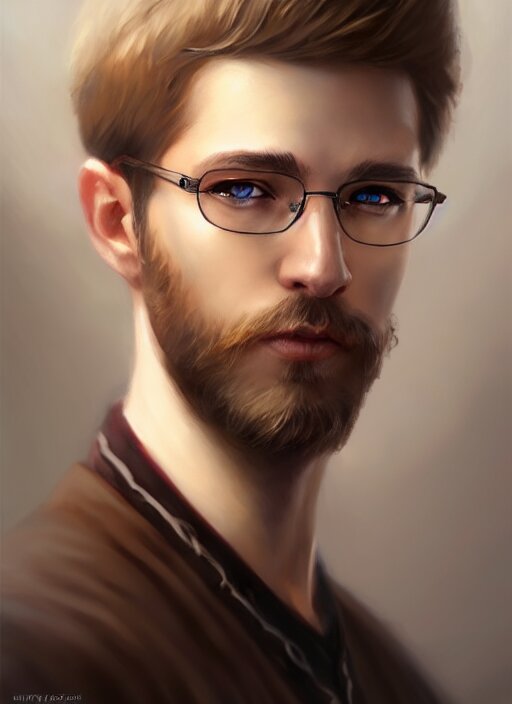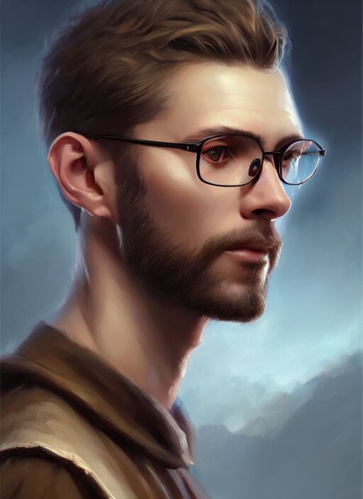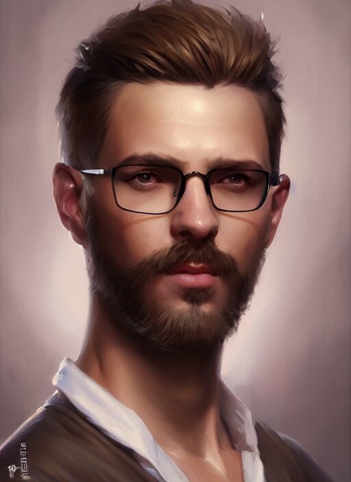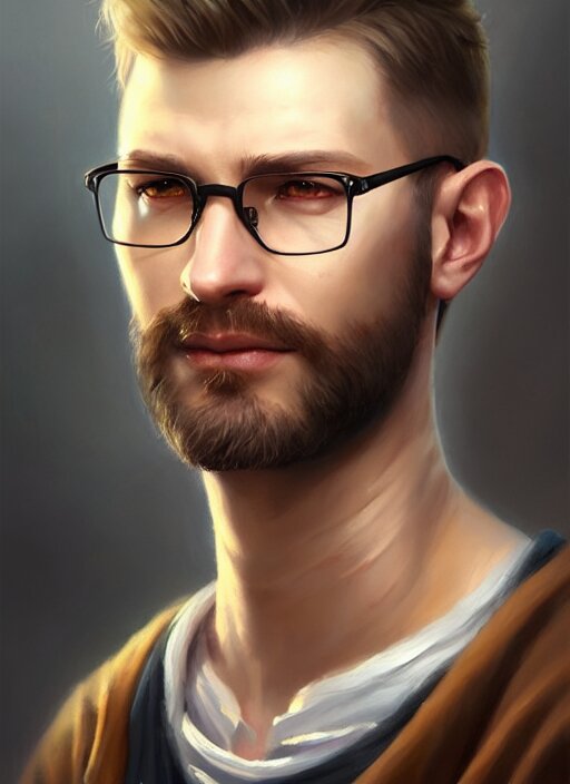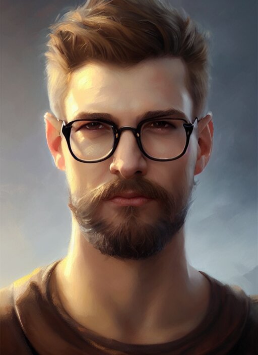 A _ fantasy _ style _ portrait _ painting _ of white male short hair glasses stubble light brown hair wide jaw, rpg dnd oil _ painting _ unreal _ 5 _ daz. _ rpg _ portrait _ extremely _ detailed _ artgerm _ greg _ rutkowski _ greg