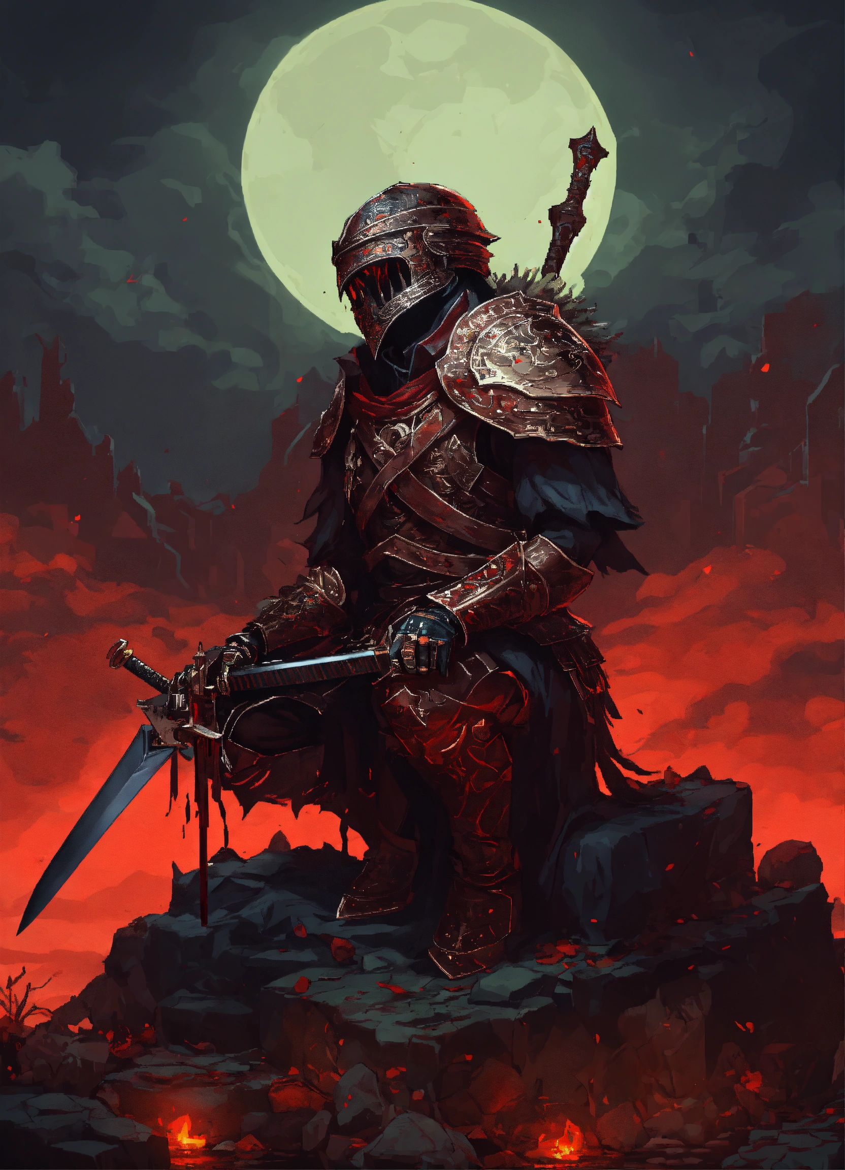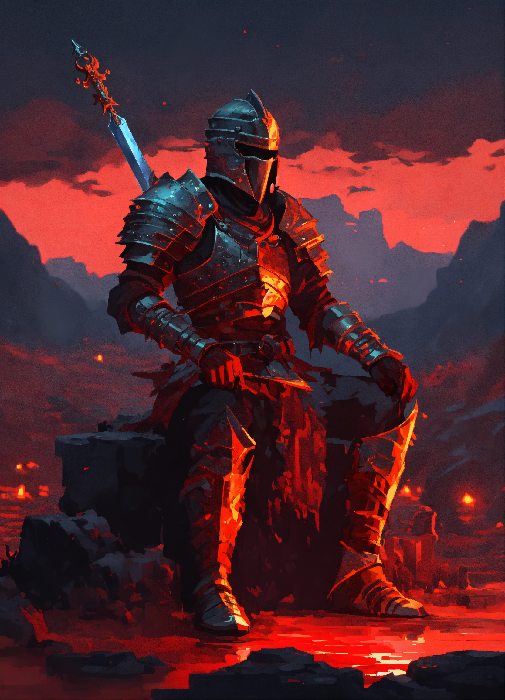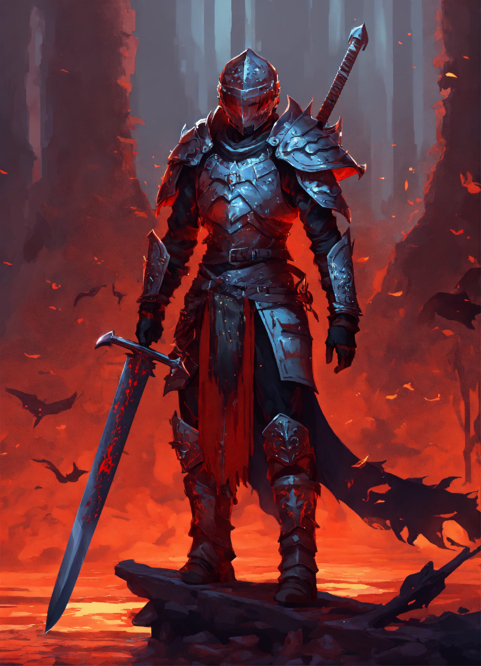Genre pixel art. race human. picture quality 8k. a warrior dressed in plate armor sits on a pile of bones and clutches a sword. his visor is up, and his face is covered in scars. in his hands he clutches a cursed sword, the blade of which represents the mouth of a monster, the entire sword is covered with crying eyes. everything around him is filled with scarlet water. and from the darkness a bony hand reaches out to him.