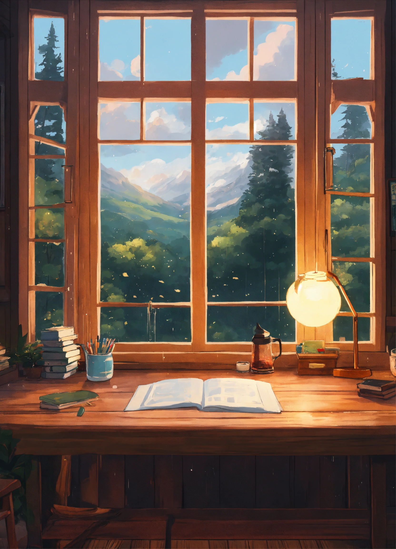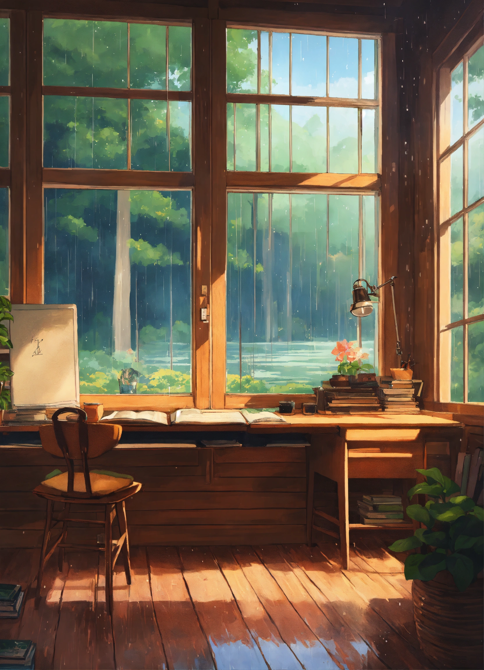 Cozy wooden nordic cabin, anime, studio ghibli, minimalistic, raining outside, big window view with study desk, washed acrylic image, forrest outside, anime lofi artwork