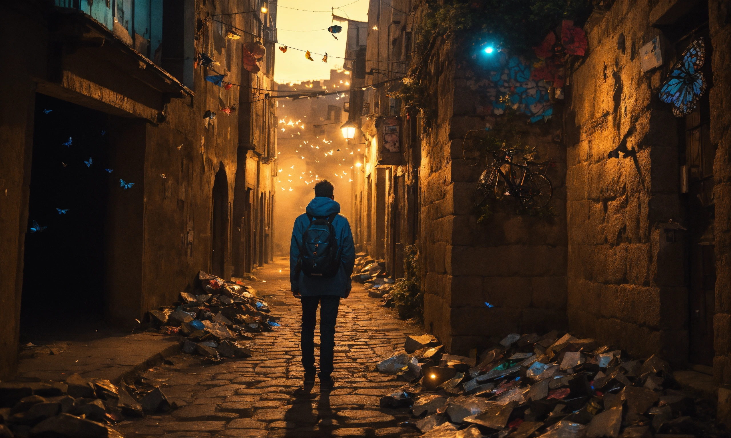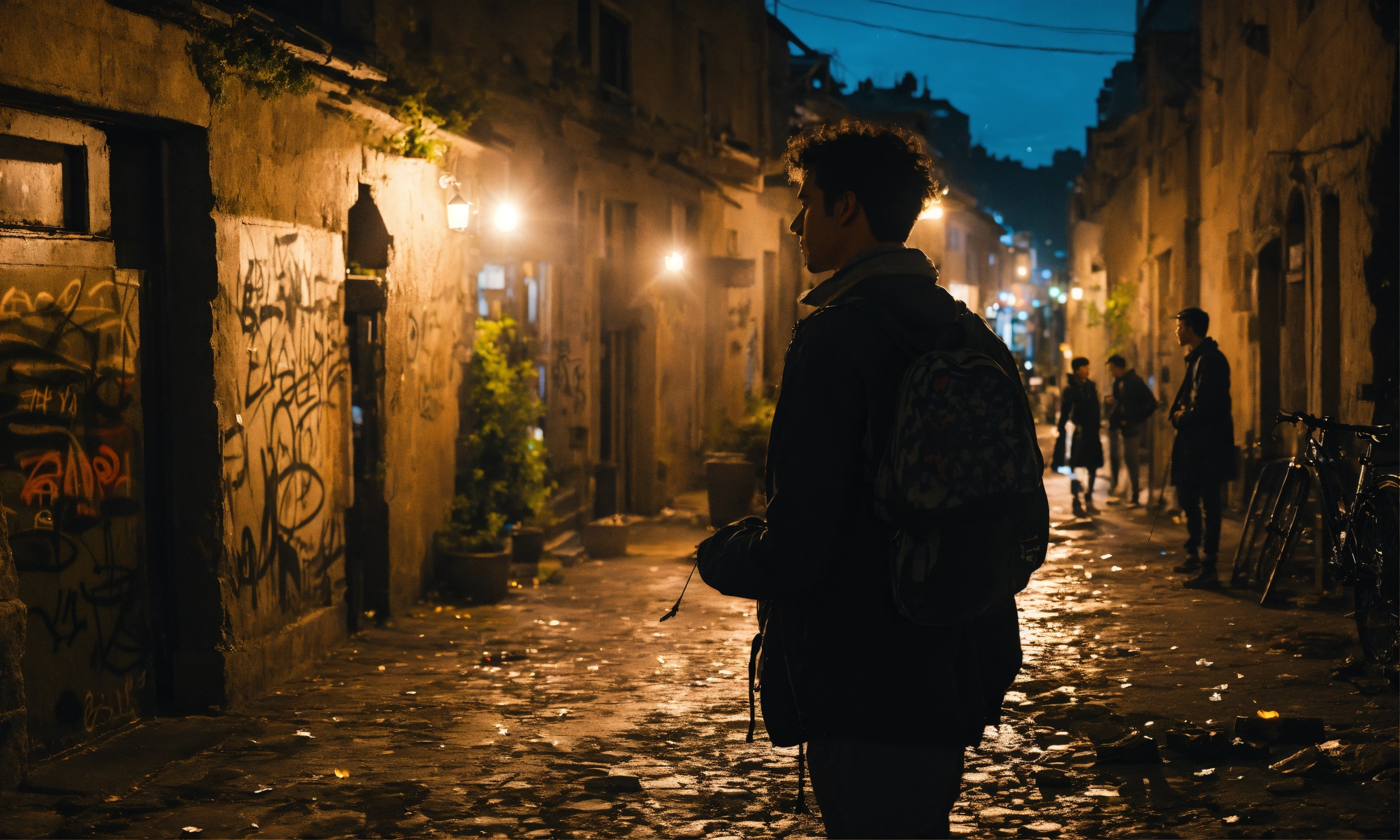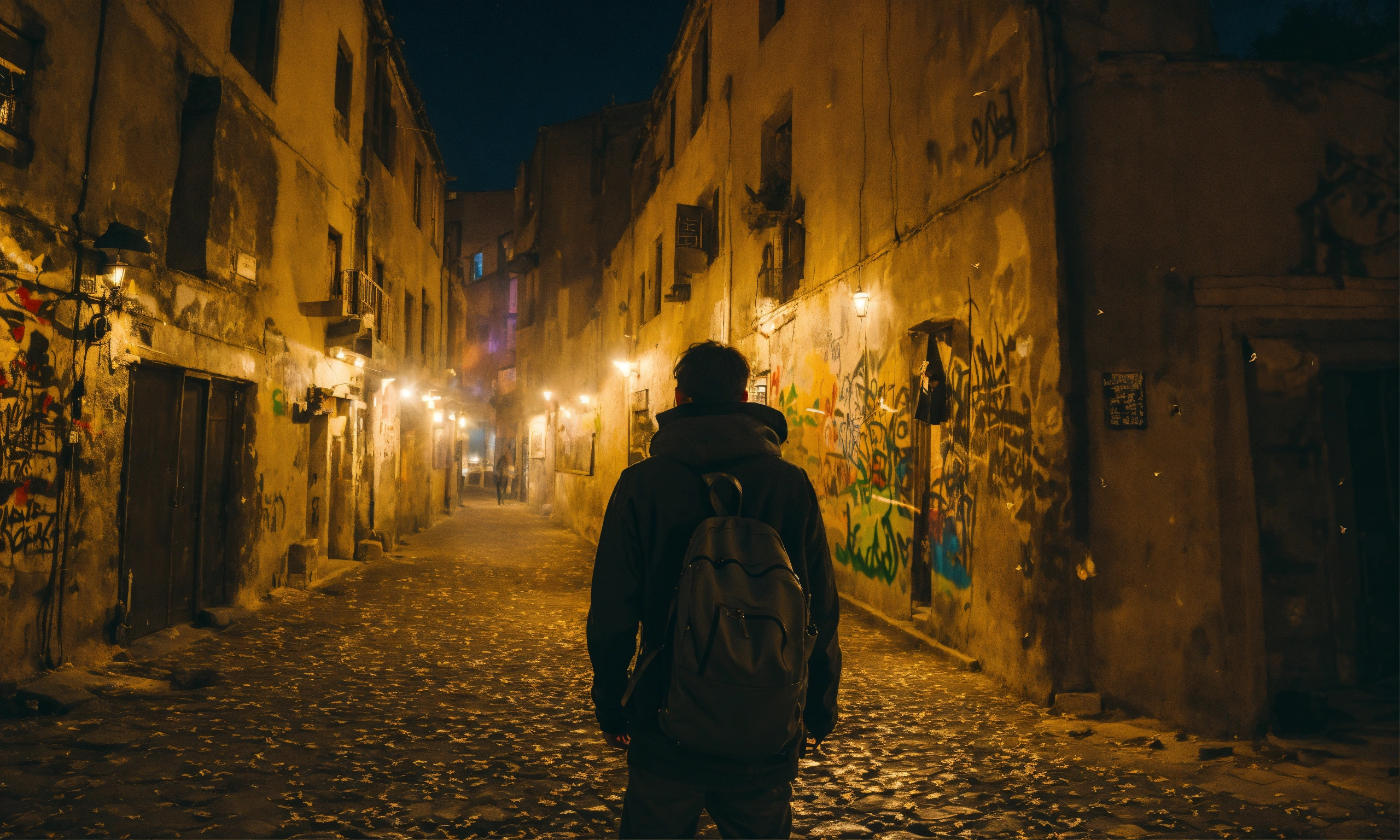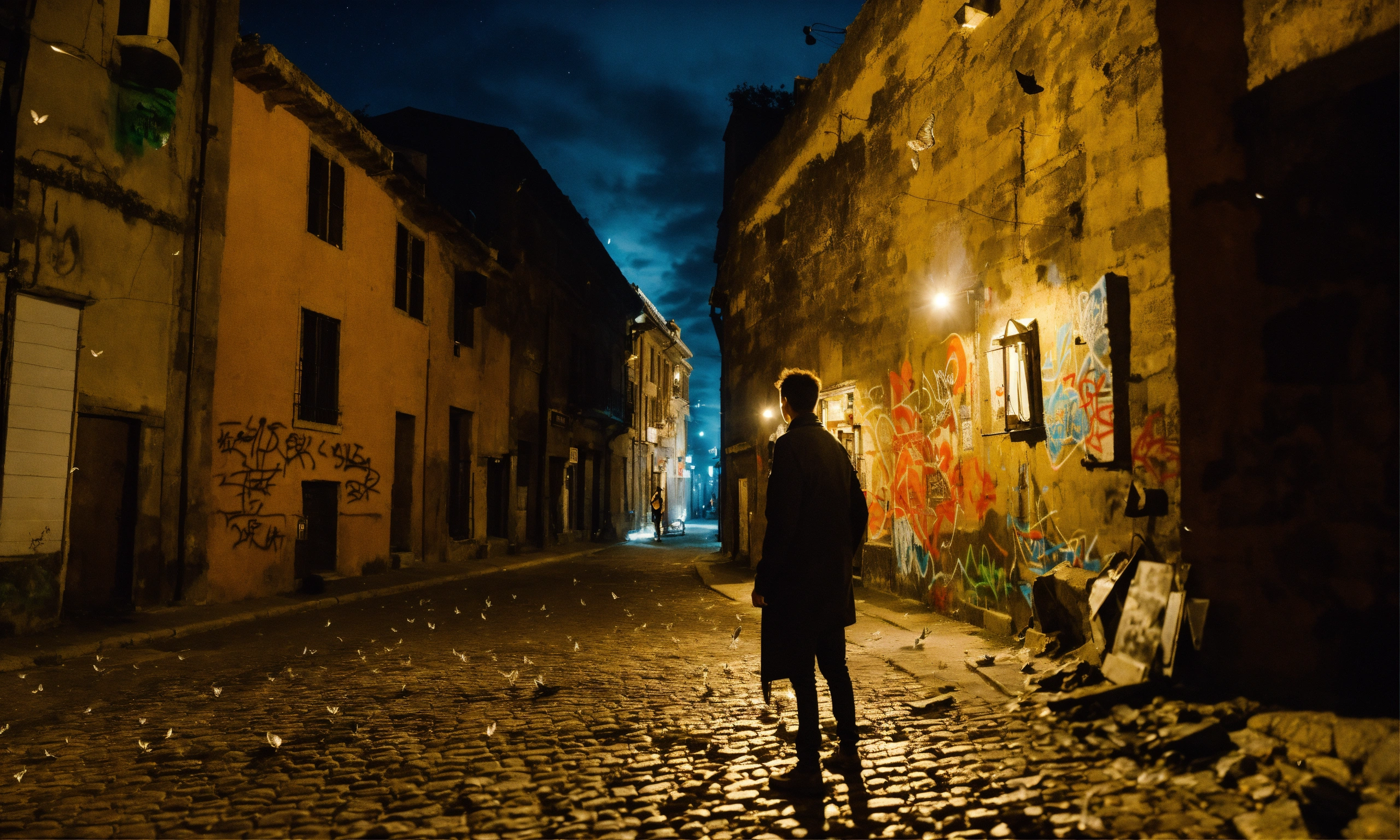 A wide-angle shot of a backlit person at night in a stone city, standing in narrow streets, doing graffiti, surrounded by lot of moths fluttering around him.
