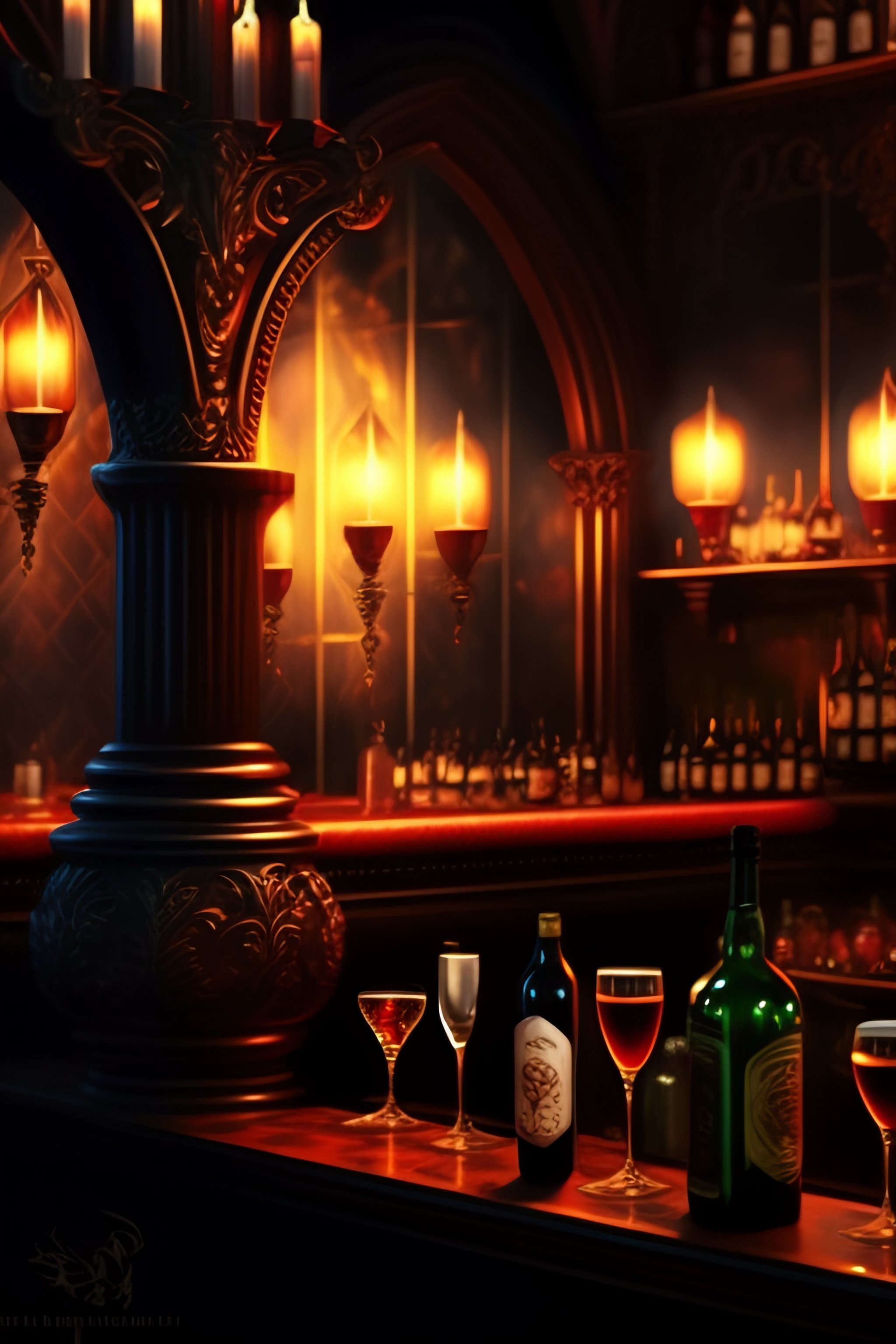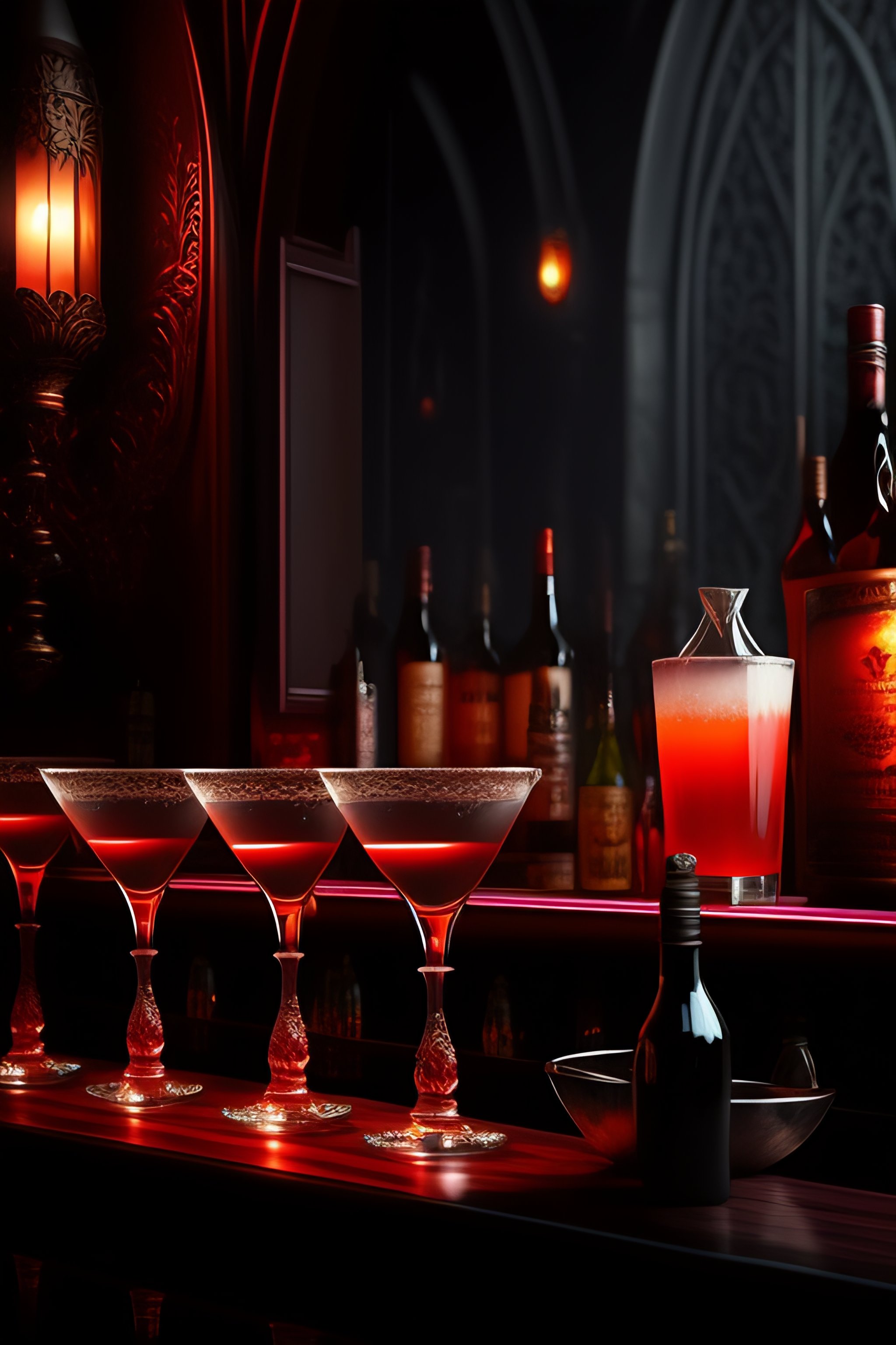 A vampire bar, female vampires, blood-bottles, bloody drinks, cinematic style digital art render with gothic look details in a gothic underworld, (((drinking bloody cocktails))), moody atmospheric lighting, bizarre, dangerous, art by louis royo and giger