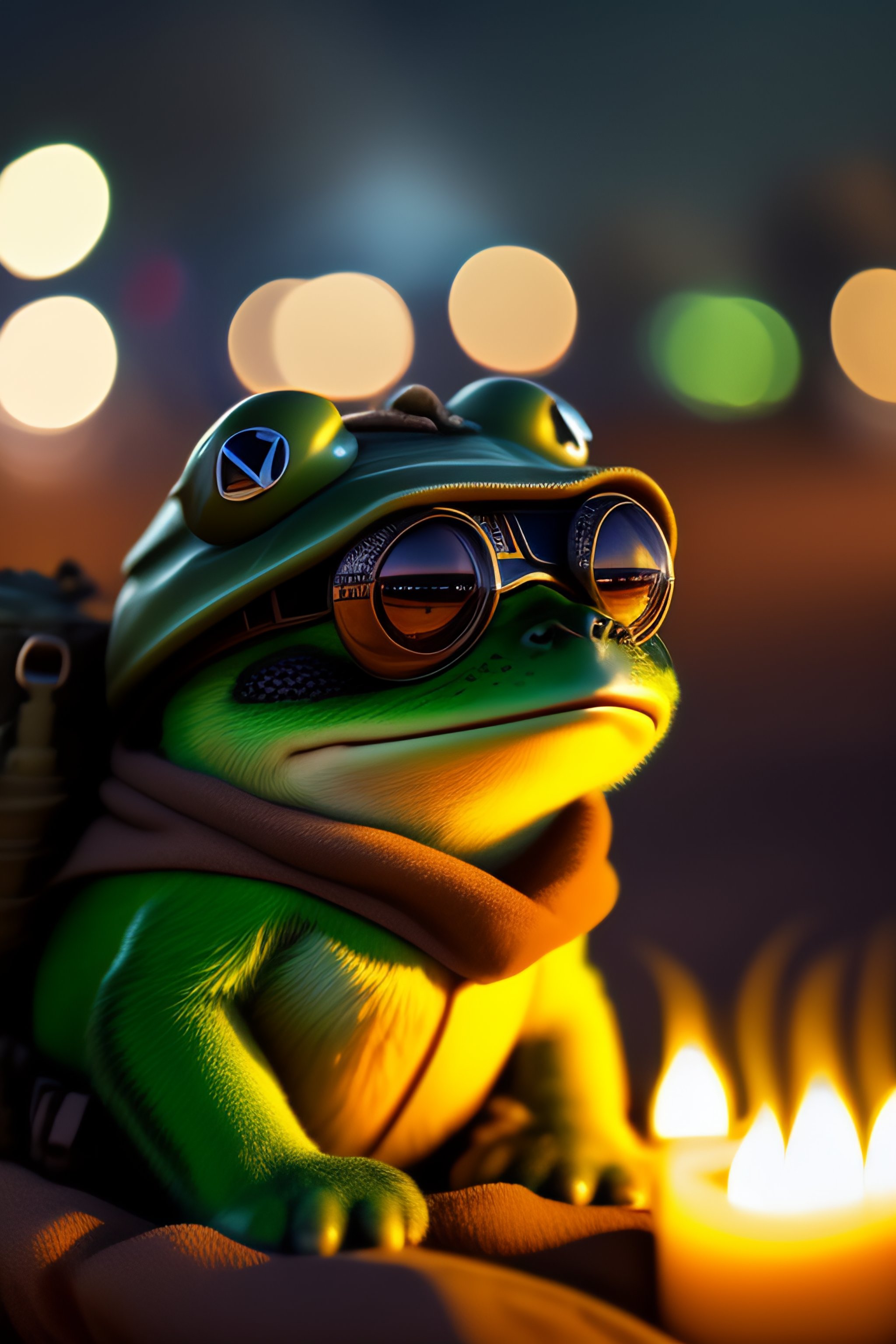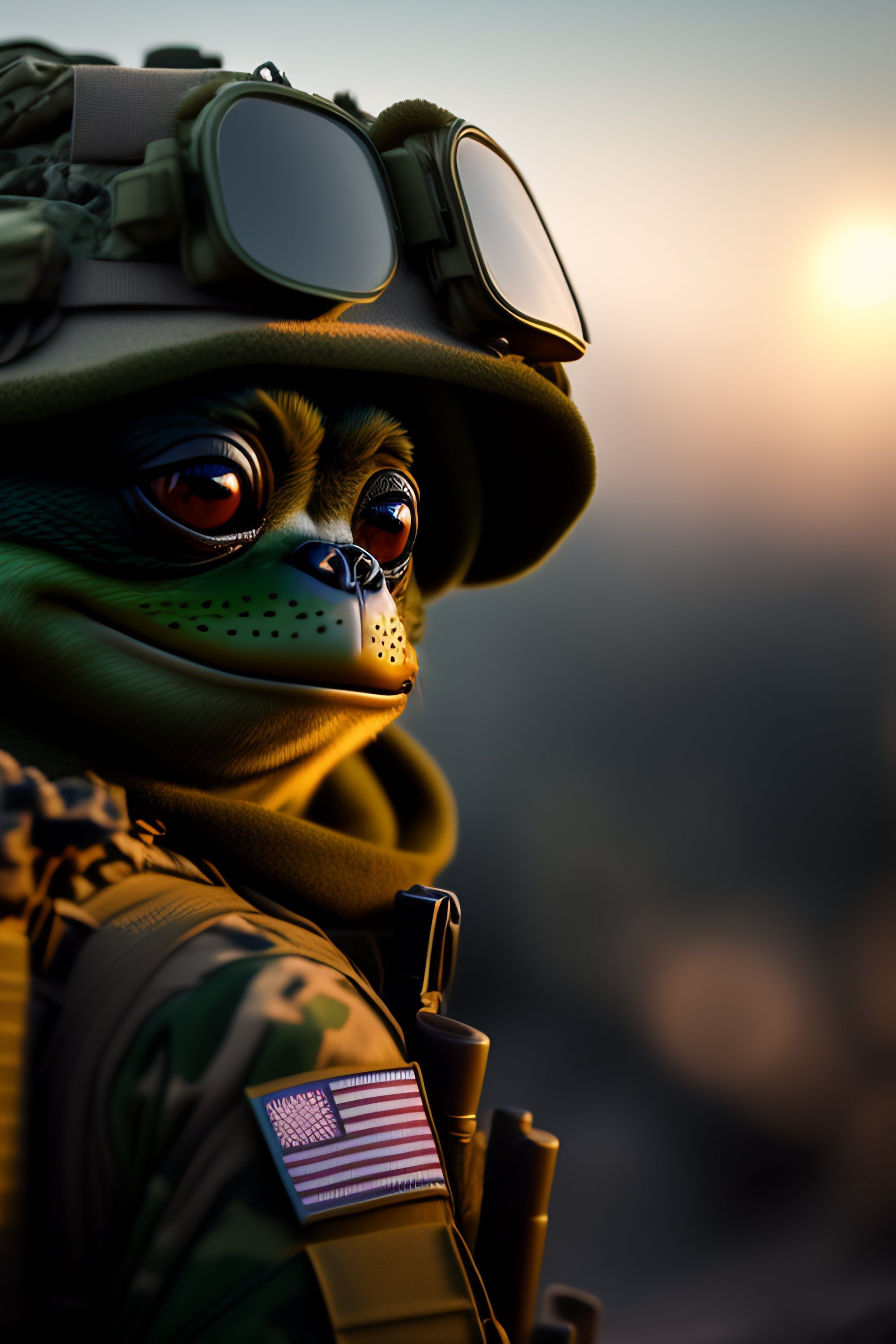 An exhausted pepe the frog at the frontlines in the army at night with his platoon fighting, key lighting, soft lights, foggy, by steve hanks, by lisa yuskavage, by serov valentin, by tarkovsky, 8 k render, detailed, cute cartoon style, very cute adorable face