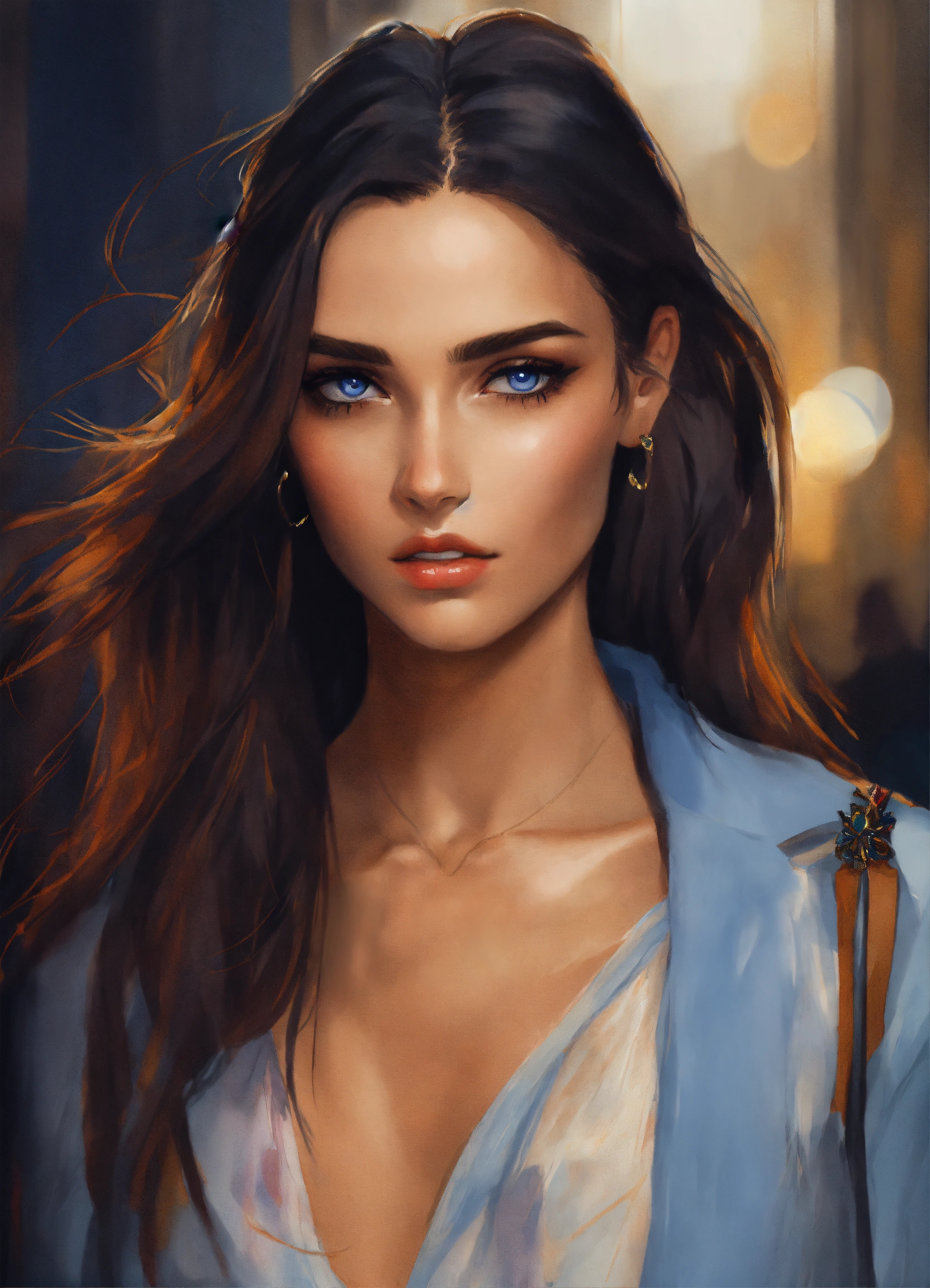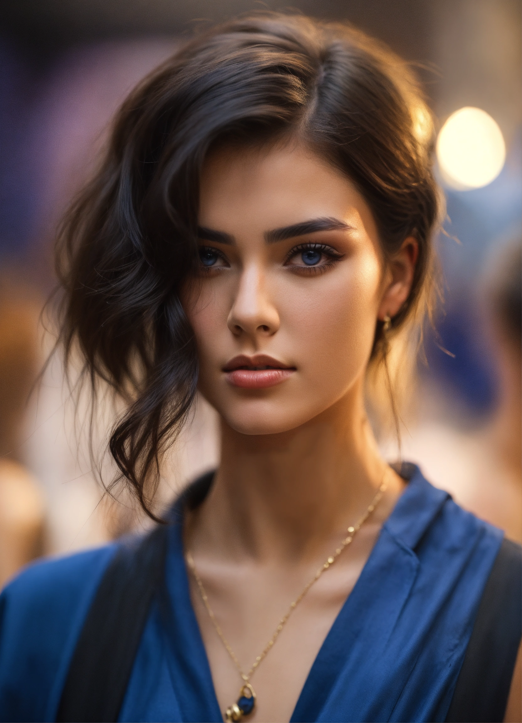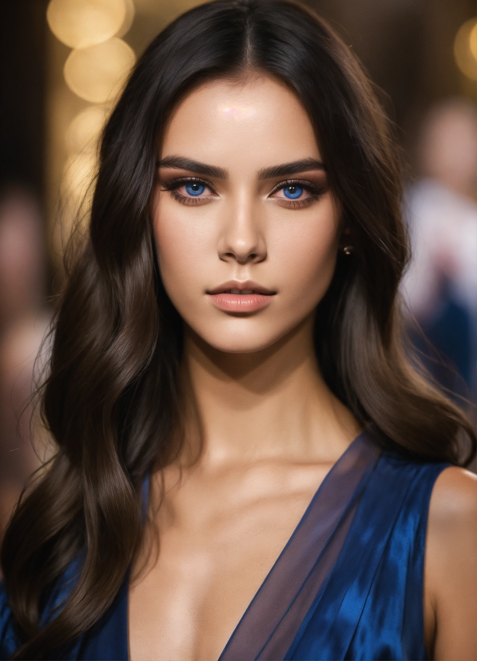 Portrait draw a beautiful girl with dark hair, and indigo eyes, a supermodel walking down the fashion show