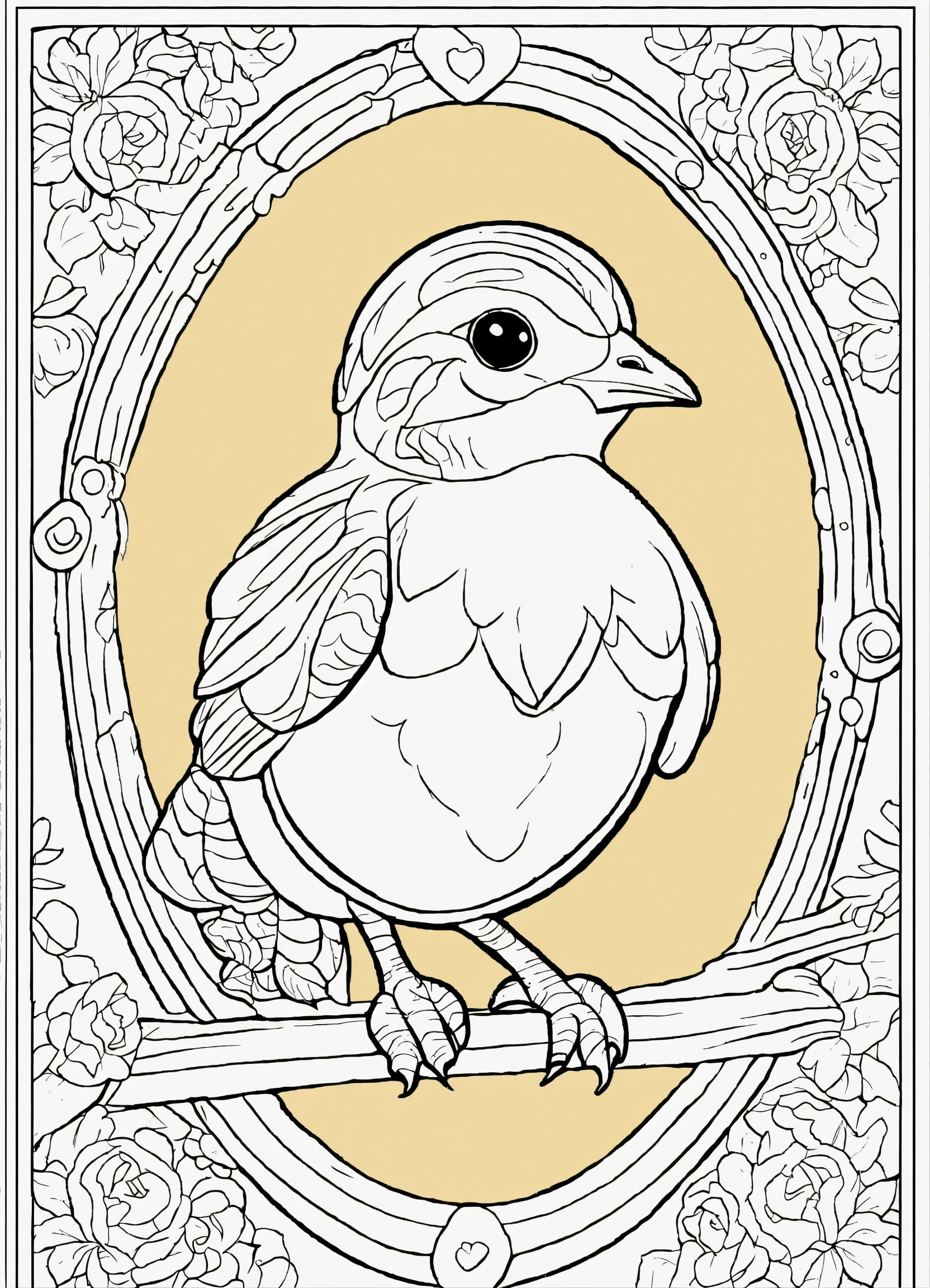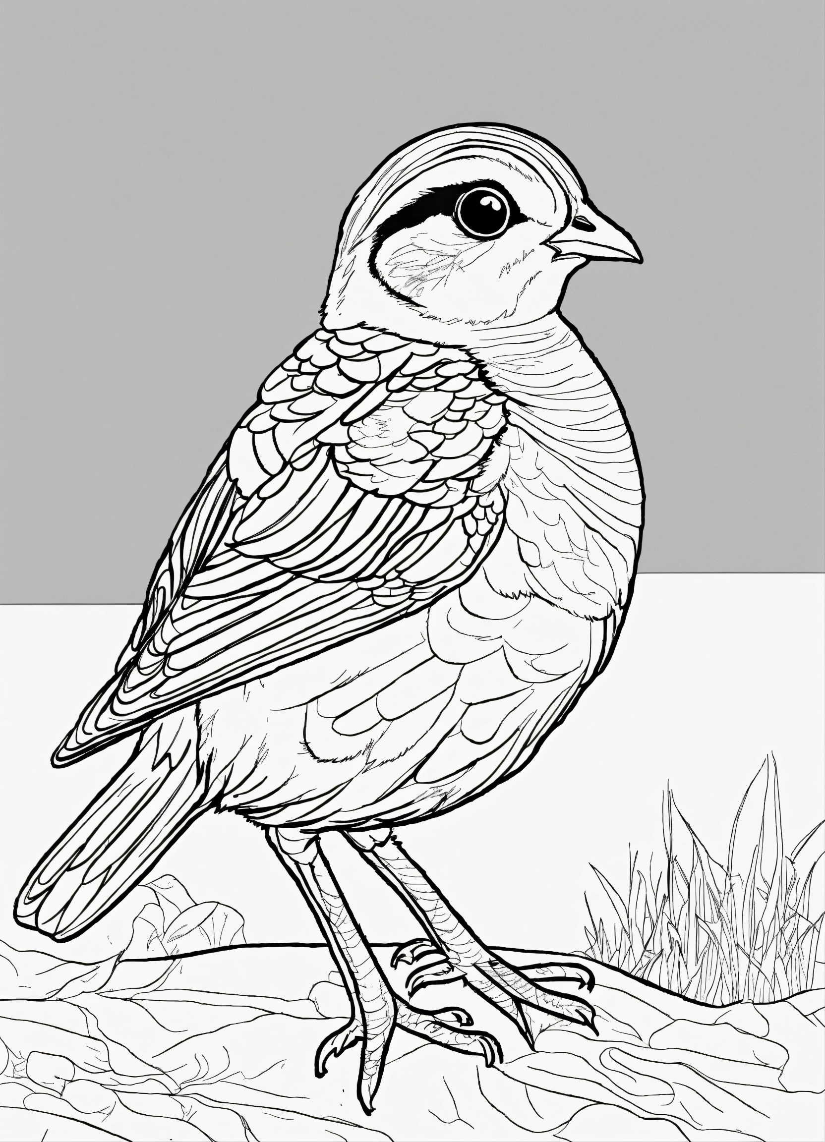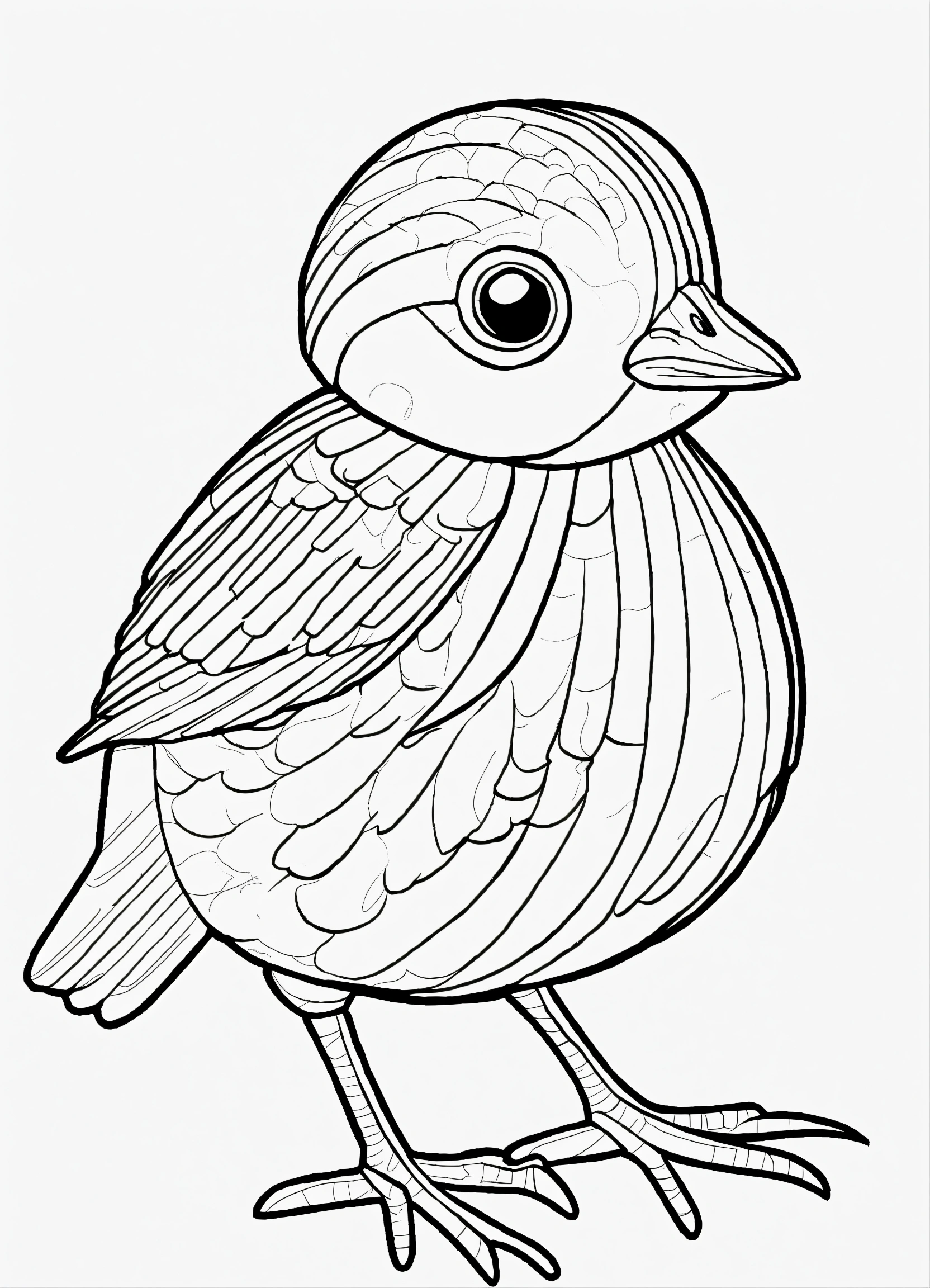 Coloring book for preschoolers, simple lines drawings, no lines inside of the drawing, baby quail, cartoon, full body, outline of the drawing in bold line, symmetrical, white background., no background image.