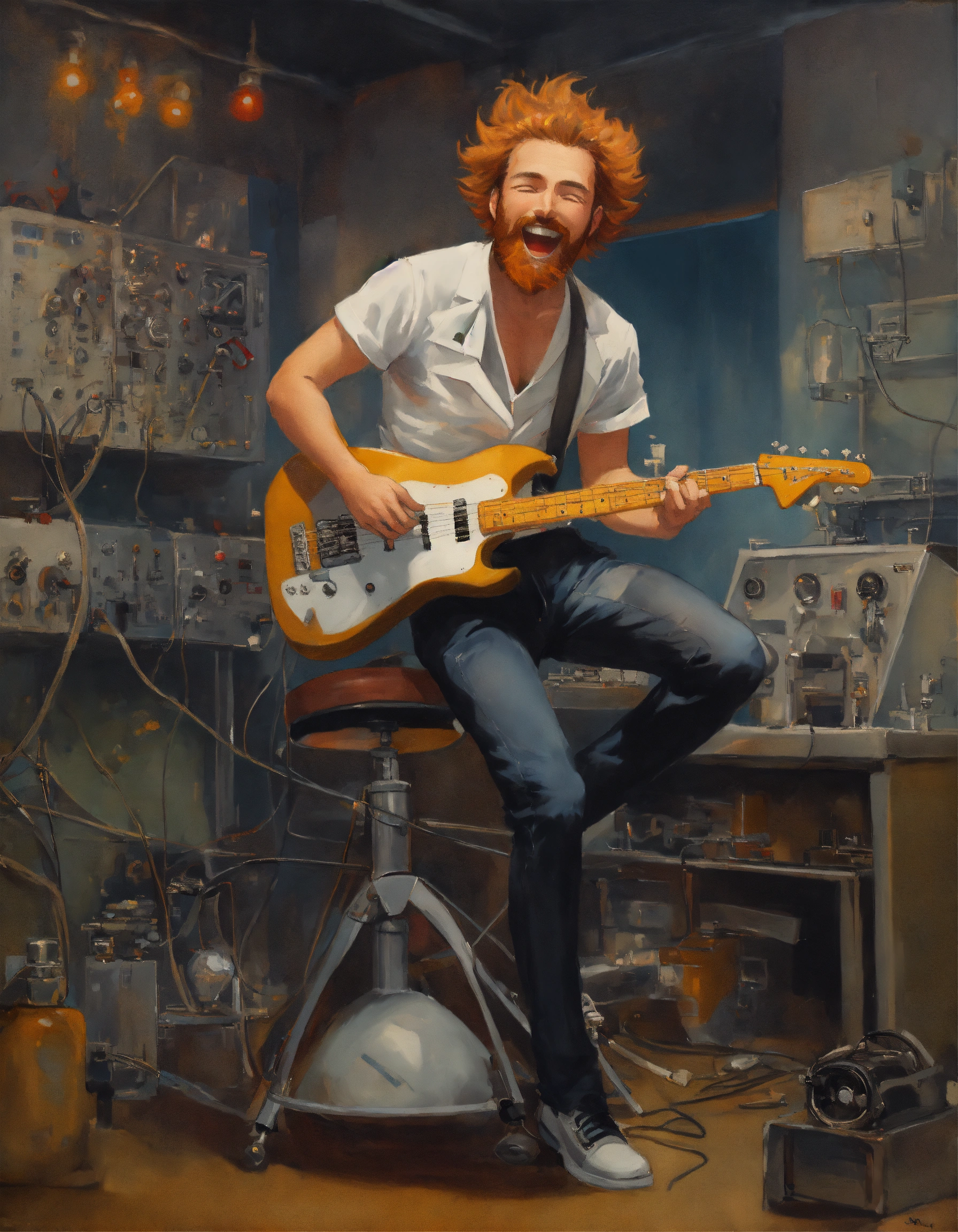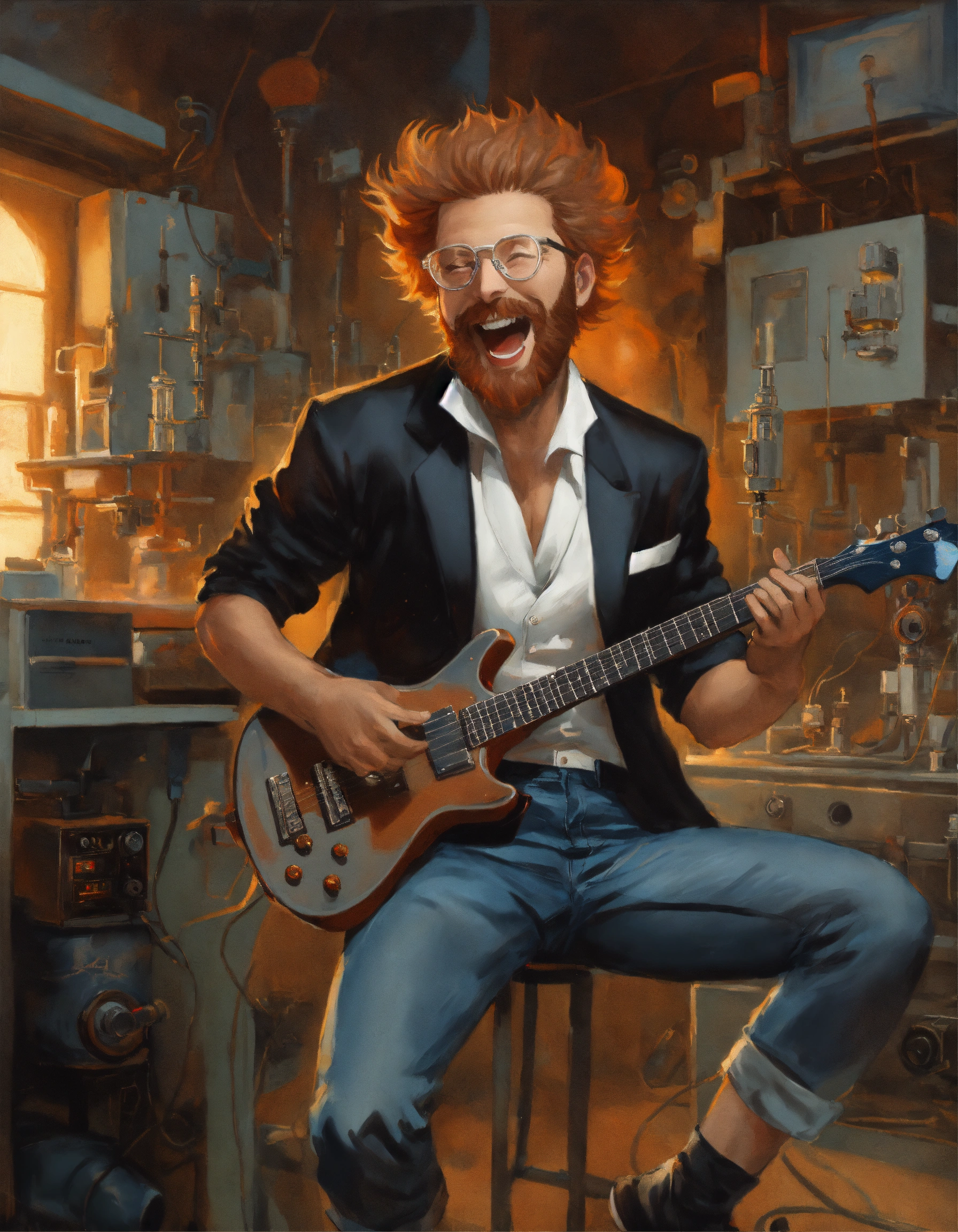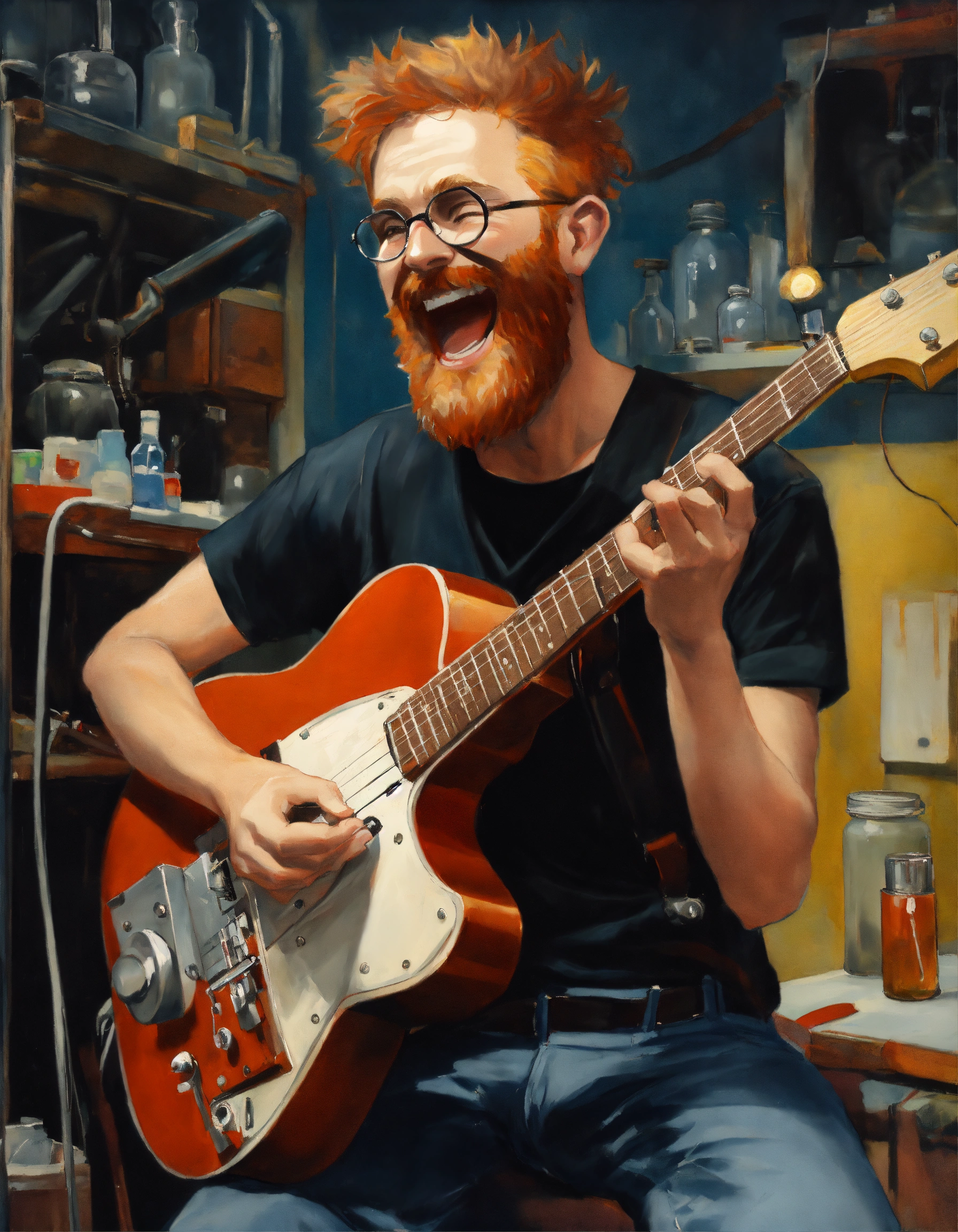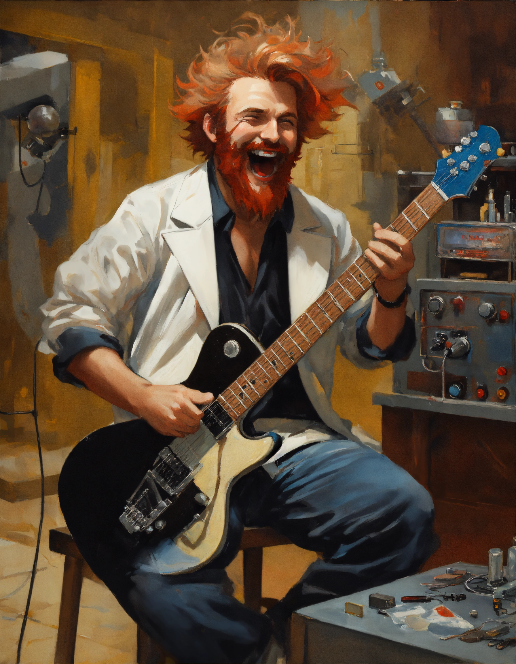 Caucasian mad scientist wearing a black t-shirt with a (little white tuxedo printed on front), with gray high and tight short reddish hair and beard, laughing like crazy. he is also wearing denim shorts. he is not wearing a tuxedo. he is holding an electric guitar, in an old laboratory with music equipment, oil painting