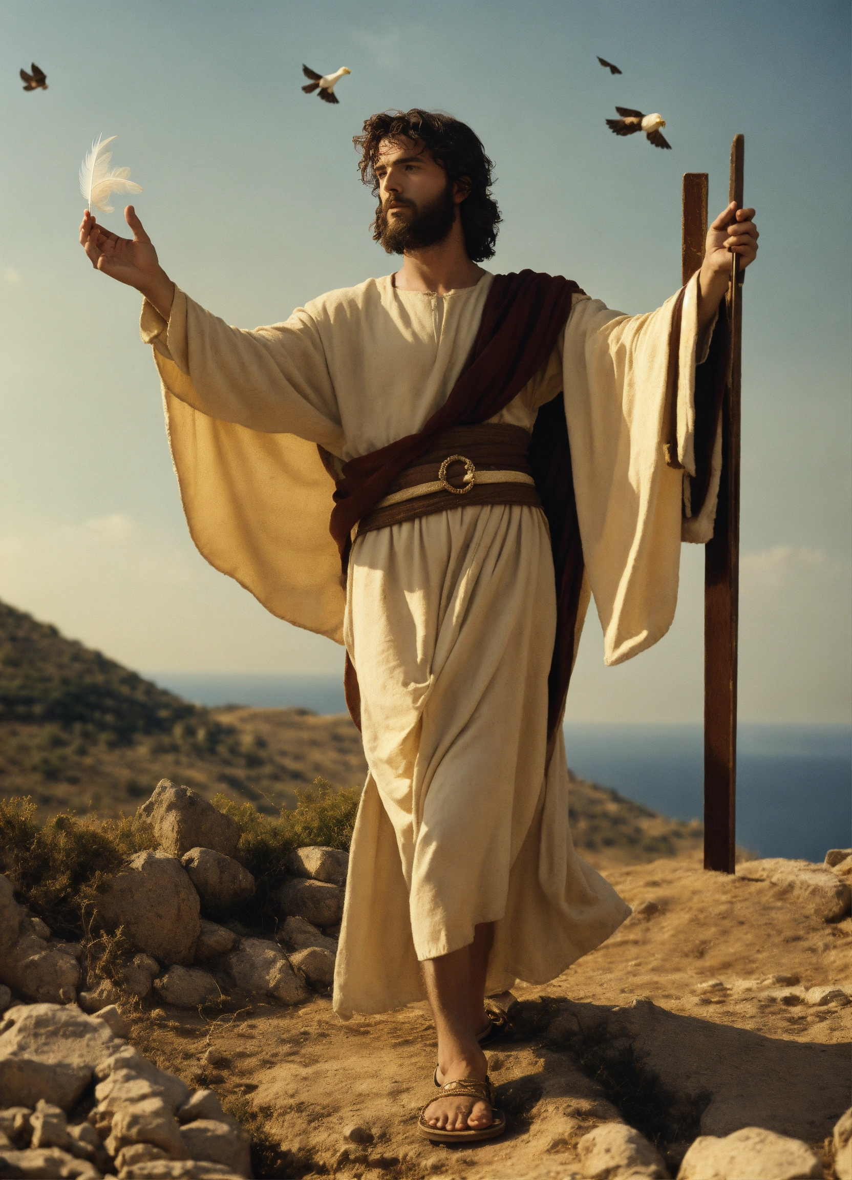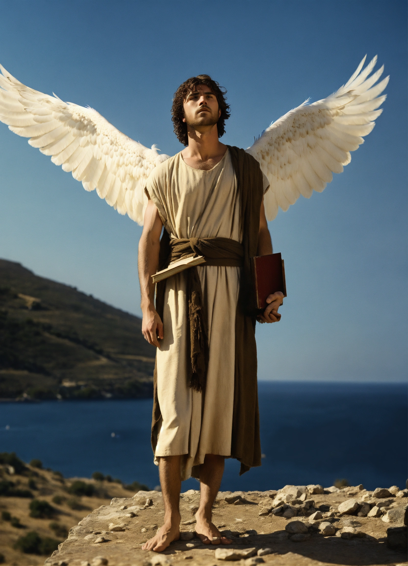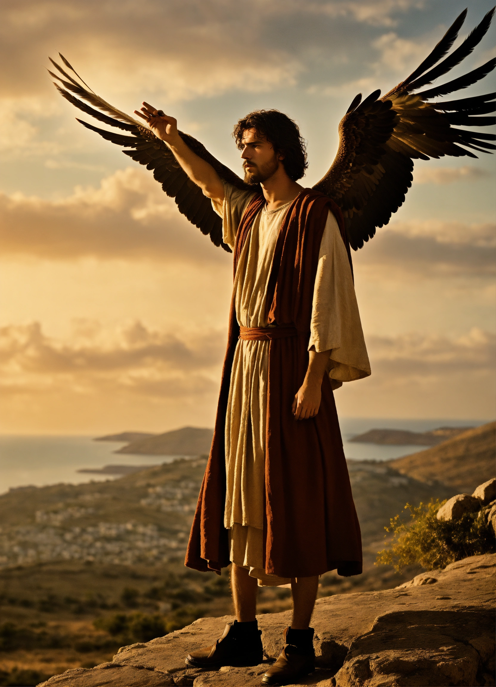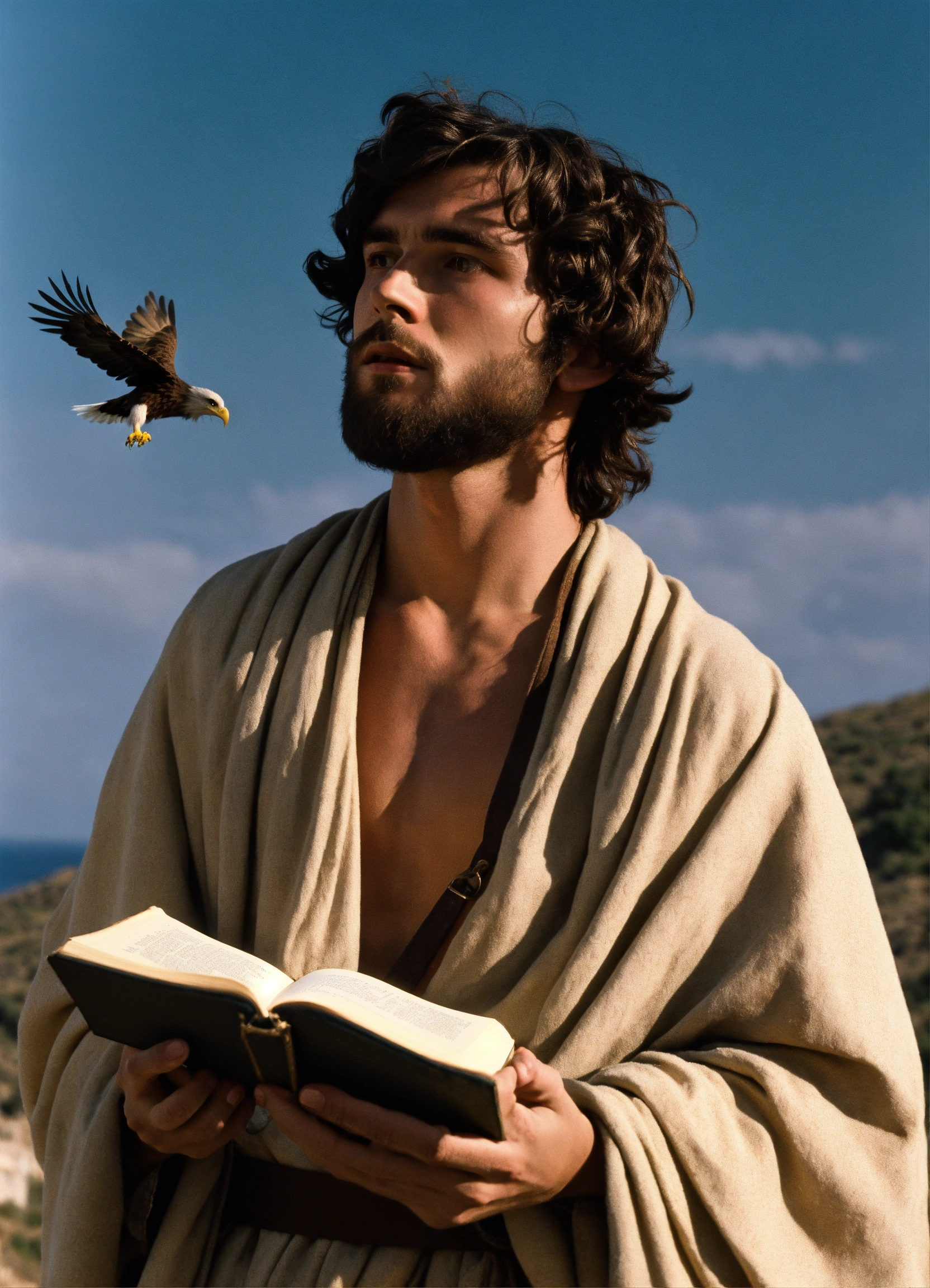 Movie still from the ressurection of jesus of nazareth. full body shot of john the apostle (young, 20 years old, short hair) looking to the sky, a book on his hand, a feather on the other hand, on patmos island. eagle flying over head. dramatic classical greek pose. 8k.