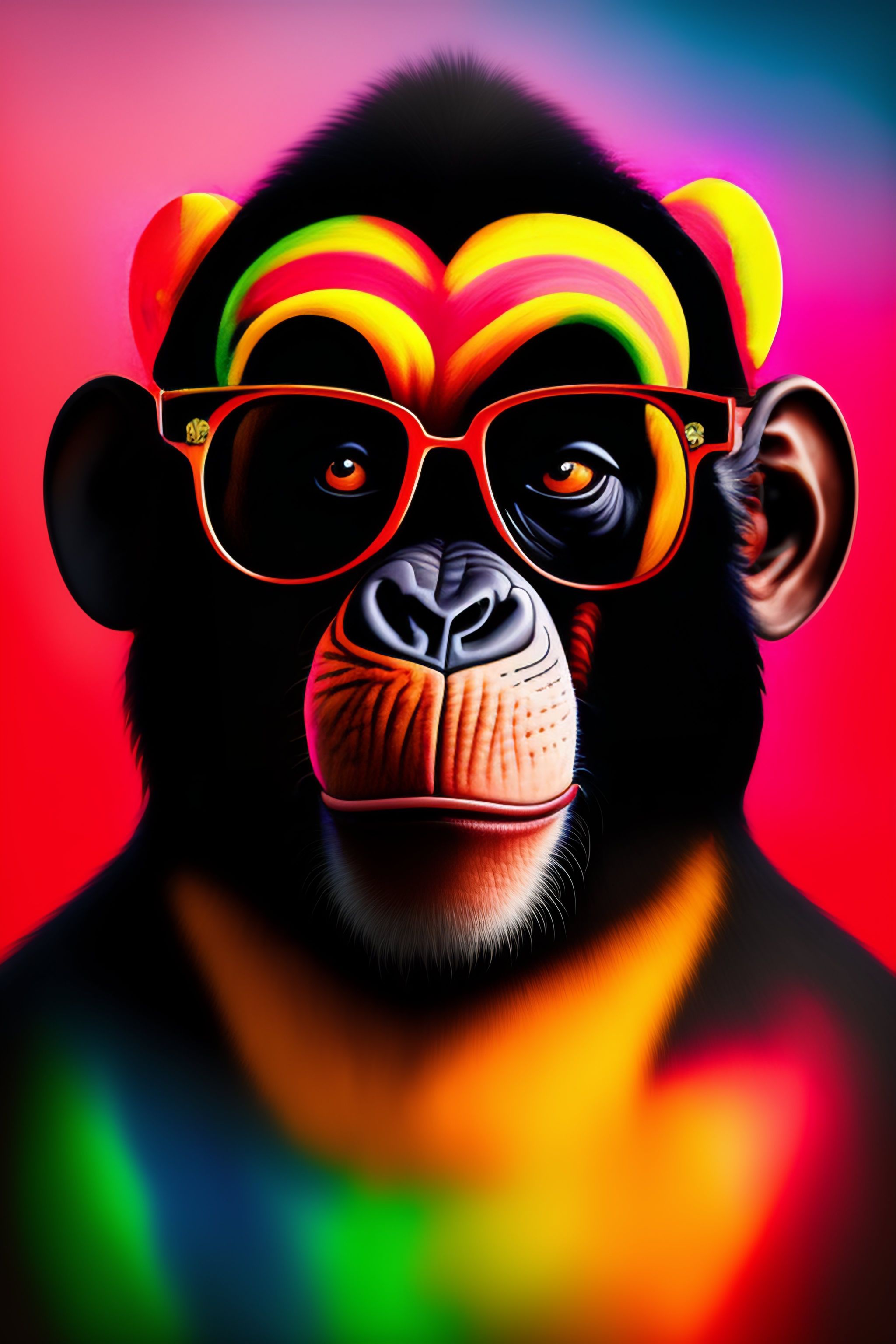 Retrato de un chimpancé payaso disfrazado de lobo con una cresta punky roja y blanca en la cabeza y con gafas de sol negras y la piel de la cara verde