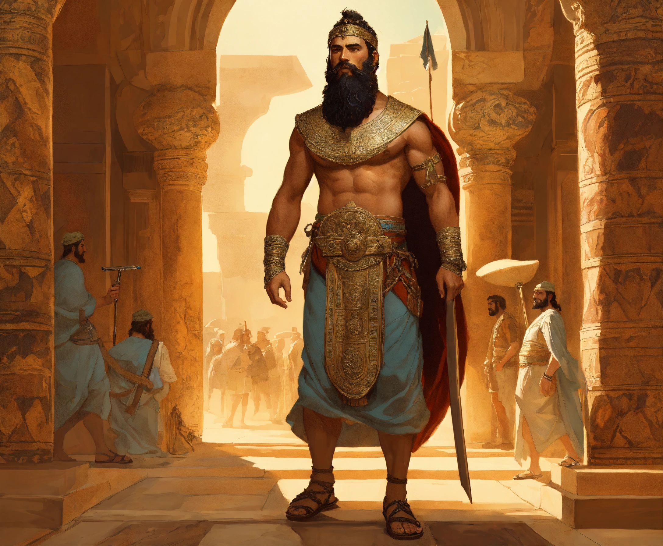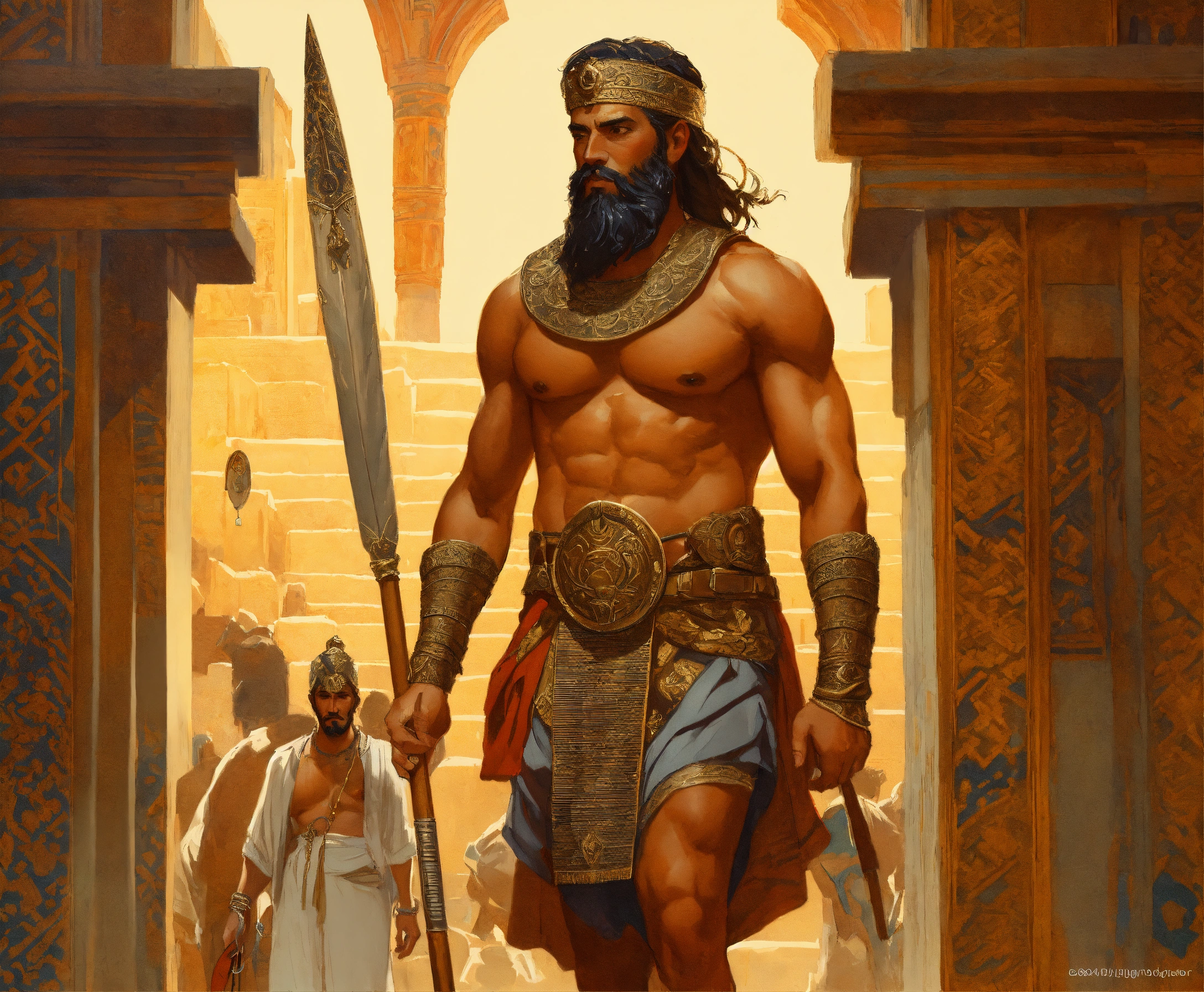 Detailed full body digital painting of an ancient babylonian warrior with tightly braided beard, wearing sandals, highly detailed painting by angus mcbride, gaston bussiere, craig mullins, j.c. leyendecker, 8k, royal painting, dynamic lighting, intricately detailed, hyperdetailed, digital art