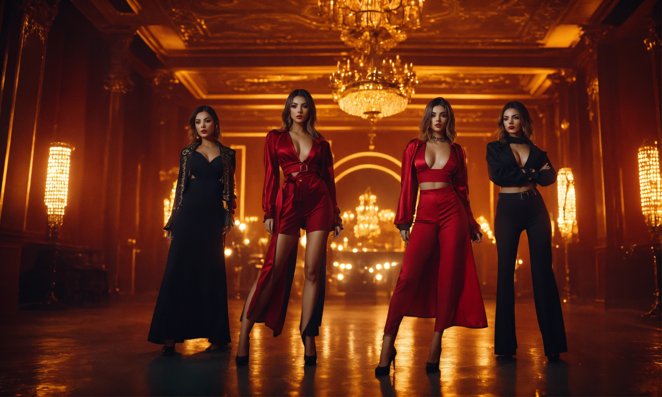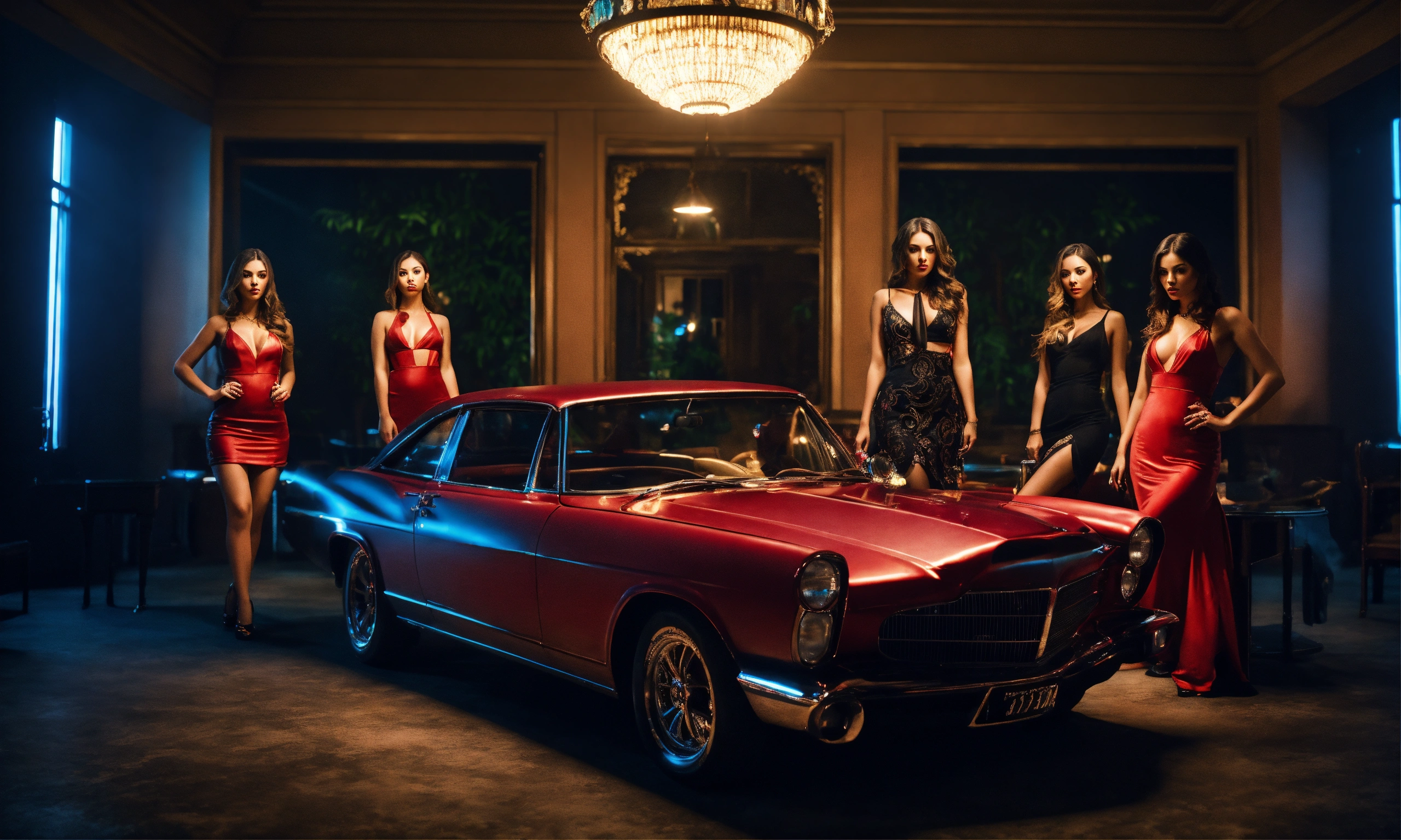 Creative photoshoot of hot girls group with in mafia style, night interior, mood lighting, wide front shot, 8k, luxcorerender, earthly colour, cinematic photography, real humans, real images, matte finish, shot on arri anamorphic, extreme wide shot, smooth, sharp focus, ornate, highly dynamic, particulate, hyperreal, wide shot