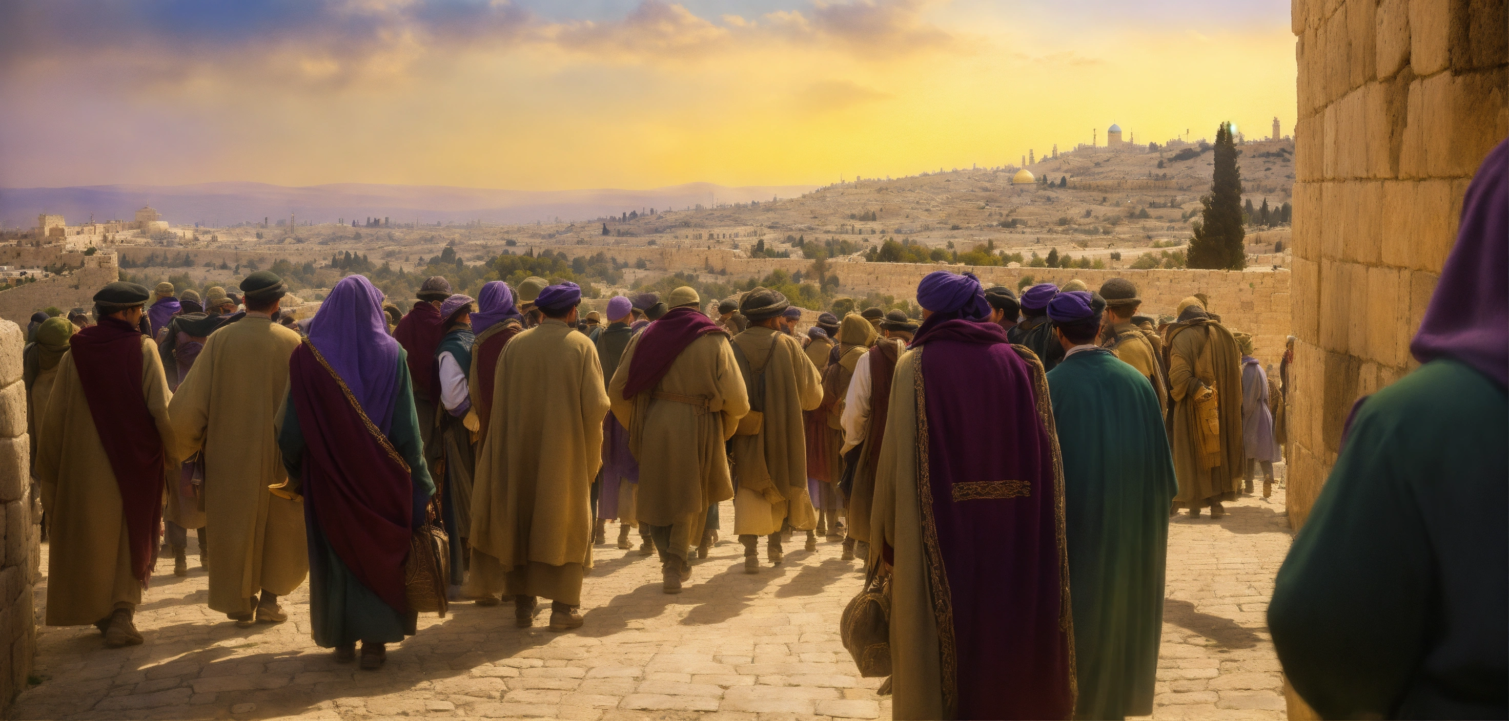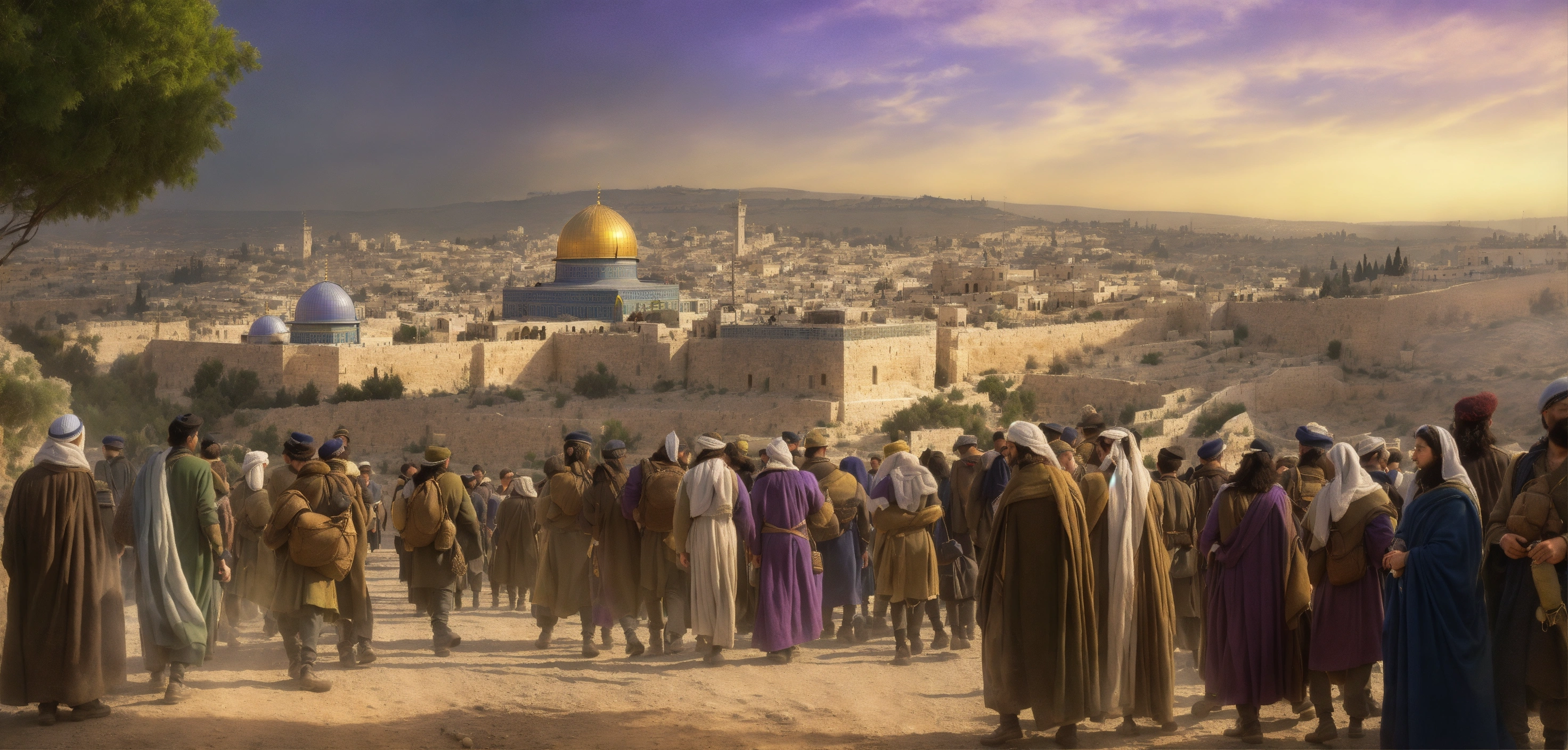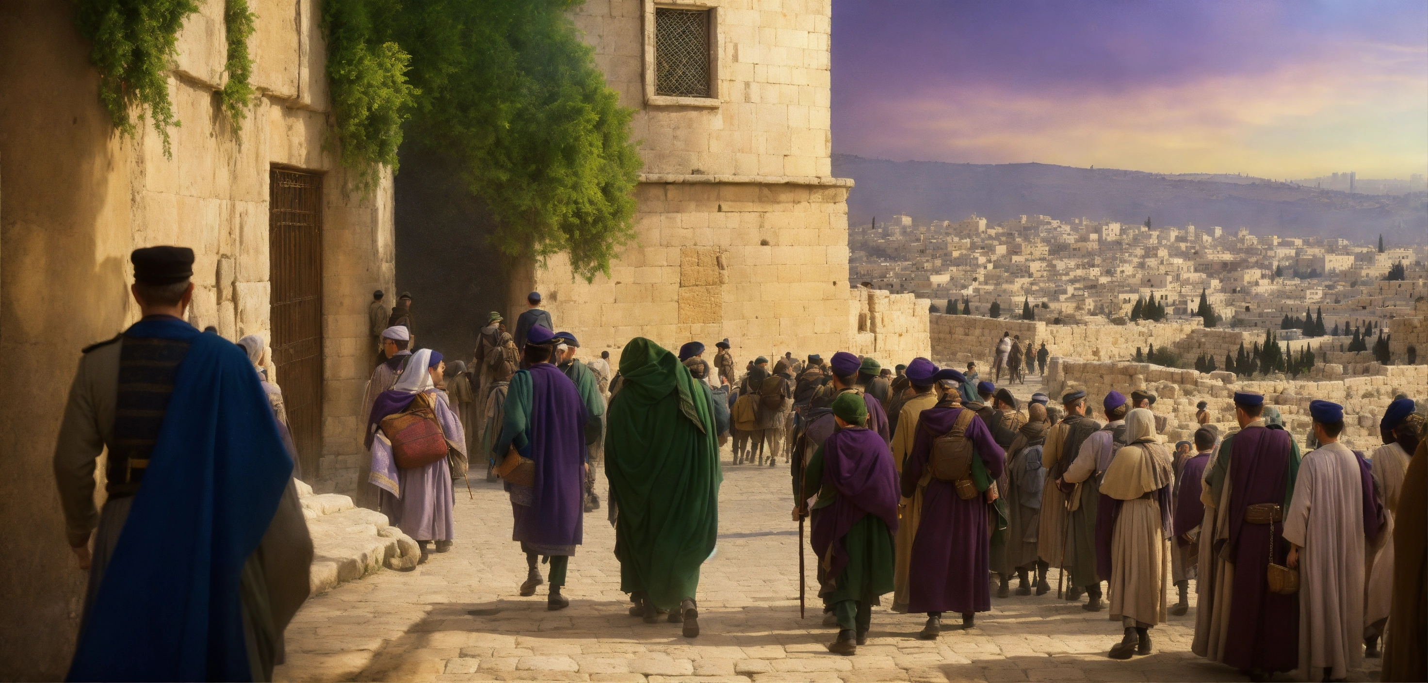 Jews leaving jerusalem with the city in the background and soldiers around the city in 70 a.d. 16k resolution; blues, purples, dark greens, whites, yellows, brilliant art. photo realistic. sharp edges. only masculin men and feminine woman. children, all ages