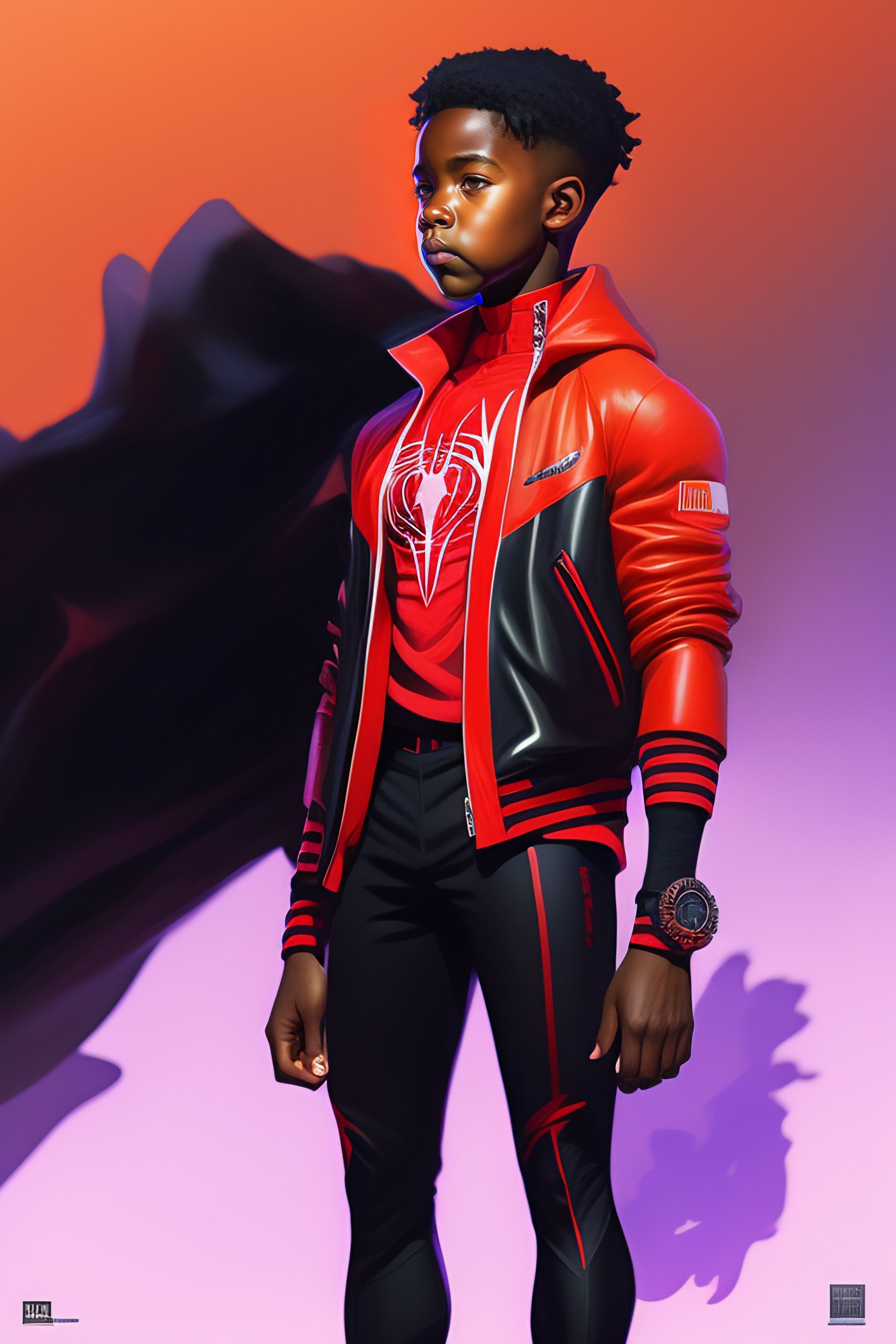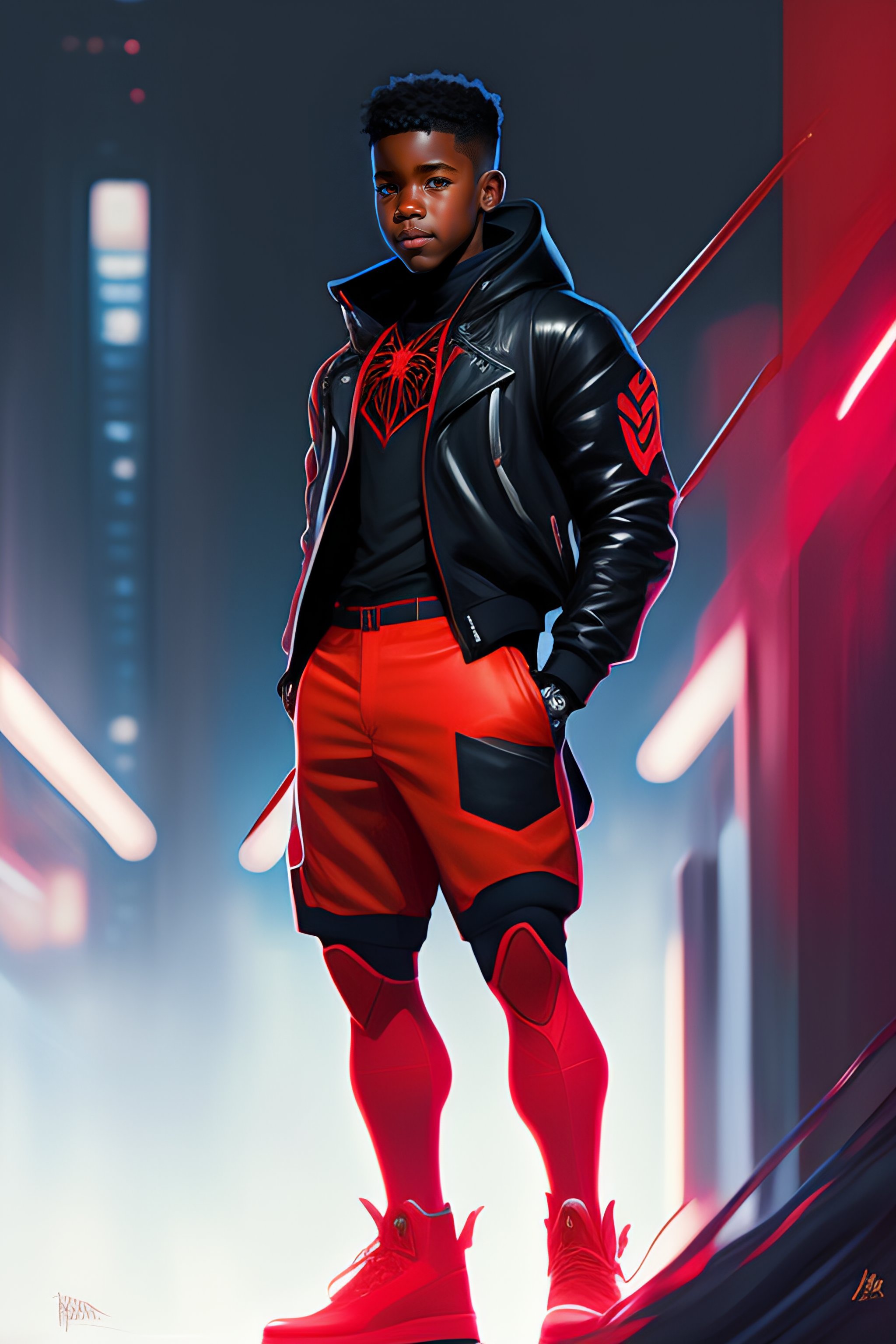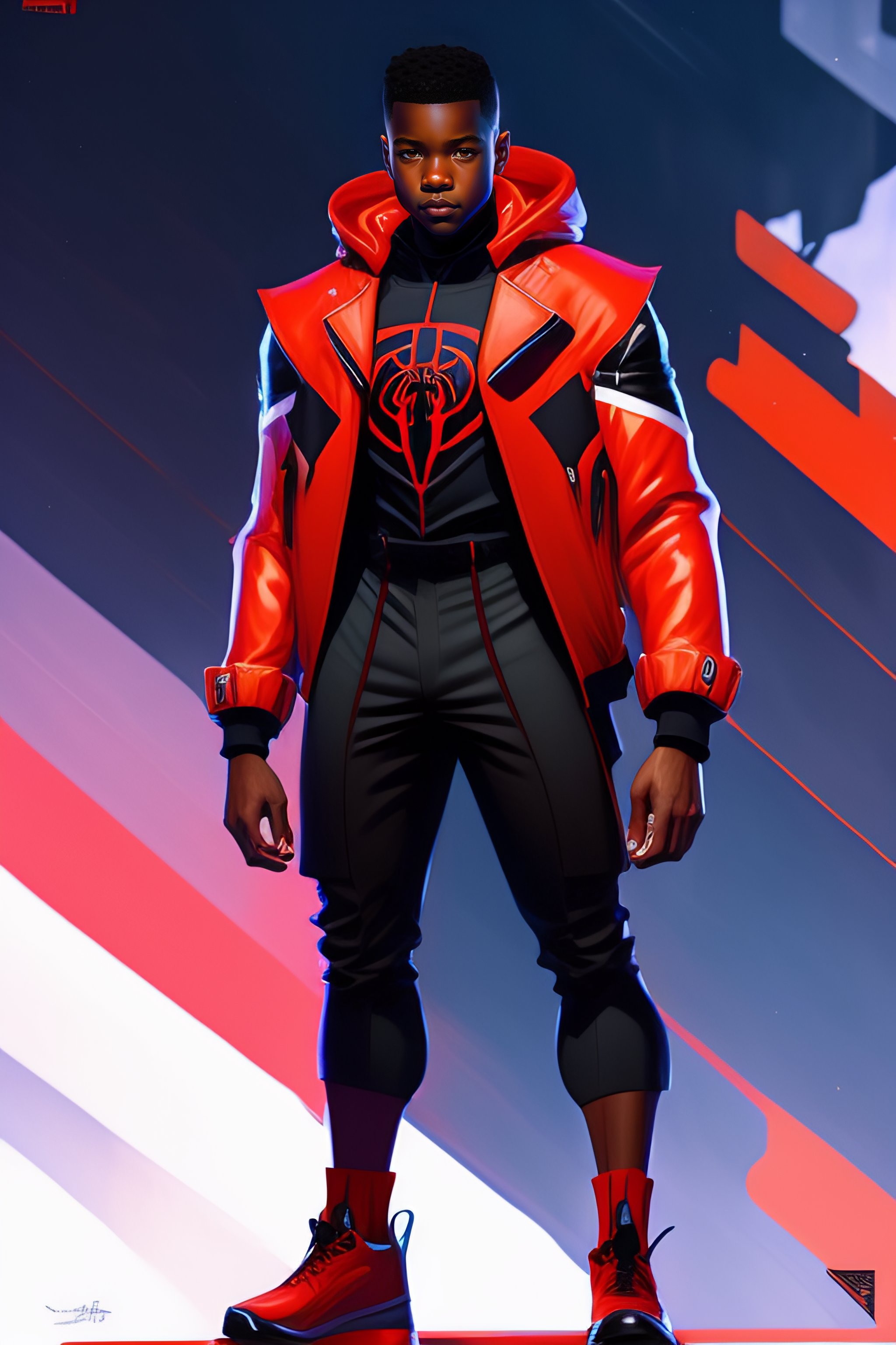 Full body highly detailed portrait of miles morales from spiderman into the spider verse(2018), by greg rutkowski, by greg tocchini, by james gilleard, by joe fenton