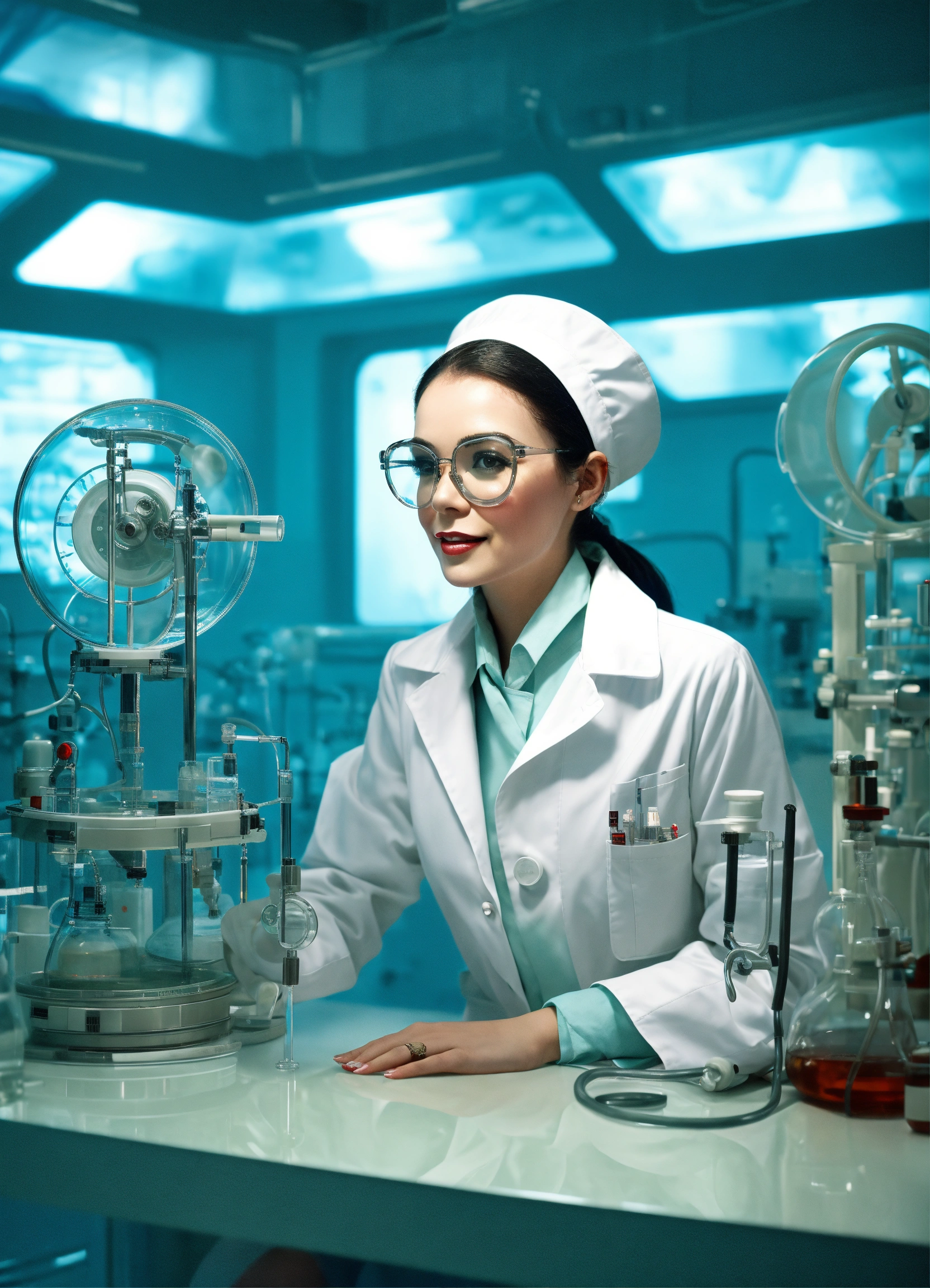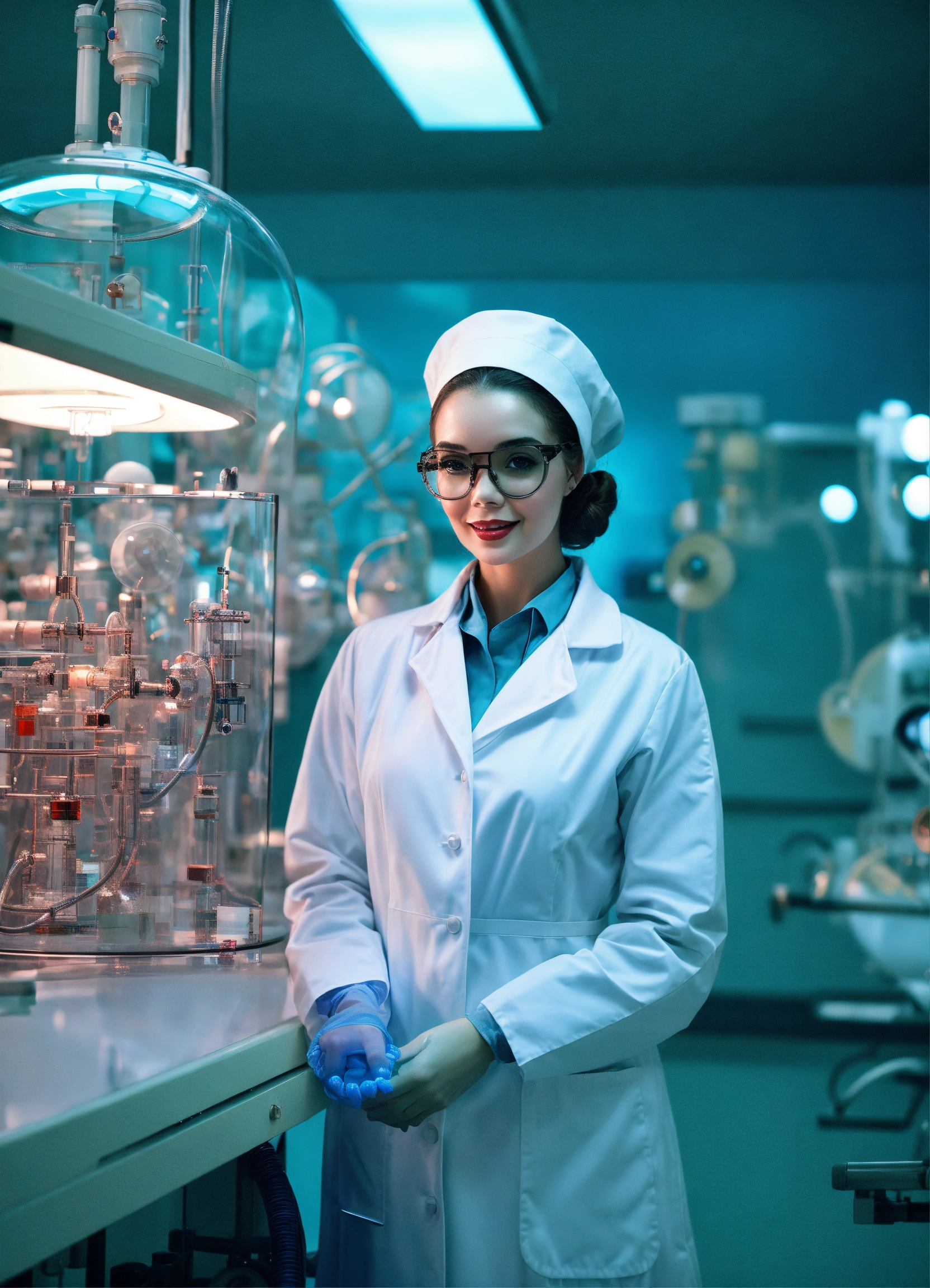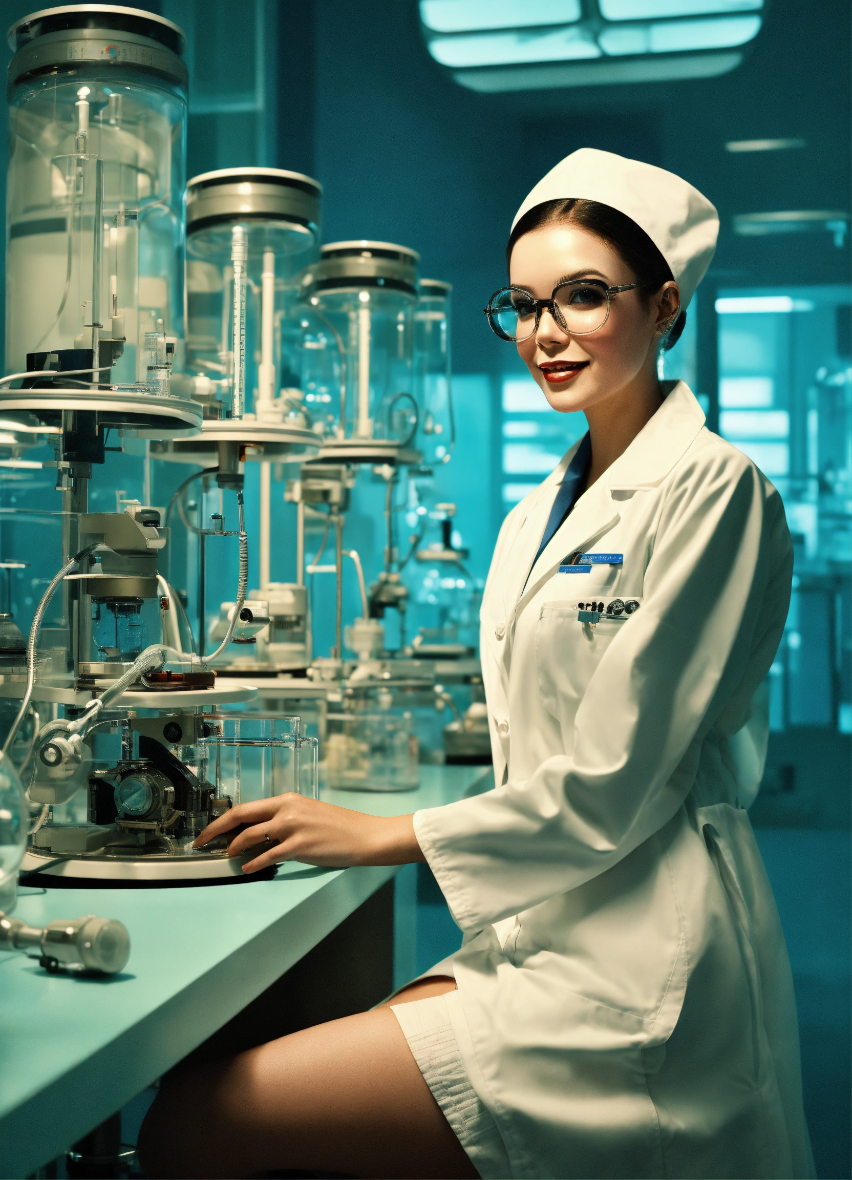 Photography in a futuristic sci fi laboratory, 60's gorgeous night nurse woman in short white coat, wearing large transparent glasses, handling a large stethoscope and smiling at the result, in an hospital room full of glass stills and machines, preparing an experience, 80 degree view, art by sergio lopez, natalie shau, james jean and salvador dali