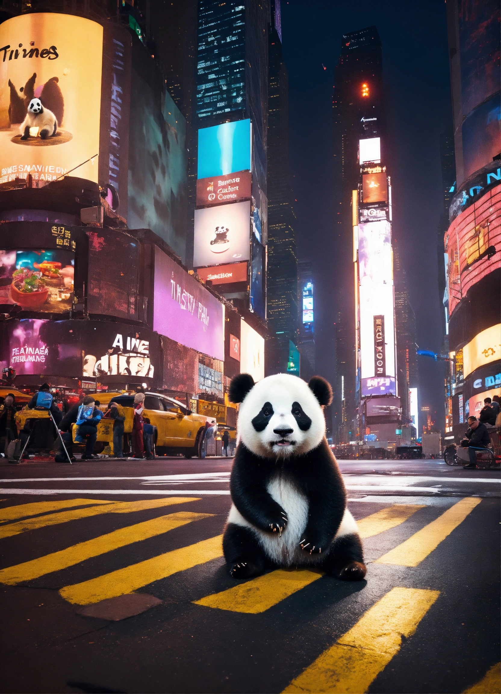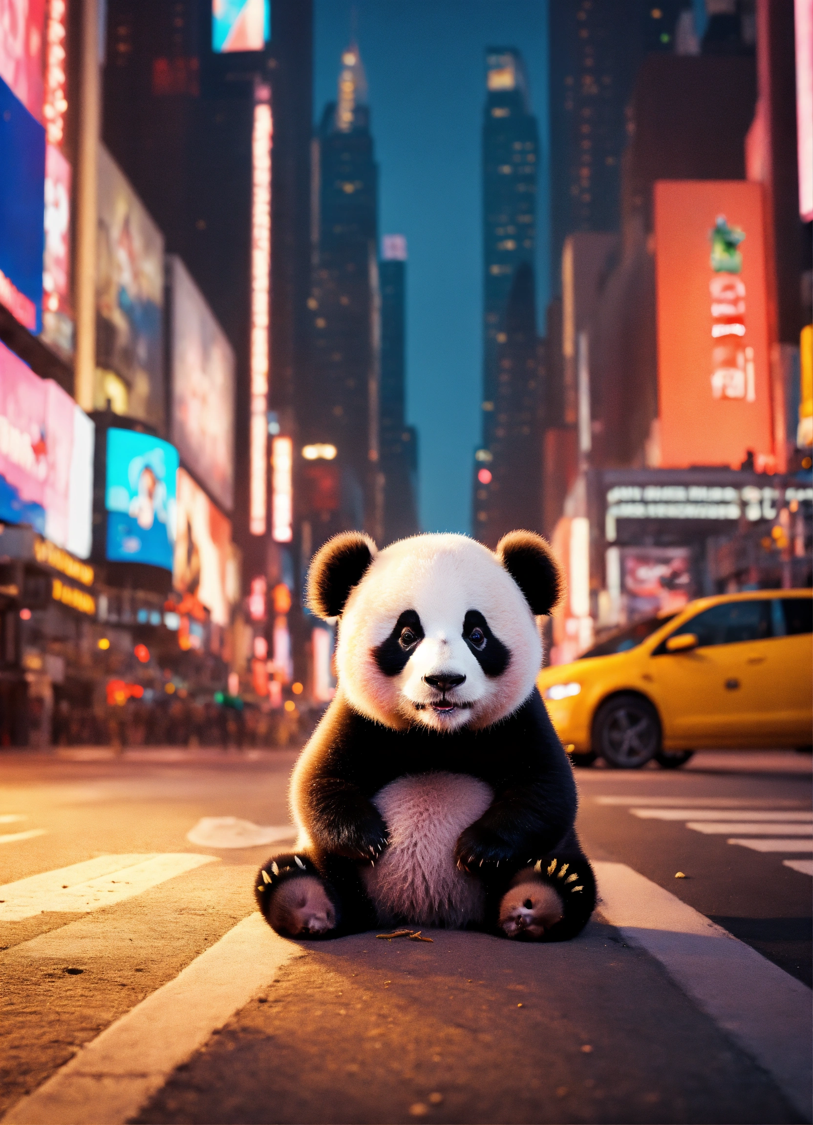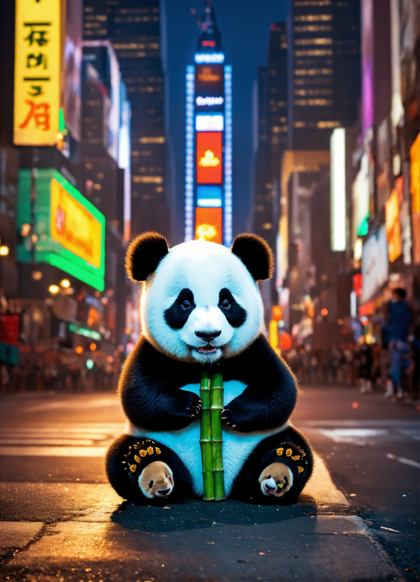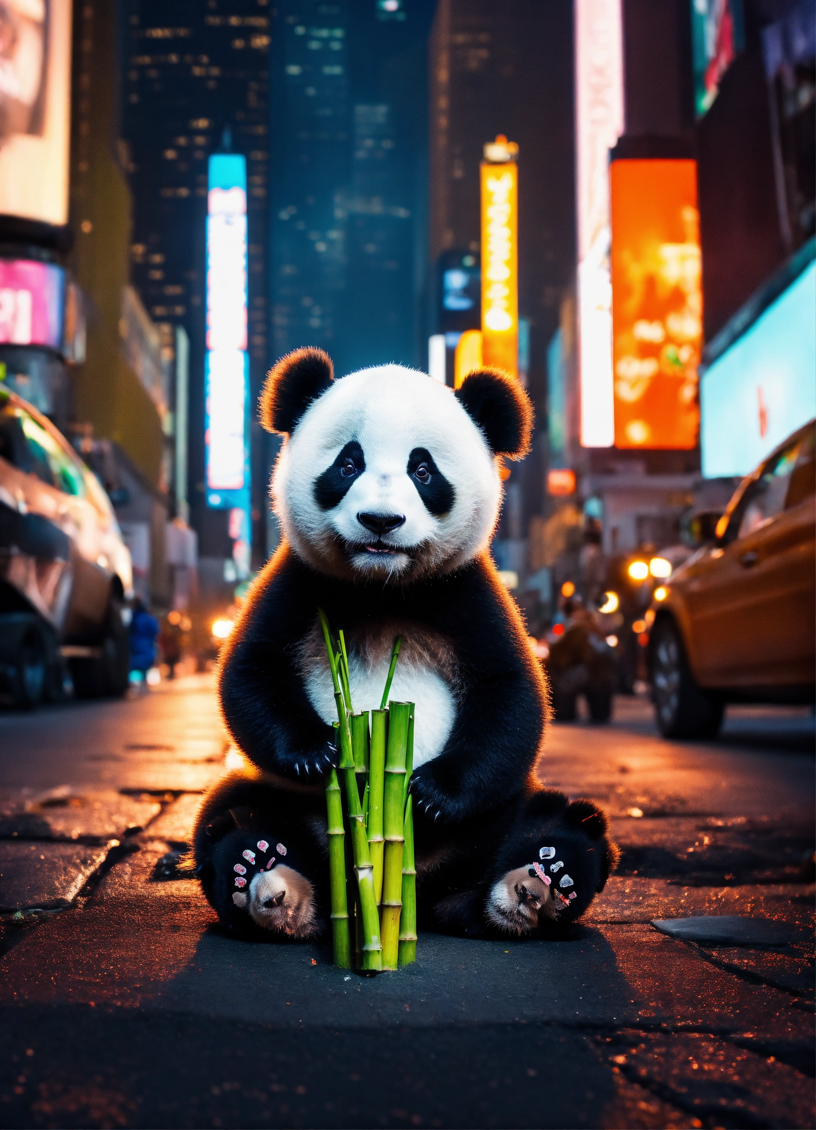 A baby panda sitting on the street under the lights in times square at night eating bamboo, 8k image, surreal