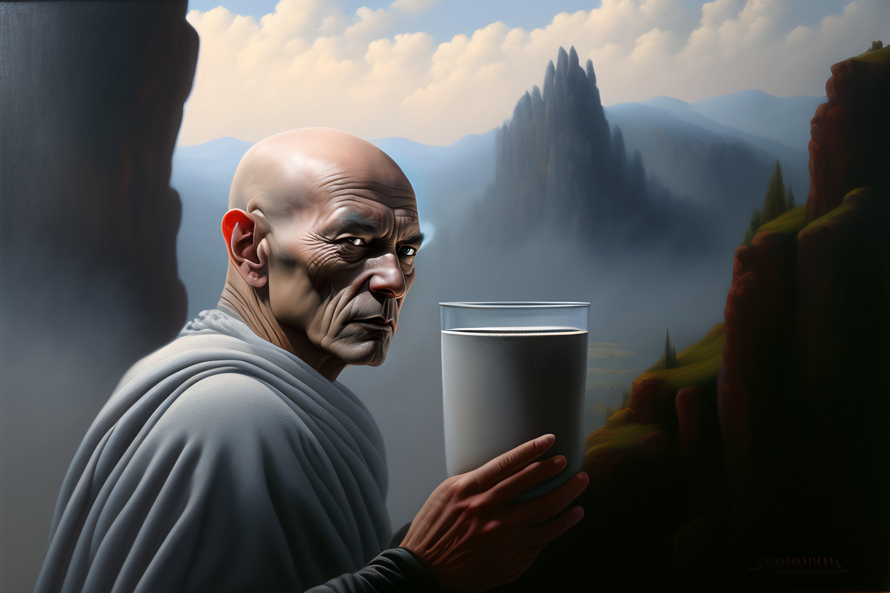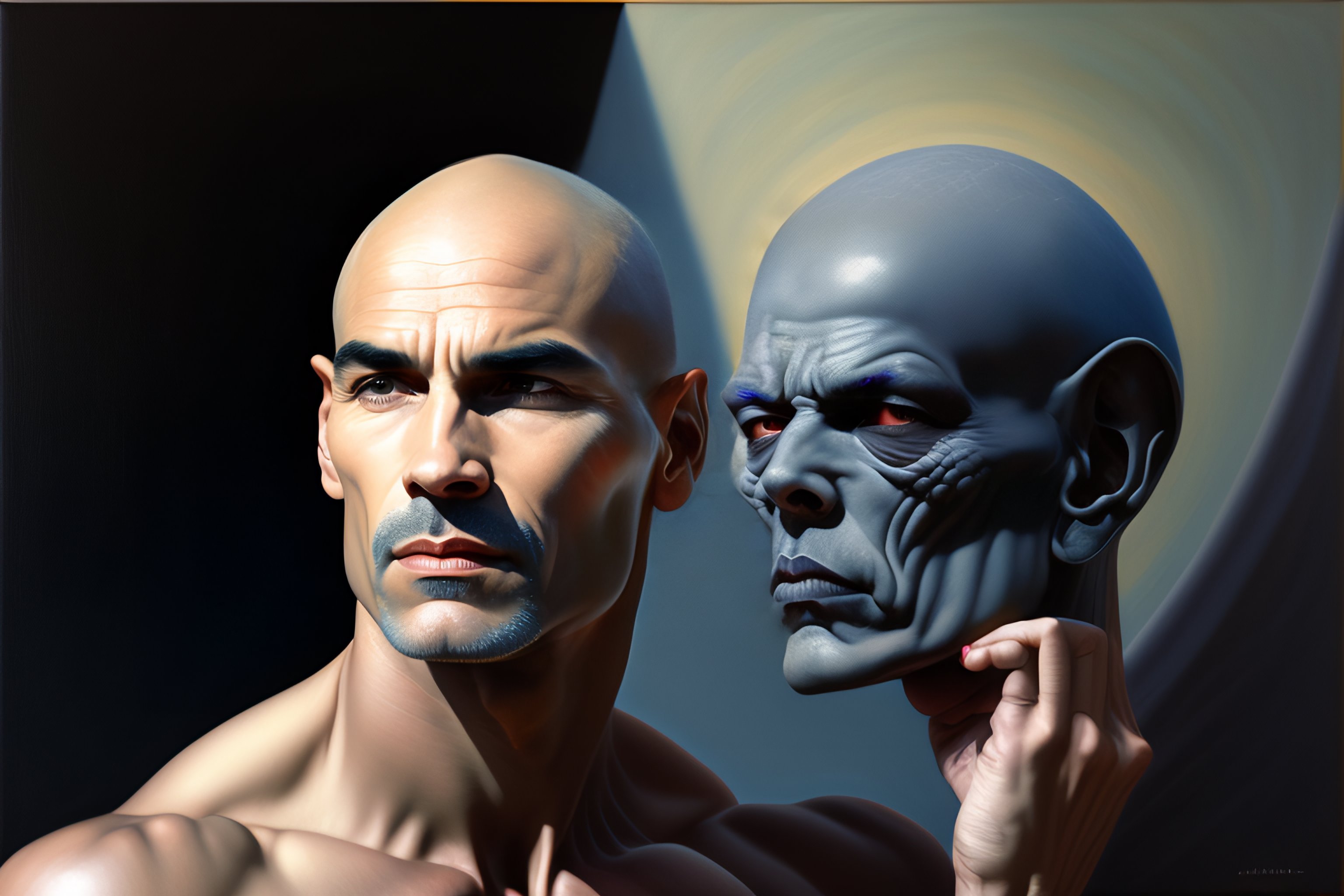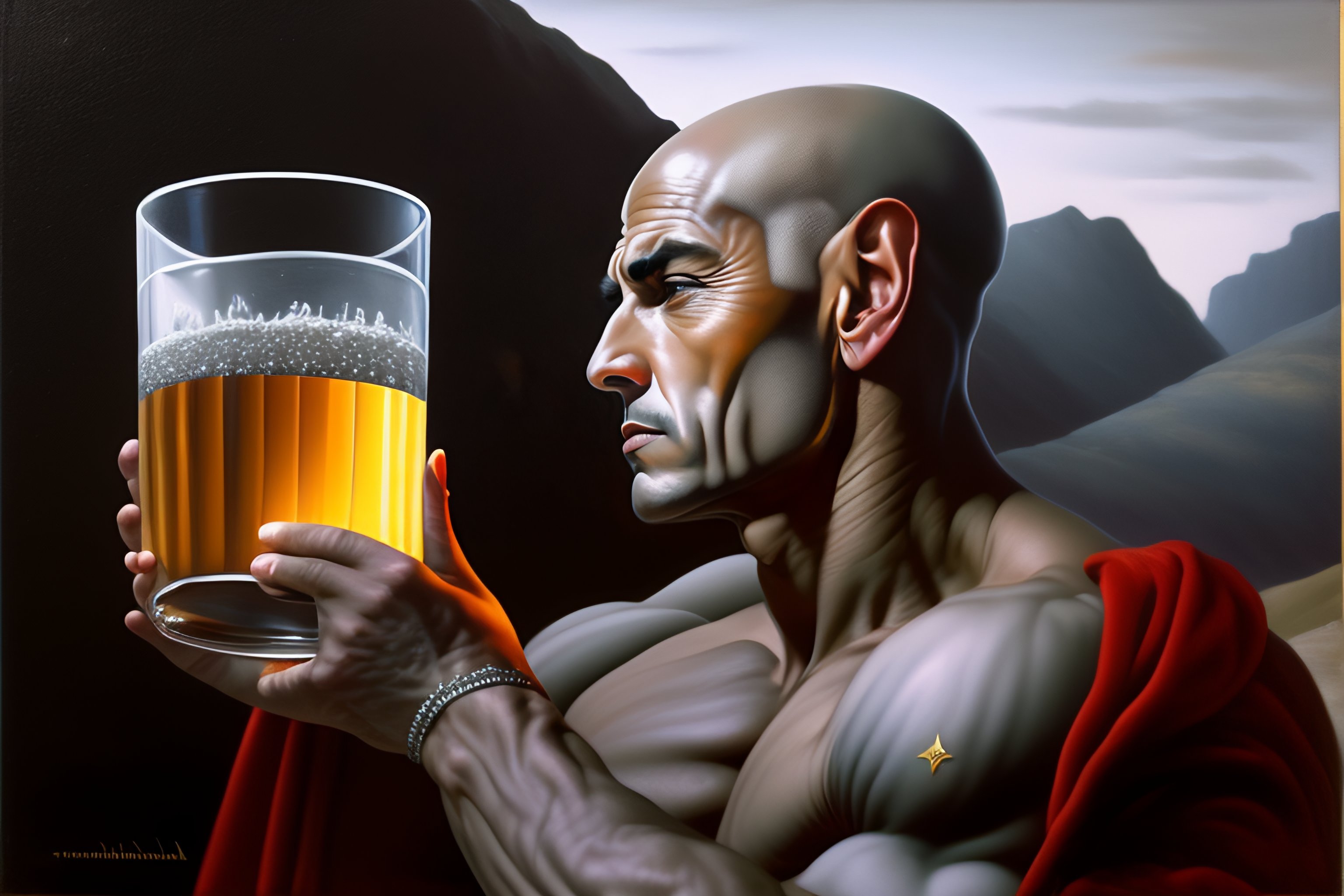 Oil painting, renaissance, he is grey as rock, male made of rock, skin as rock, a muscle grey space emperor, bald, grey alien skin, grey face, alien, swine cup in hand, caligula, cyberpunk